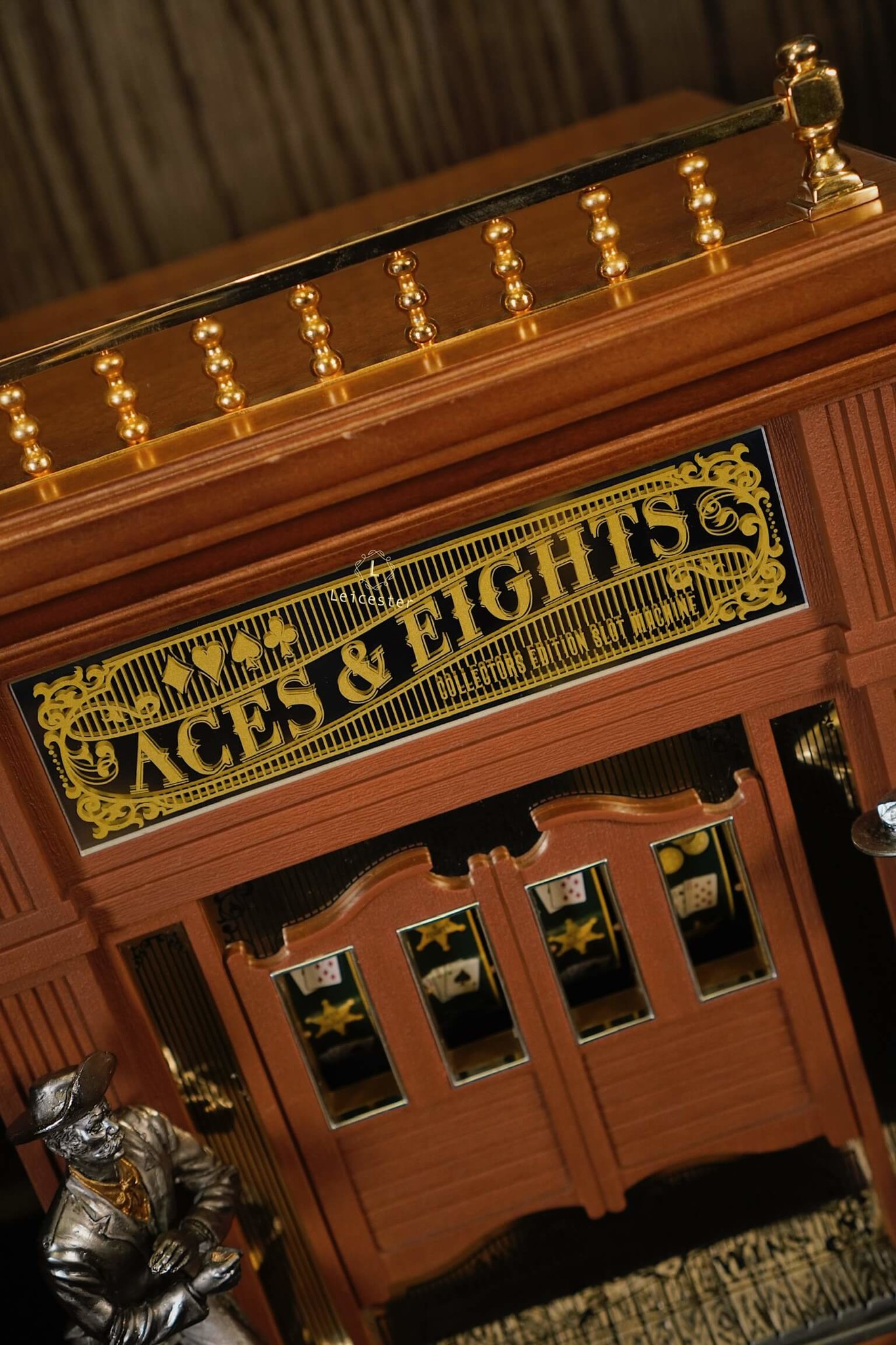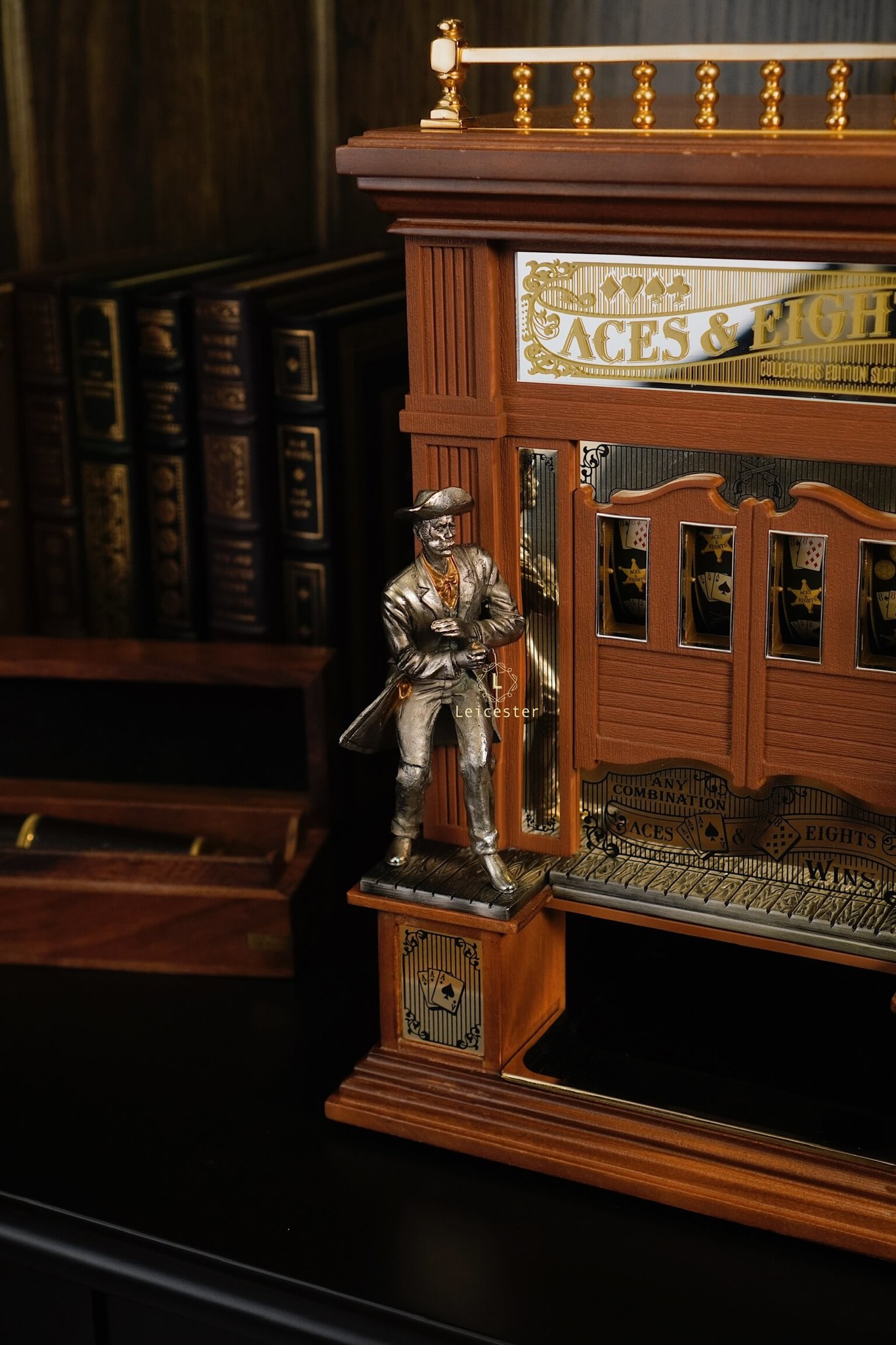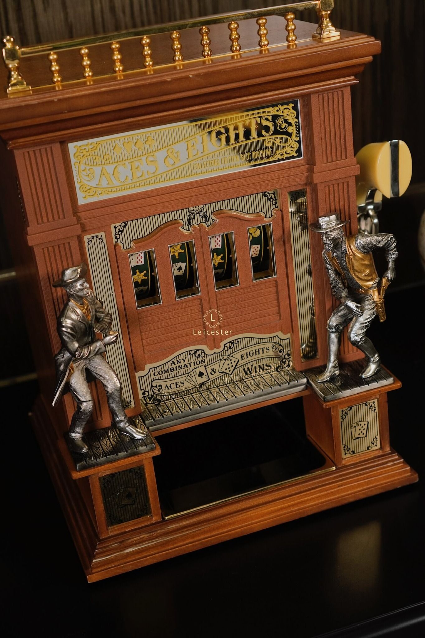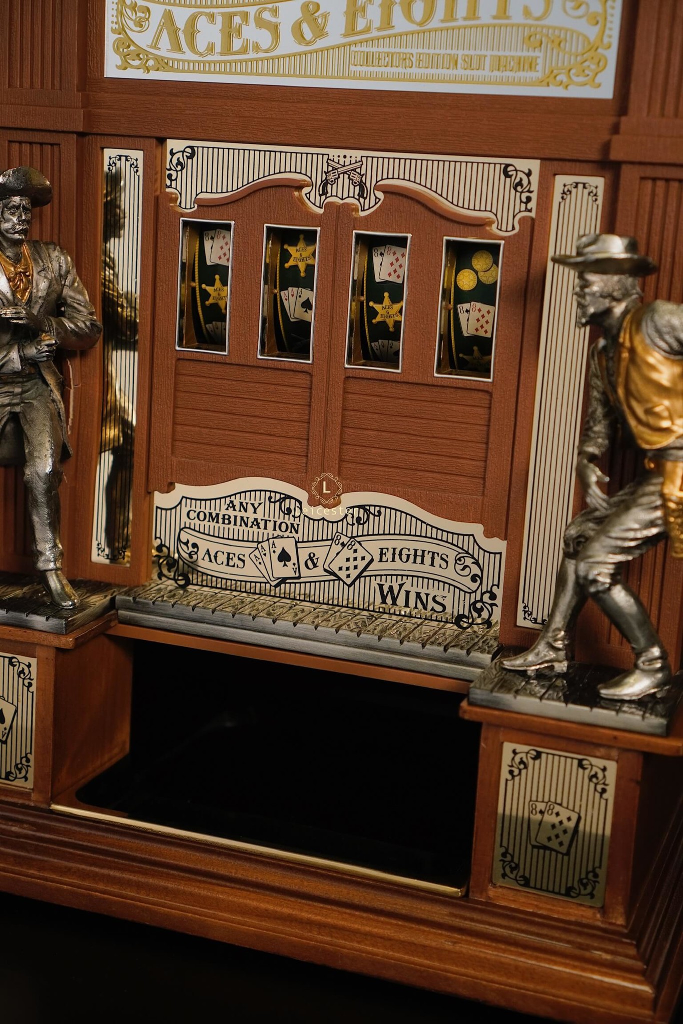 Mang cảm hứng từ miền Viễn Tây hoang dã và bộ bài huyền thoại “Dead Man’s Hand”, Aces & Eights Western Slot Machine là phiên bản máy đánh bạc cổ điển độc đáo được thiết kế dành riêng cho giới sưu tầm. Bộ máy tái hiện hình ảnh quán rượu xưa với hai tượng cao bồi đối đầu nhau, lan can được mạ vàng và cửa sổ hiển thị lá bài đặc trưng của tay súng Wild Bill Hickok. Đây là sự hòa quyện giữa tinh thần phiêu lưu, văn hóa cao bồi và nét đẹp của nghệ thuật thủ công truyền thống.