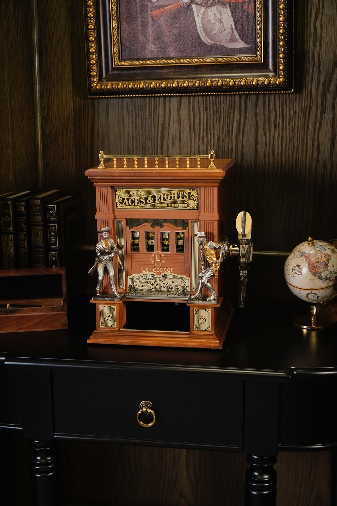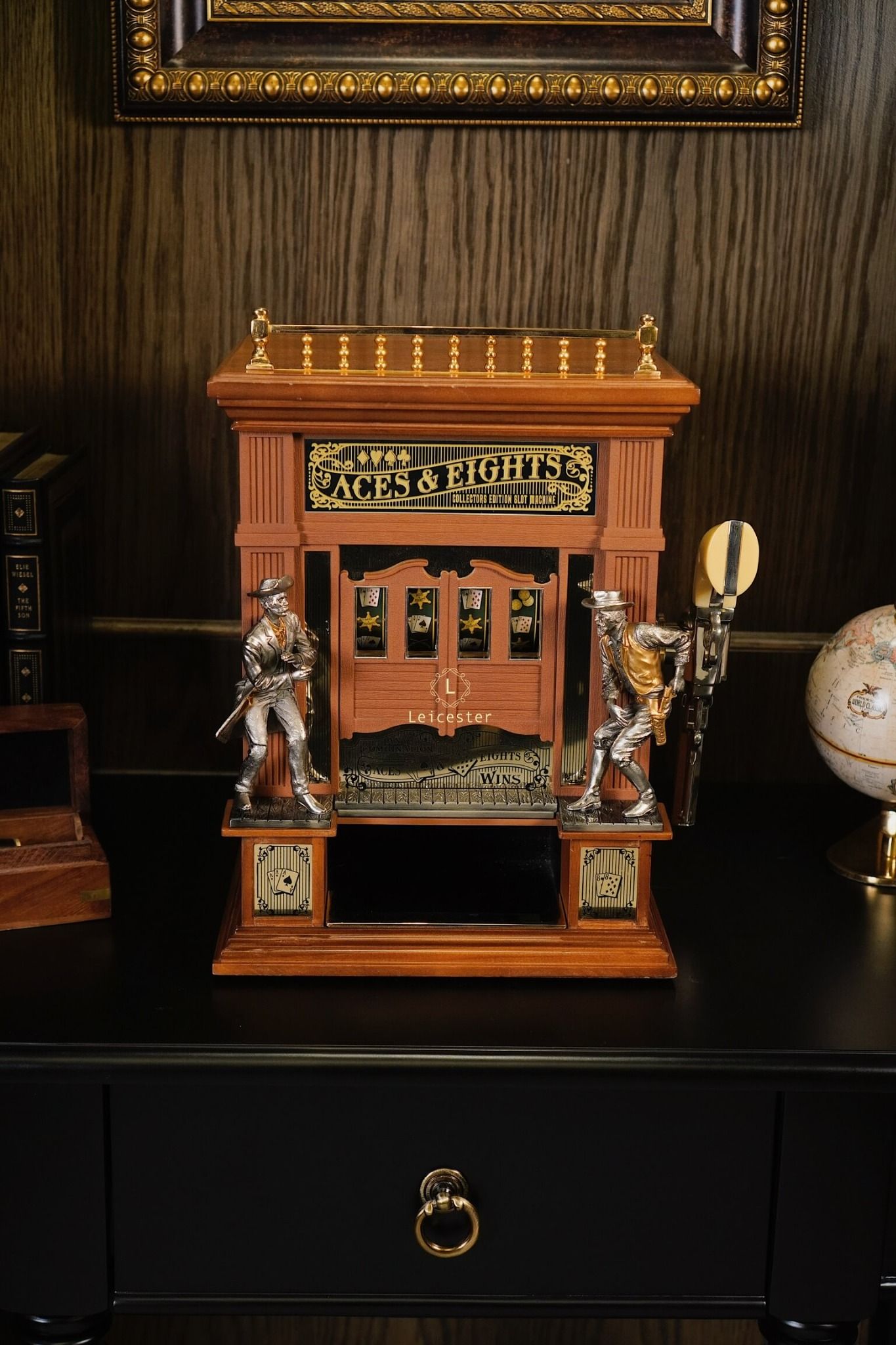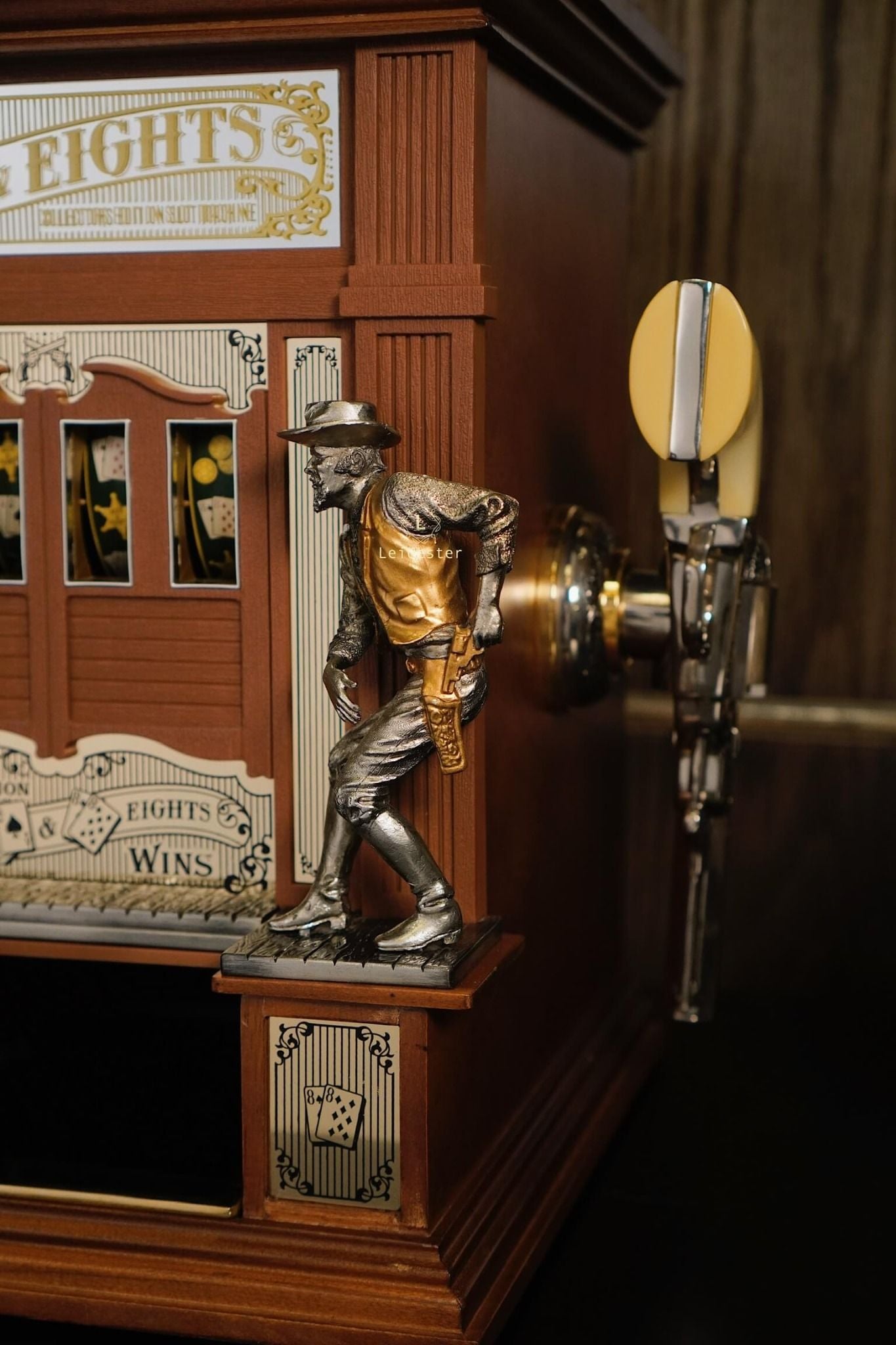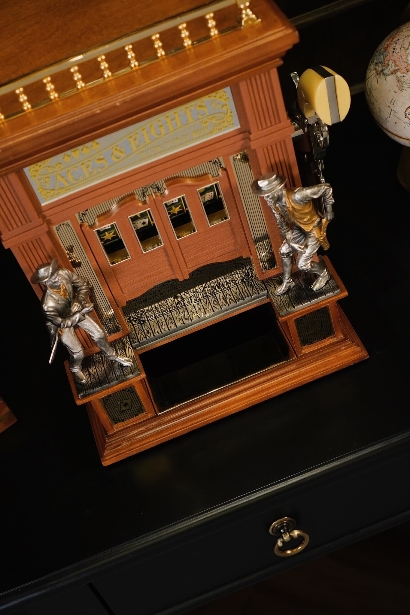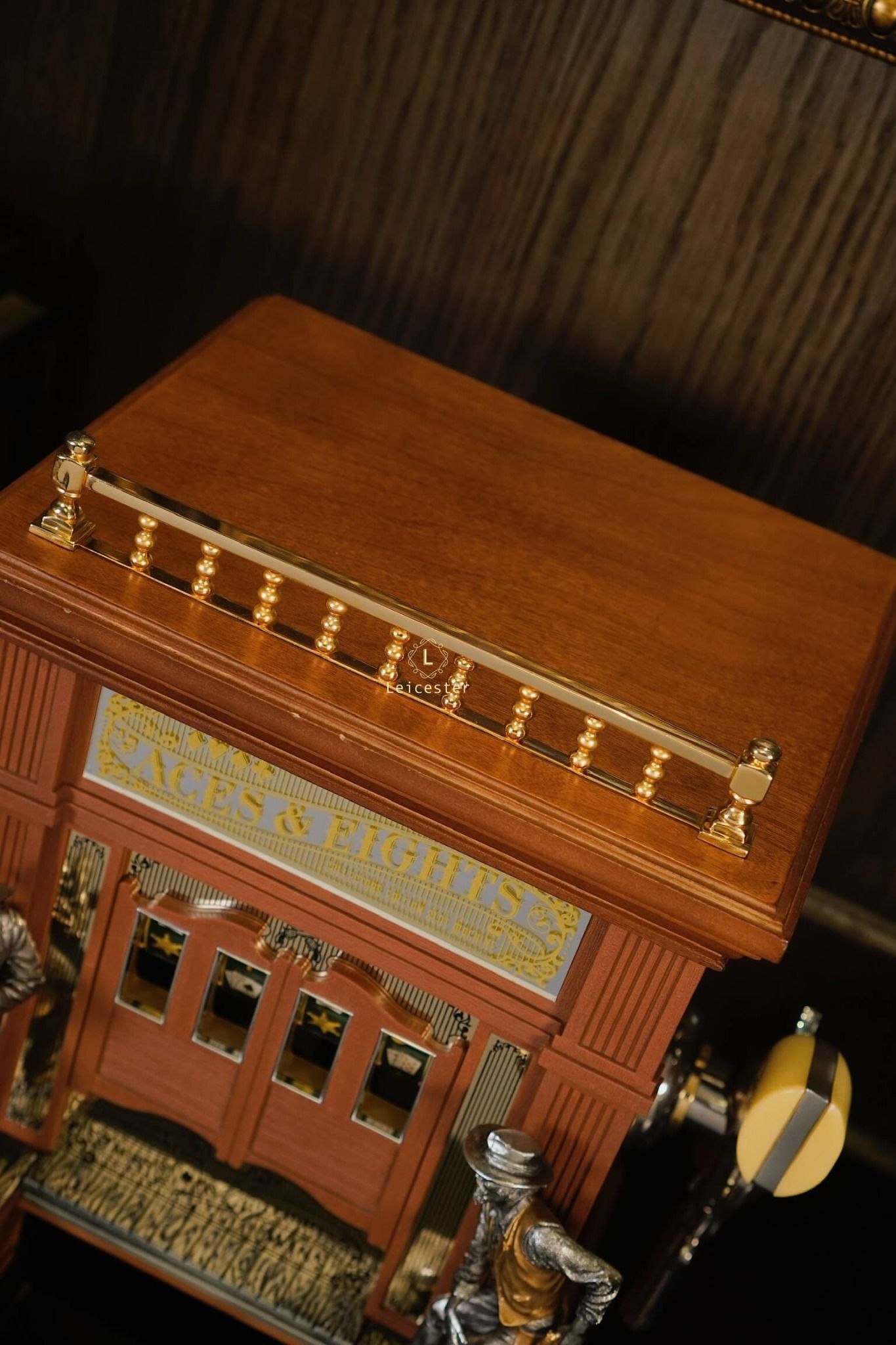 Mang cảm hứng từ miền Viễn Tây hoang dã và bộ bài huyền thoại “Dead Man’s Hand”, Aces & Eights Western Slot Machine là phiên bản máy đánh bạc cổ điển độc đáo được thiết kế dành riêng cho giới sưu tầm. Bộ máy tái hiện hình ảnh quán rượu xưa với hai tượng cao bồi đối đầu nhau, lan can được mạ vàng và cửa sổ hiển thị lá bài đặc trưng của tay súng Wild Bill Hickok. Đây là sự hòa quyện giữa tinh thần phiêu lưu, văn hóa cao bồi và nét đẹp của nghệ thuật thủ công truyền thống.