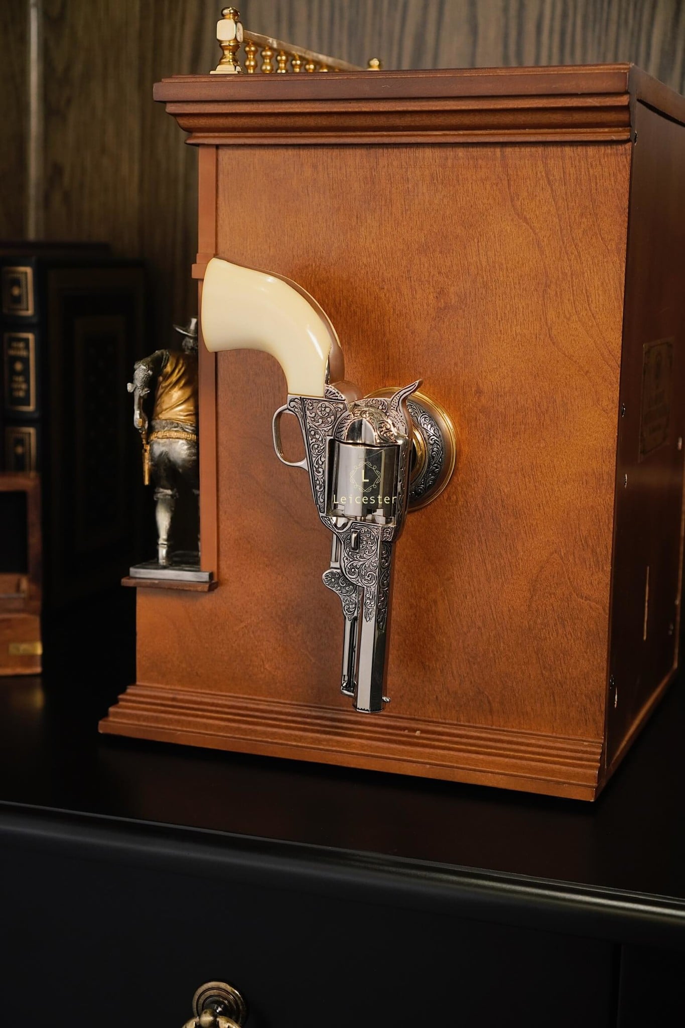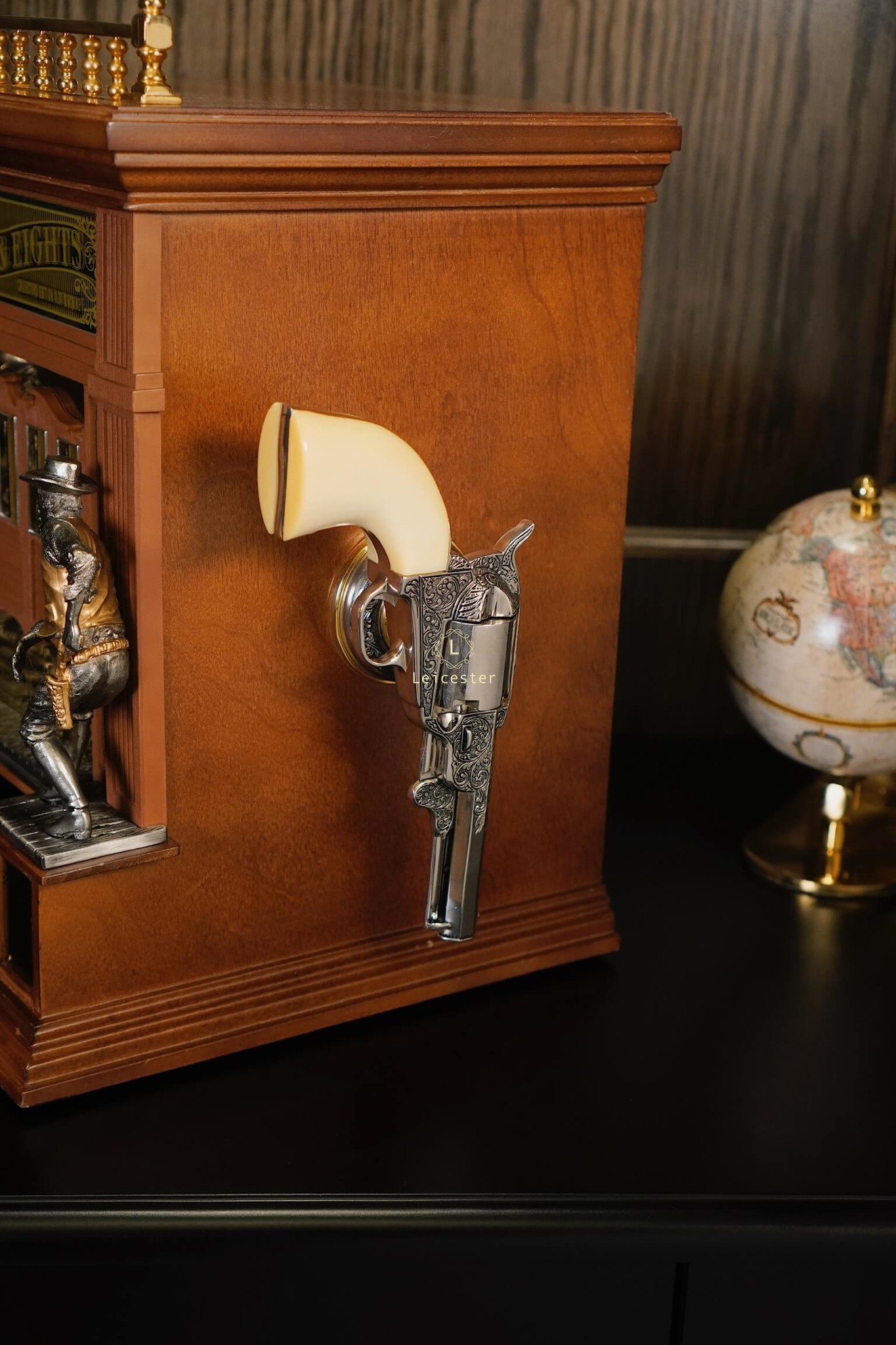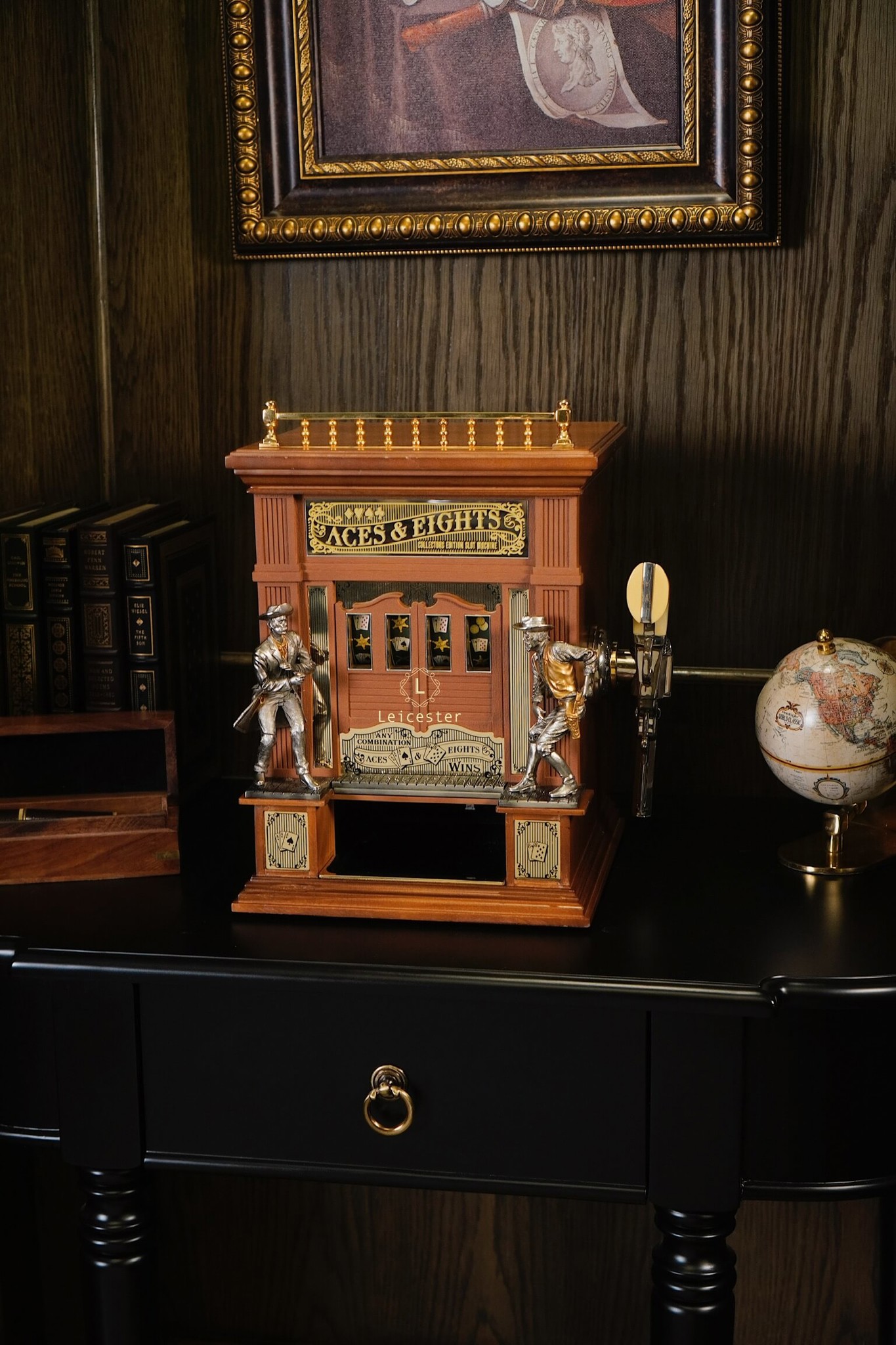 Bộ máy Aces & Eights Western được chế tác từ gỗ tự nhiên cao cấp kết hợp chi tiết kim loại và mạ vàng đúc tinh xảo cùng cơ chế hoạt động tay gạt cổ điển, mang lại trải nghiệm đậm chất hoài cổ. Không chỉ là một thiết bị giải trí, “Aces & Eights” còn là kiệt tác cơ học mang đậm chất lịch sử, thích hợp trong không gian sang trọng, sưu tầm hoặc các bộ sưu tập mang phong cách vintage cao cấp.
