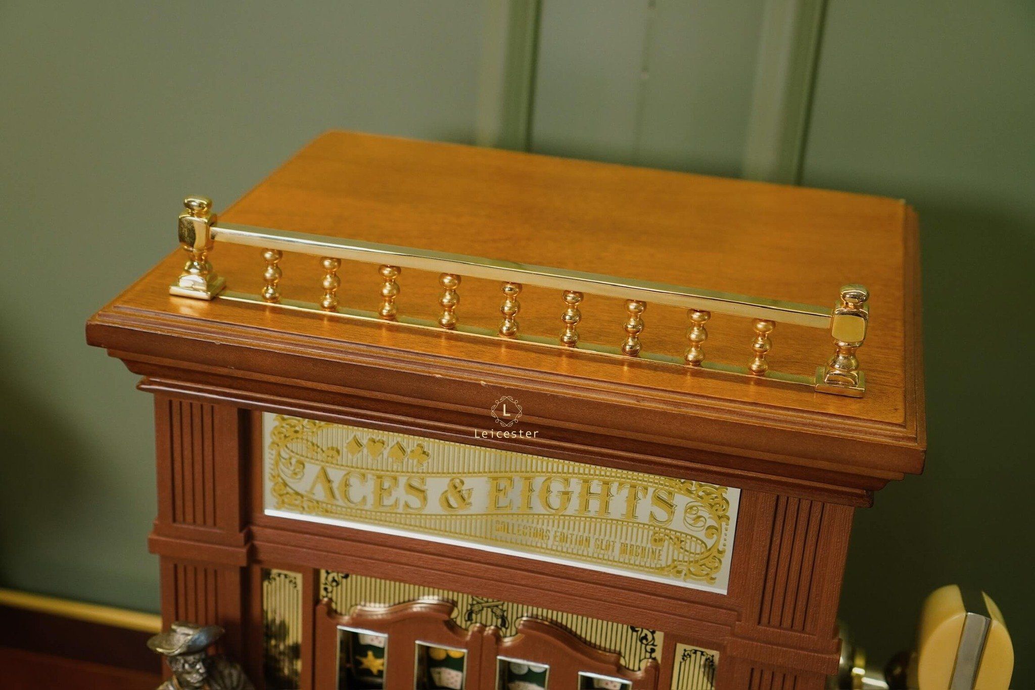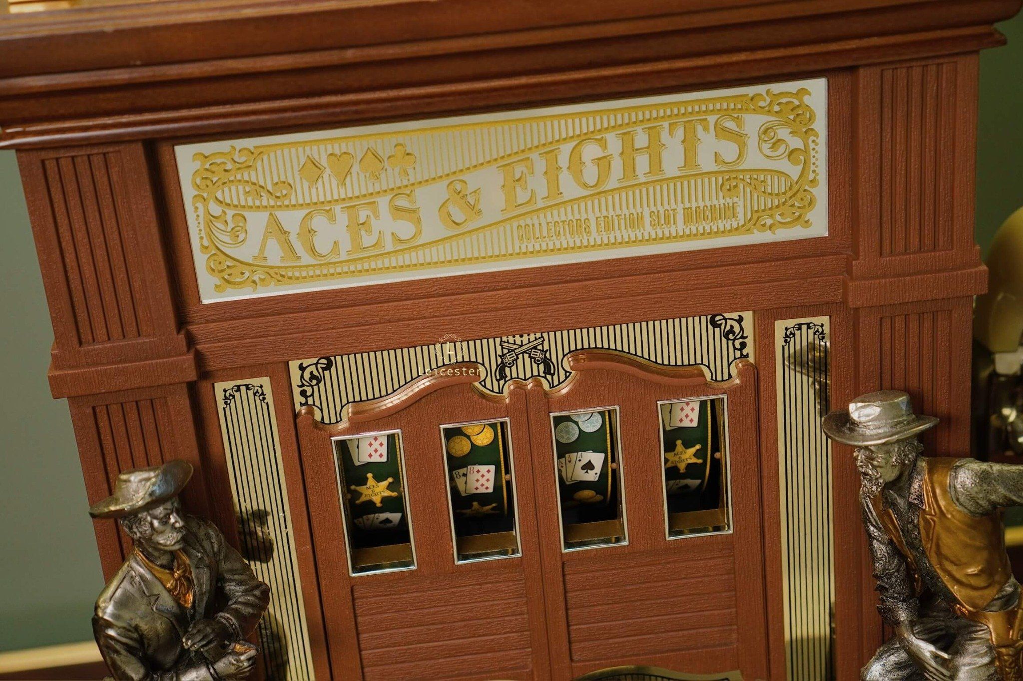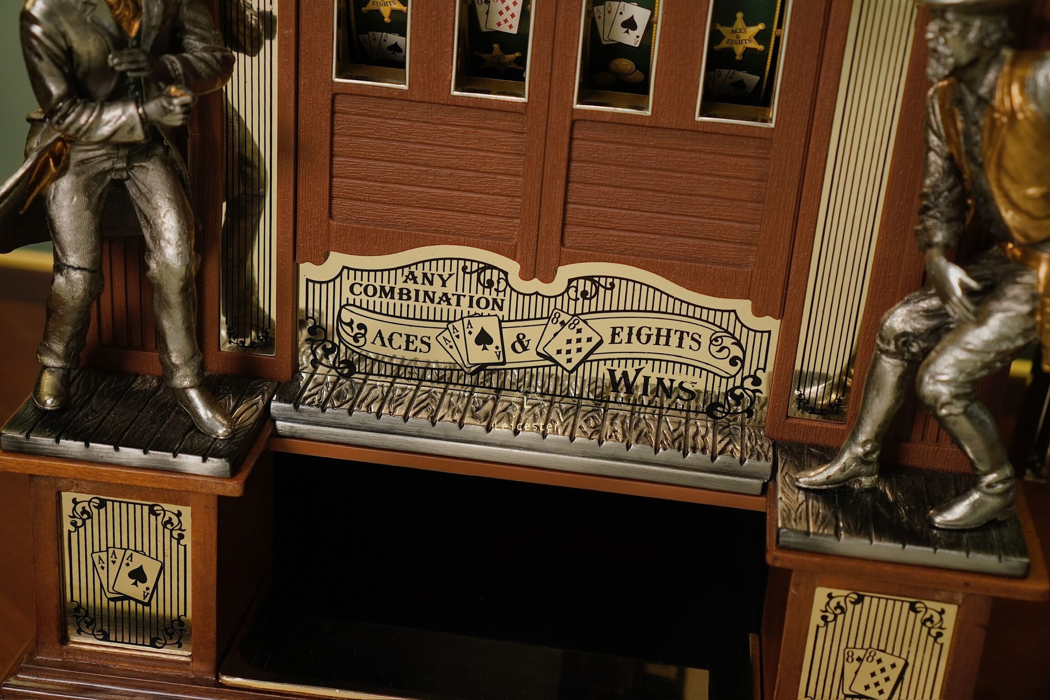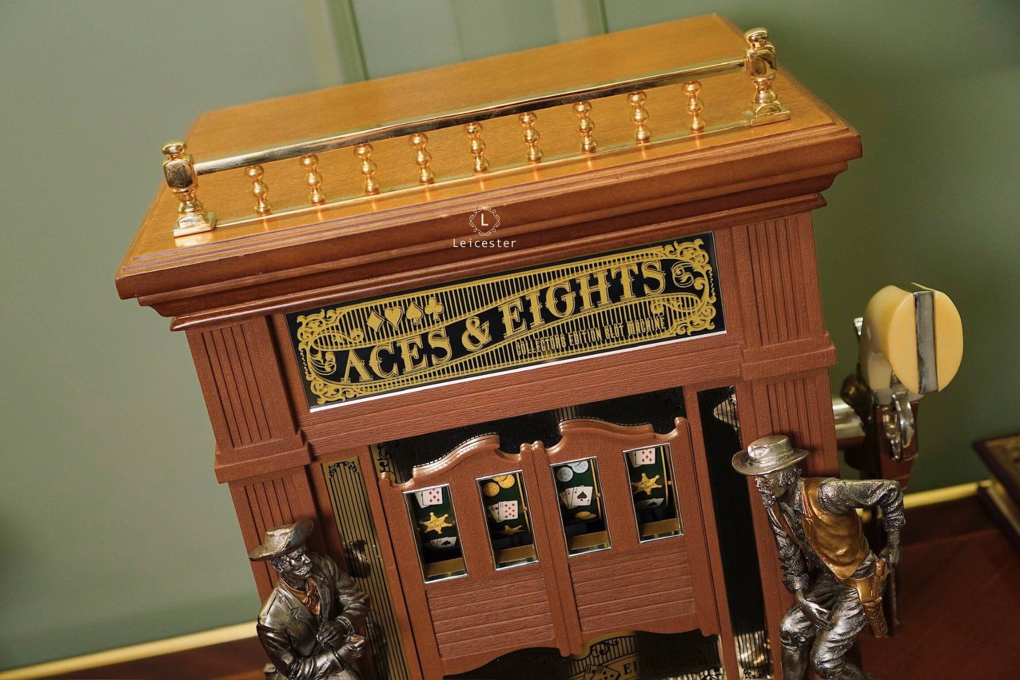 Mang cảm hứng từ miền Viễn Tây hoang dã và bộ bài huyền thoại “Dead Man’s Hand”, Aces & Eights Western Slot Machine là phiên bản máy đánh bạc cổ điển độc đáo được thiết kế dành riêng cho giới sưu tầm. Bộ máy tái hiện hình ảnh quán rượu xưa với hai tượng cao bồi đối đầu nhau, lan can được mạ vàng và cửa sổ hiển thị lá bài đặc trưng của tay súng Wild Bill Hickok. Đây là sự hòa quyện giữa tinh thần phiêu lưu, văn hóa cao bồi và nét đẹp của nghệ thuật thủ công truyền thống.
