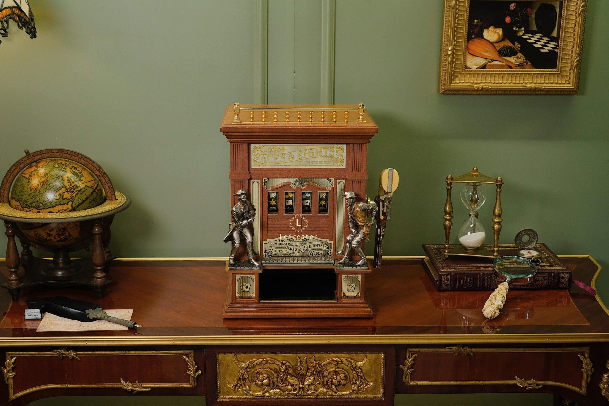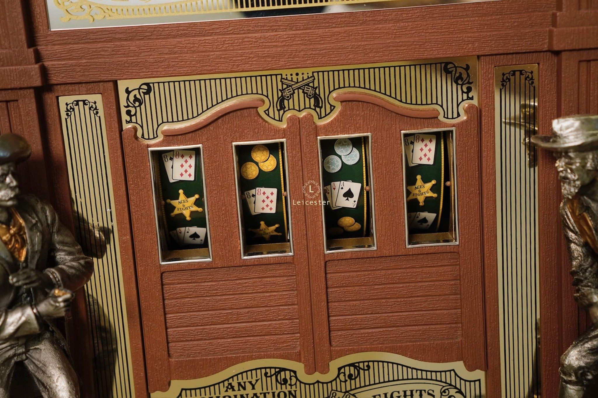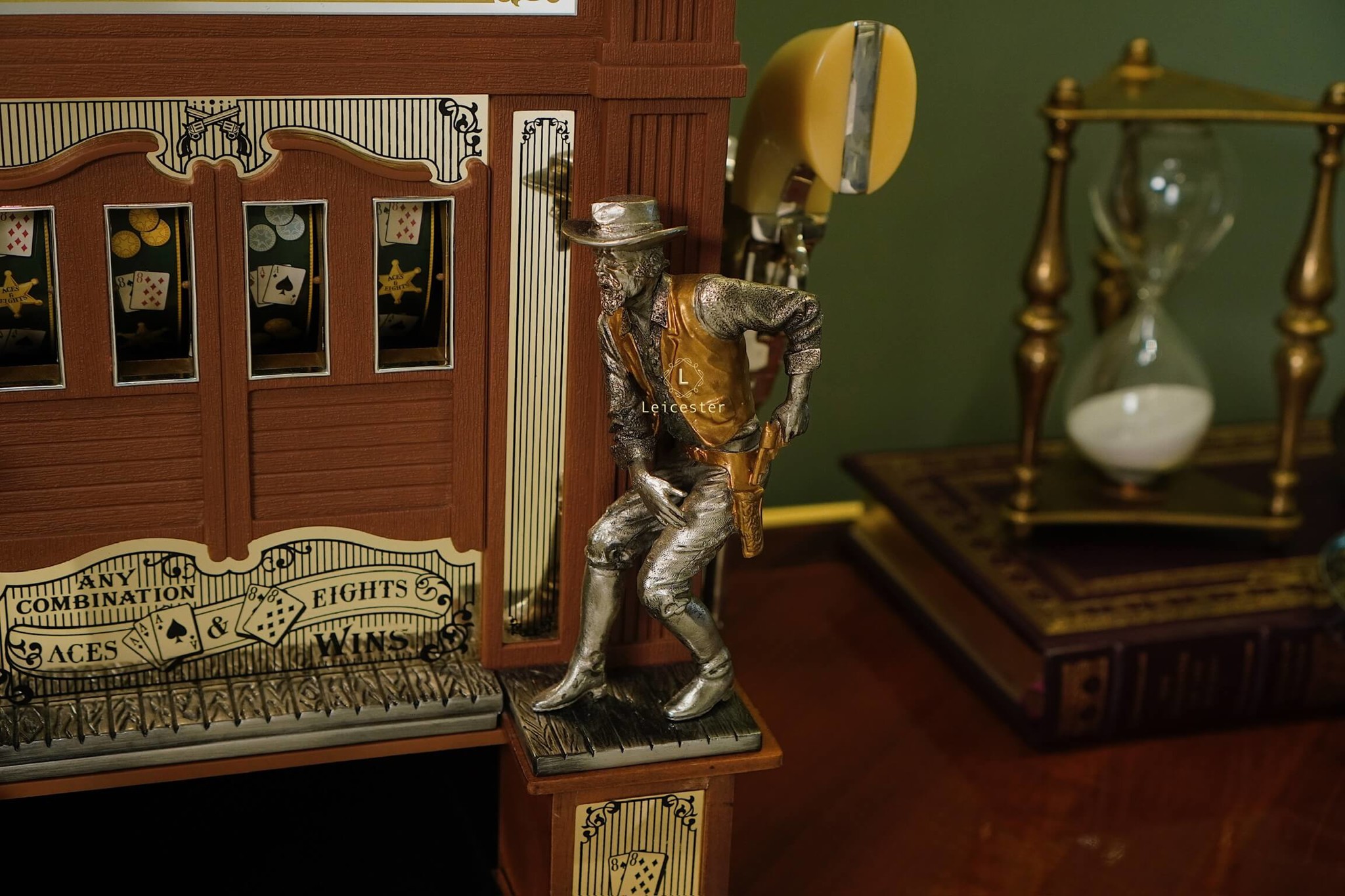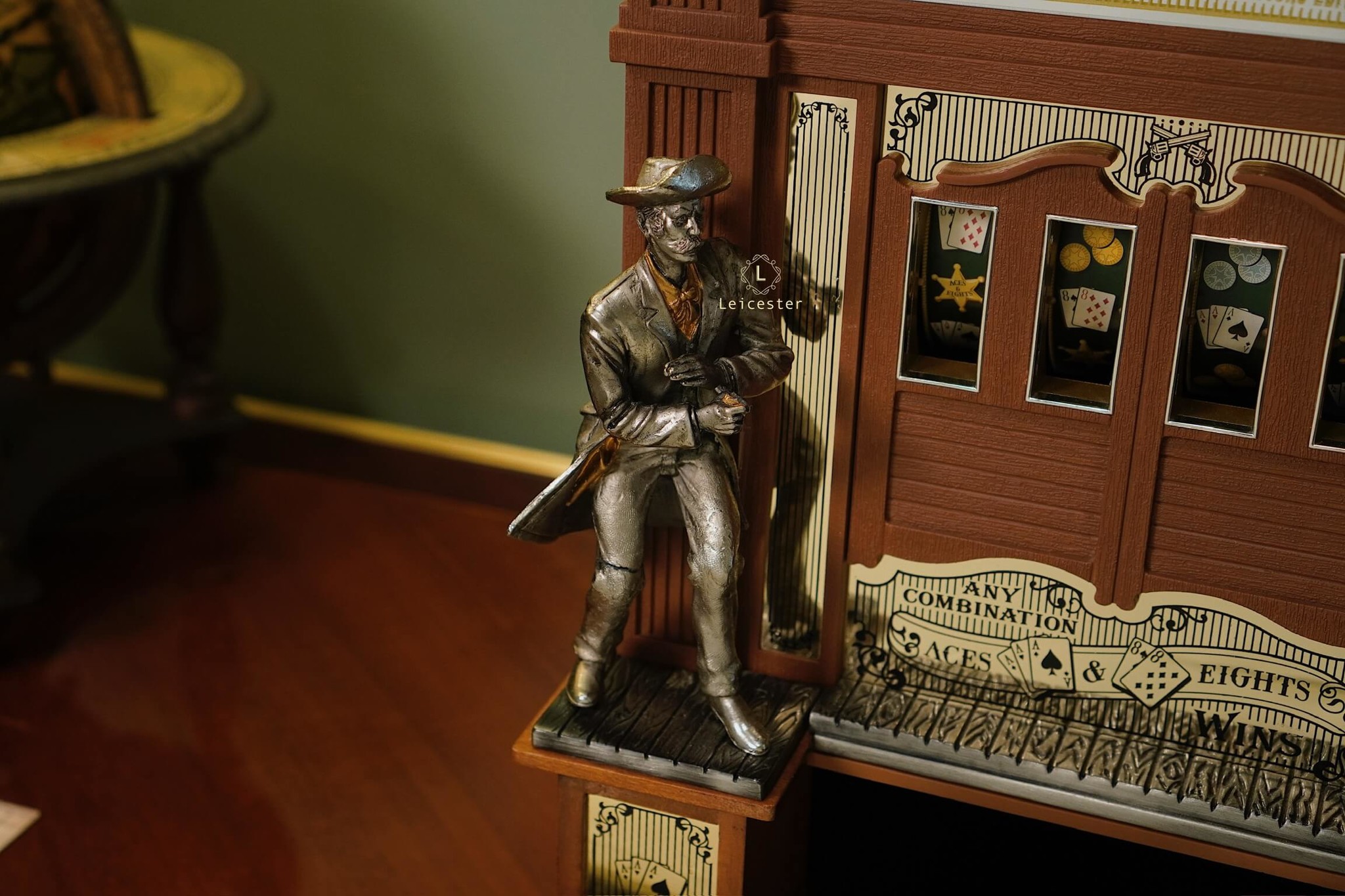 Mang cảm hứng từ miền Viễn Tây hoang dã và bộ bài huyền thoại “Dead Man’s Hand”, Aces & Eights Western Slot Machine là phiên bản máy đánh bạc cổ điển độc đáo được thiết kế dành riêng cho giới sưu tầm. Bộ máy tái hiện hình ảnh quán rượu xưa với hai tượng cao bồi đối đầu nhau, lan can được mạ vàng và cửa sổ hiển thị lá bài đặc trưng của tay súng Wild Bill Hickok. Đây là sự hòa quyện giữa tinh thần phiêu lưu, văn hóa cao bồi và nét đẹp của nghệ thuật thủ công truyền thống.
