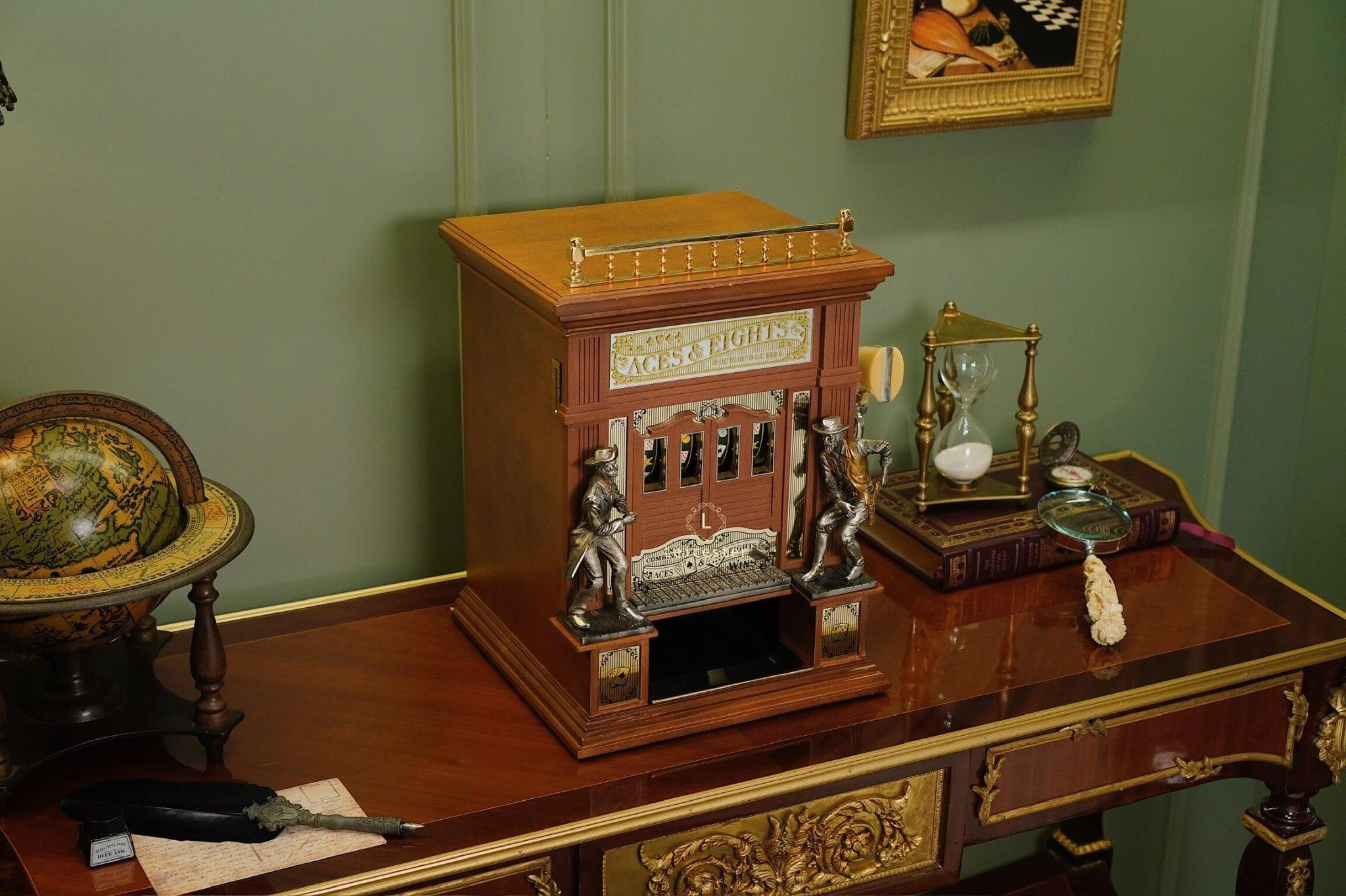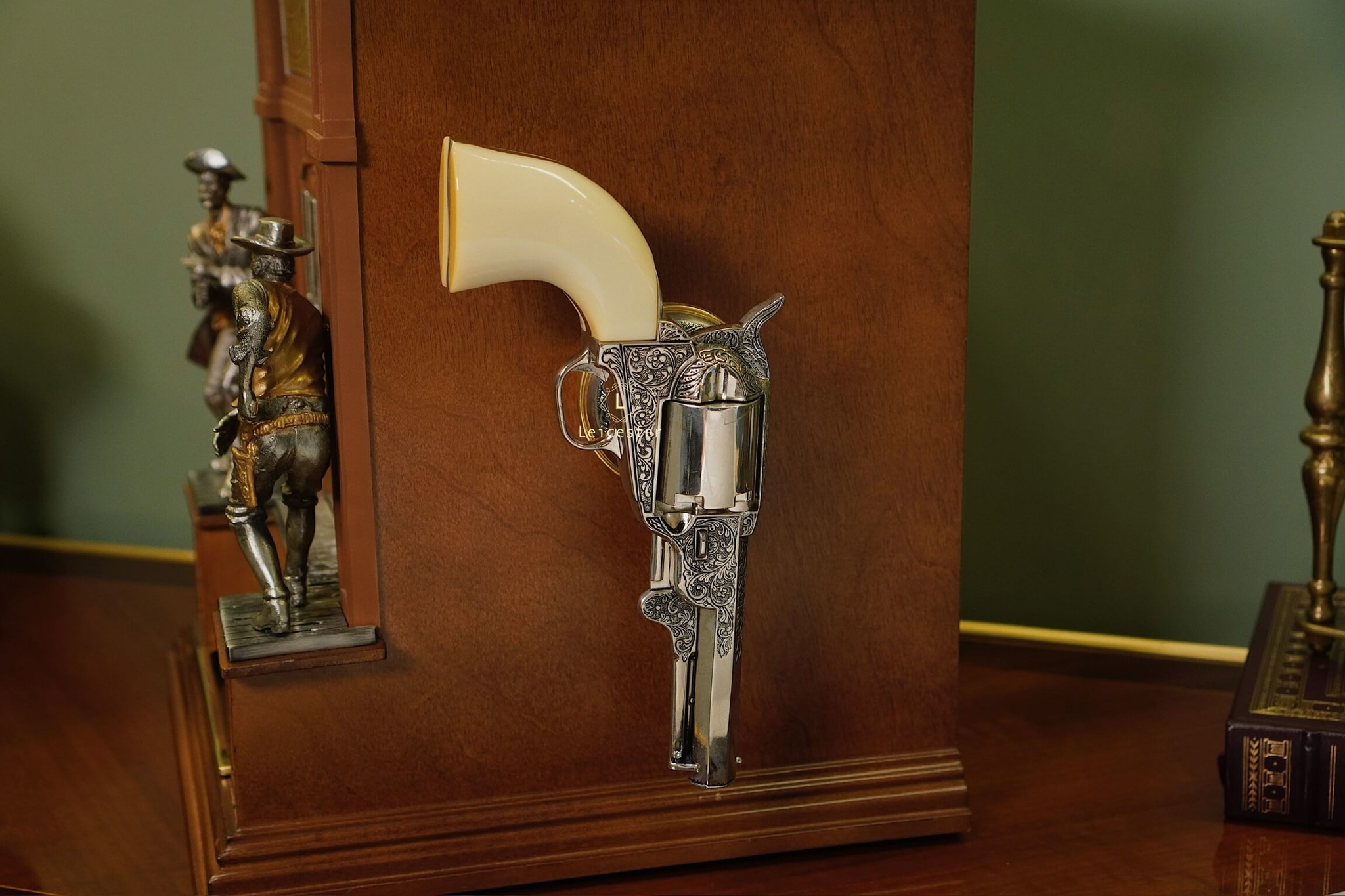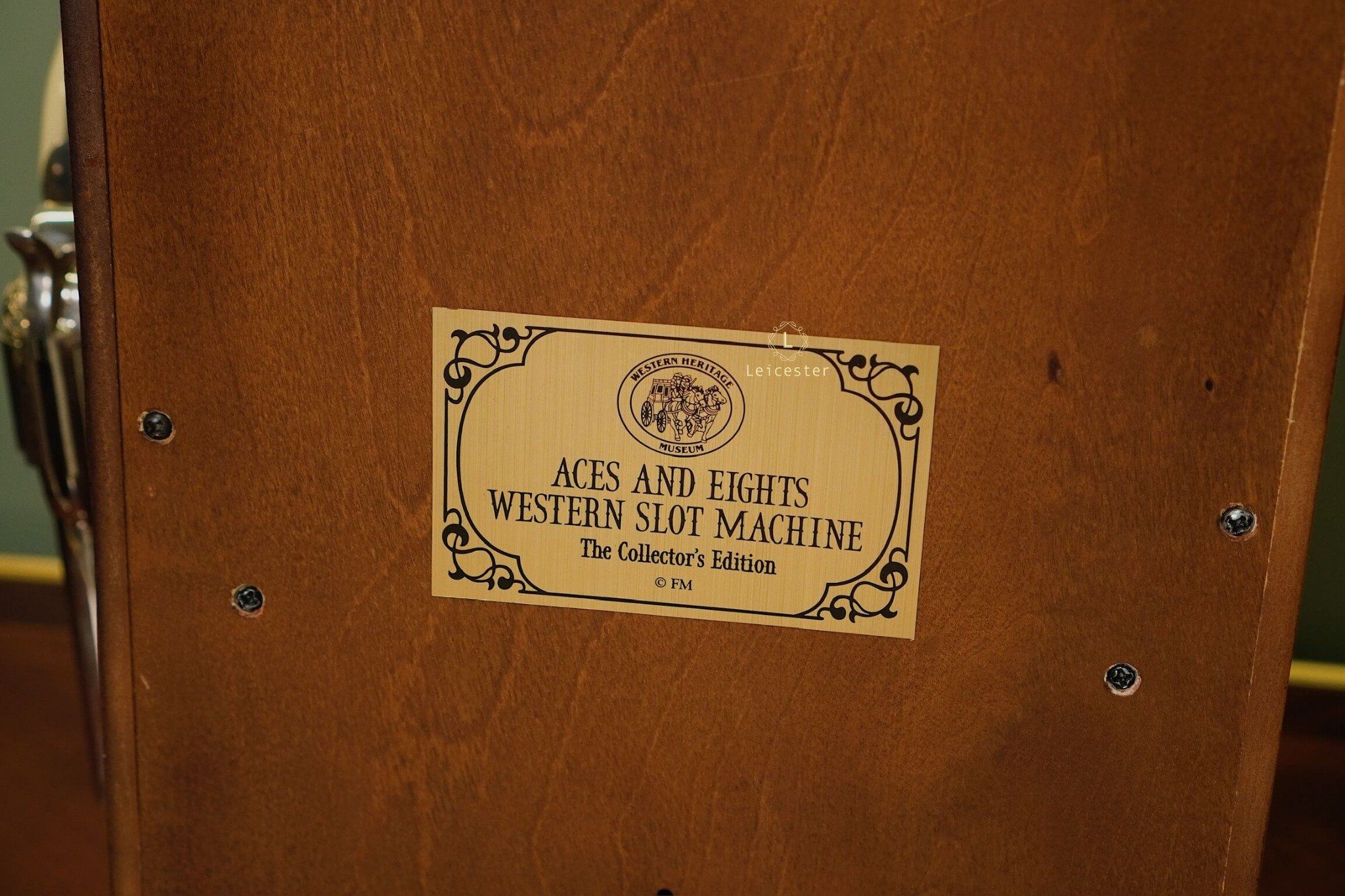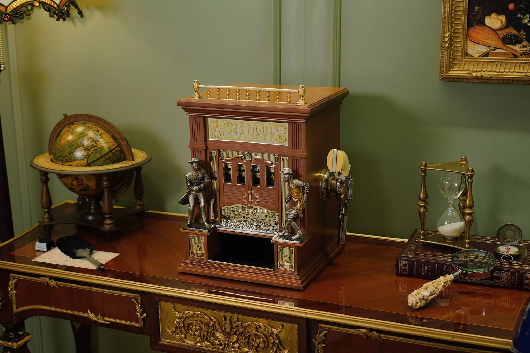 Mang cảm hứng từ miền Viễn Tây hoang dã và bộ bài huyền thoại “Dead Man’s Hand”, Aces & Eights Western Slot Machine là phiên bản máy đánh bạc cổ điển độc đáo được thiết kế dành riêng cho giới sưu tầm. Bộ máy tái hiện hình ảnh quán rượu xưa với hai tượng cao bồi đối đầu nhau, lan can được mạ vàng và cửa sổ hiển thị lá bài đặc trưng của tay súng Wild Bill Hickok. Đây là sự hòa quyện giữa tinh thần phiêu lưu, văn hóa cao bồi và nét đẹp của nghệ thuật thủ công truyền thống.