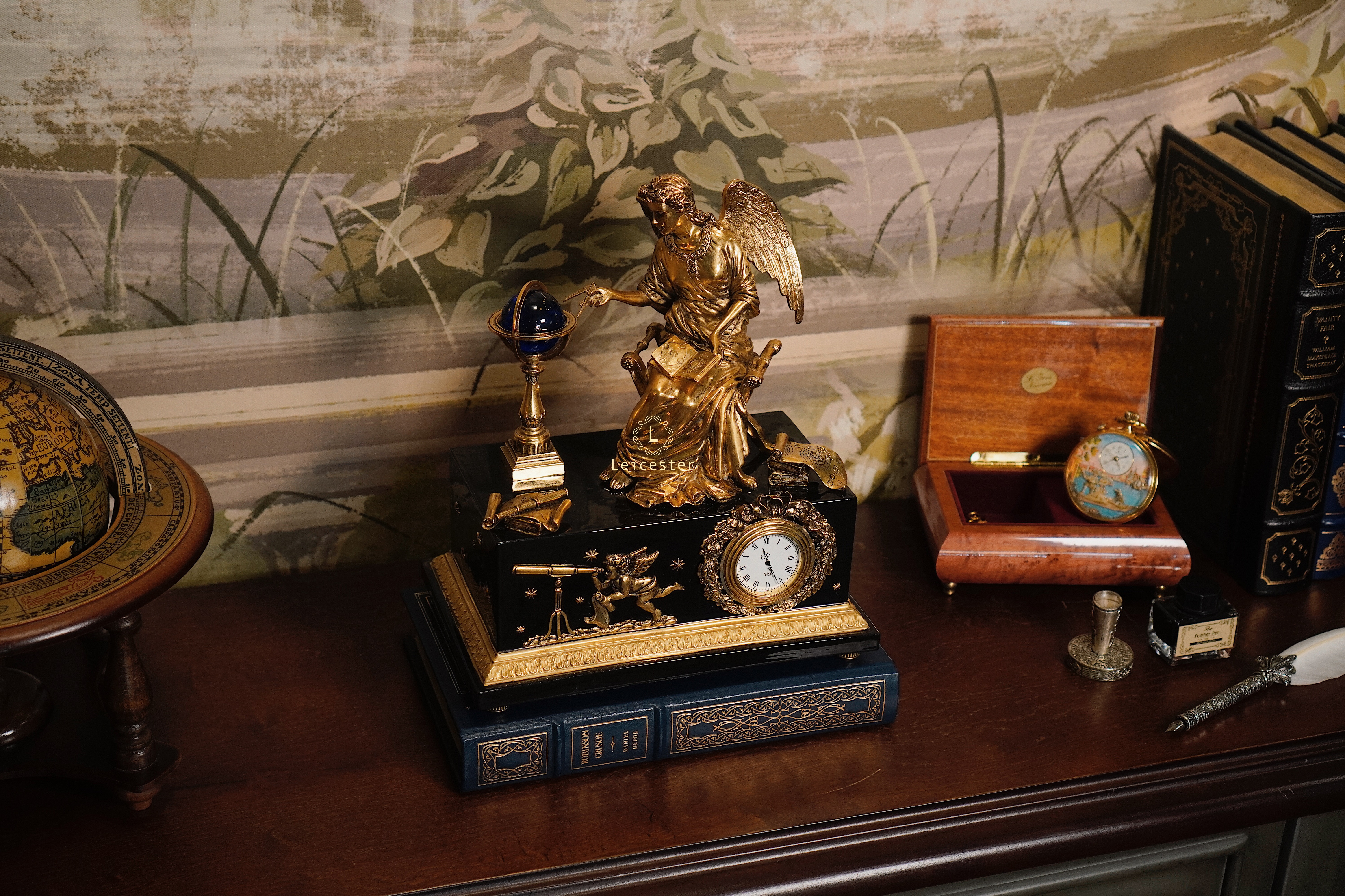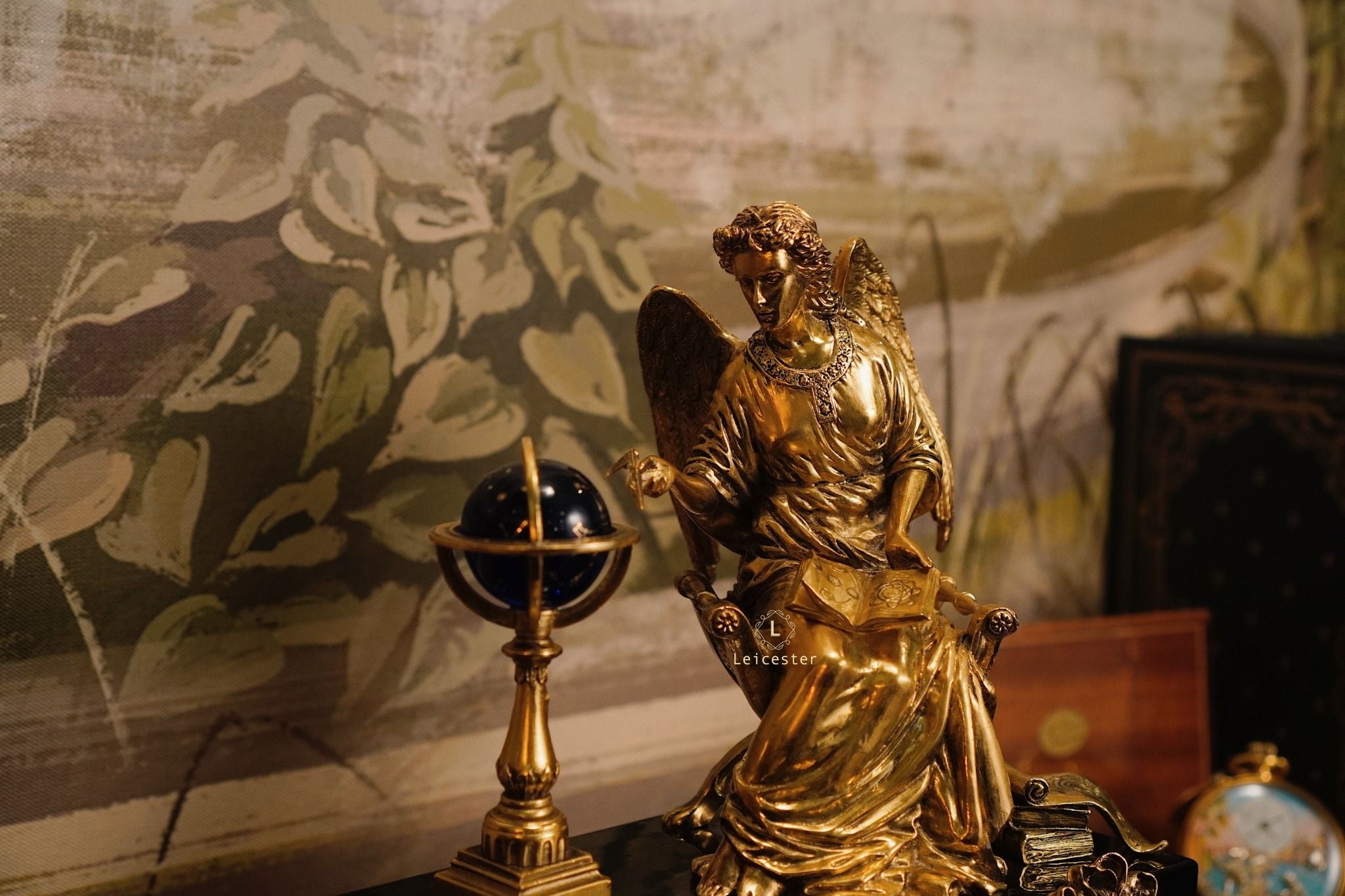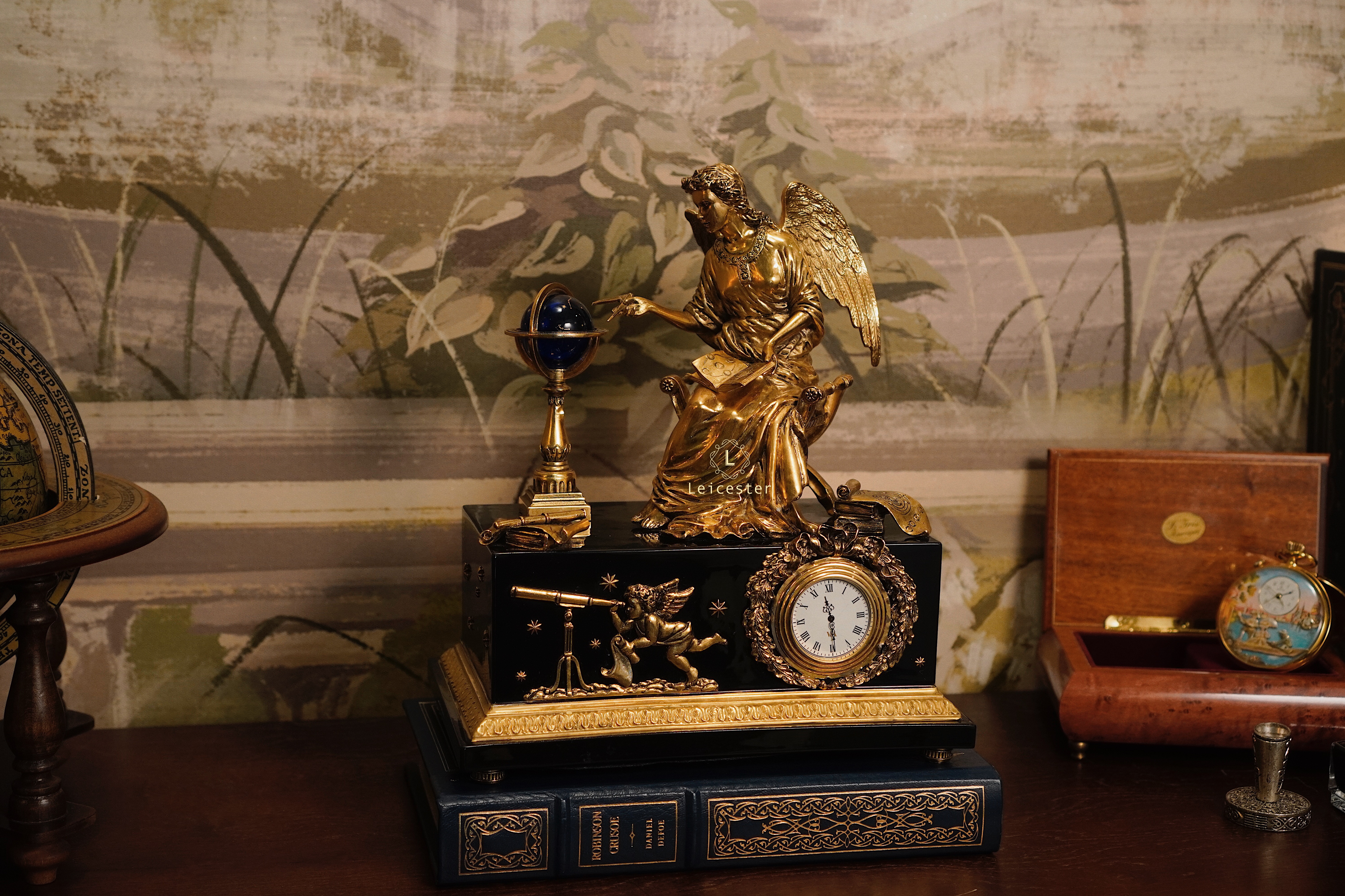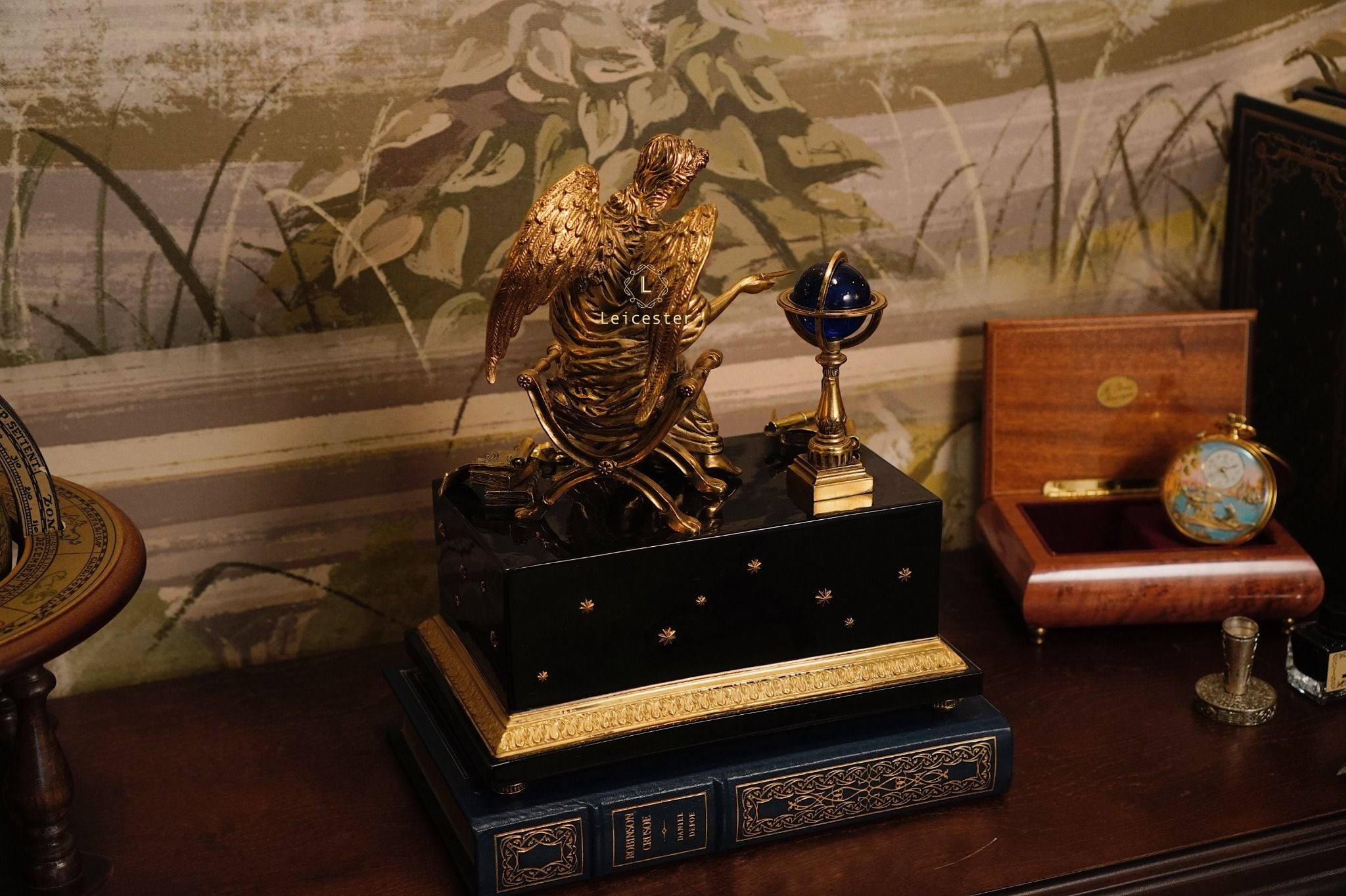 Đồng hồ để bàn Angel of the New Age không chỉ là một chiếc đồng hồ thông thường mà còn là biểu tượng của sự kết hợp giữa nghệ thuật cùng chức năng thực tiễn. Điểm nhấn cho toàn bộ thiết kế là hình ảnh một thiên thần đang ngồi nhìn về phía quả cầu thuỷ tinh với những biểu tượng thiên văn học vẽ trên đó. Mặt đồng hồ được gắn ở mặt trước phần đế, kế bên là hình ảnh một thiên thần nhỏ đang cầm kính viễn vọng, biểu tượng cho sự khám phá và tri thức. Đây không chỉ là một tác phẩm đầy sự tinh tế, sang trọng, quý phái mà còn mang lại giá trị lịch sử và nghệ thuật sâu sắc.