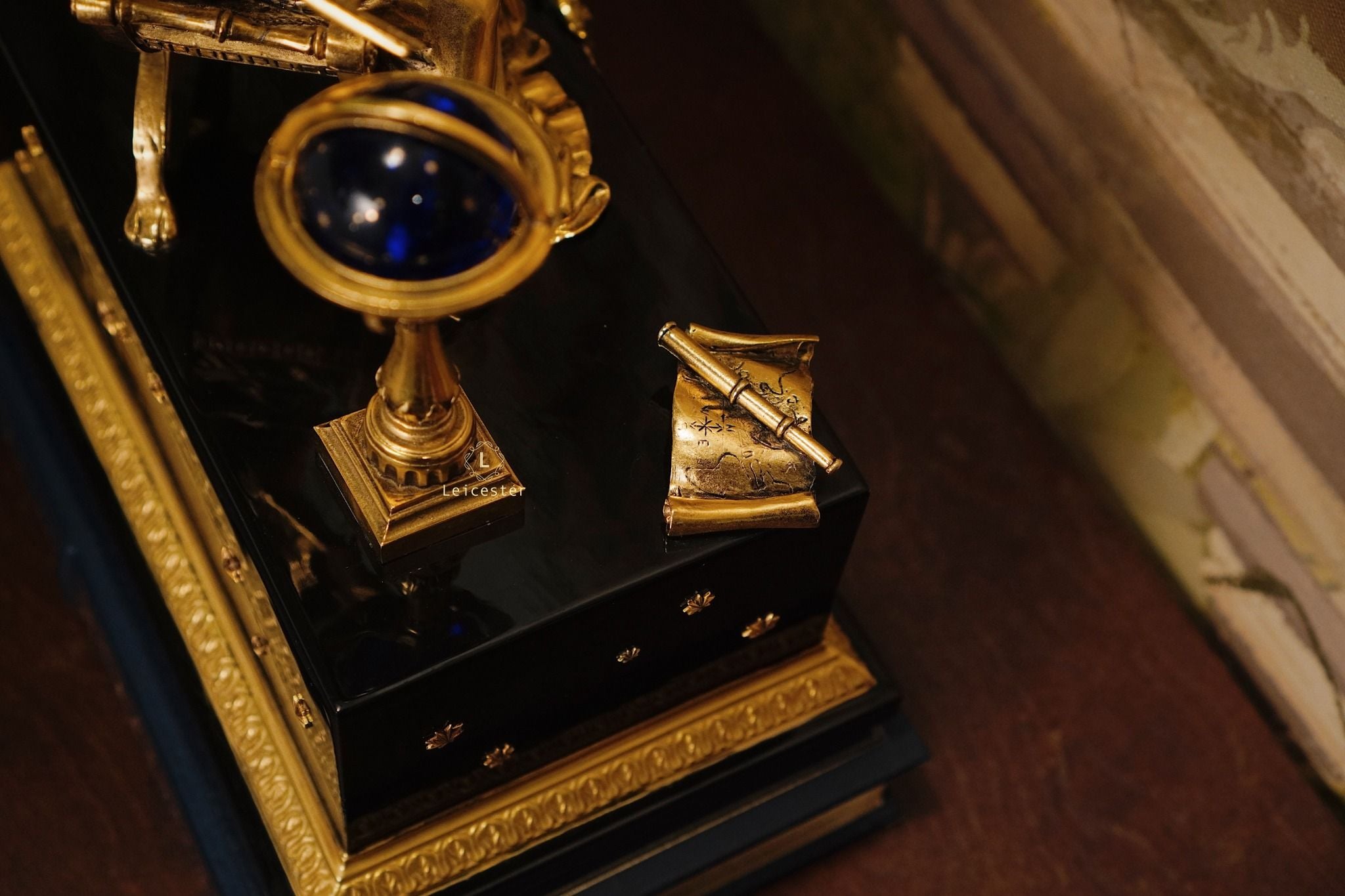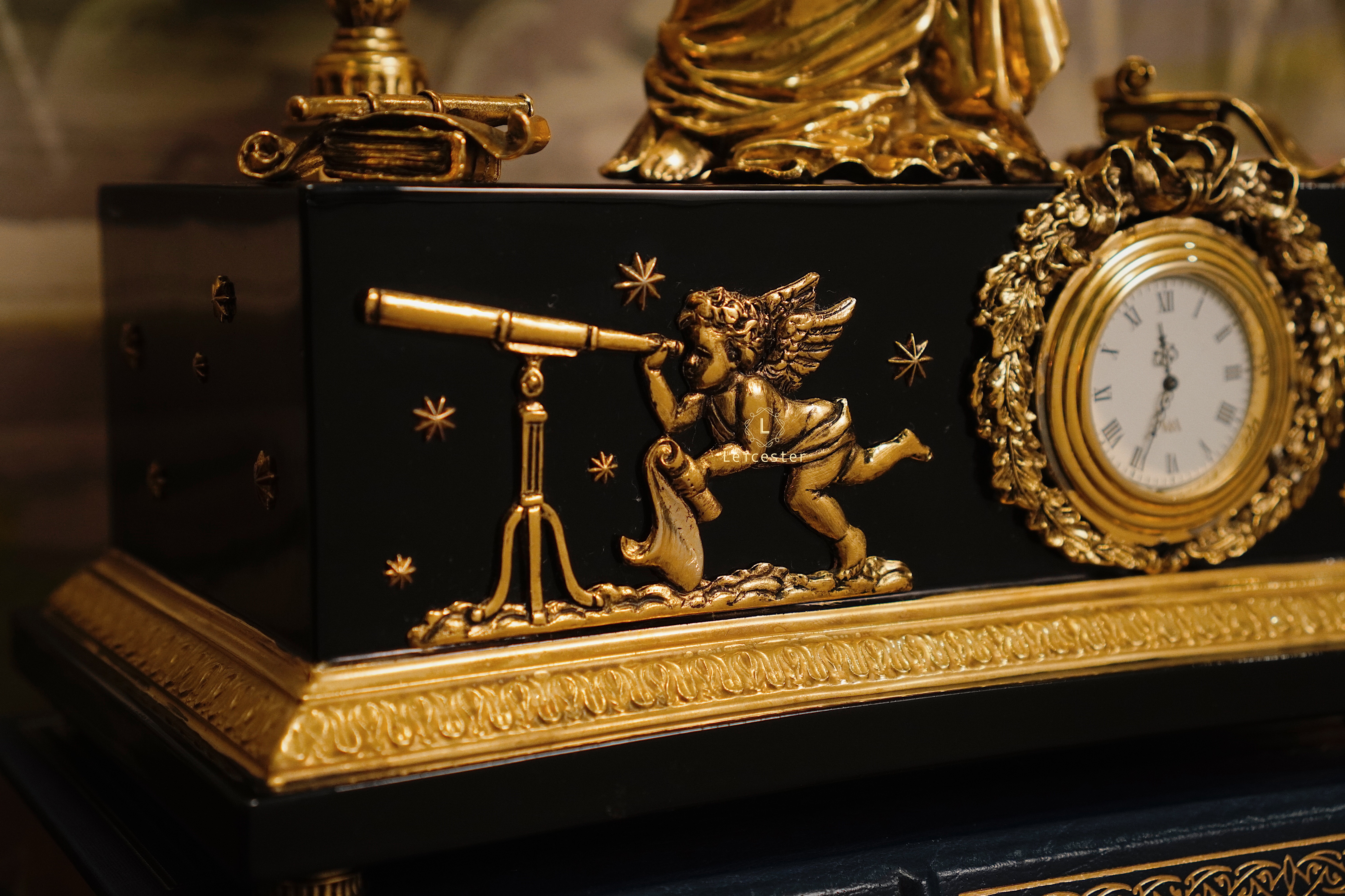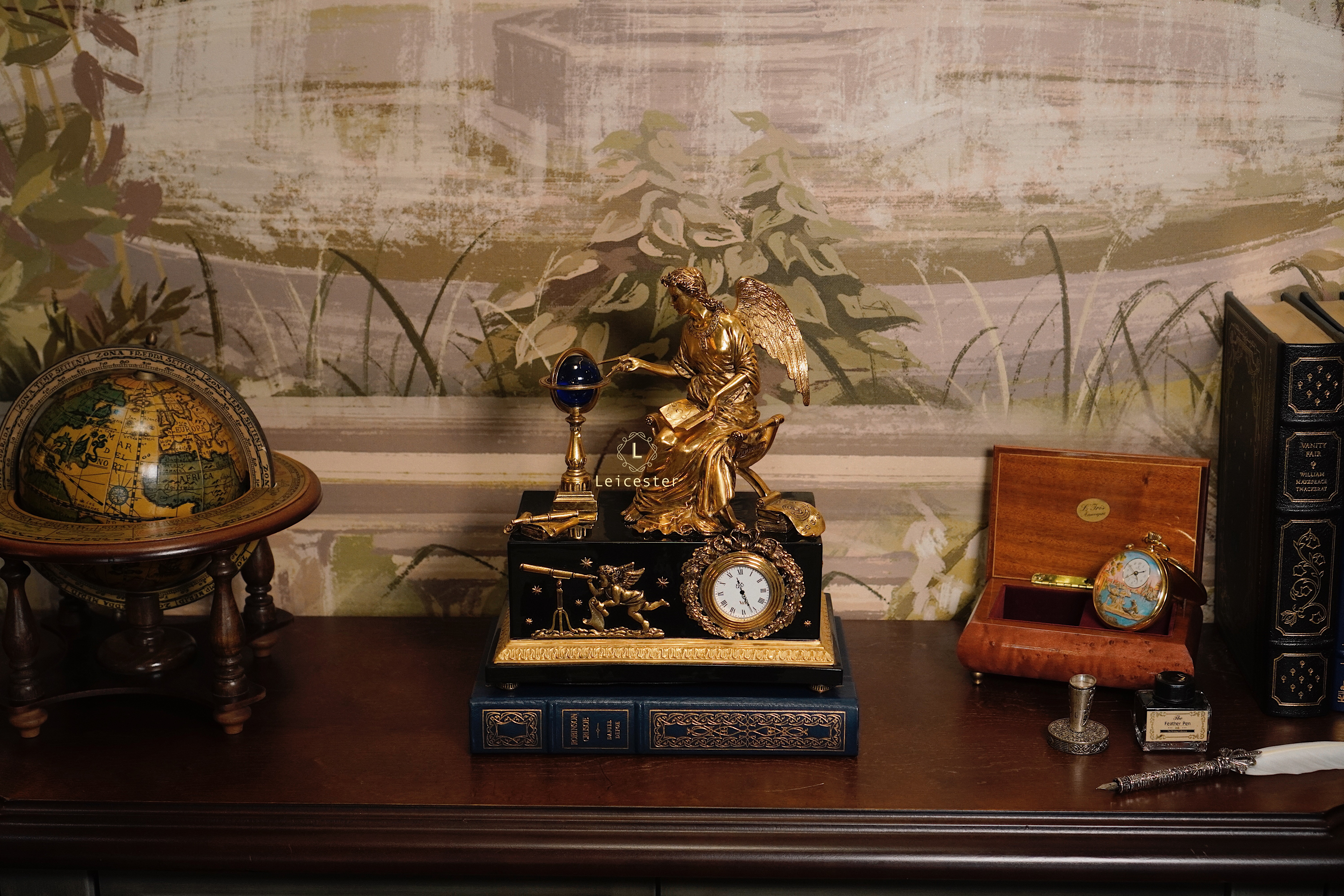 Đồng hồ để bàn Angel of the New Age không chỉ là một chiếc đồng hồ thông thường mà còn là biểu tượng của sự kết hợp giữa nghệ thuật cùng chức năng thực tiễn. Điểm nhấn cho toàn bộ thiết kế là hình ảnh một thiên thần đang ngồi nhìn về phía quả cầu thuỷ tinh với những biểu tượng thiên văn học vẽ trên đó. Mặt đồng hồ được gắn ở mặt trước phần đế, kế bên là hình ảnh một thiên thần nhỏ đang cầm kính viễn vọng, biểu tượng cho sự khám phá và tri thức. Đây không chỉ là một tác phẩm đầy sự tinh tế, sang trọng, quý phái mà còn mang lại giá trị lịch sử và nghệ thuật sâu sắc.