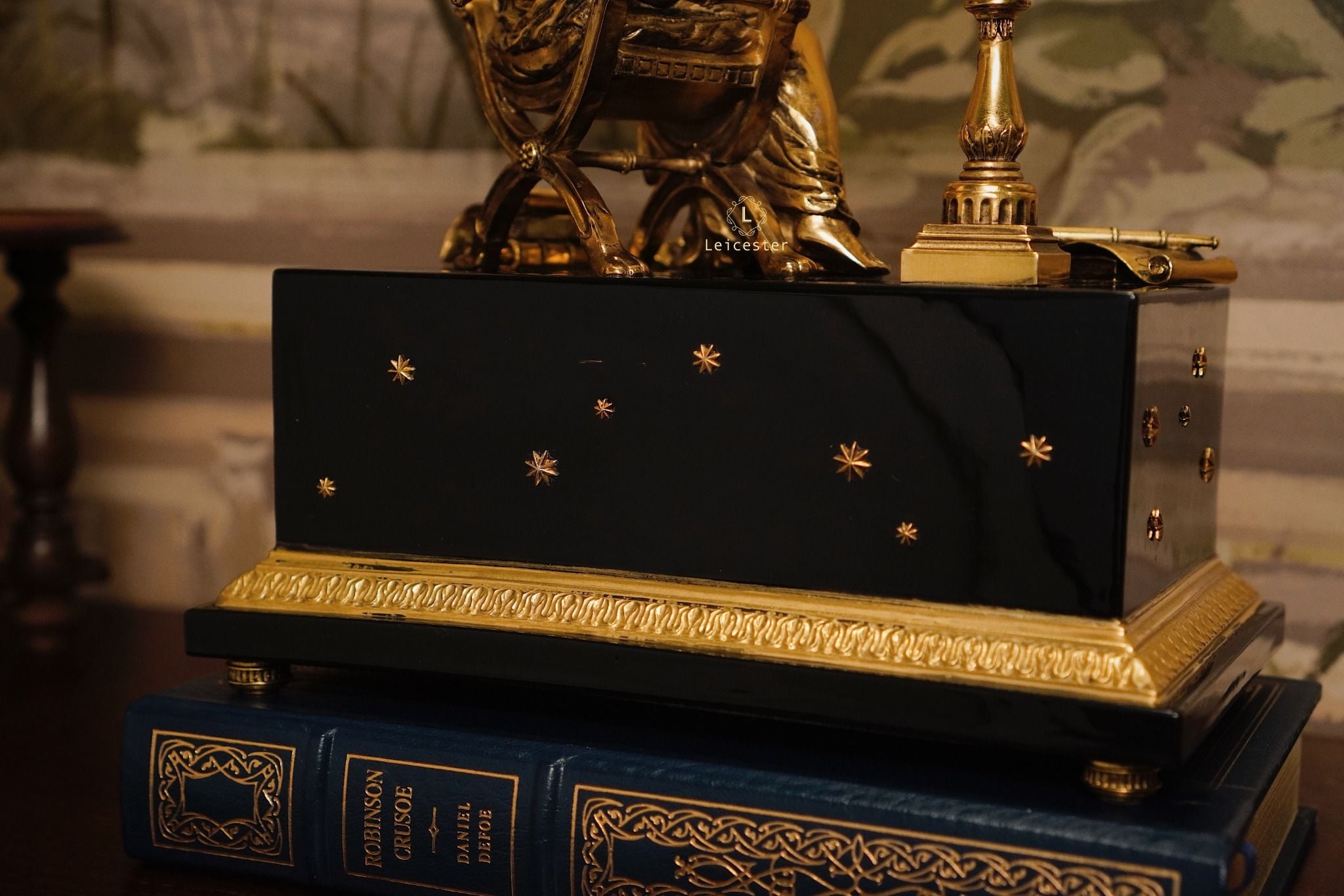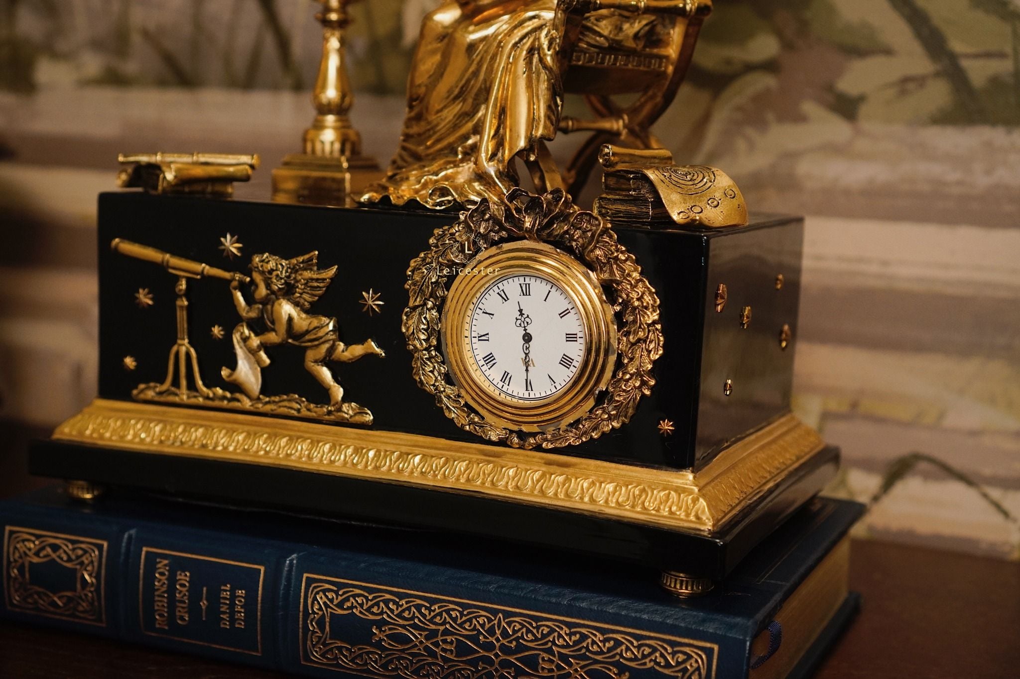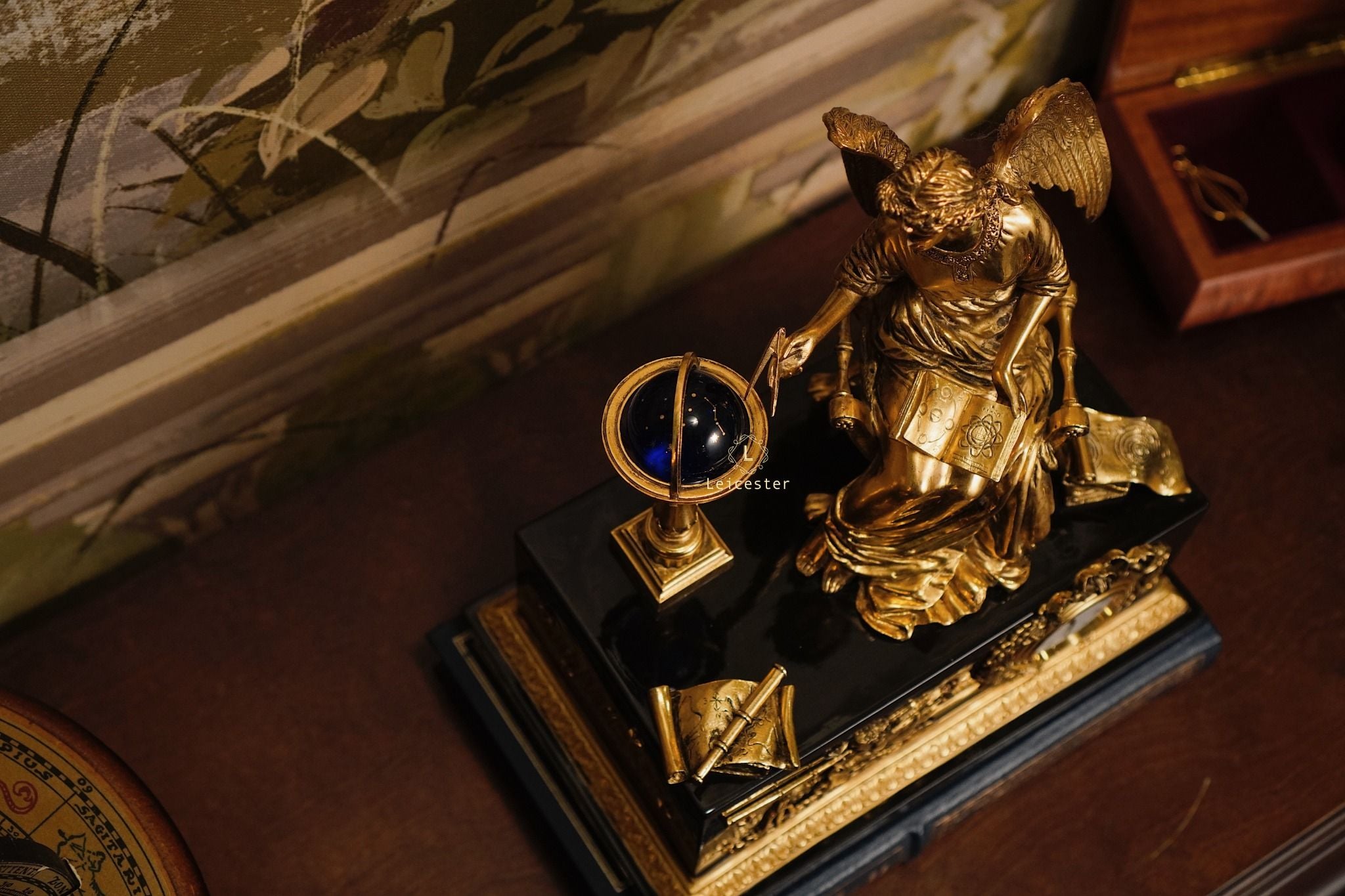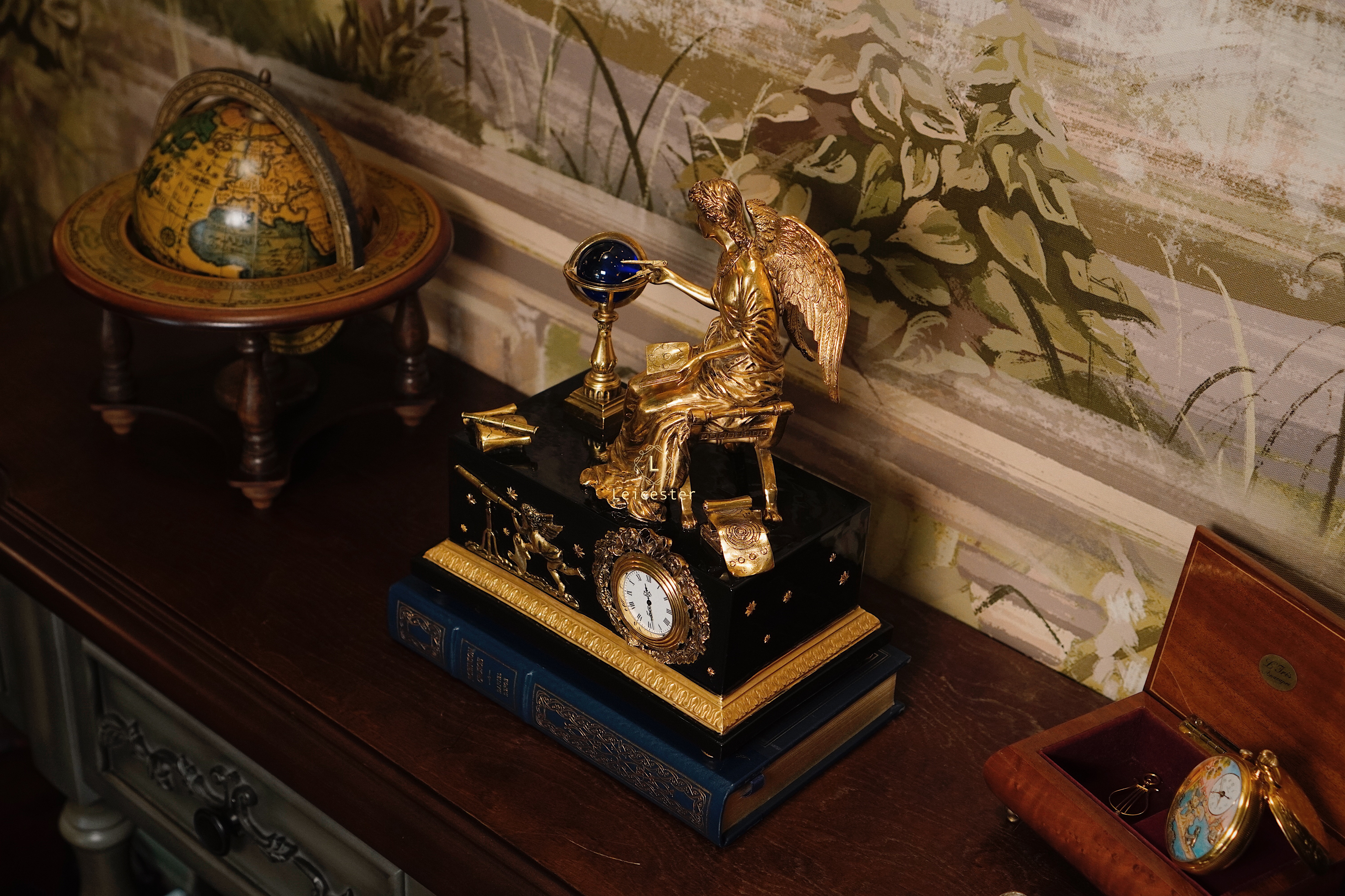 Đồng hồ để bàn Angel of the New Age không chỉ là một chiếc đồng hồ thông thường mà còn là biểu tượng của sự kết hợp giữa nghệ thuật cùng chức năng thực tiễn. Điểm nhấn cho toàn bộ thiết kế là hình ảnh một thiên thần đang ngồi nhìn về phía quả cầu thuỷ tinh với những biểu tượng thiên văn học vẽ trên đó. Mặt đồng hồ được gắn ở mặt trước phần đế, kế bên là hình ảnh một thiên thần nhỏ đang cầm kính viễn vọng, biểu tượng cho sự khám phá và tri thức. Đây không chỉ là một tác phẩm đầy sự tinh tế, sang trọng, quý phái mà còn mang lại giá trị lịch sử và nghệ thuật sâu sắc.