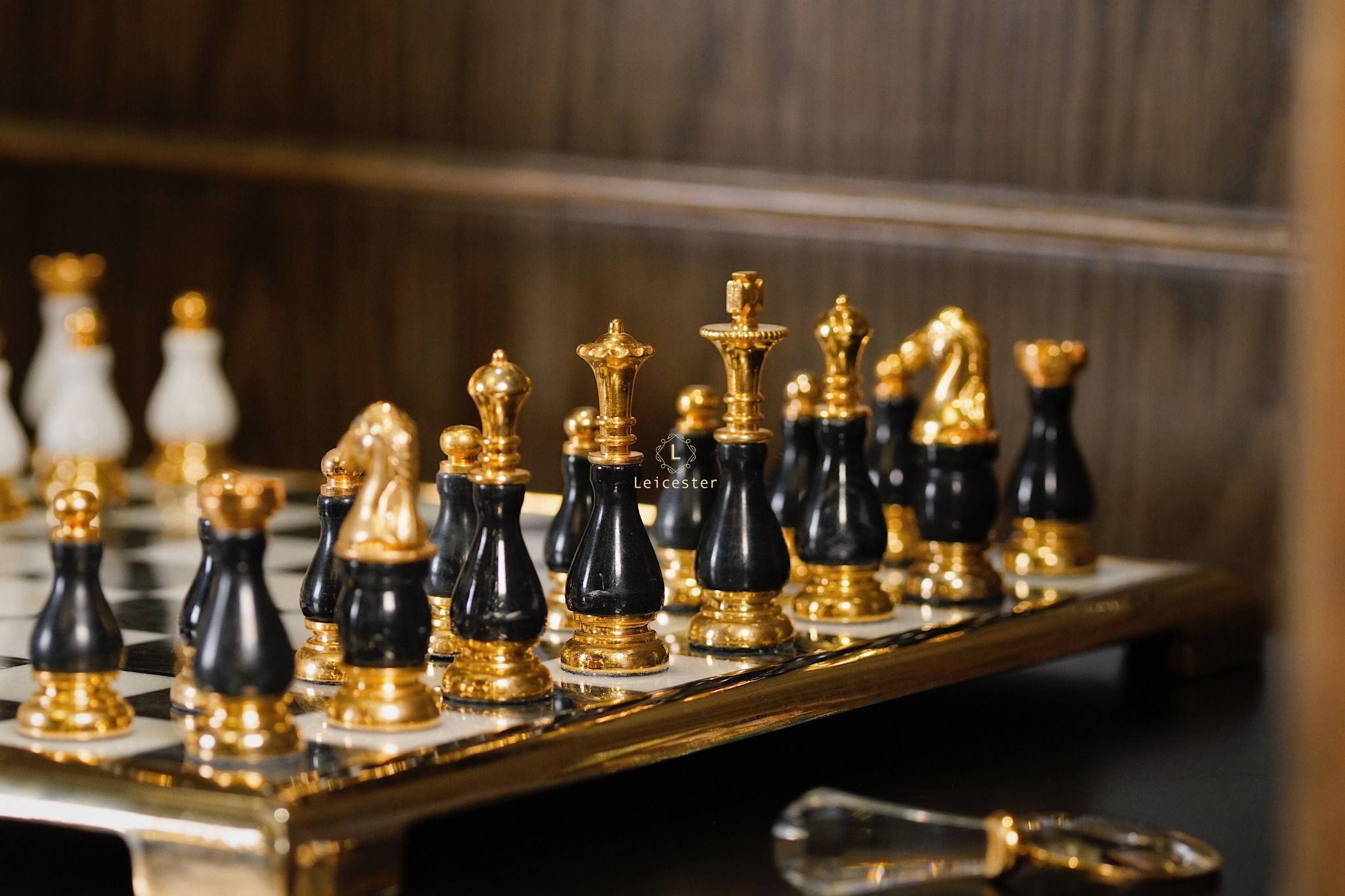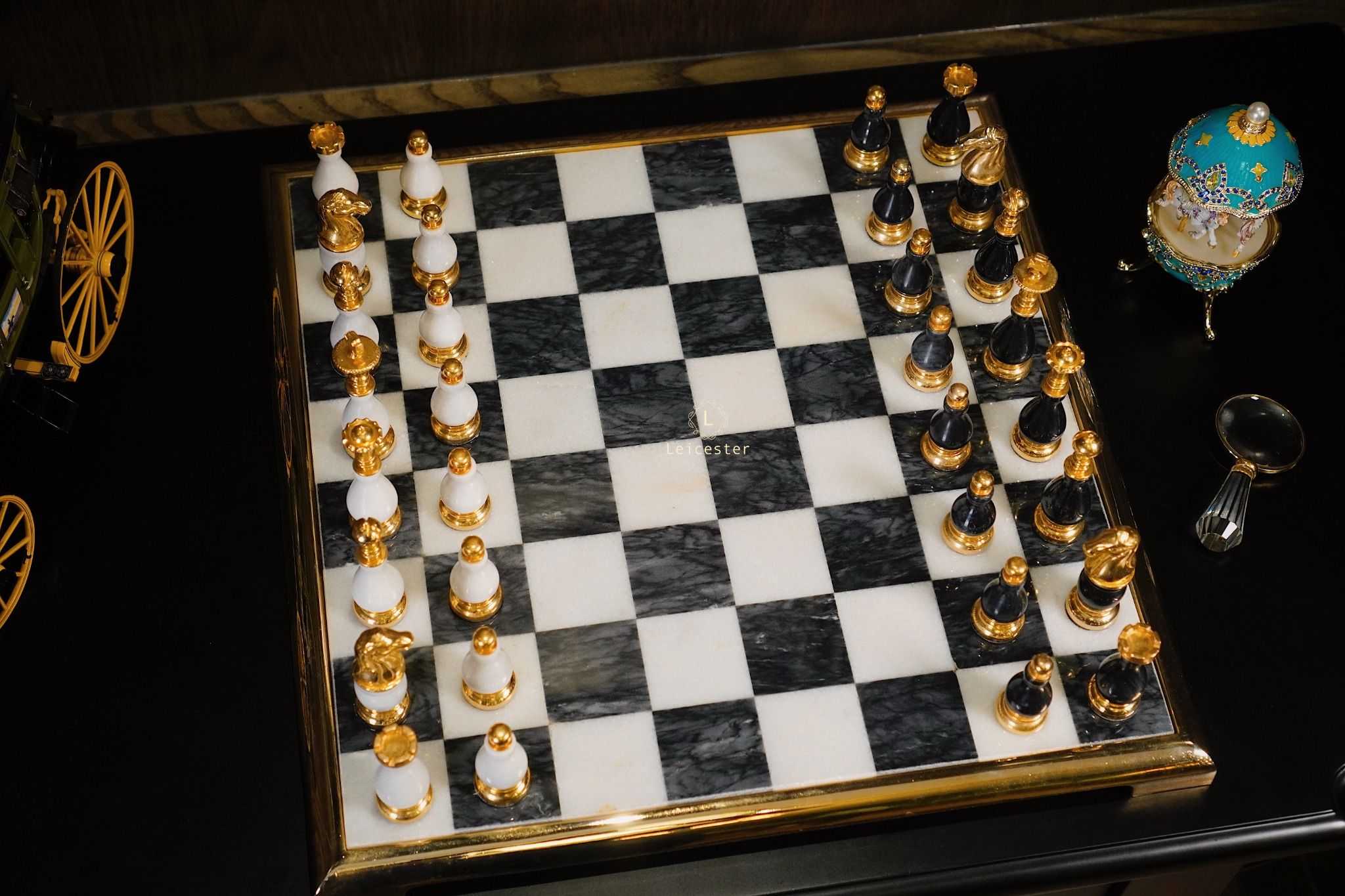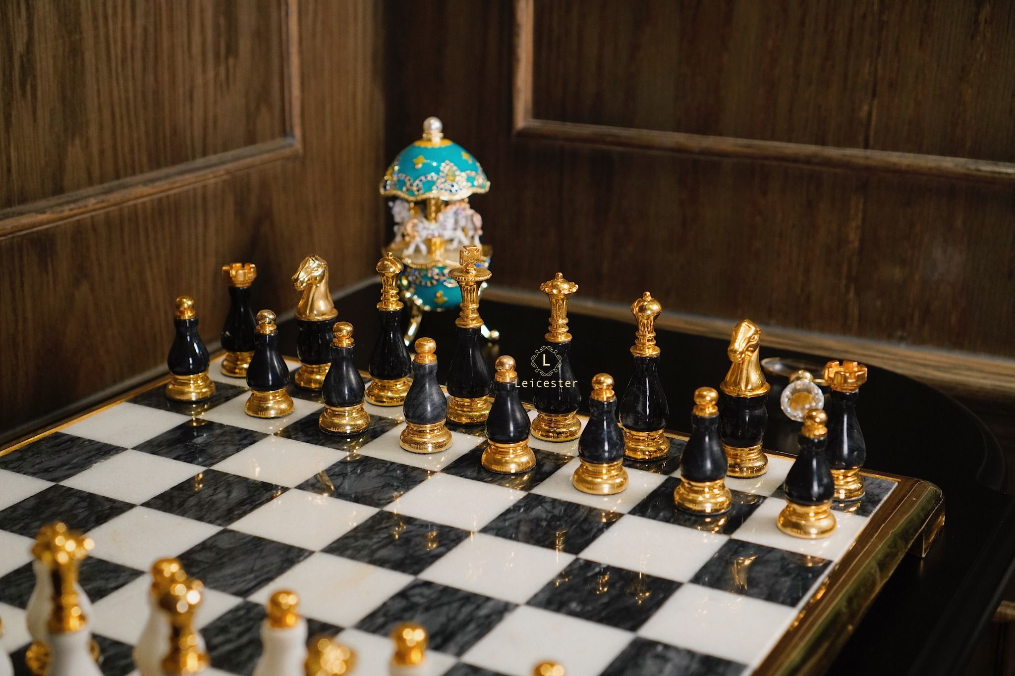 Là một kiệt tác được thiết kế dành cho những người đam mê bộ môn cờ vua, bàn cờ được làm thủ công bằng đá cẩm thạch đen và trắng kết hợp với kim loại mạ vàng, thiết kế theo kiểu dáng classic đã giúp bộ cờ trở nên sang trọng nhưng không kém phần cổ điển.