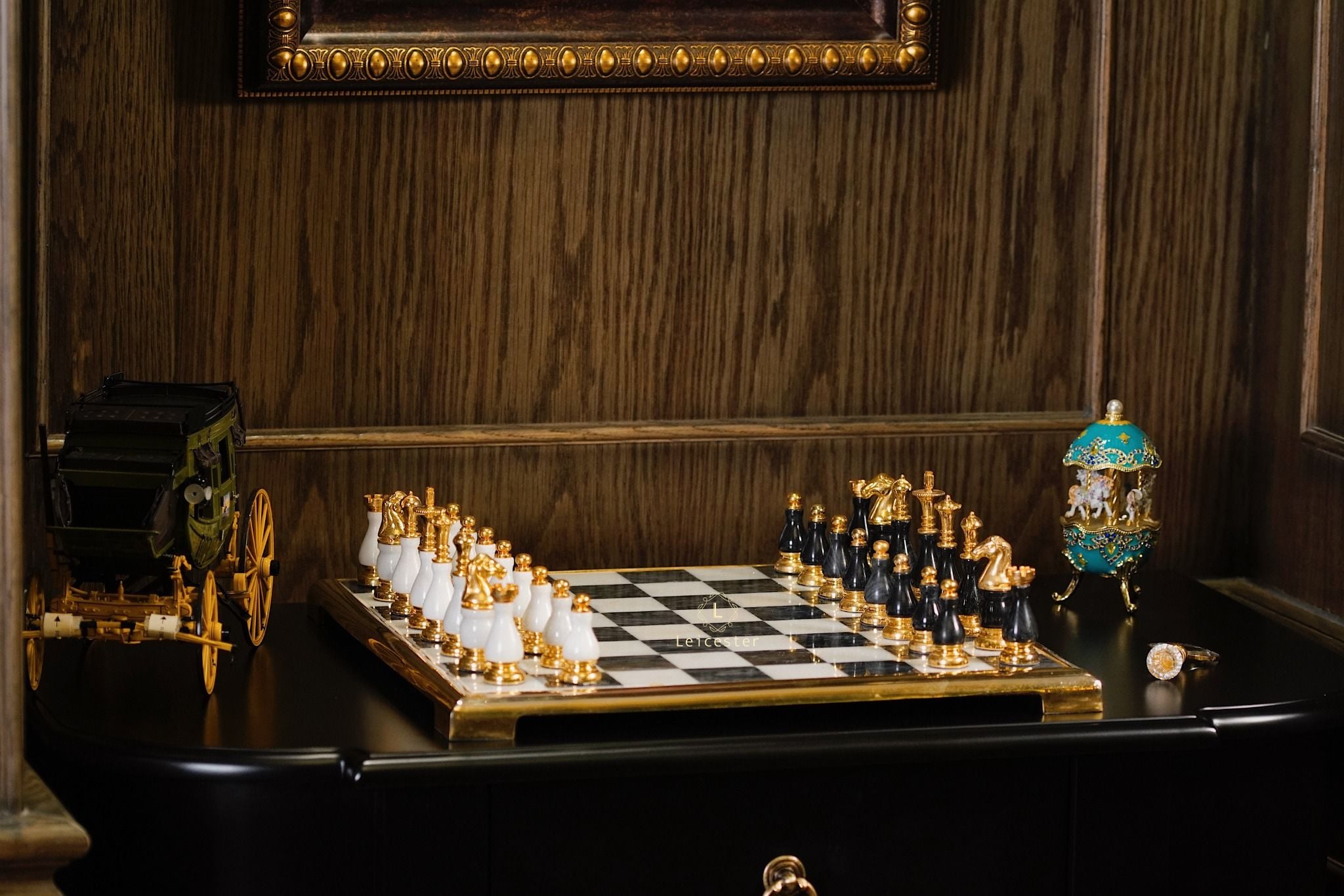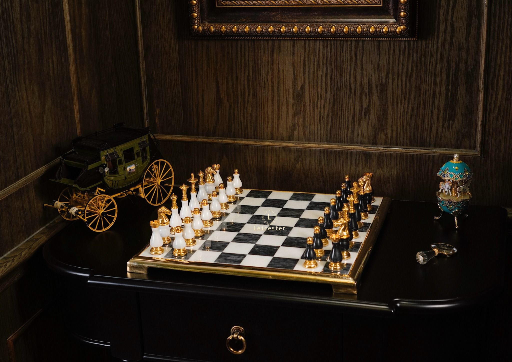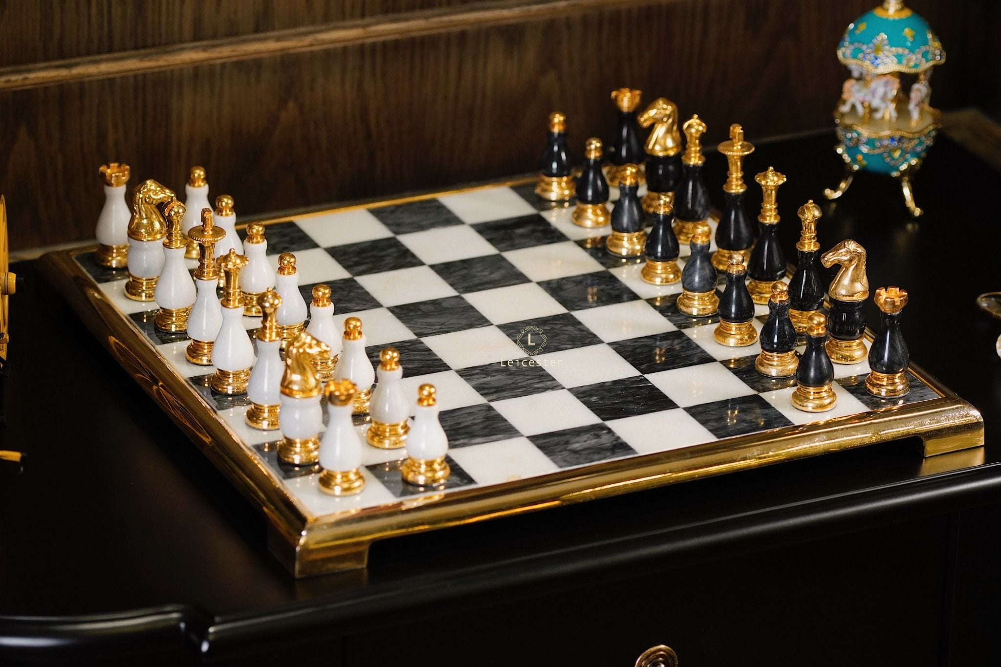 Là một kiệt tác được thiết kế dành cho những người đam mê bộ môn cờ vua, bàn cờ được làm thủ công bằng đá cẩm thạch đen và trắng kết hợp với kim loại mạ vàng, thiết kế theo kiểu dáng classic đã giúp bộ cờ trở nên sang trọng nhưng không kém phần cổ điển.