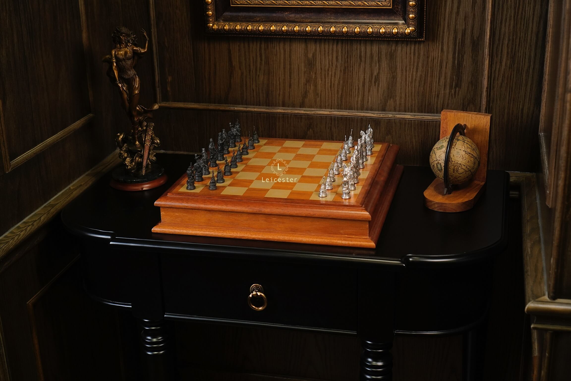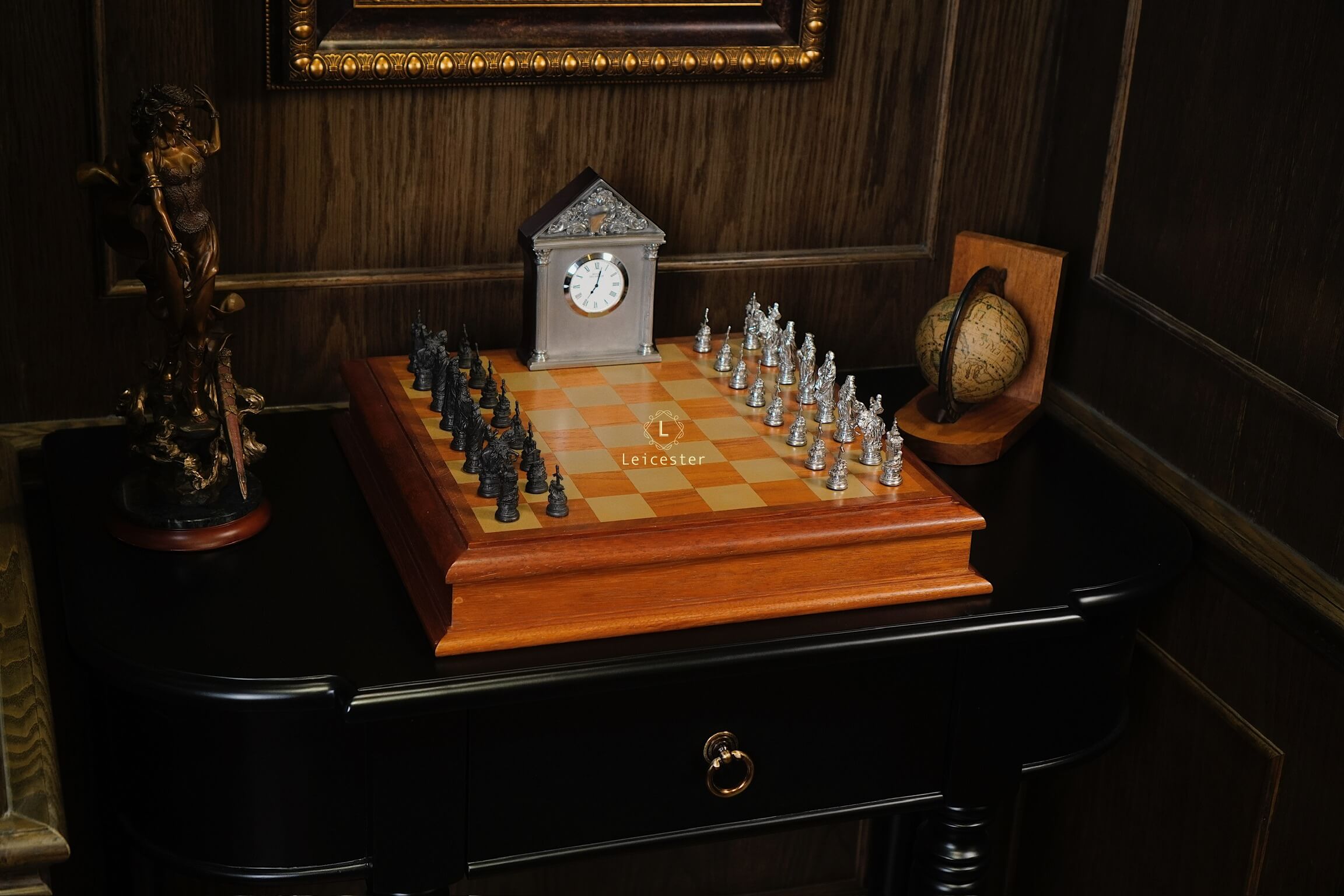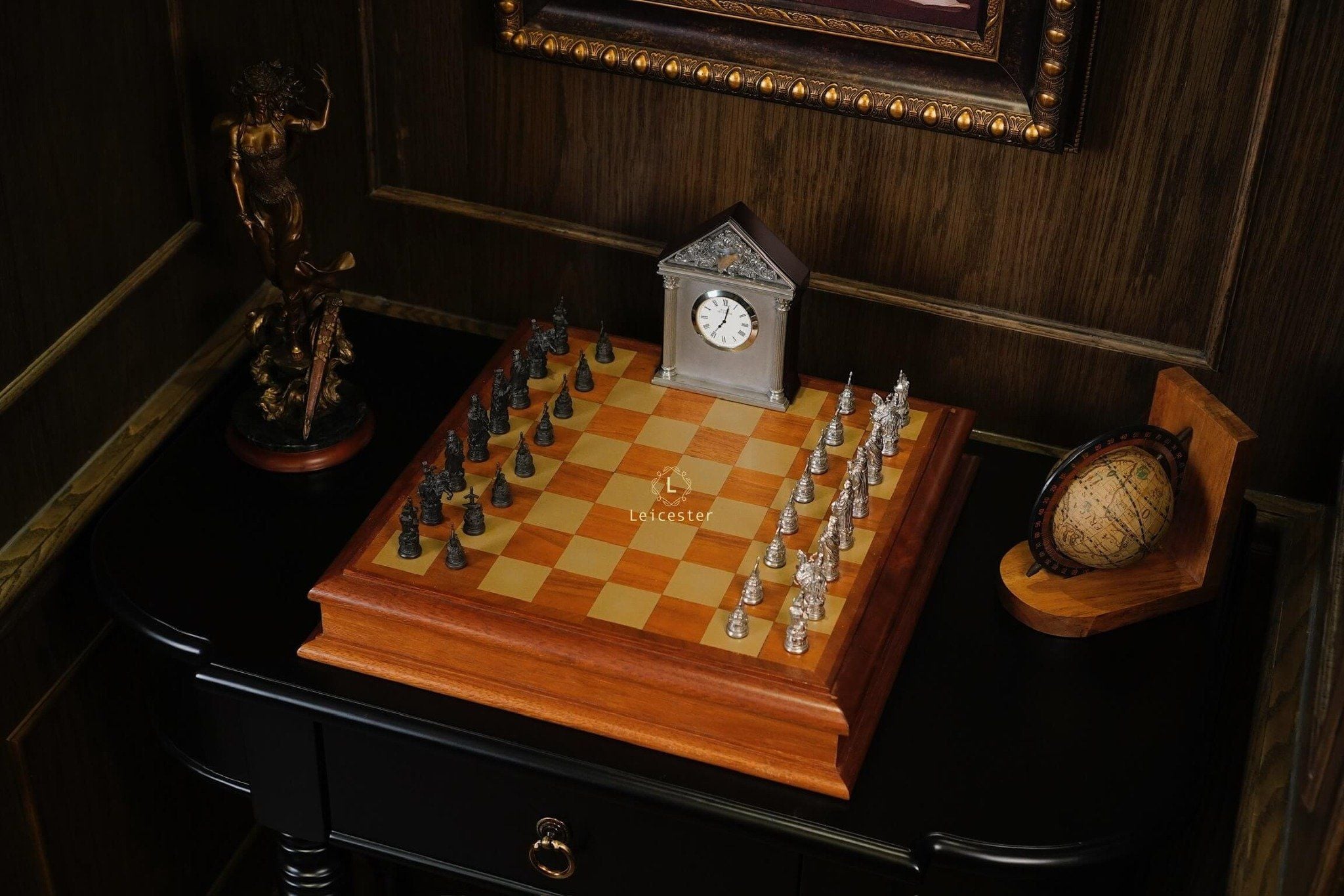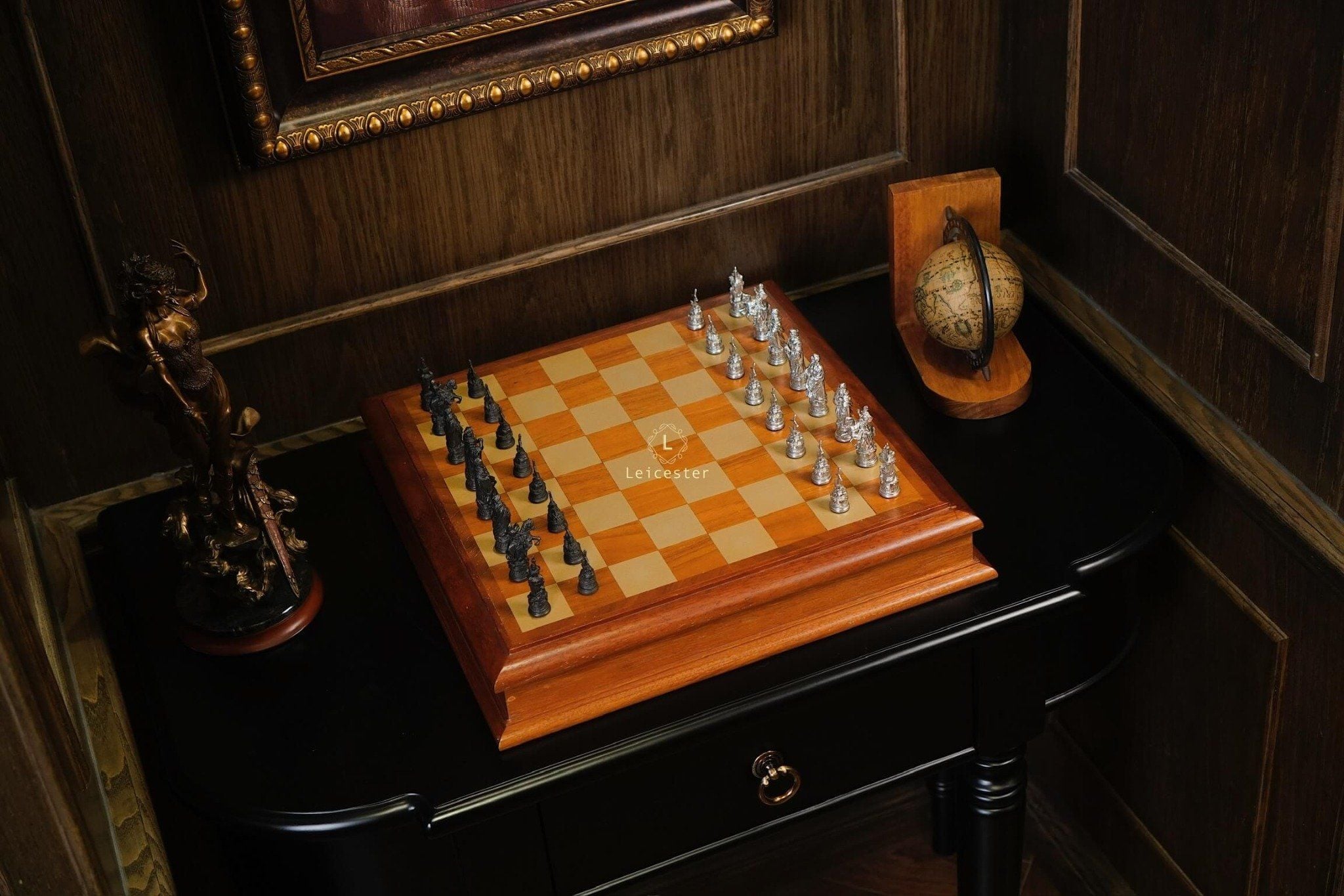 Bộ cờ vua Camelot lấy ý tưởng từ truyền thuyết vua Arthur trở thành đức vua vùng đất Camelot. Bàn cờ được thiết kế có một không hai với sự kết hợp của gỗ và pewter. Những quân cờ được làm tỉ mỉ từng chi tiết, một bên quân cờ được đánh bóng sáng, một bên để màu tối.