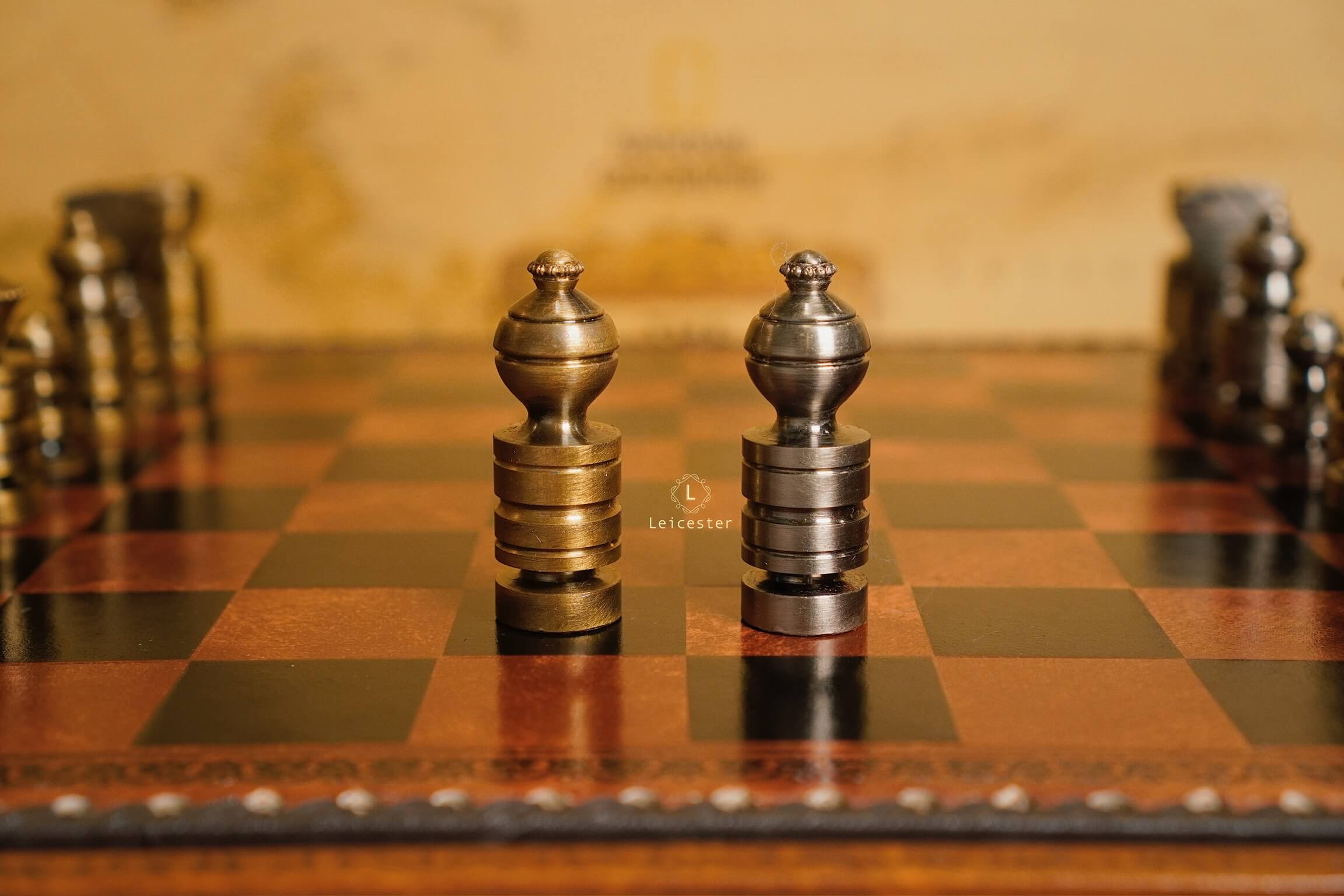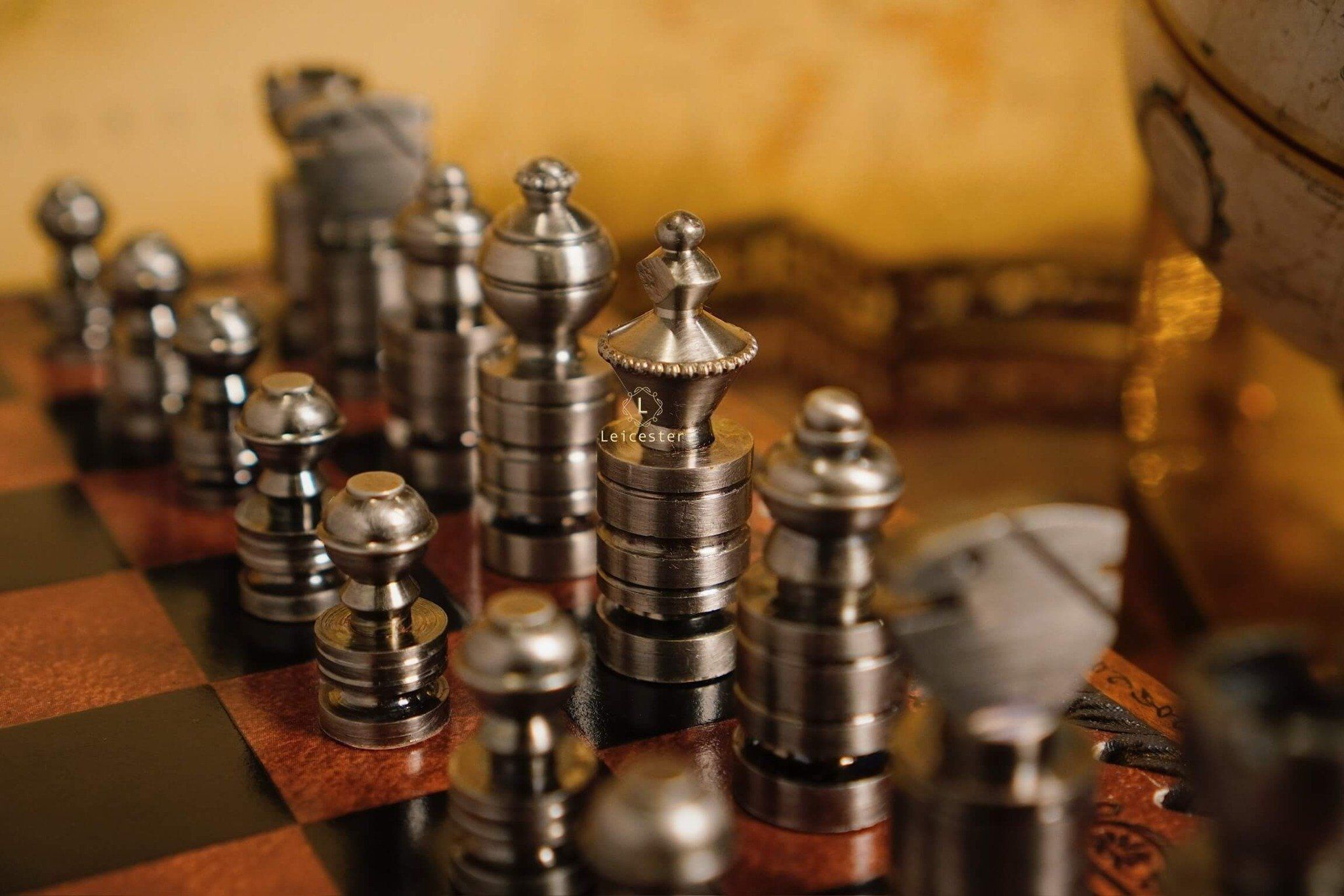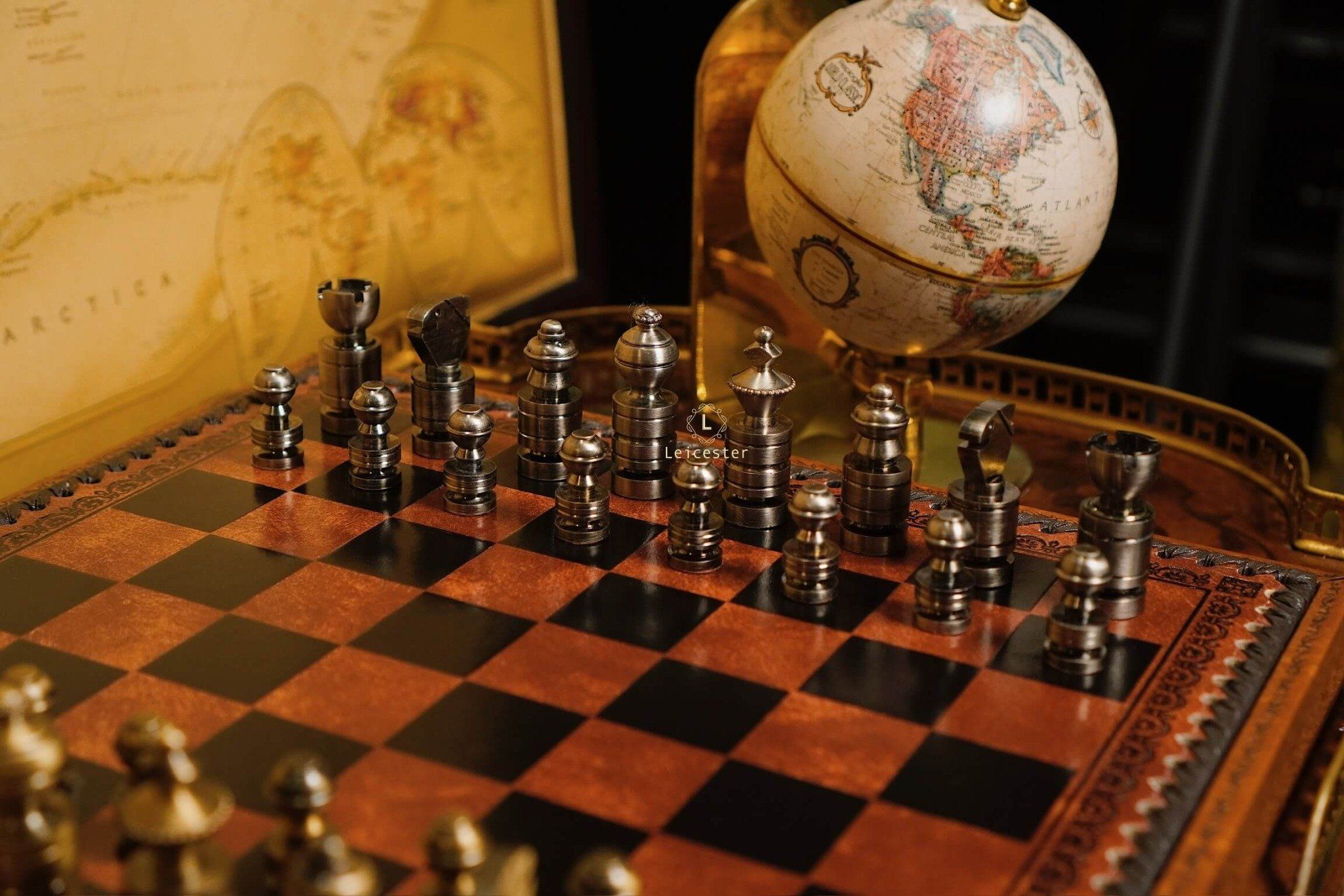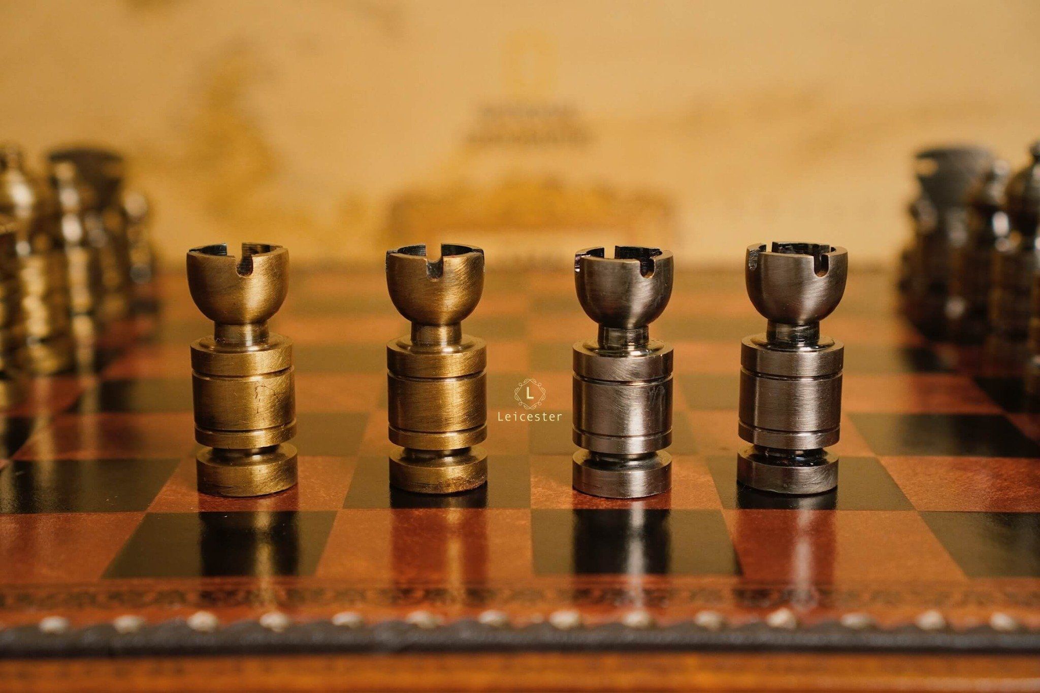 Mang thiết kế Nigri cổ điển, bộ cờ gây ấn tượng với các quân cờ đúc nguyên khối kim loại, dáng trụ tròn vững chãi, từng đường khắc đều thể hiện sự chuẩn xác và quyền uy. Hai tông vàng đồng và bạc tương phản tạo nên vẻ sang trọng cổ điển, gợi hình ảnh những chiến binh La Mã giữa đấu trường chiến lược. Bàn cờ gỗ phối da nâu ánh đồng, viền khắc hoa văn thủ công tinh tế, vừa mang khí chất cổ điển vừa tôn lên nét hiện đại.