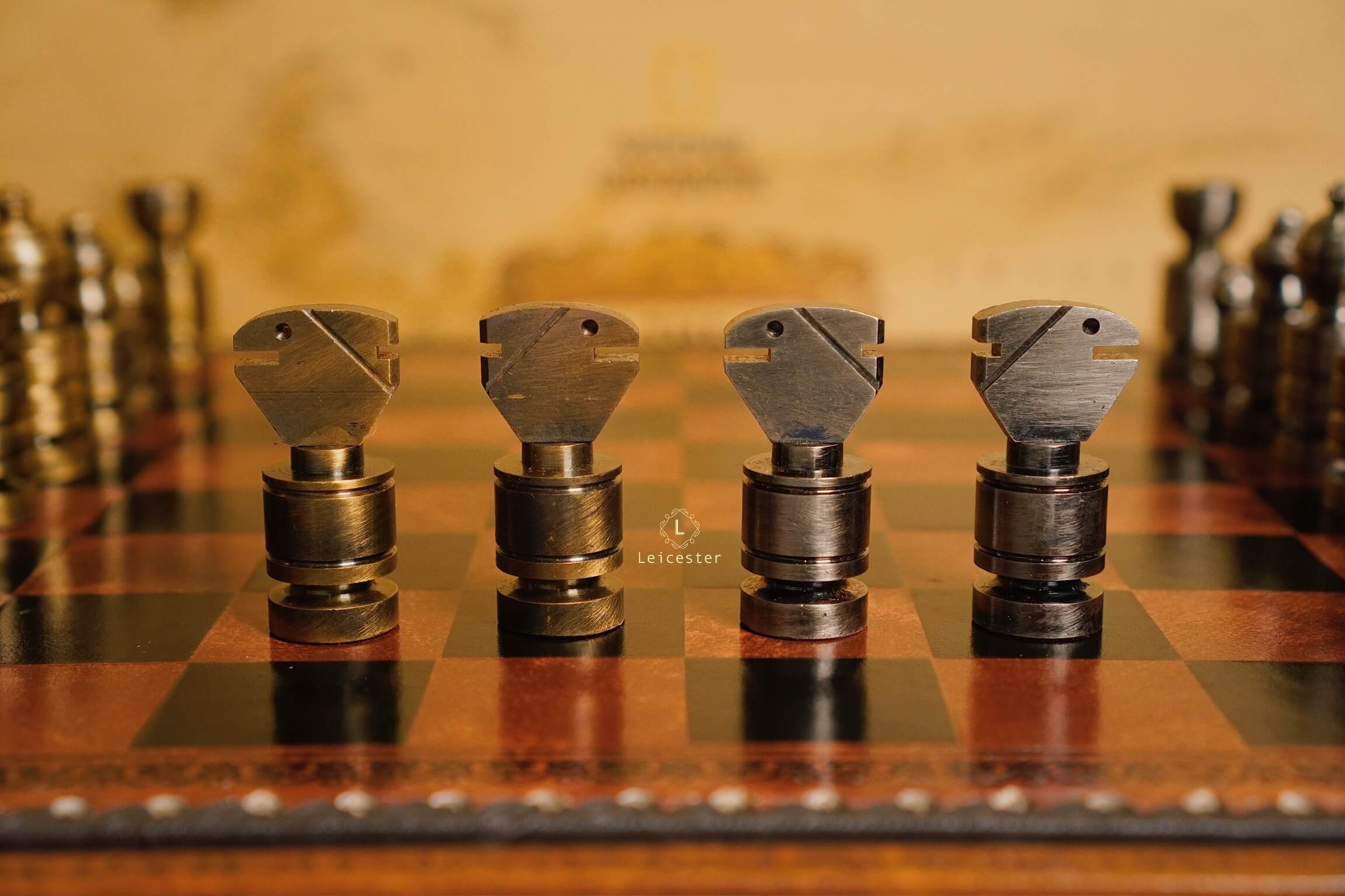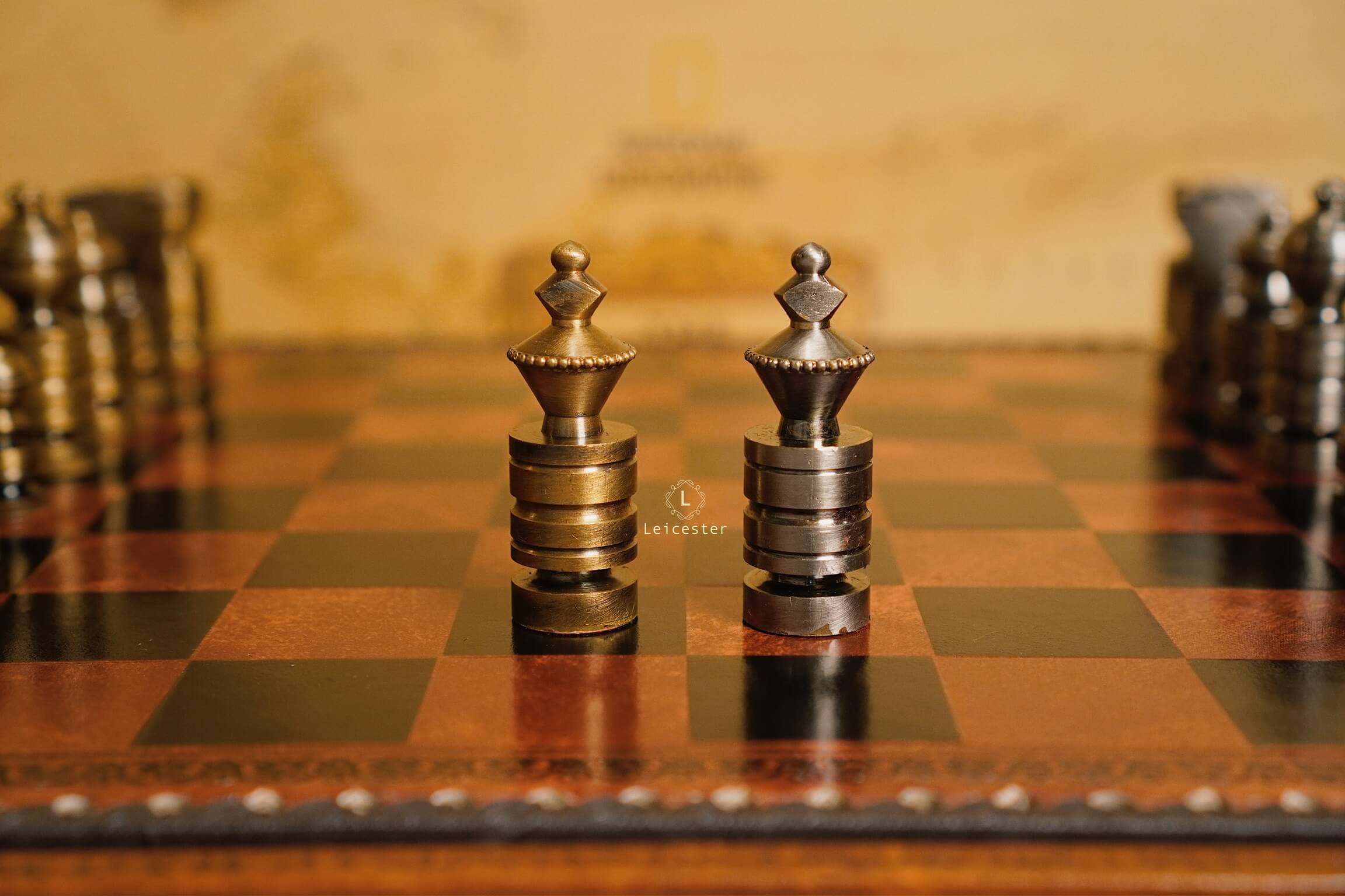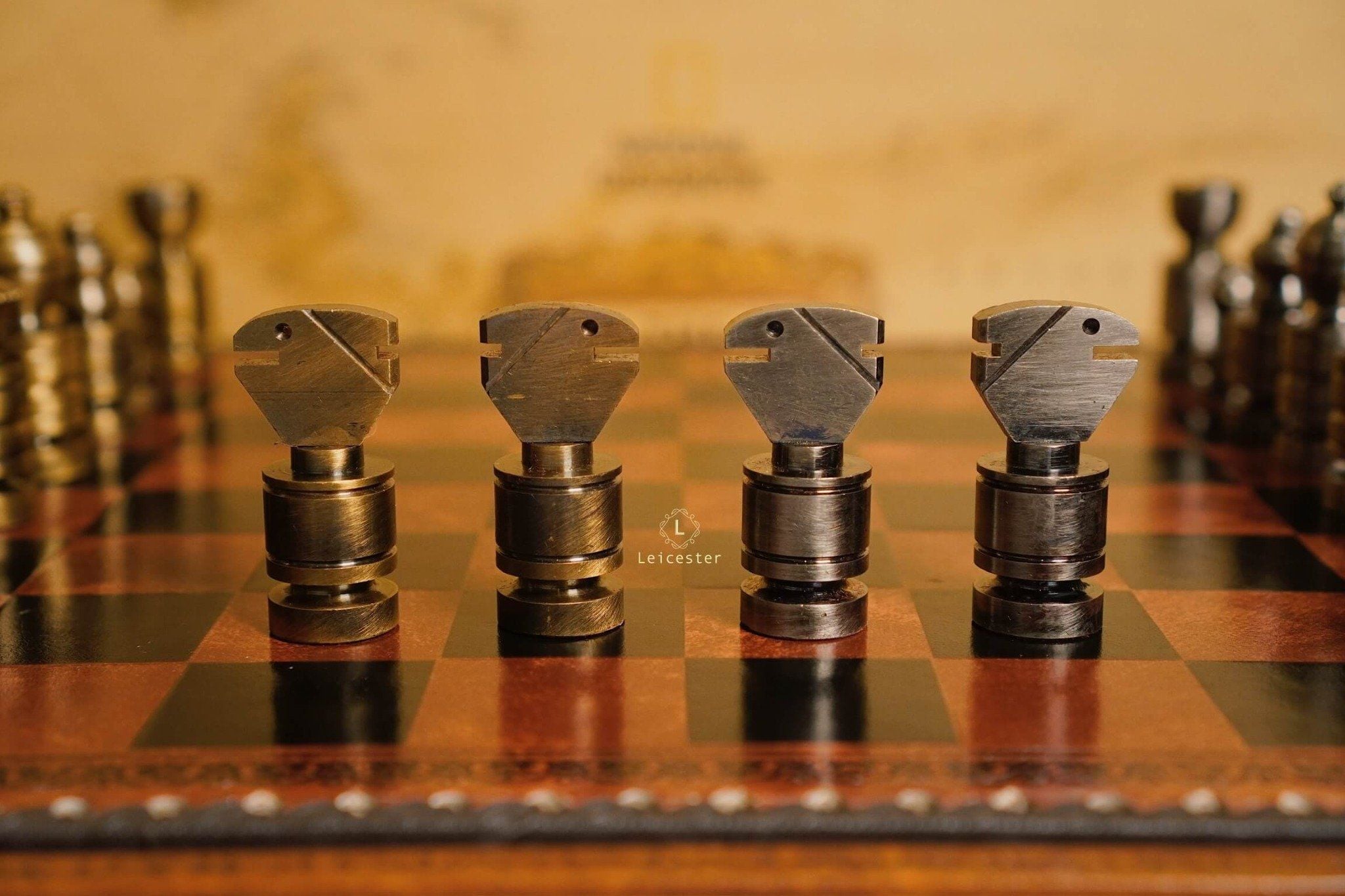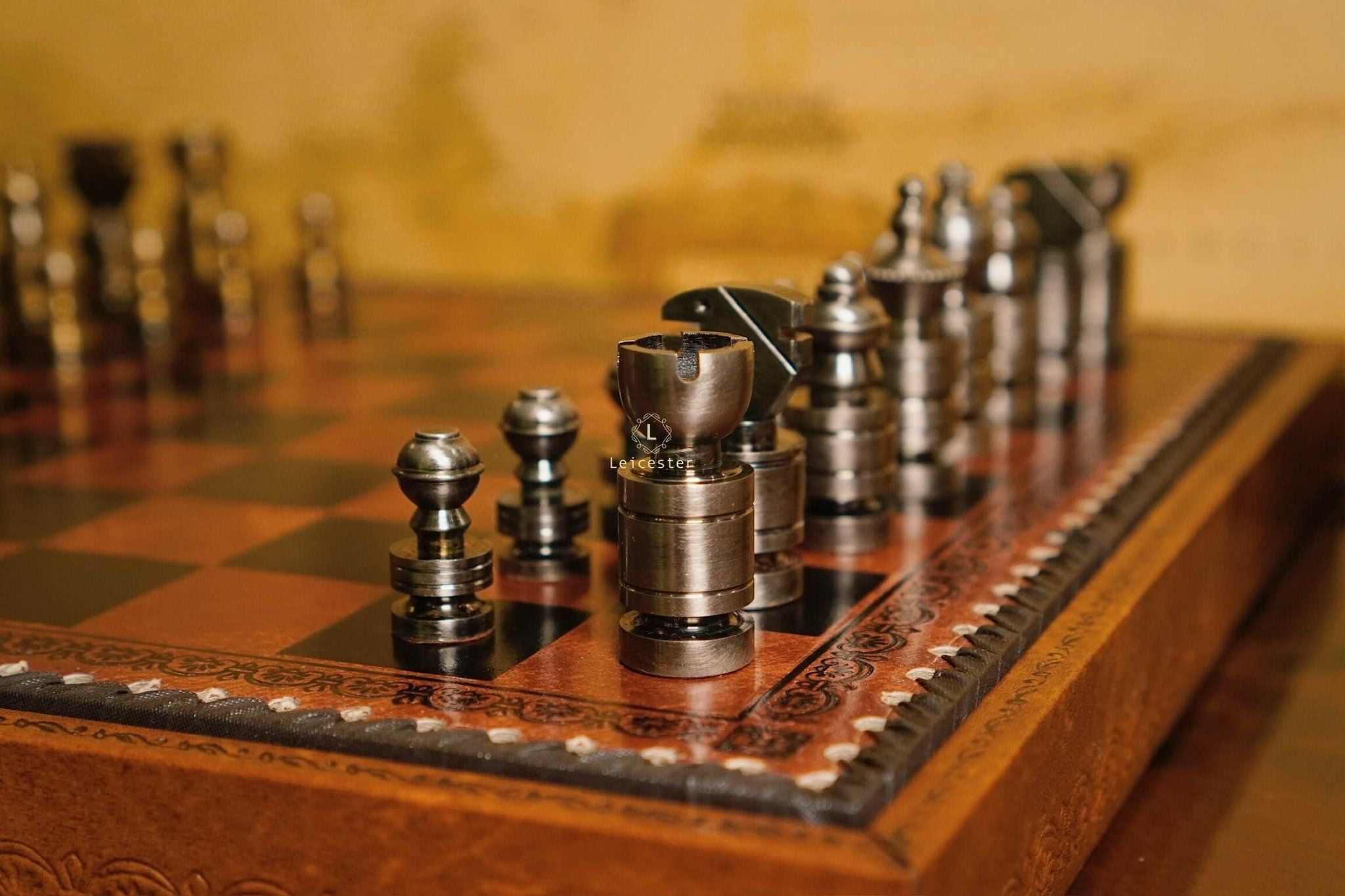 Mang thiết kế Nigri cổ điển, bộ cờ gây ấn tượng với các quân cờ đúc nguyên khối kim loại, dáng trụ tròn vững chãi, từng đường khắc đều thể hiện sự chuẩn xác và quyền uy. Hai tông vàng đồng và bạc tương phản tạo nên vẻ sang trọng cổ điển, gợi hình ảnh những chiến binh La Mã giữa đấu trường chiến lược. Bàn cờ gỗ phối da nâu ánh đồng, viền khắc hoa văn thủ công tinh tế, vừa mang khí chất cổ điển vừa tôn lên nét hiện đại.