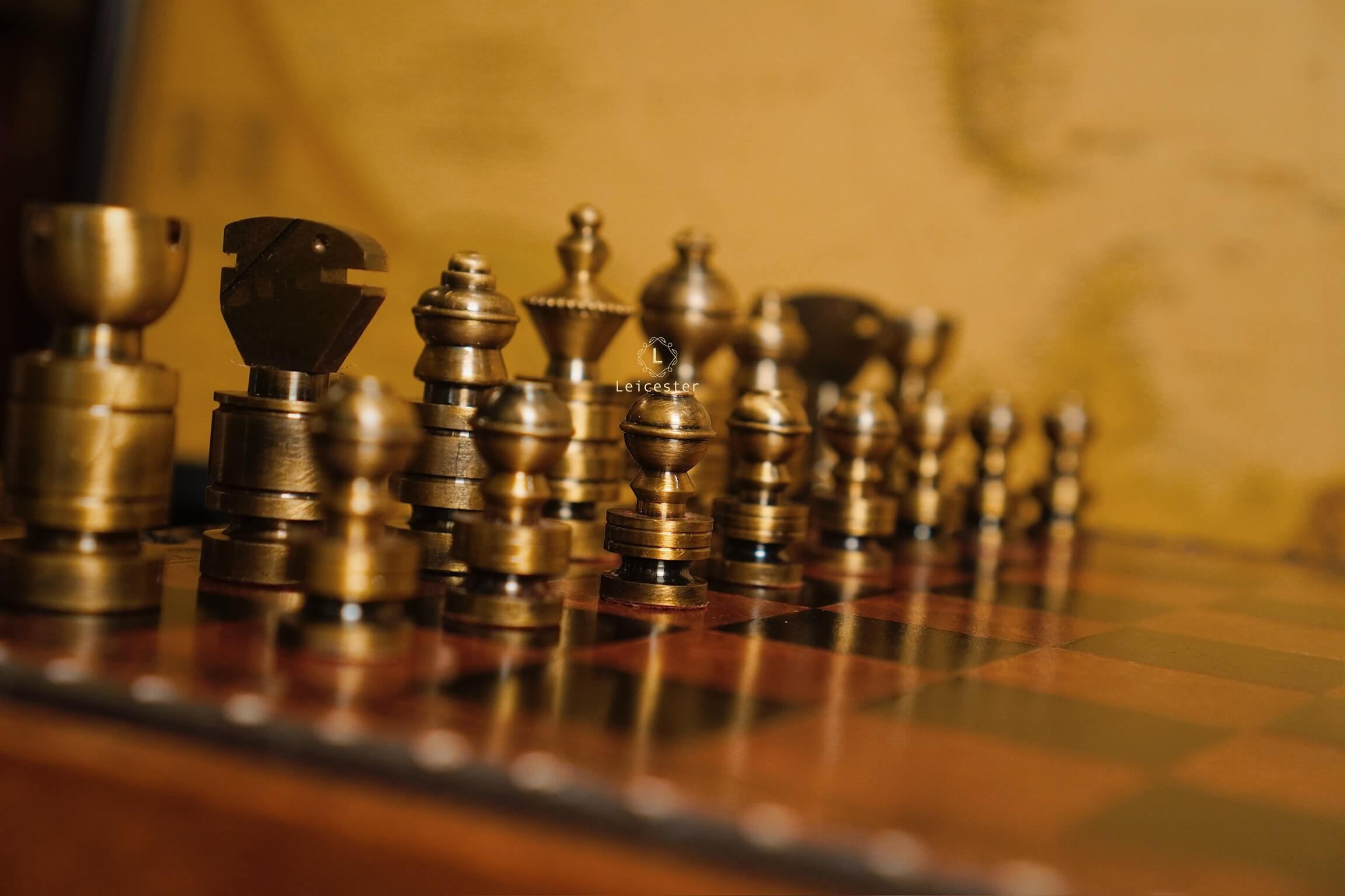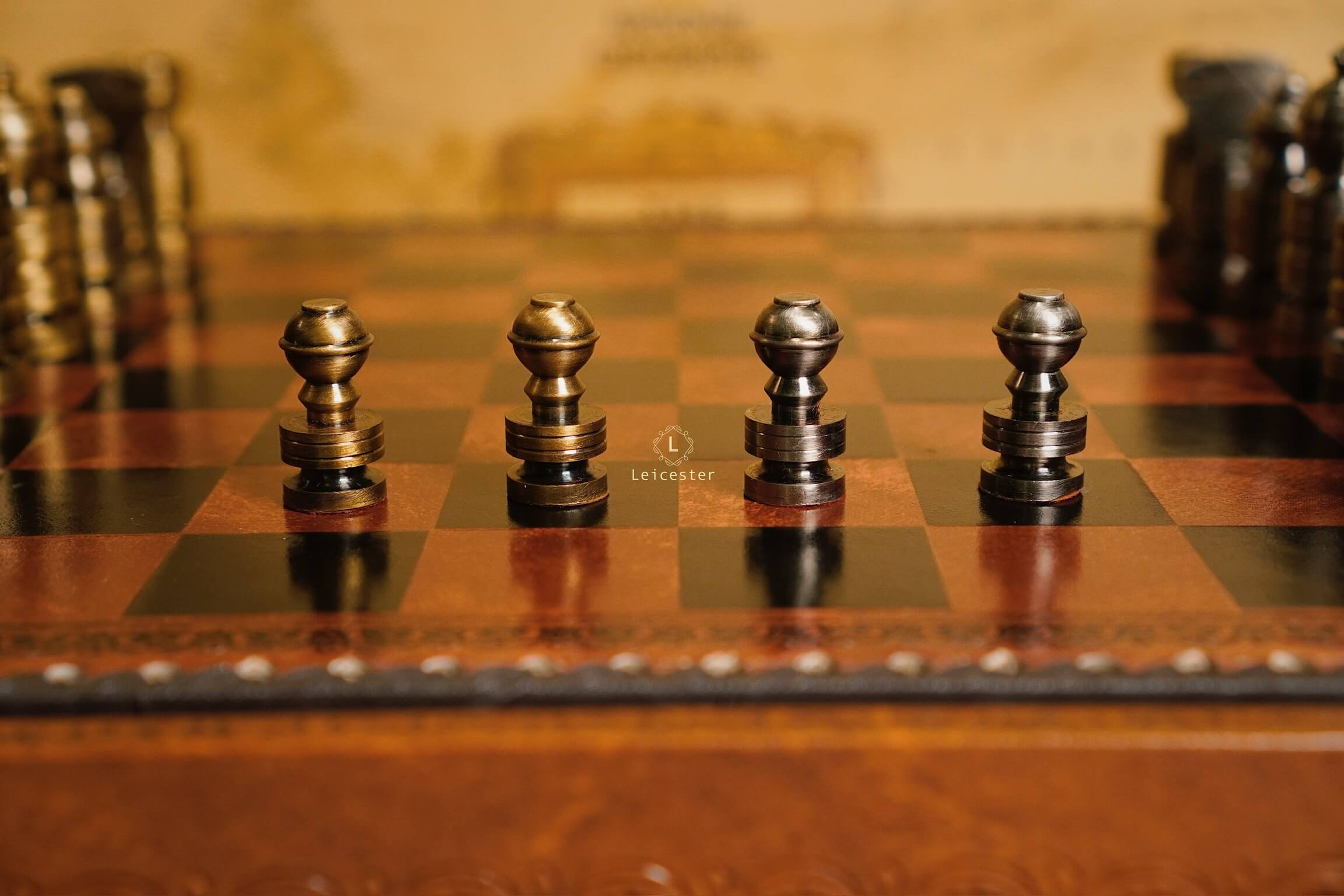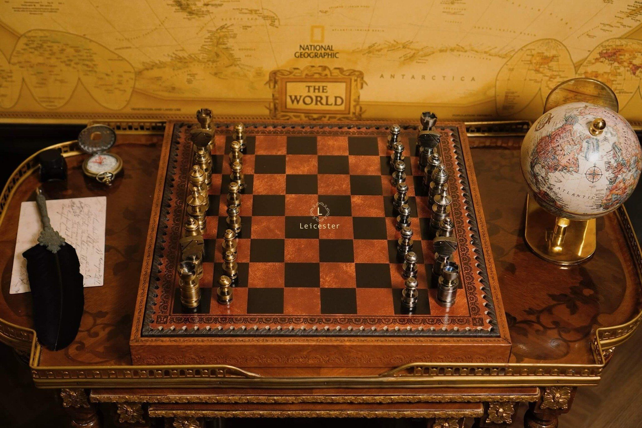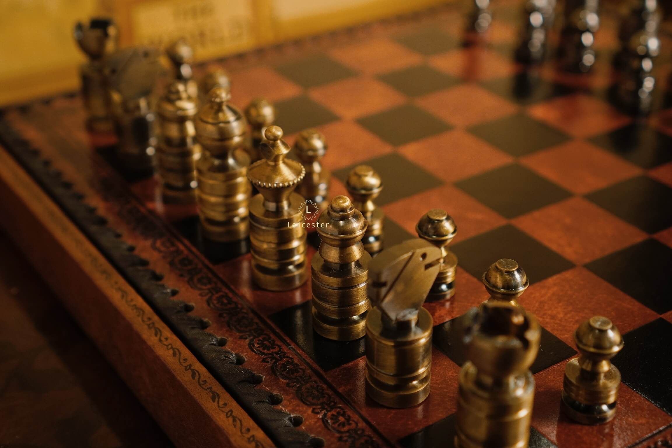 Mang thiết kế Nigri cổ điển, bộ cờ gây ấn tượng với các quân cờ đúc nguyên khối kim loại, dáng trụ tròn vững chãi, từng đường khắc đều thể hiện sự chuẩn xác và quyền uy. Hai tông vàng đồng và bạc tương phản tạo nên vẻ sang trọng cổ điển, gợi hình ảnh những chiến binh La Mã giữa đấu trường chiến lược. Bàn cờ gỗ phối da nâu ánh đồng, viền khắc hoa văn thủ công tinh tế, vừa mang khí chất cổ điển vừa tôn lên nét hiện đại.