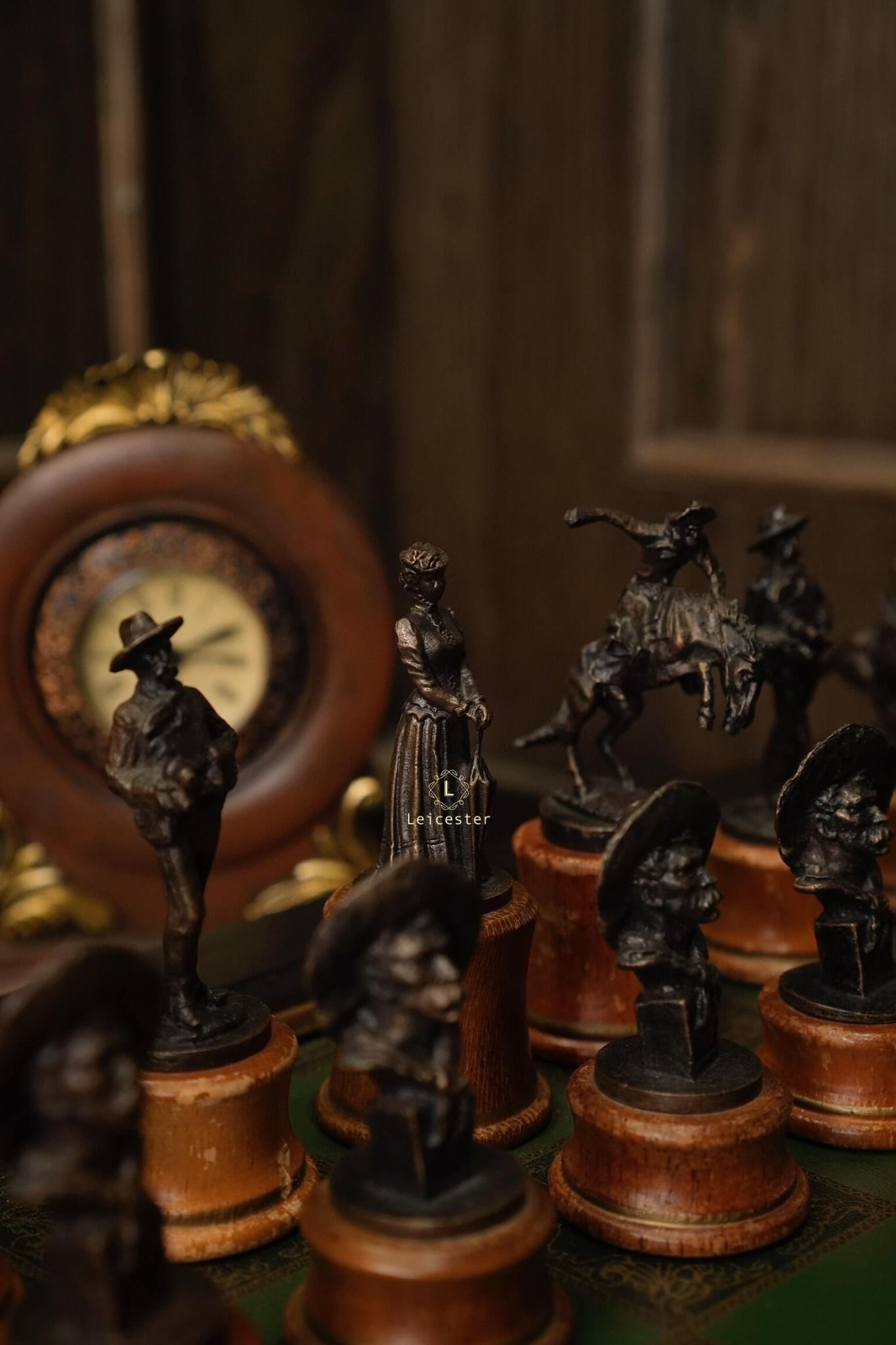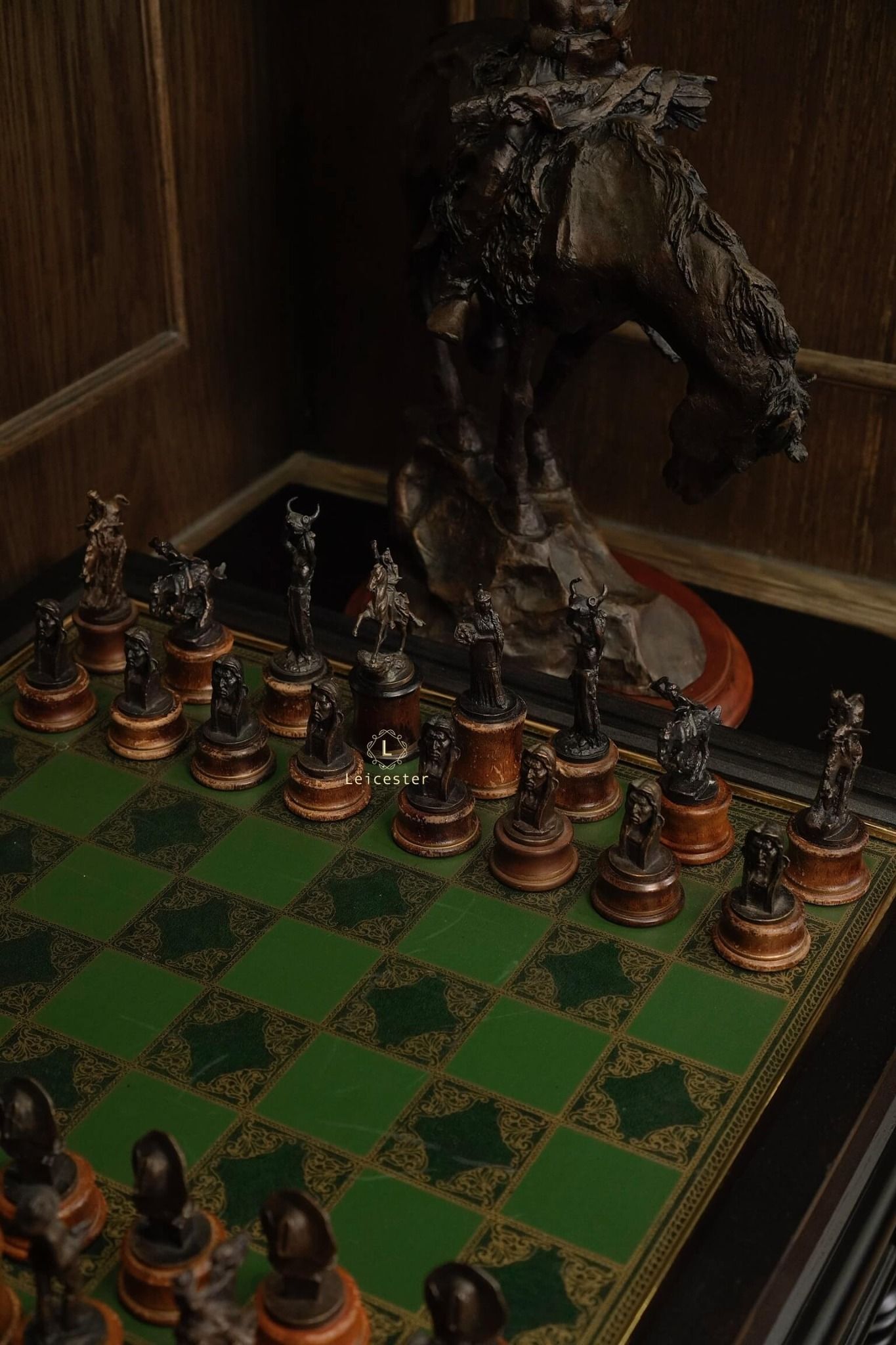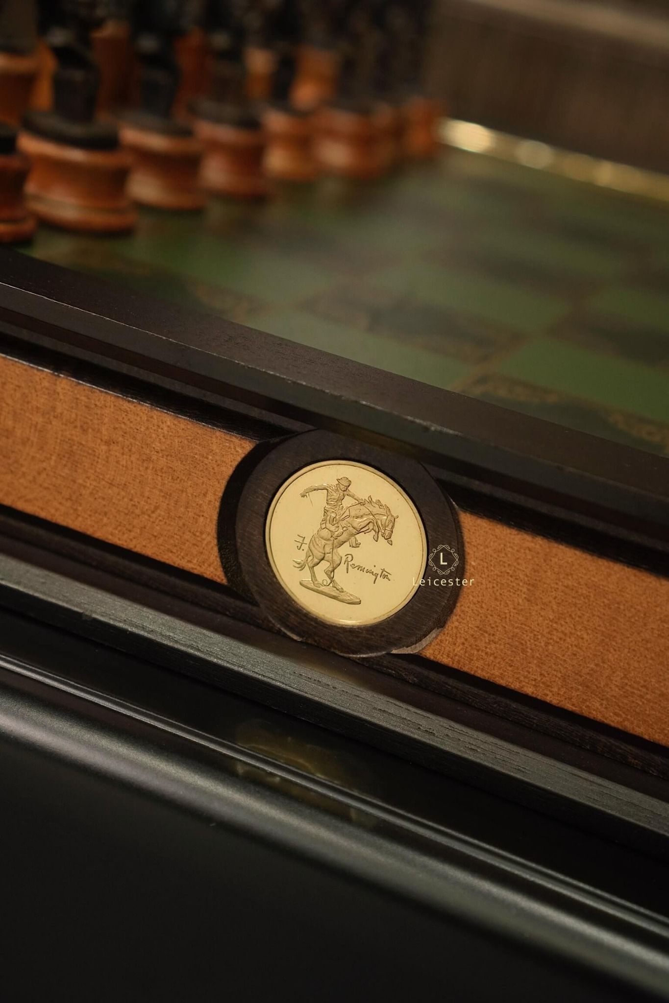 Quân cờ được điêu khắc bằng đồng đúc nóng nguyên khối - cùng loại vật liệu được sử dụng trong các tác phẩm điêu khắc ưa chuộng của Remington. Mỗi quân cờ được hoàn thiện thủ công với lớp gỉ cổ điển và gắn riêng lẻ trên đế gỗ cứng. Đồng thời, bàn cờ được làm bằng khung gỗ cứng có điểm nhấn là bốn huy chương bằng đồng thau, mỗi mặt một huy chương, được đúc nổi và mô tả biểu tượng trường tồn của thiên tài Remington - “The Bronco Buster”.