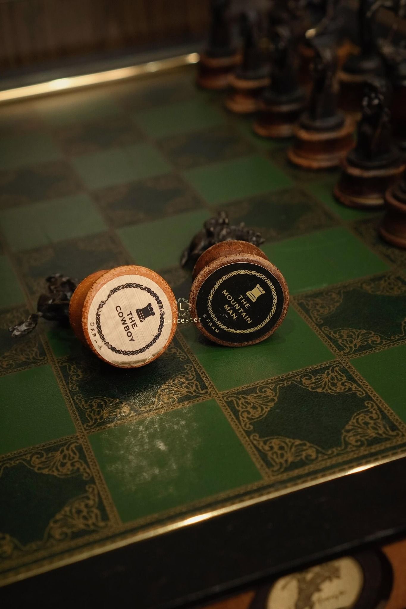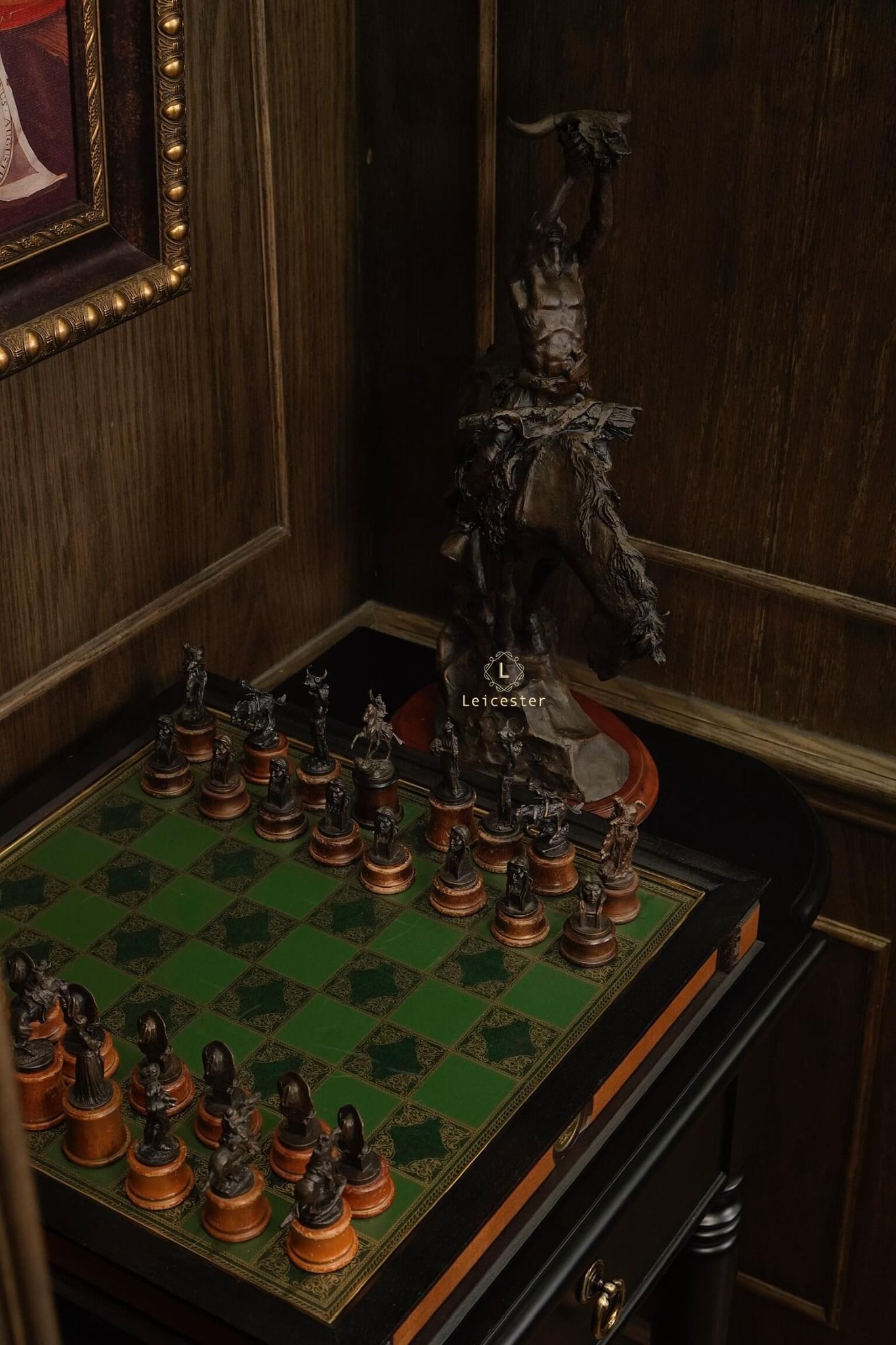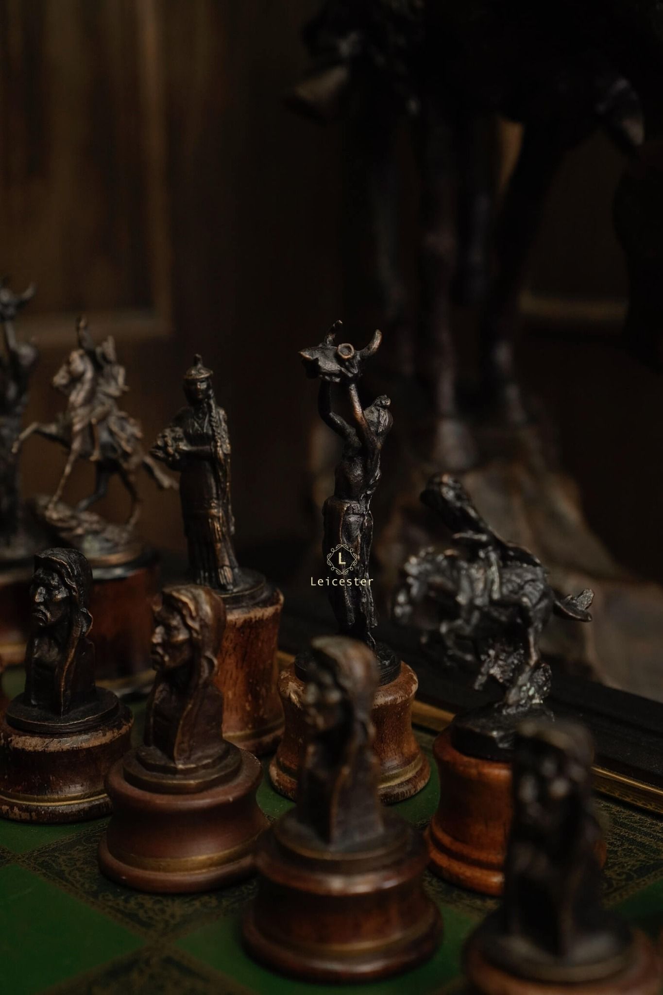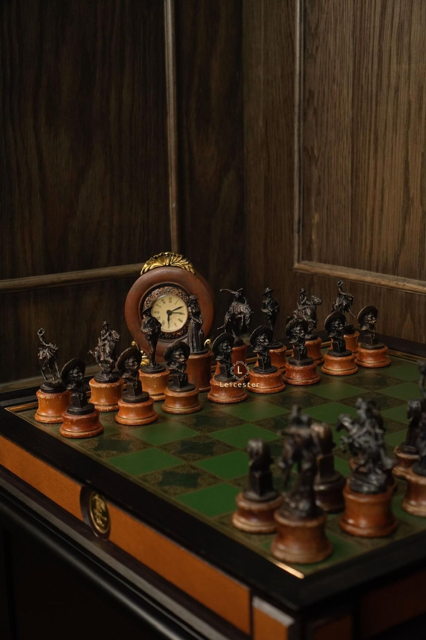 Quân cờ được điêu khắc bằng đồng đúc nóng nguyên khối - cùng loại vật liệu được sử dụng trong các tác phẩm điêu khắc ưa chuộng của Remington. Mỗi quân cờ được hoàn thiện thủ công với lớp gỉ cổ điển và gắn riêng lẻ trên đế gỗ cứng. Đồng thời, bàn cờ được làm bằng khung gỗ cứng có điểm nhấn là bốn huy chương bằng đồng thau, mỗi mặt một huy chương, được đúc nổi và mô tả biểu tượng trường tồn của thiên tài Remington - “The Bronco Buster”.