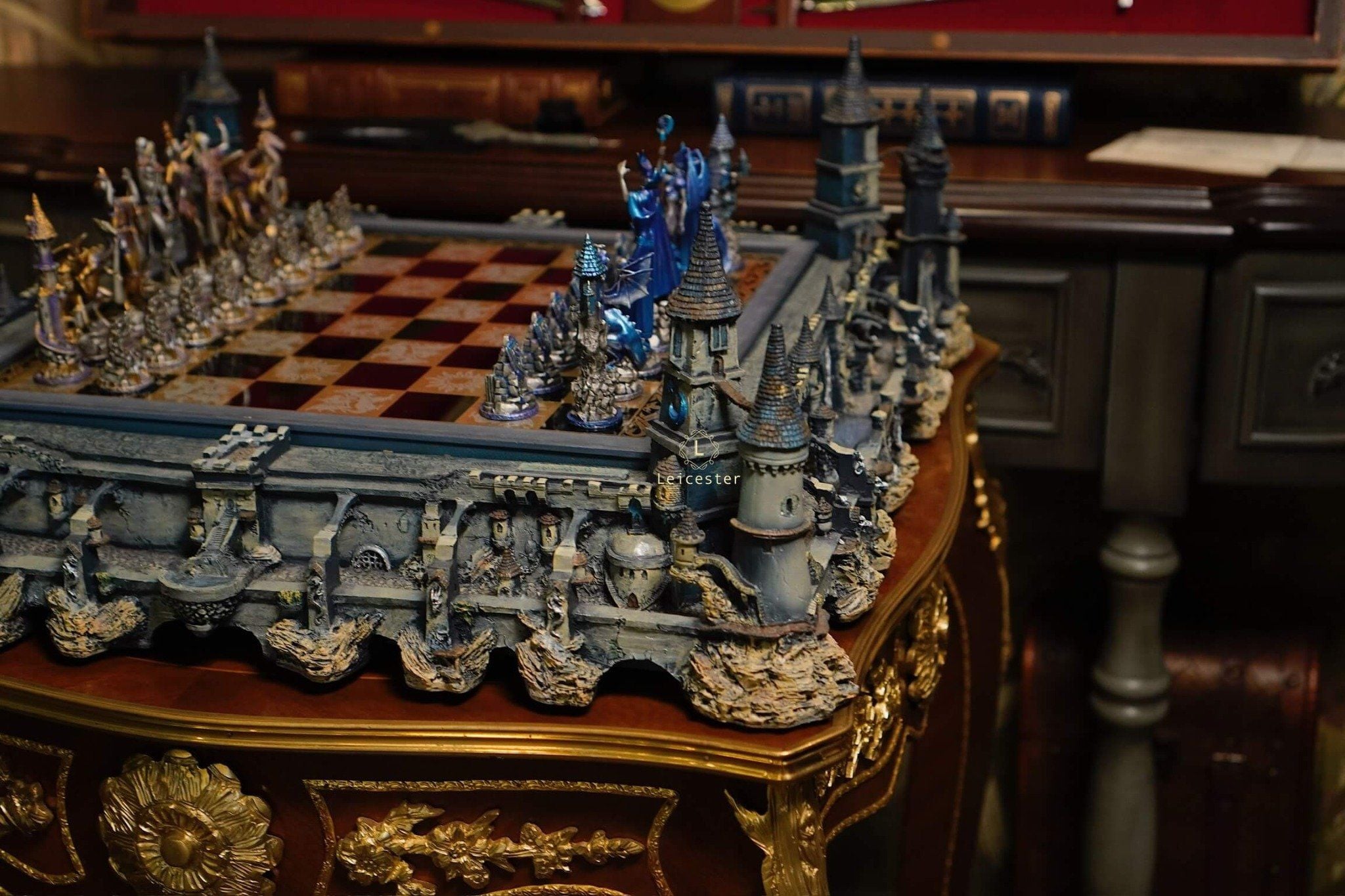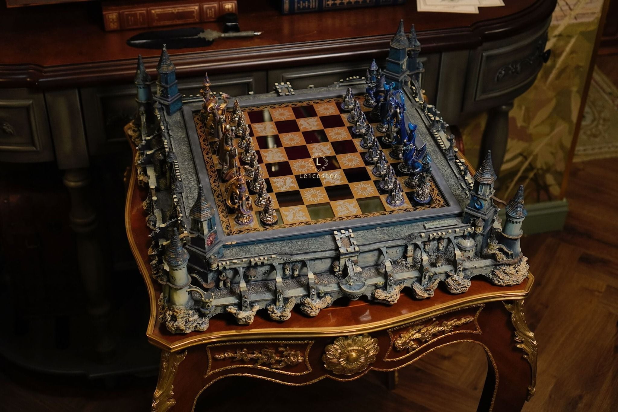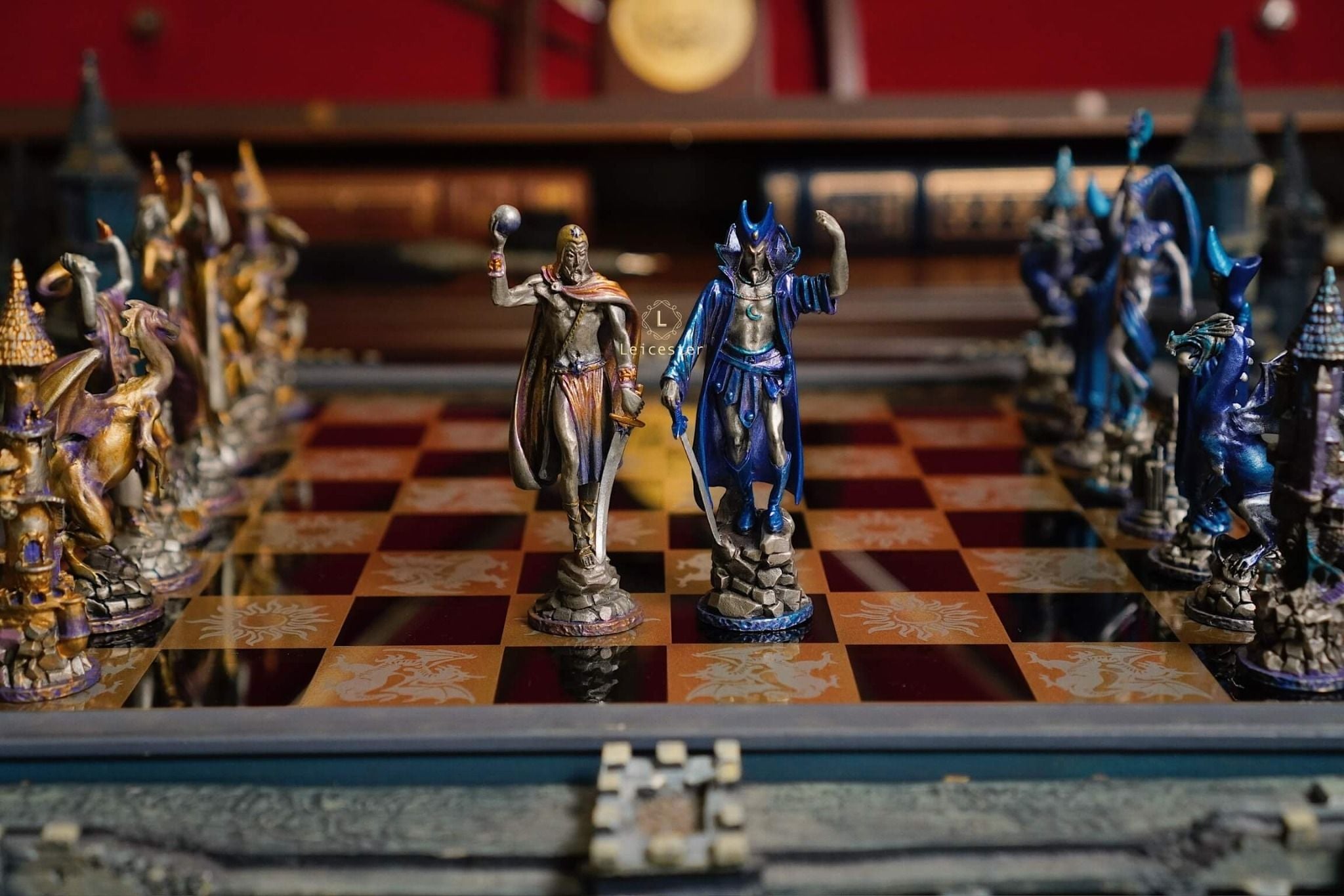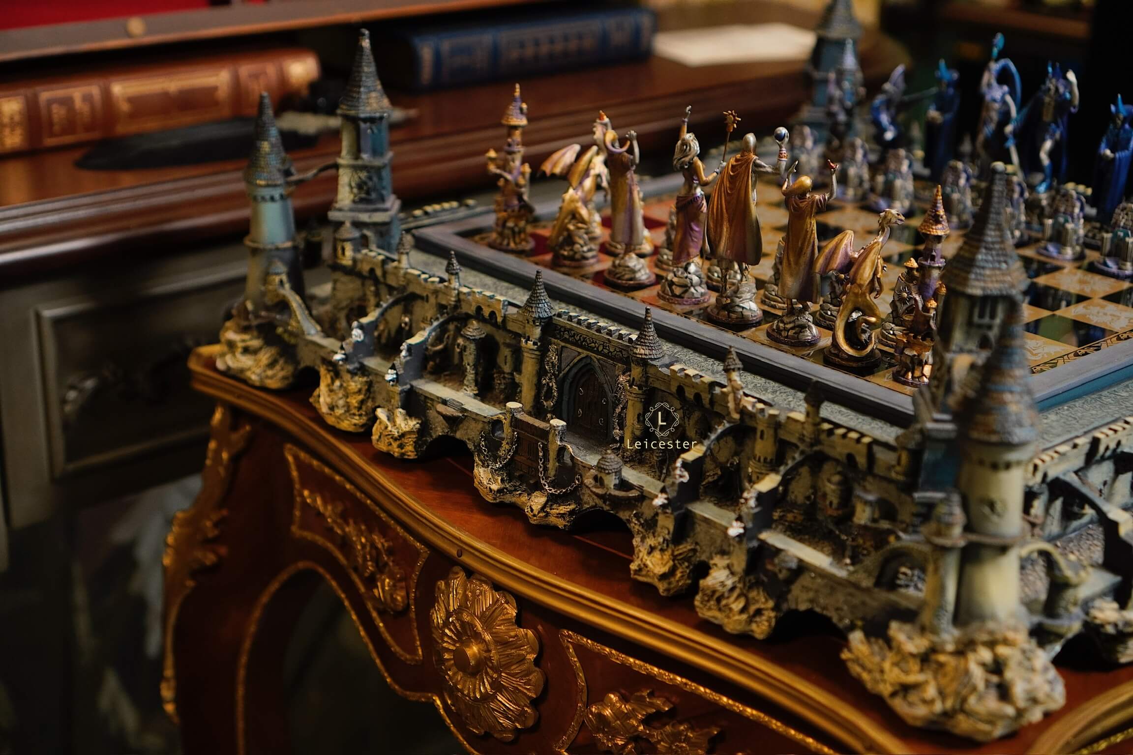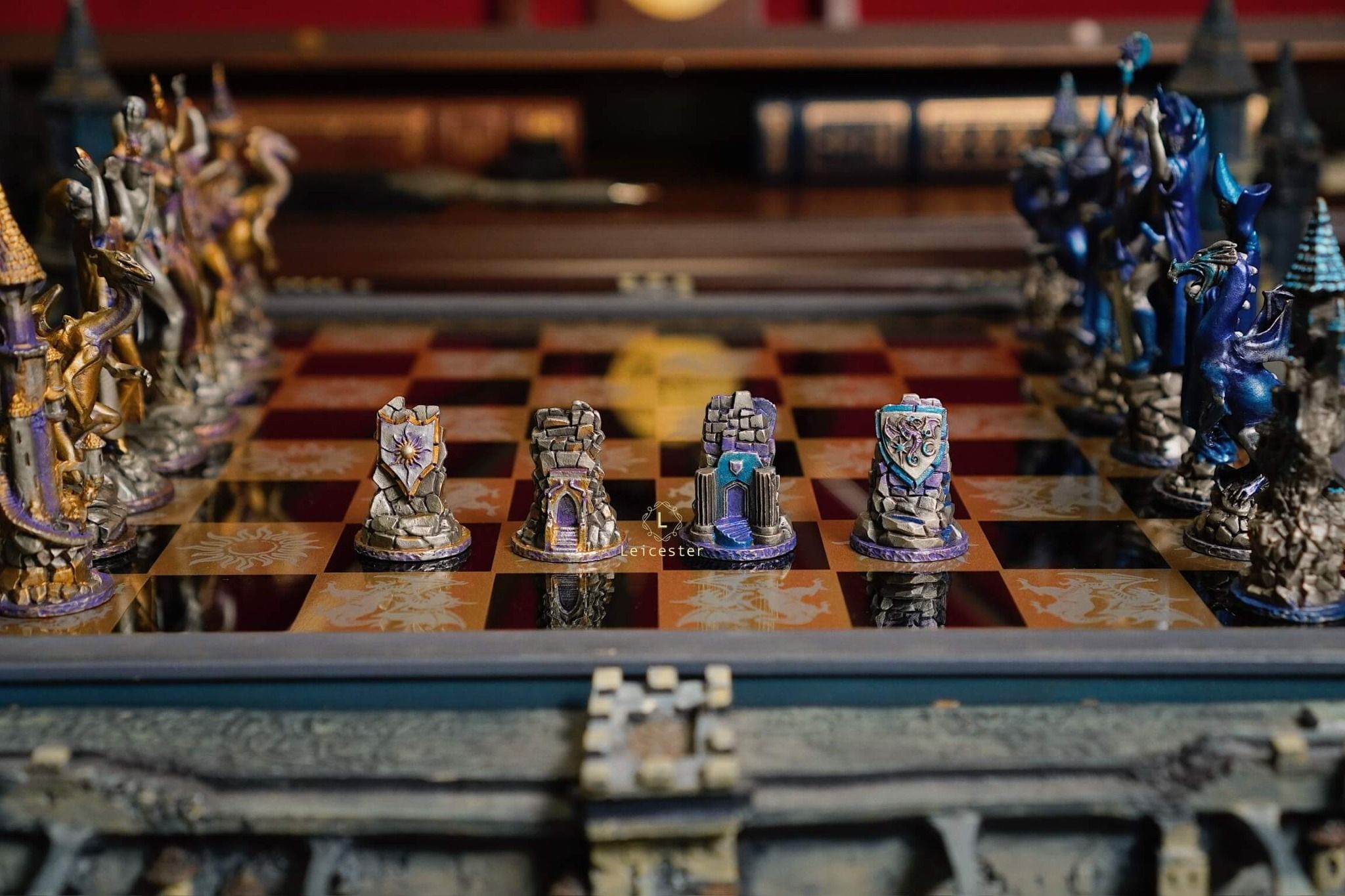 Là một kiệt tác nghệ thuật do Franklin Mint phát hành, được thiết kế bởi họa sĩ huyền thoại Michael Whelan – người nổi tiếng với phong cách fantasy đầy sức sống. Mỗi quân cờ được đúc tinh xảo từ hợp kim thiếc, phủ lớp màu ánh kim sang trọng, thể hiện hai thế lực đối nghịch là ánh sáng và bóng tối. Trên bàn cờ, những quân lính, pháp sư, hiệp sĩ và rồng huyền thoại như bước ra từ trang sử thần thoại, sẵn sàng bảo vệ pháo đài vĩ đại – nơi ánh sáng và quyền lực giao tranh trong vẻ uy nghi đầy mê hoặc.