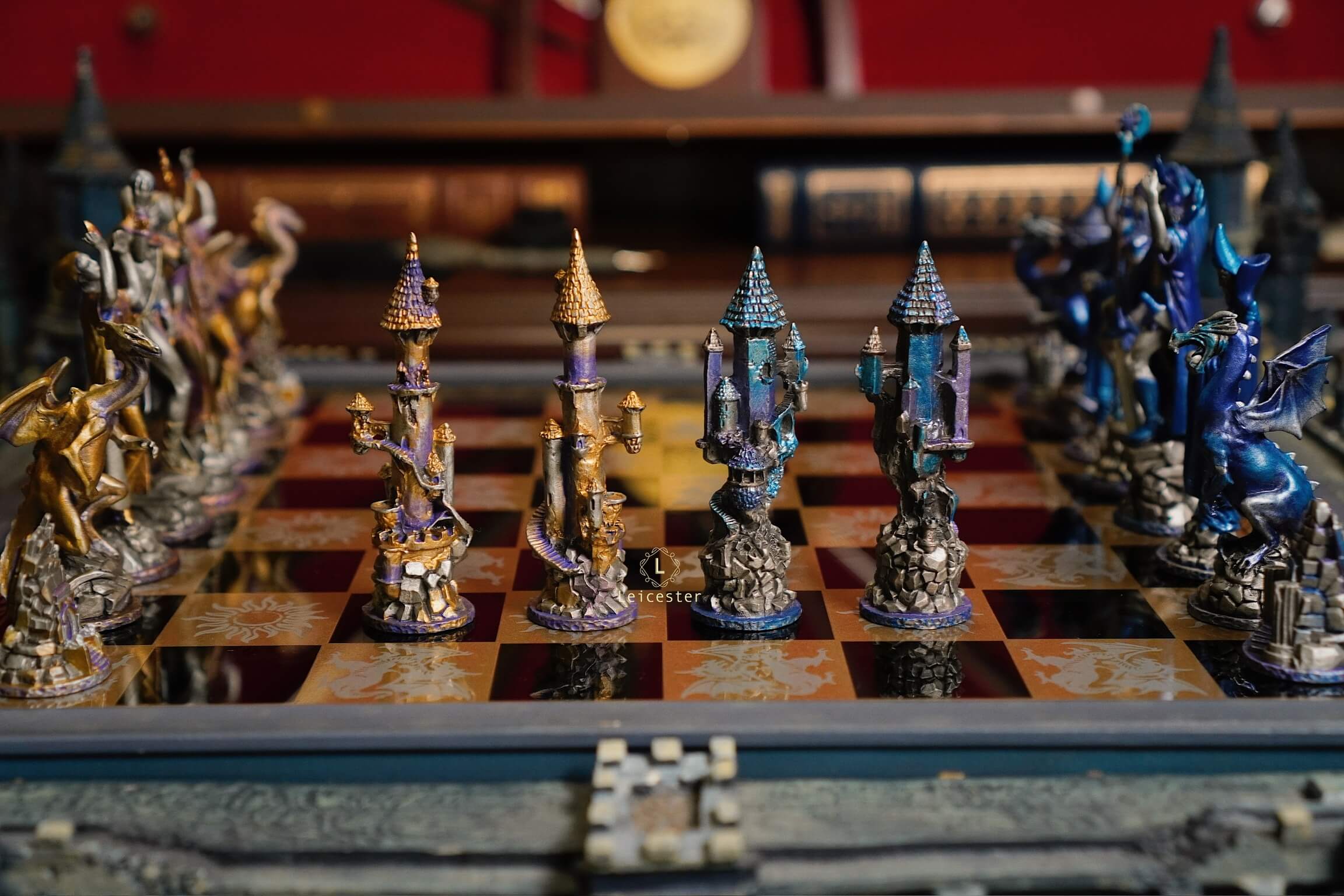 Bộ cờ vua Guardians of the Fortress không chỉ là bàn cờ mà còn là một công trình nghệ thuật thu nhỏ. Bàn cờ được thiết kế như một lâu đài trung cổ thu nhỏ, với bốn tòa tháp, tường thành, và cổng pháo đài được chạm khắc tỉ mỉ đến từng viên đá. Mặt bàn được chế tác tinh tế với sự kết hợp giữa kính phản chiếu đen và các ô cờ ánh kim khắc họa tiết rồng và mặt trời, tạo hiệu ứng lấp lánh như bầu trời đêm trong lâu đài cổ. Khi ánh sáng phản chiếu trên ô cờ dát vàng và thủy tinh đen, toàn bộ tác phẩm bừng lên vẻ lộng lẫy của một di sản quý giá - nơi nghệ thuật, chiến lược và huyền thoại giao hòa thành một tuyệt phẩm vượt thời gian.