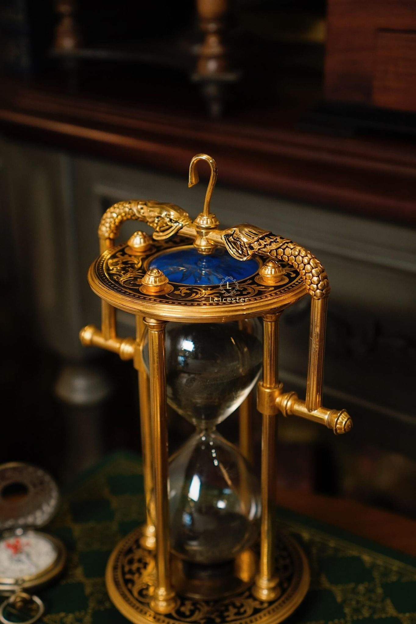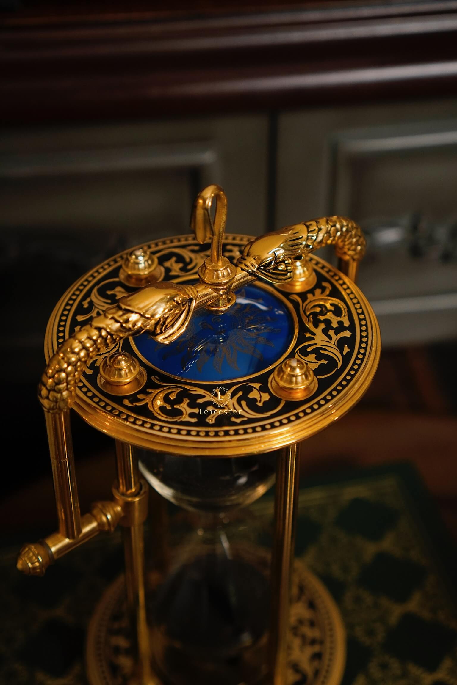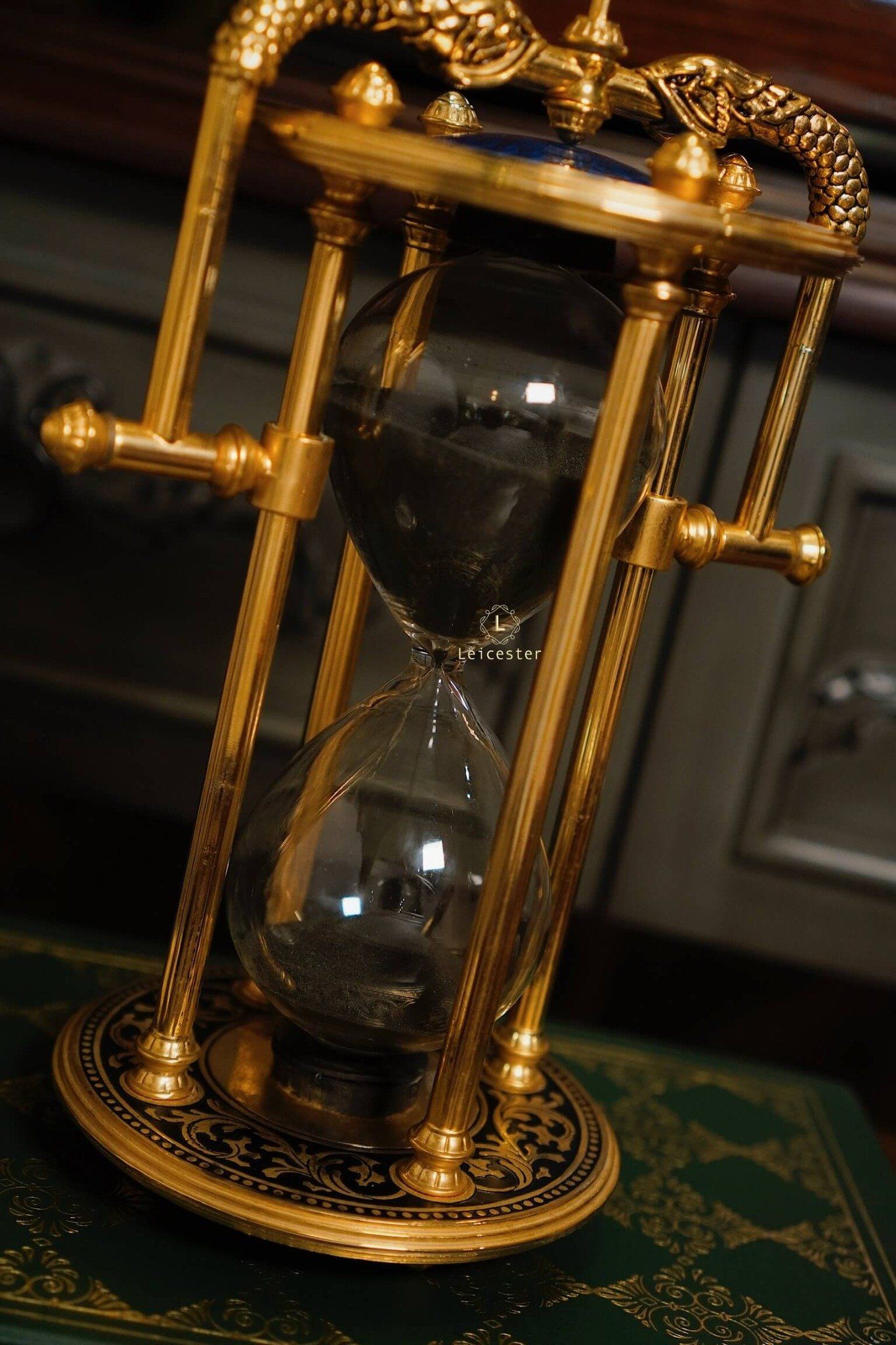 Tác phẩm được chế tác tinh xảo bằng khung hợp kim mạ vàng sang trọng, hoa văn chạm trổ cổ điển, hai linh thú rồng ôm lấy mặt đồng hồ cát với mặt trời xanh thẫm ở chính tâm – tất cả tạo nên một tổng thể đầy quyền năng. Bầu cát đen mềm mại lấp lánh mỗi khi xoay chuyển, tựa như lời nhắc tinh tế về giá trị của từng khoảnh khắc.