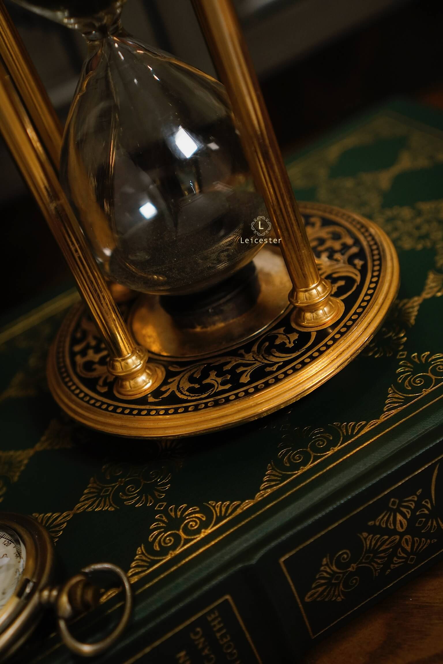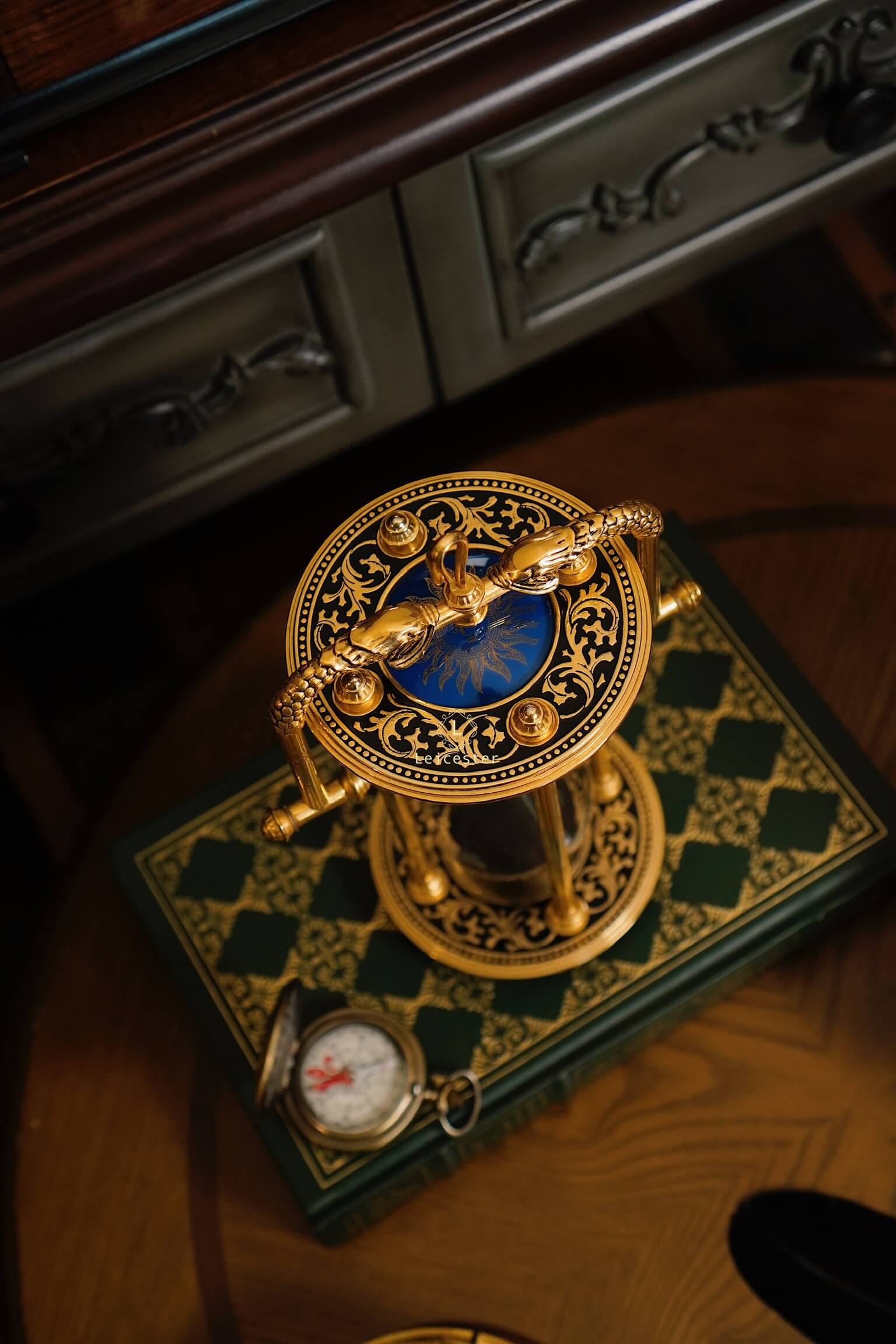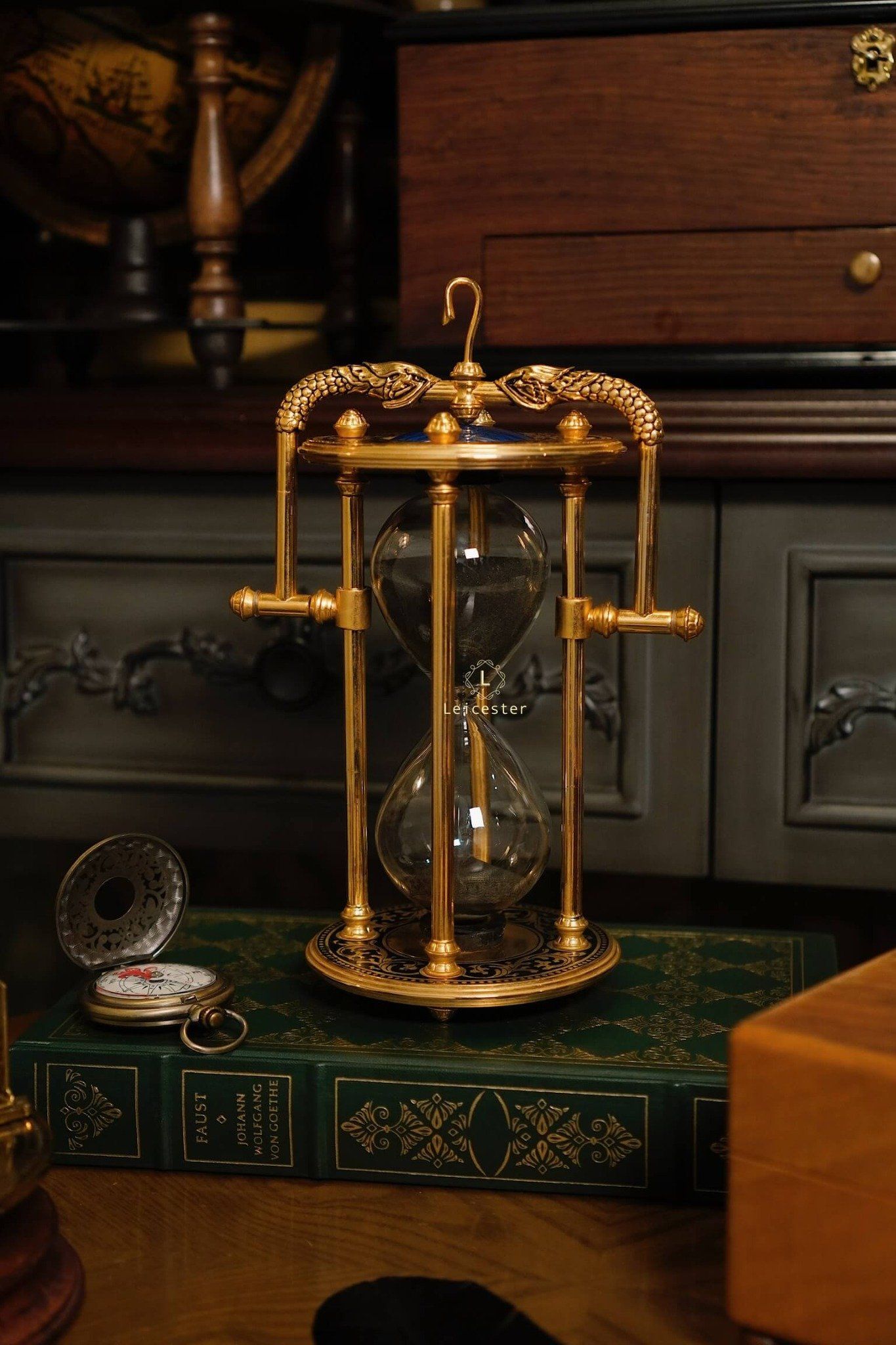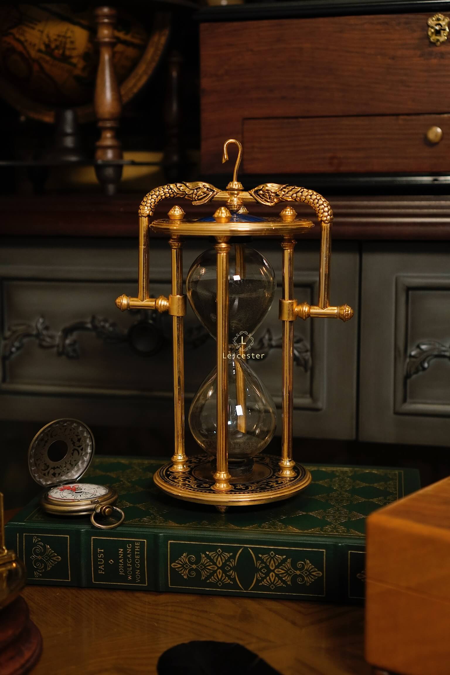 Tác phẩm được chế tác tinh xảo bằng khung hợp kim mạ vàng sang trọng, hoa văn chạm trổ cổ điển, hai linh thú rồng ôm lấy mặt đồng hồ cát với mặt trời xanh thẫm ở chính tâm – tất cả tạo nên một tổng thể đầy quyền năng. Bầu cát đen mềm mại lấp lánh mỗi khi xoay chuyển, tựa như lời nhắc tinh tế về giá trị của từng khoảnh khắc.