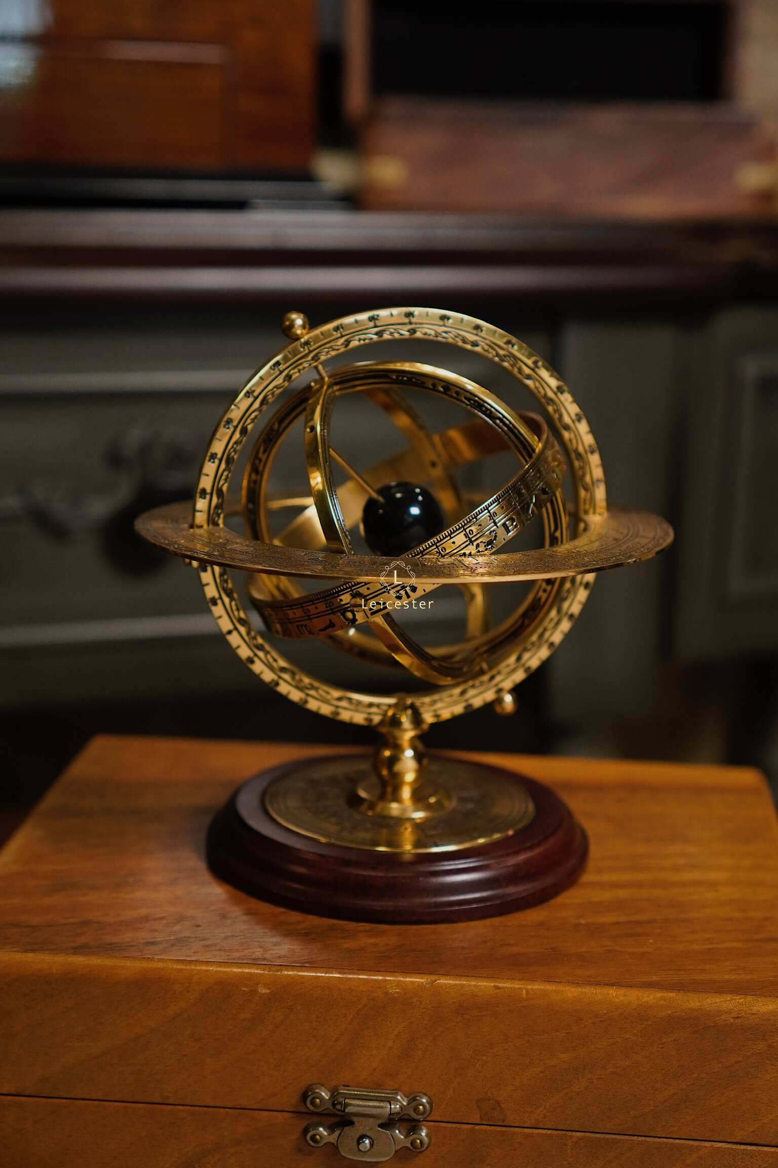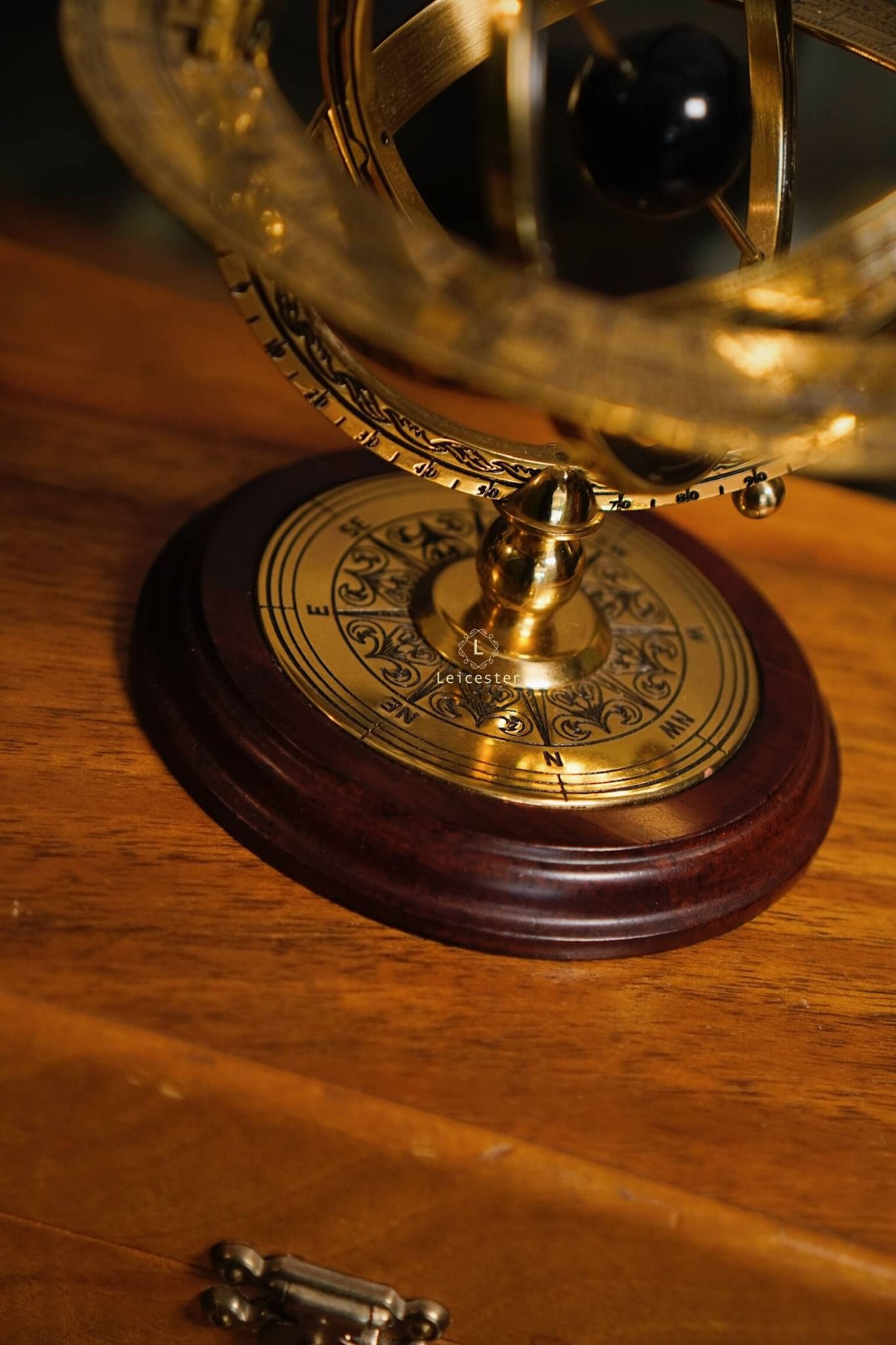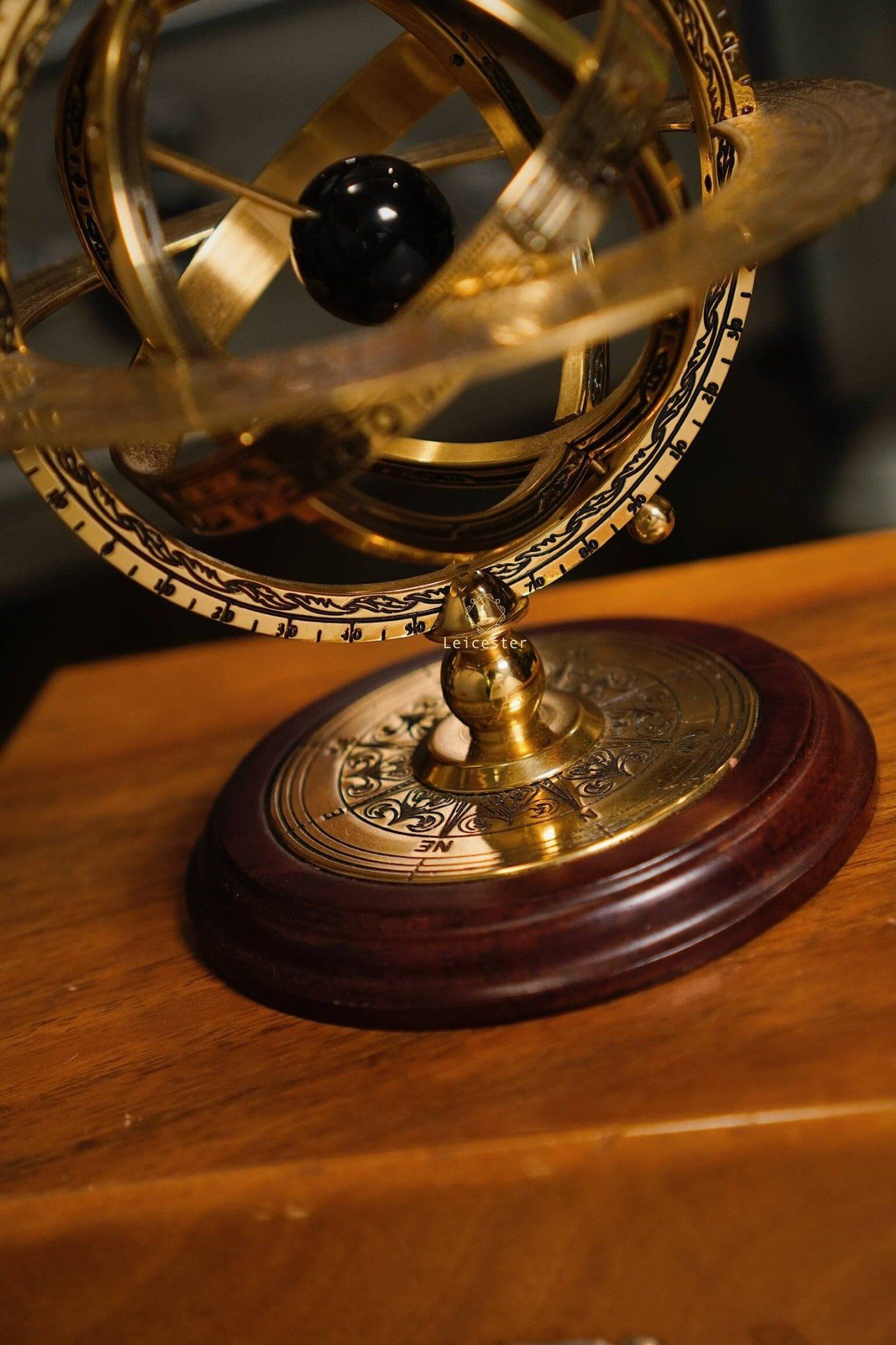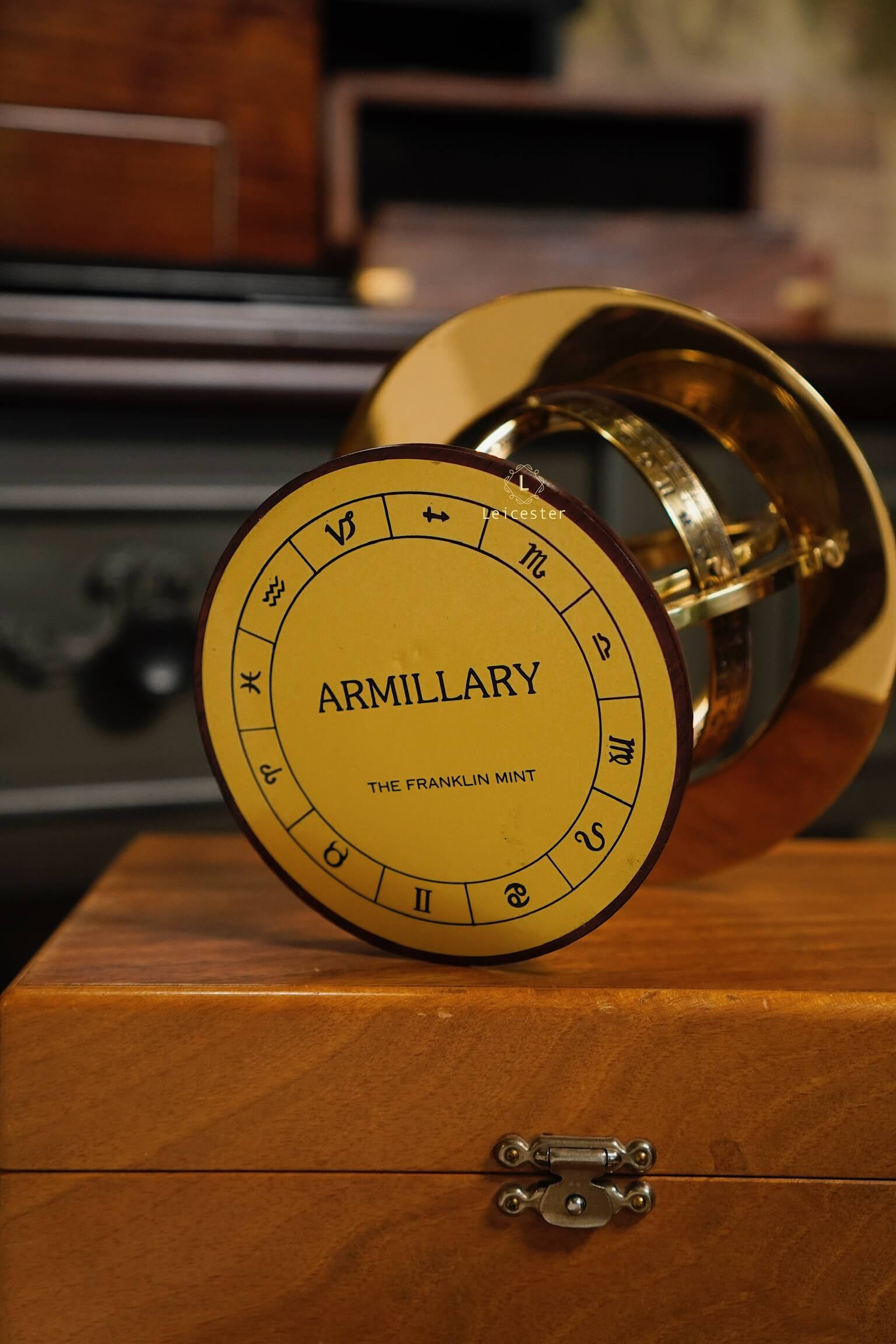 Armillary Sphere sở hữu khung đồng thau chạm khắc tinh vi, gồm nhiều vòng tròn đồng tâm xoay chuyển, khắc rõ tháng, cung Hoàng Đạo và thang đo góc độ. Ở trung tâm là quả cầu sơn đen tượng trưng cho Trái Đất hoặc Mặt Trời tuỳ theo quan niệm địa tâm xưa hay quan niệm nhật tâm. Toàn bộ được nâng đỡ bởi đế gỗ tròn vững chãi, mặt dưới có in tên sản phẩm cùng logo của Franklin Mint, mang đến vẻ đẹp vừa học thuật vừa cổ điển.