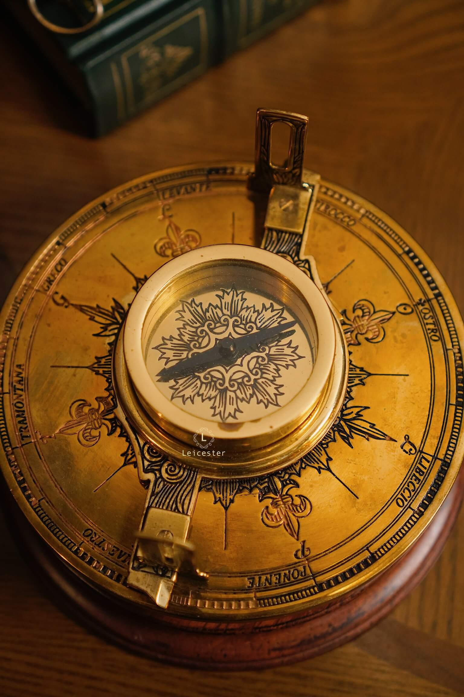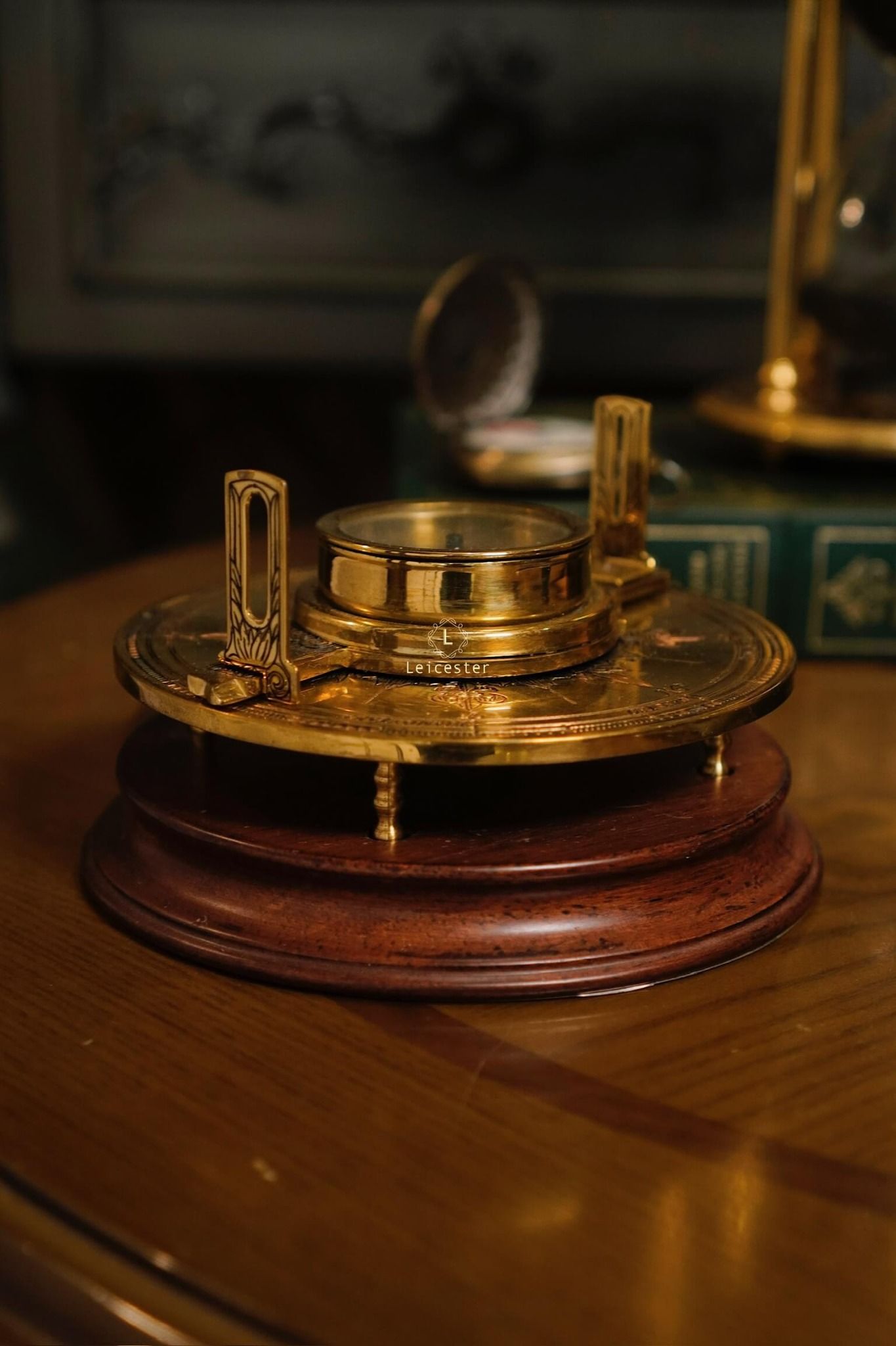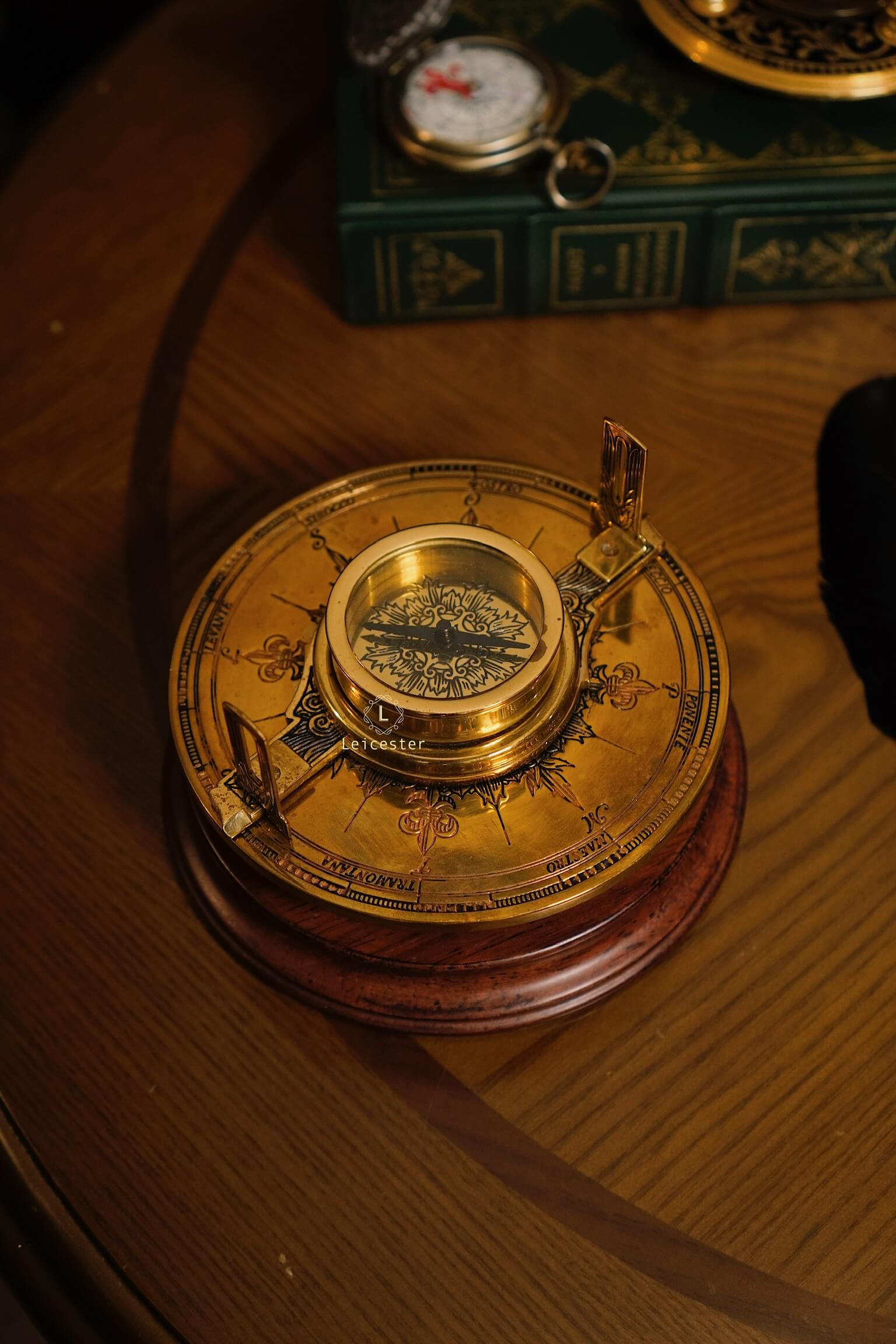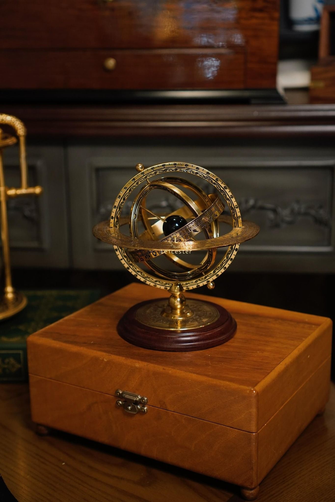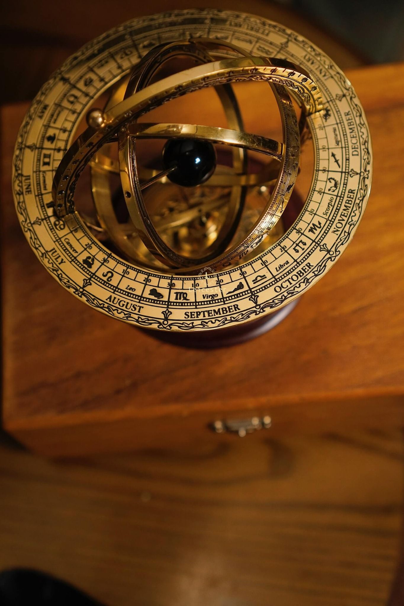 Armillary Sphere sở hữu khung đồng thau chạm khắc tinh vi, gồm nhiều vòng tròn đồng tâm xoay chuyển, khắc rõ tháng, cung Hoàng Đạo và thang đo góc độ. Ở trung tâm là quả cầu sơn đen tượng trưng cho Trái Đất hoặc Mặt Trời tuỳ theo quan niệm địa tâm xưa hay quan niệm nhật tâm. Toàn bộ được nâng đỡ bởi đế gỗ tròn vững chãi, mặt dưới có in tên sản phẩm cùng logo của Franklin Mint, mang đến vẻ đẹp vừa học thuật vừa cổ điển.