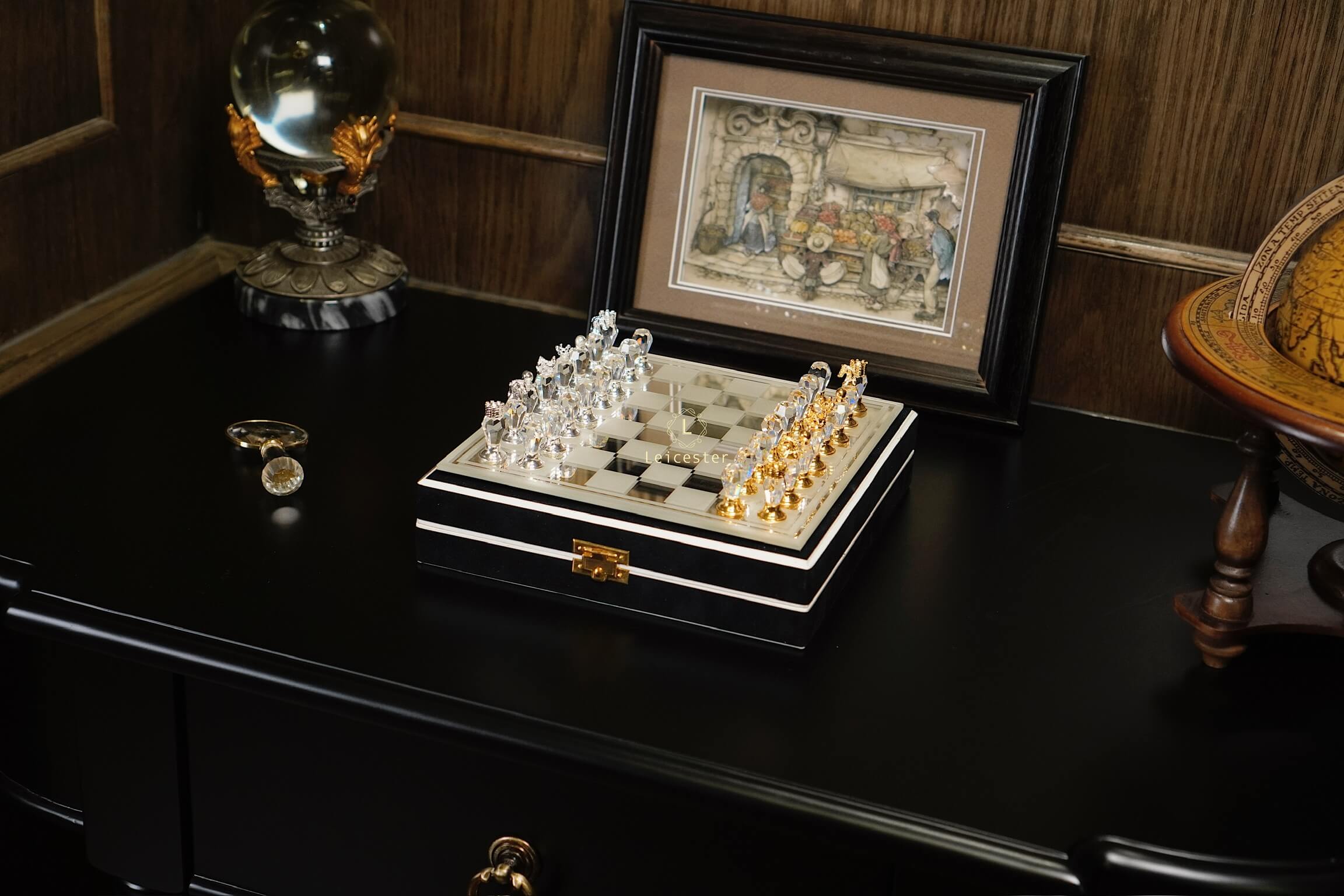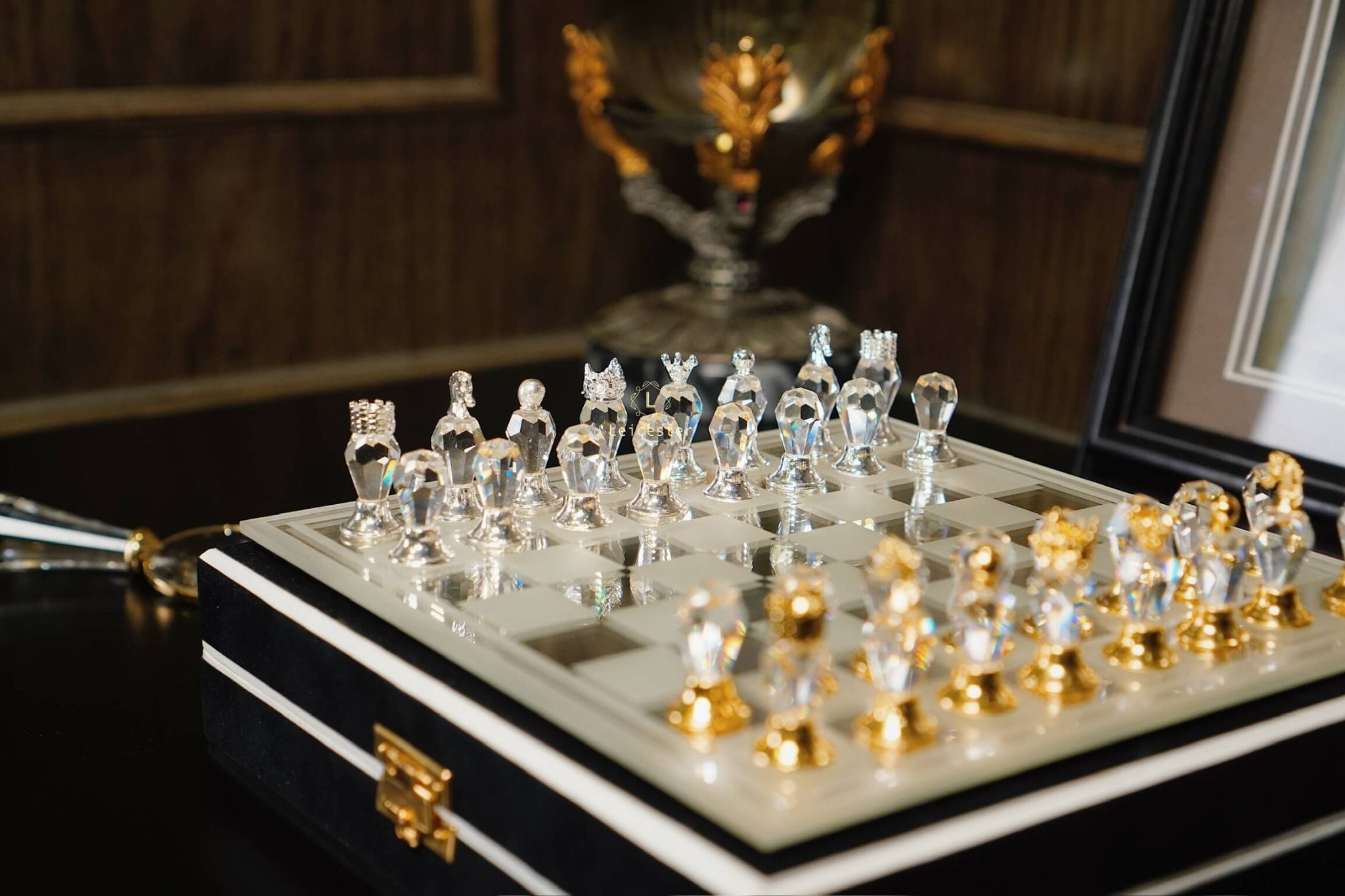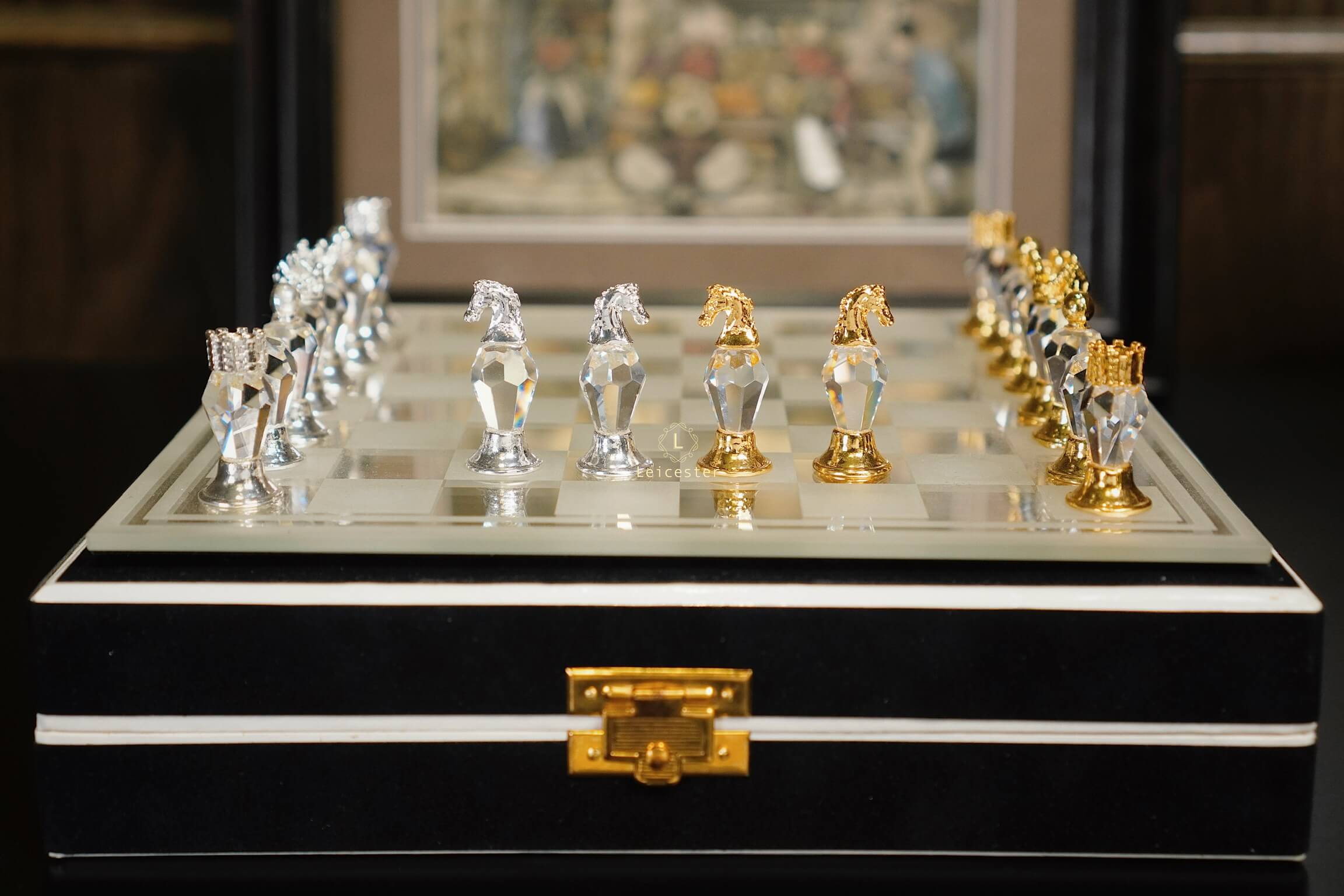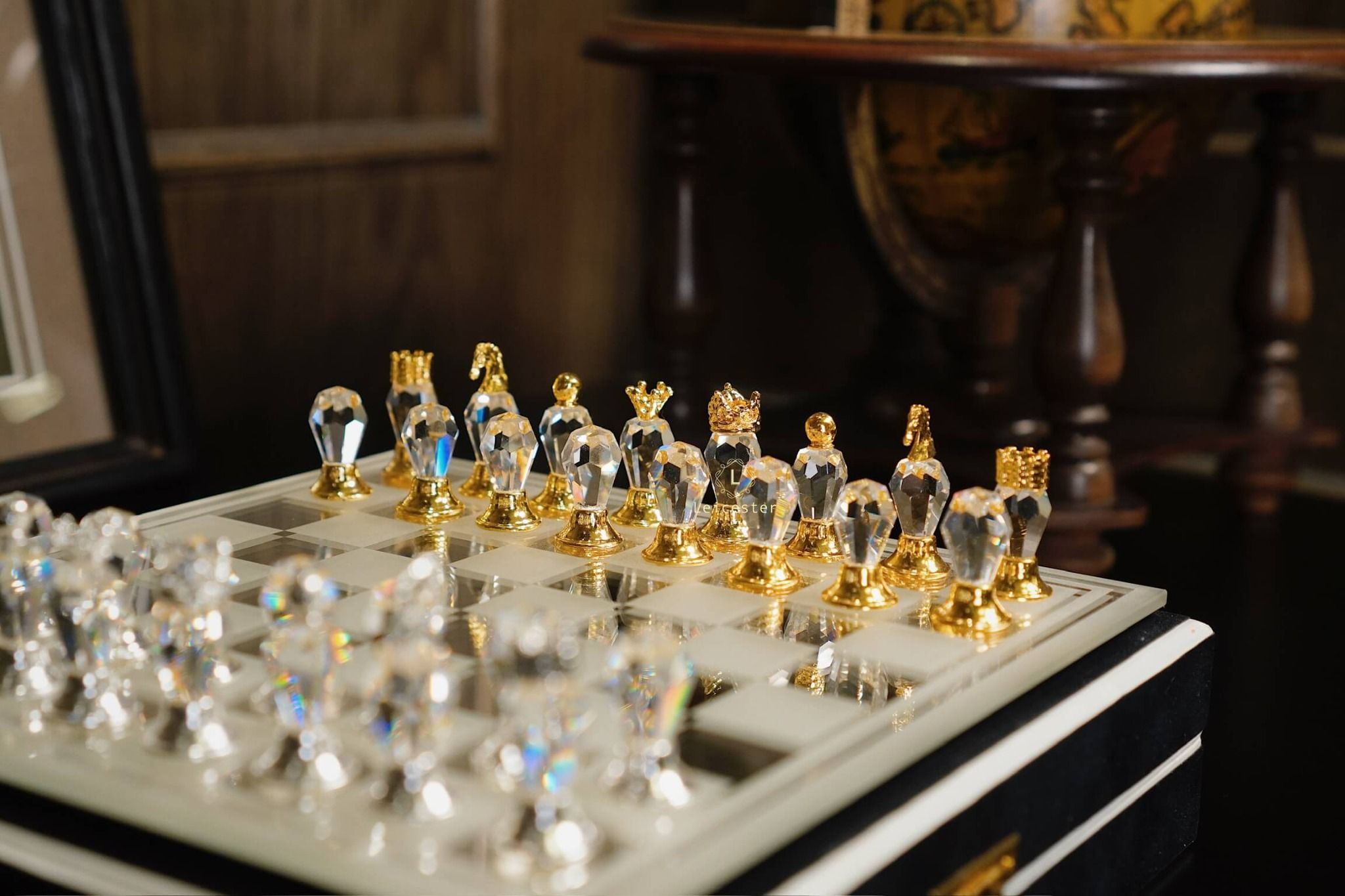 Quân cờ: Pha lê Bohemia, kim loại mạ vàng mạ bạc