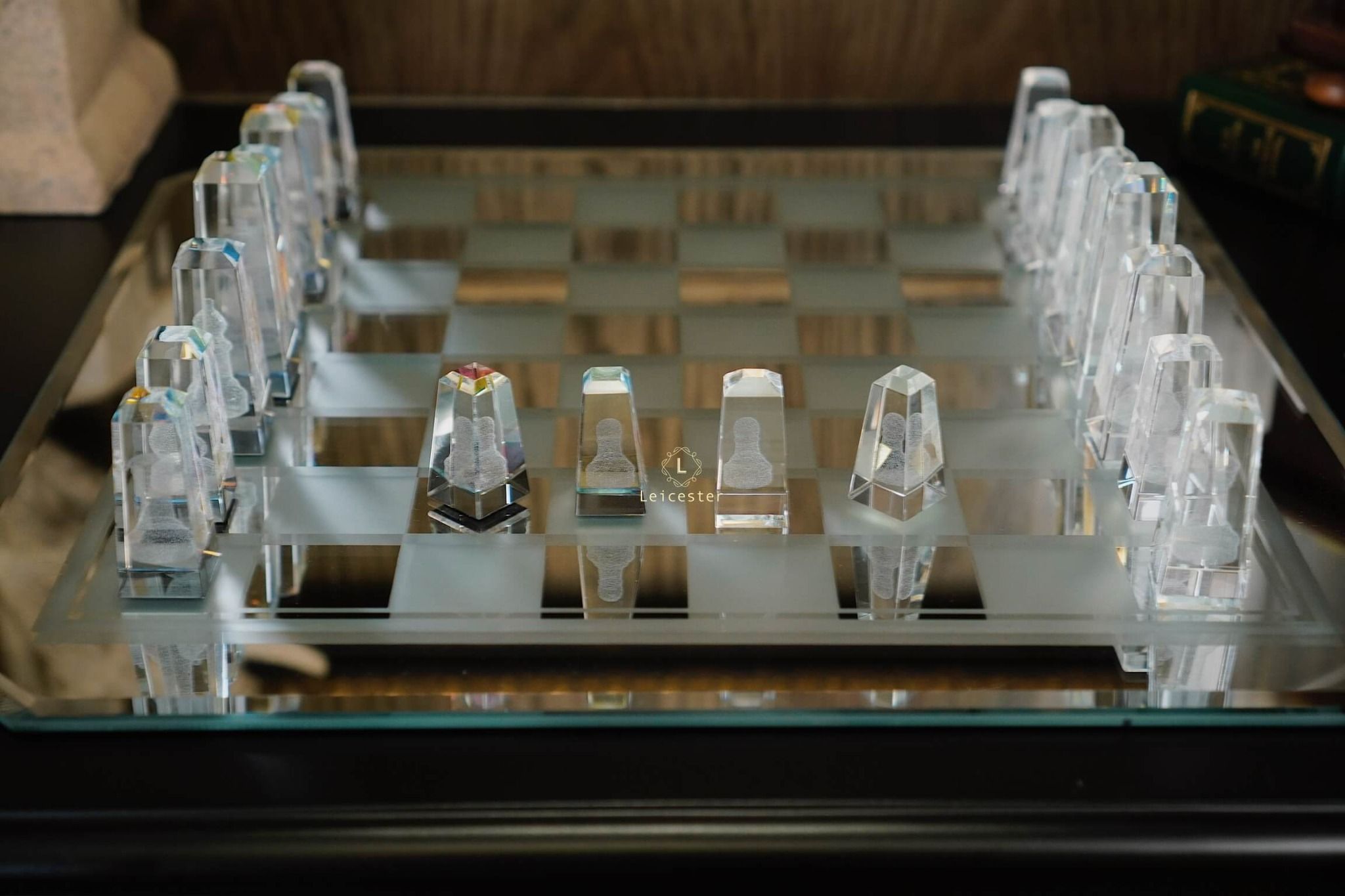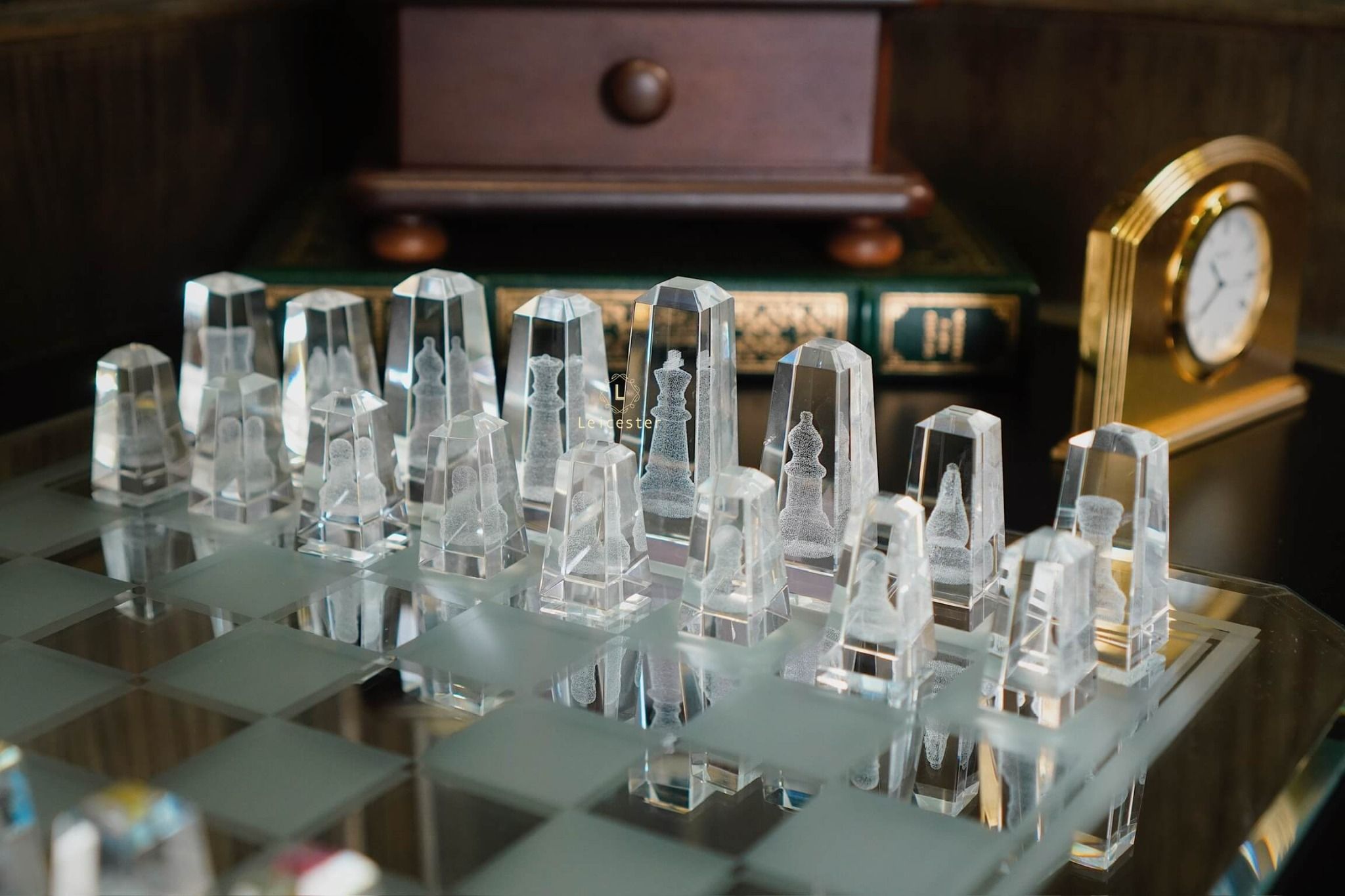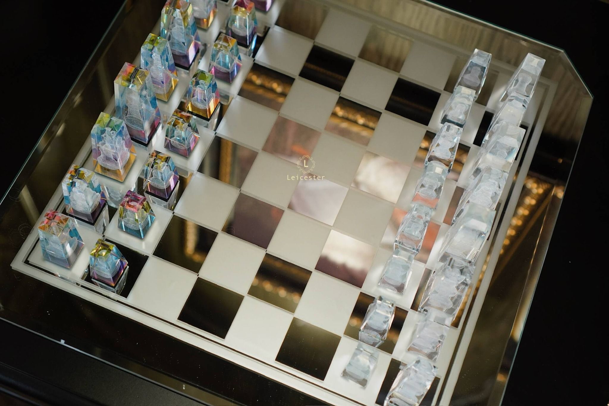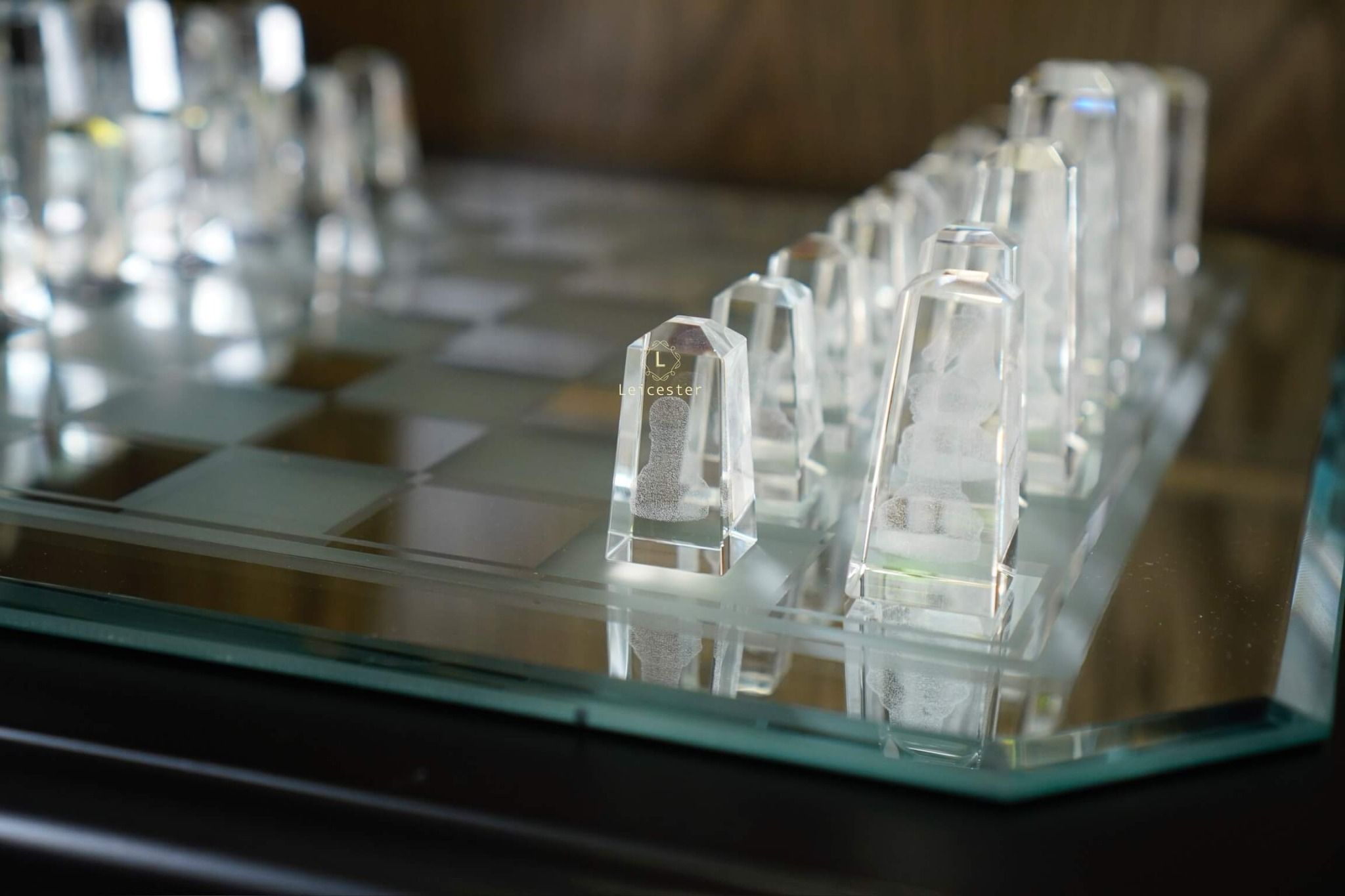 Bàn cờ được thiết kế theo phong cách nghệ thuật tối giản hiện đại, tạo nên sự tương phản hài hòa giữa chất liệu pha lê và các khối vuông cổ điển. Từng chi tiết trong bộ cờ đều được chế tác từ pha lê quang học cao cấp, nổi bật với độ trong suốt tuyệt hảo và khả năng khúc xạ ánh sáng tinh tế. Kết hợp với công nghệ khắc laser 3D hiện đại giúp mỗi quân cờ là một tác phẩm điêu khắc sống động, sắc nét đến từng đường viền.