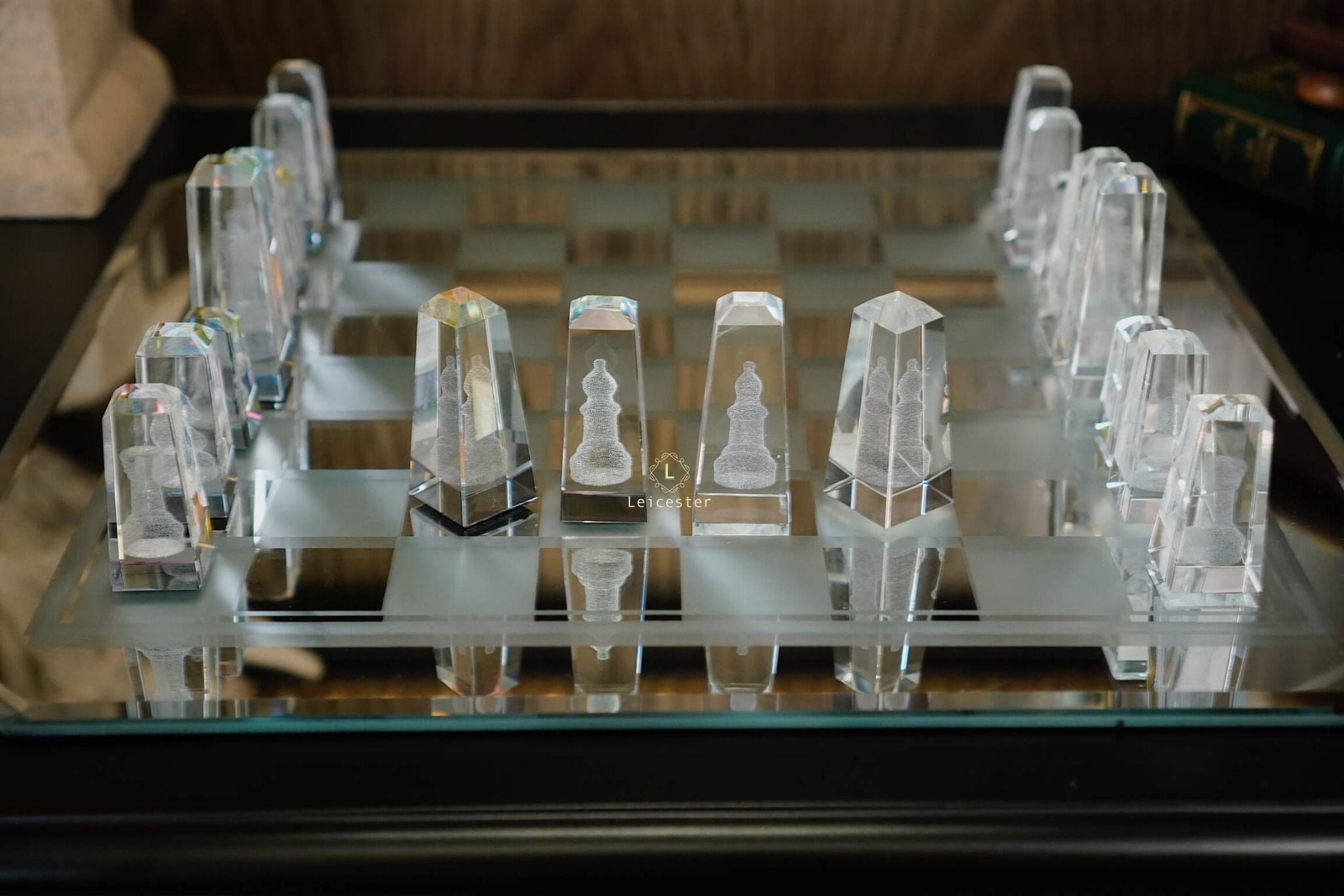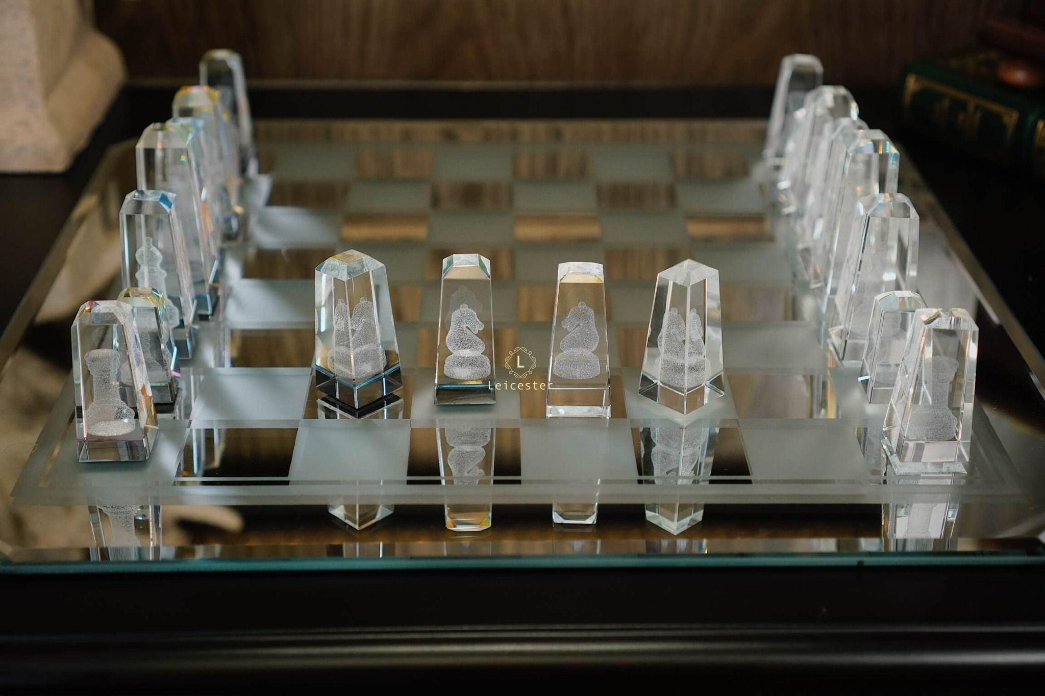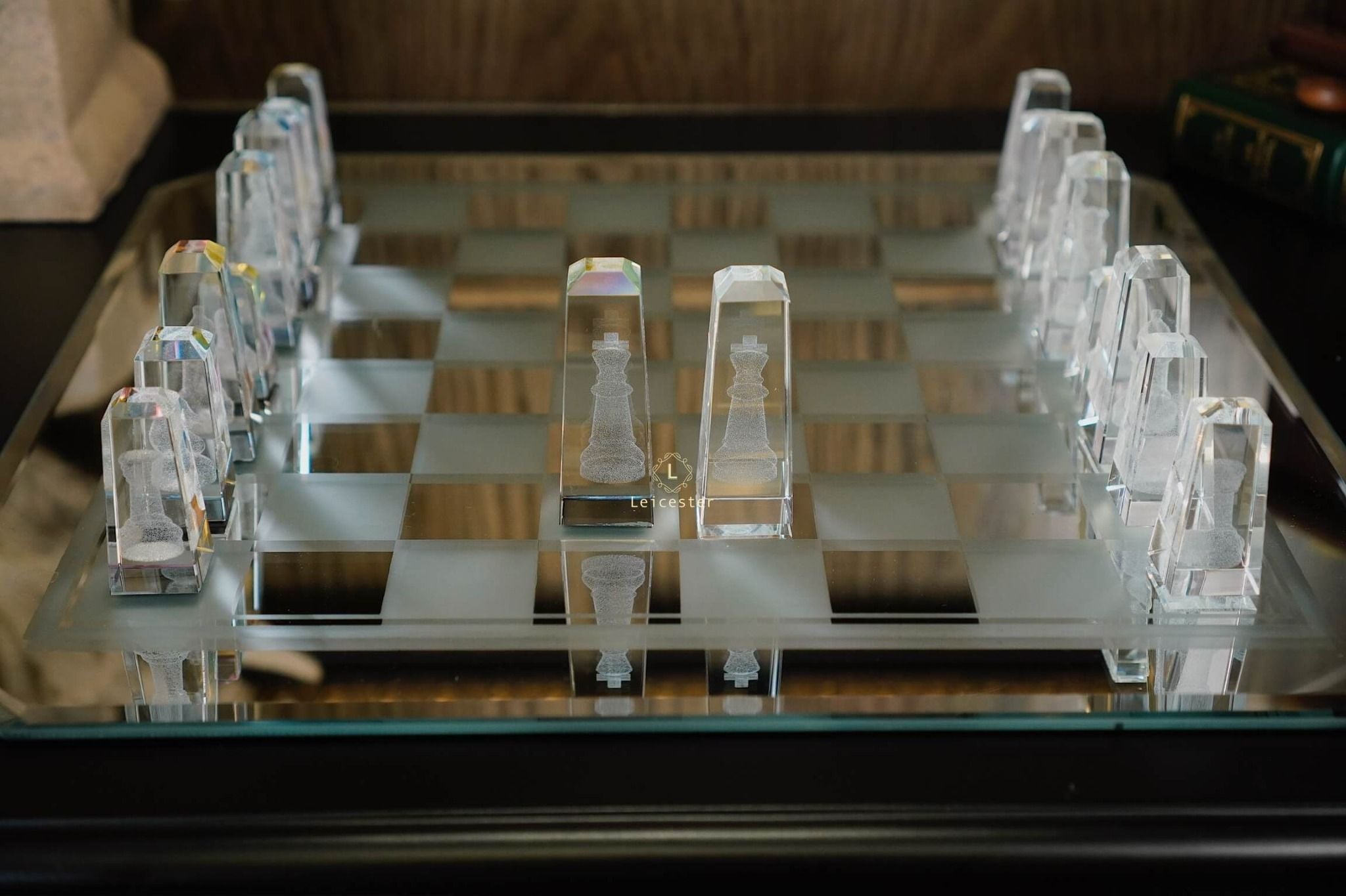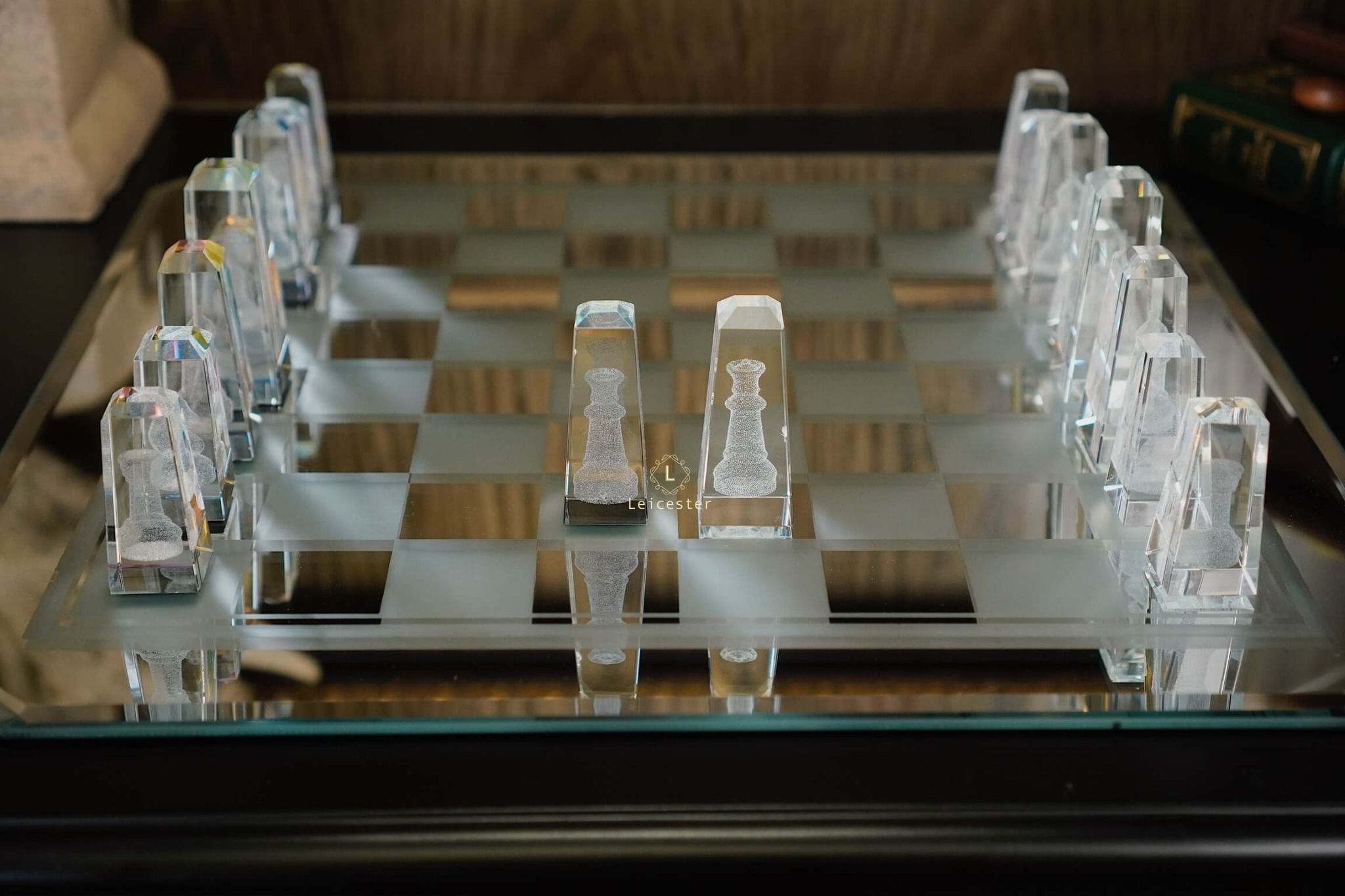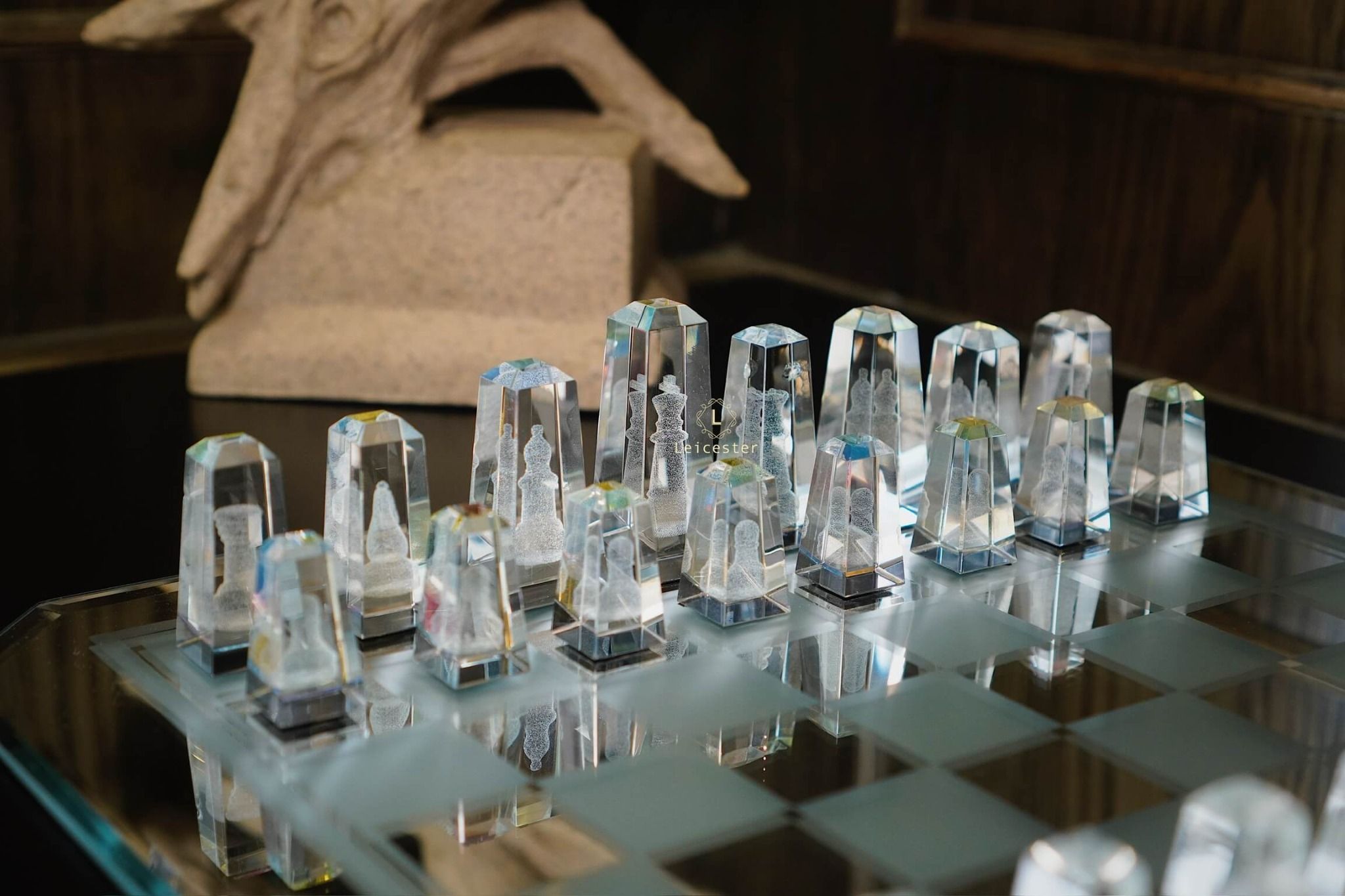 Bàn cờ được thiết kế theo phong cách nghệ thuật tối giản hiện đại, tạo nên sự tương phản hài hòa giữa chất liệu pha lê và các khối vuông cổ điển. Từng chi tiết trong bộ cờ đều được chế tác từ pha lê quang học cao cấp, nổi bật với độ trong suốt tuyệt hảo và khả năng khúc xạ ánh sáng tinh tế. Kết hợp với công nghệ khắc laser 3D hiện đại giúp mỗi quân cờ là một tác phẩm điêu khắc sống động, sắc nét đến từng đường viền.