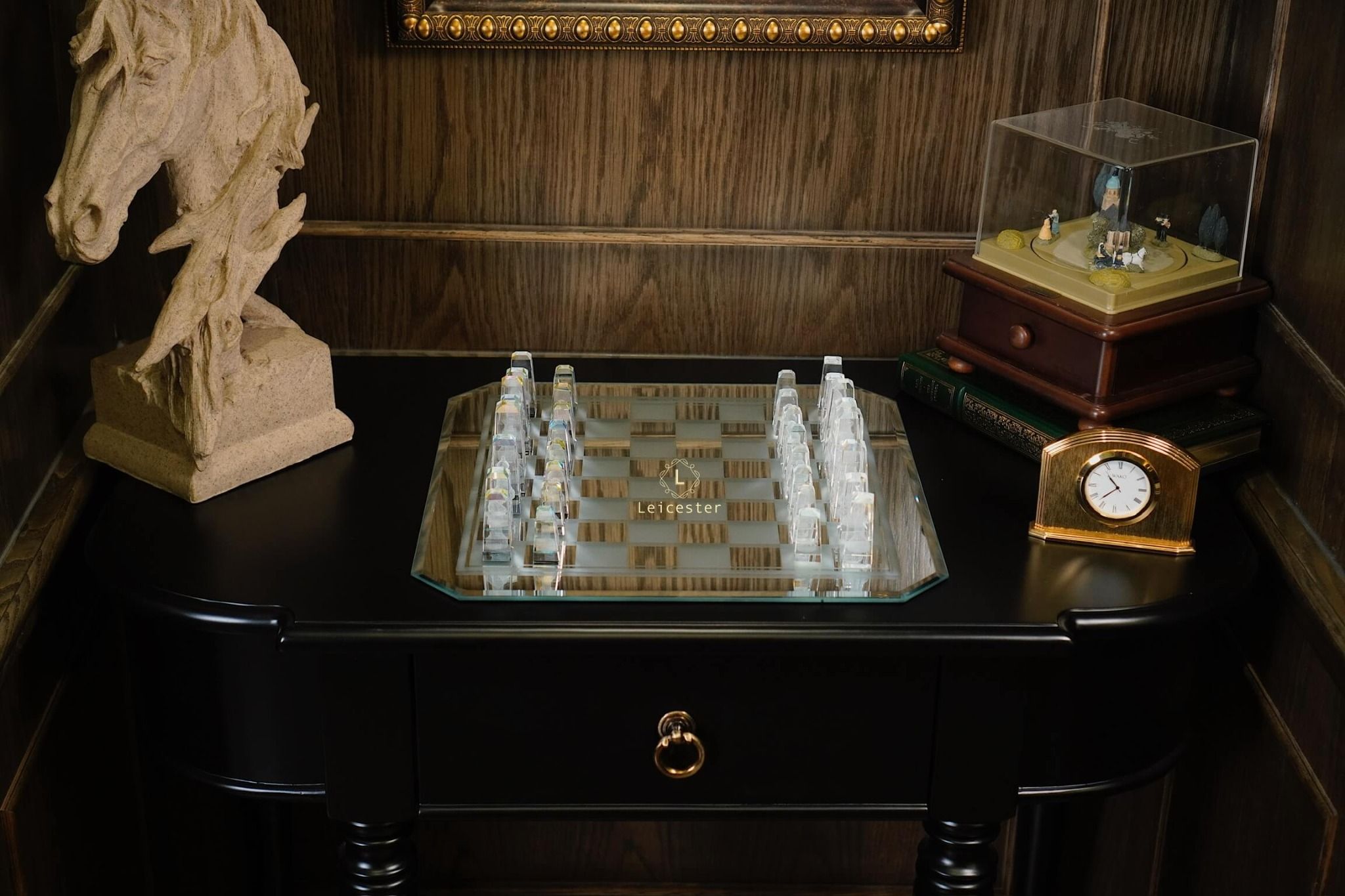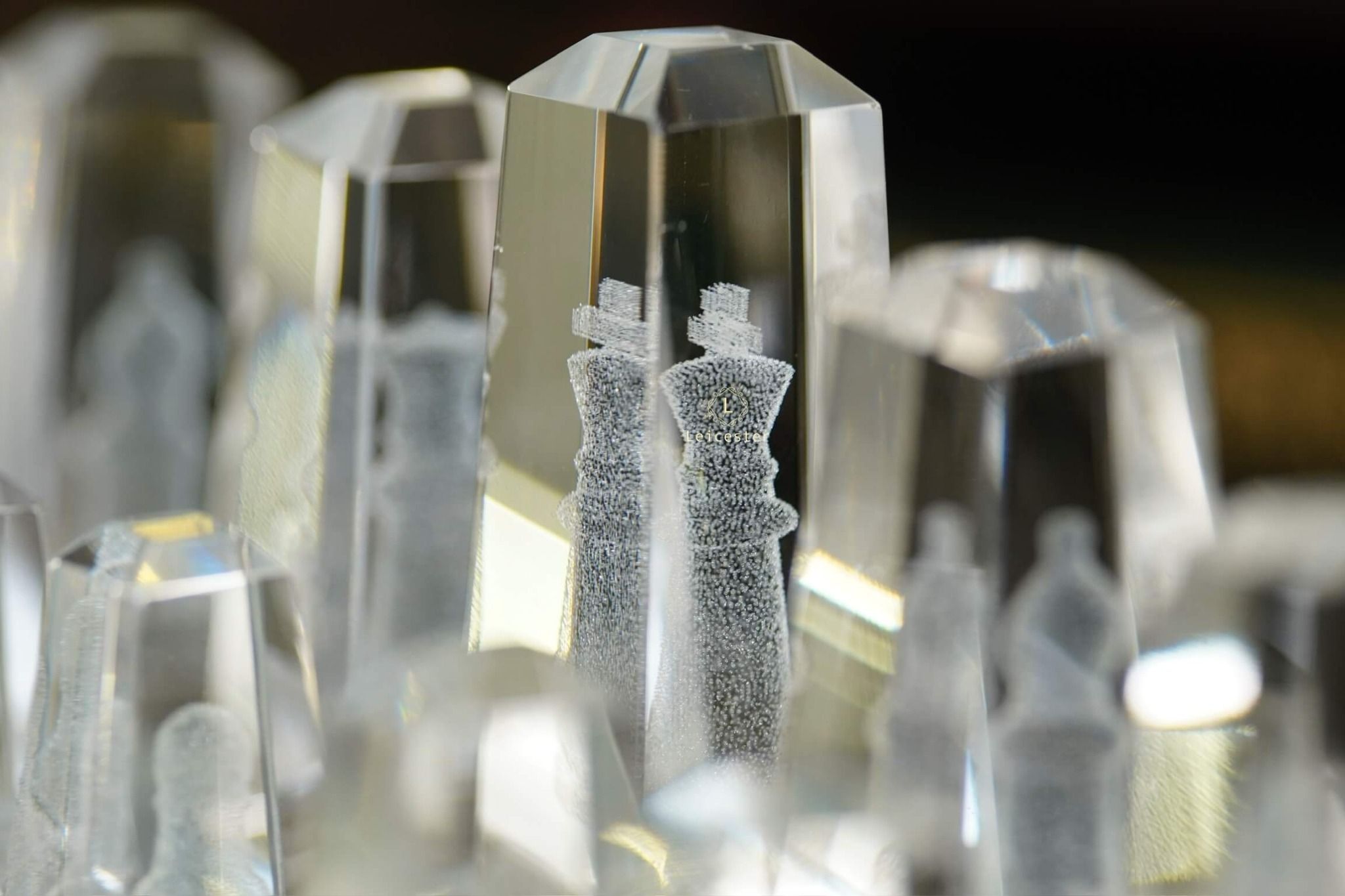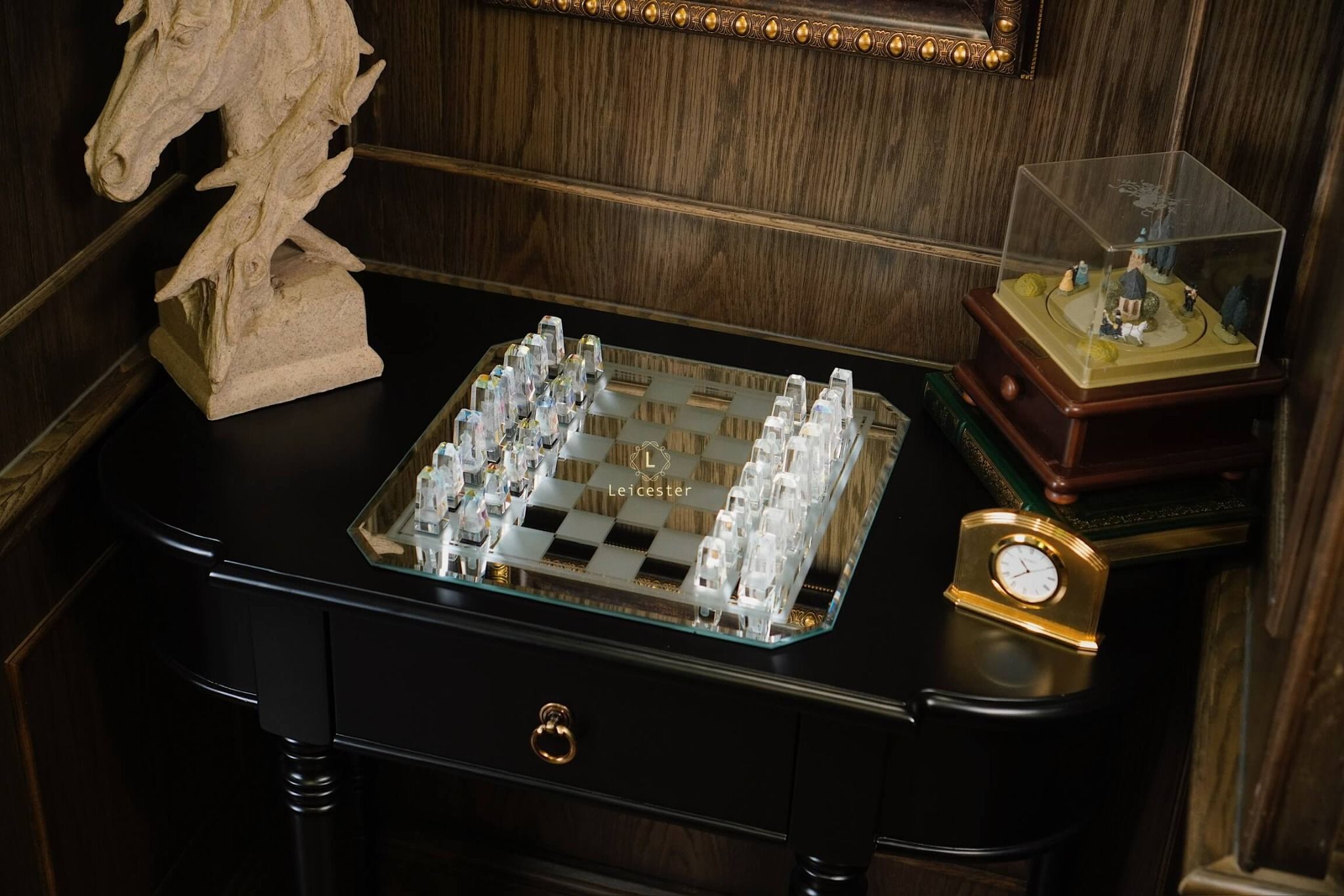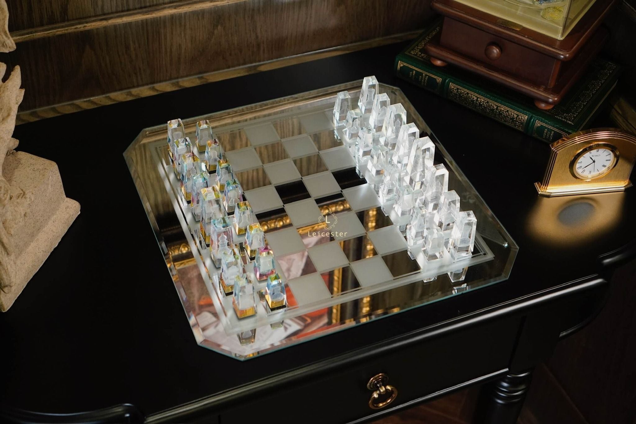 Bàn cờ được thiết kế theo phong cách nghệ thuật tối giản hiện đại, tạo nên sự tương phản hài hòa giữa chất liệu pha lê và các khối vuông cổ điển. Từng chi tiết trong bộ cờ đều được chế tác từ pha lê quang học cao cấp, nổi bật với độ trong suốt tuyệt hảo và khả năng khúc xạ ánh sáng tinh tế. Kết hợp với công nghệ khắc laser 3D hiện đại giúp mỗi quân cờ là một tác phẩm điêu khắc sống động, sắc nét đến từng đường viền.