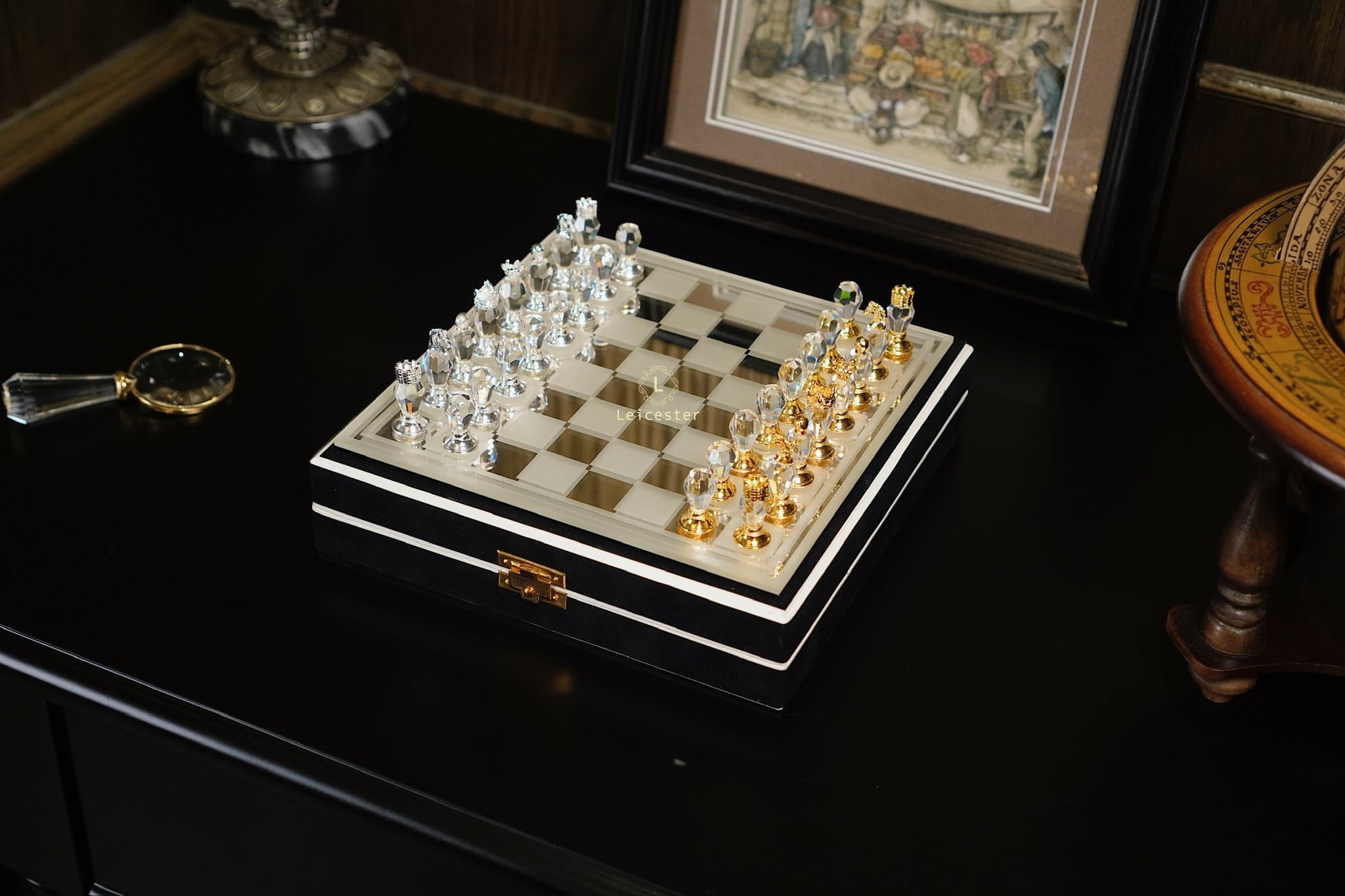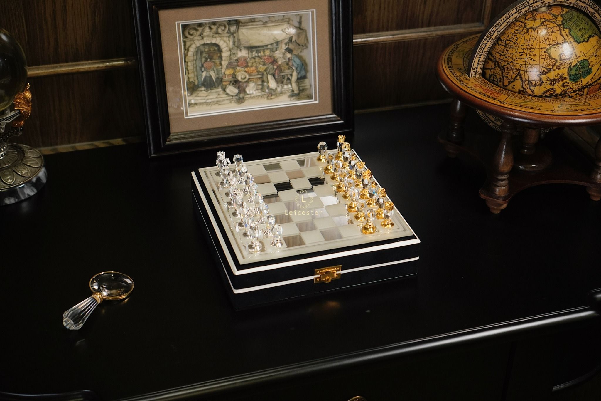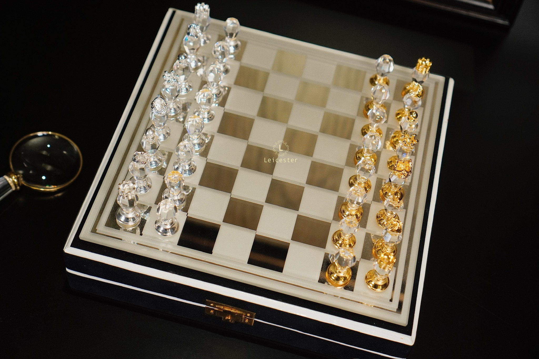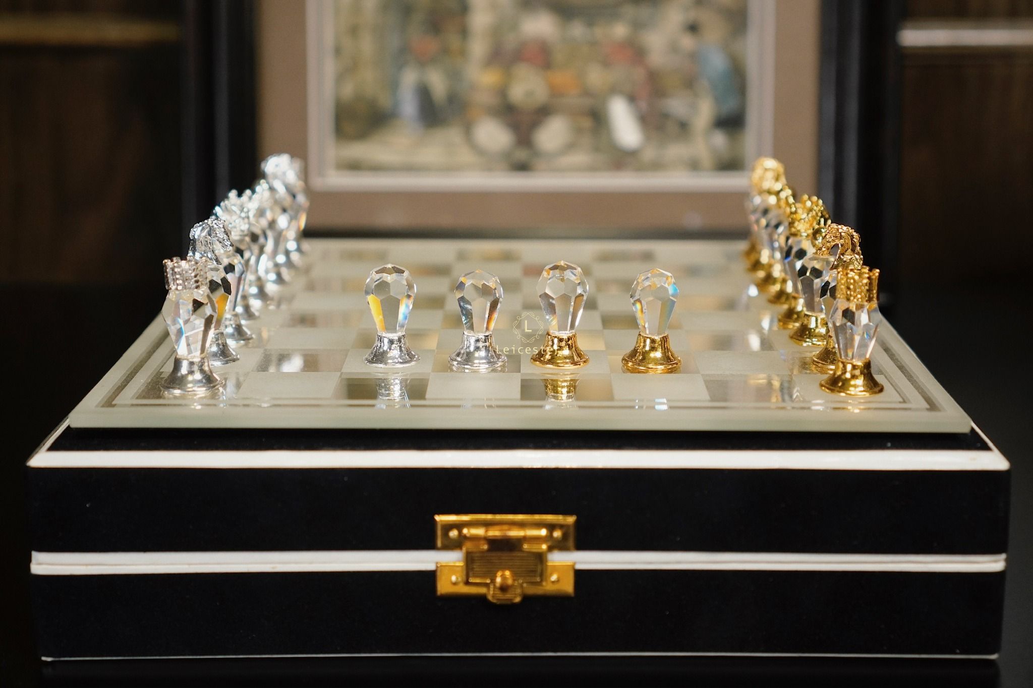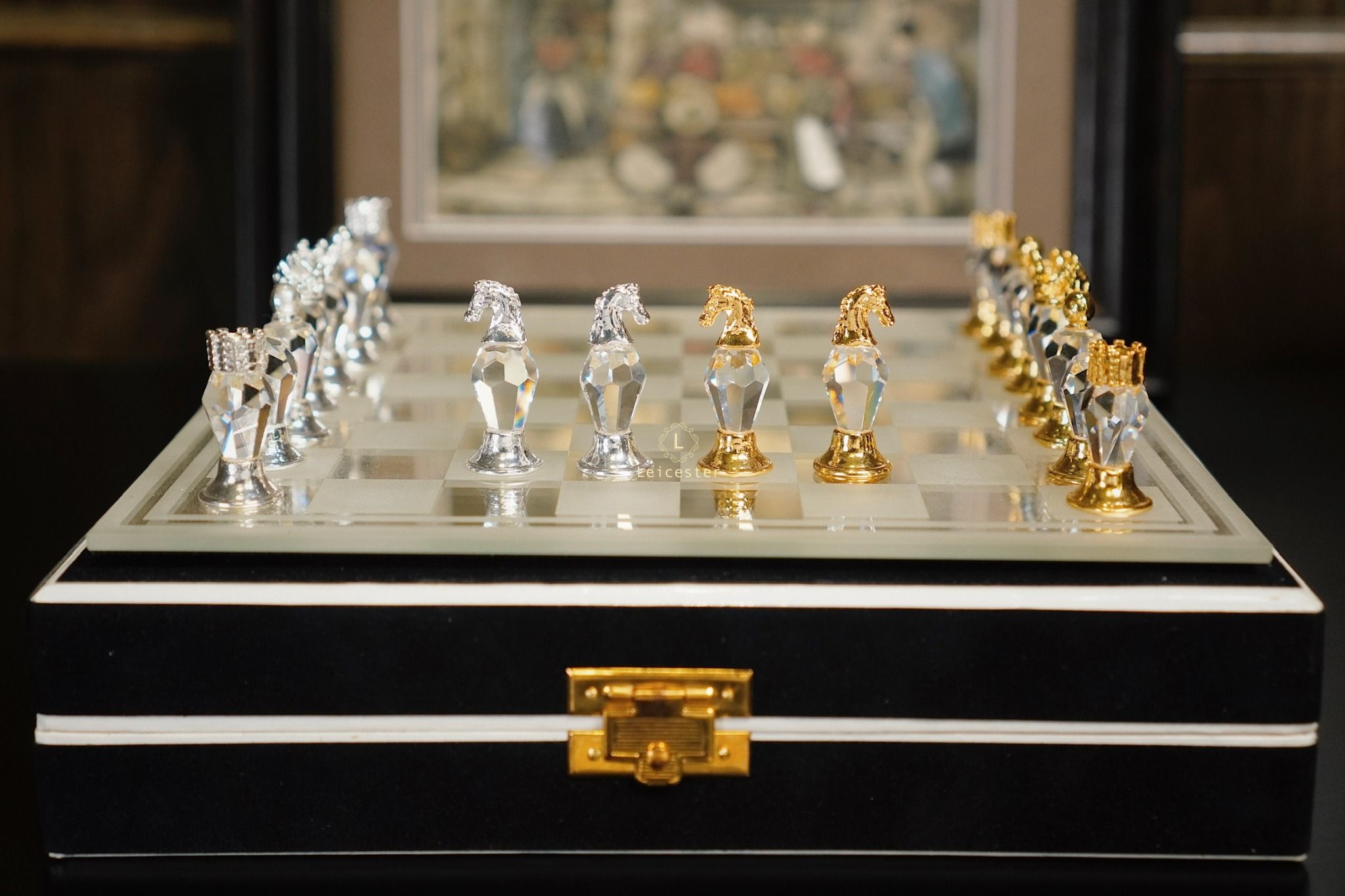 - Quân cờ: Pha lê Bohemia, kim loại mạ vàng mạ bạc