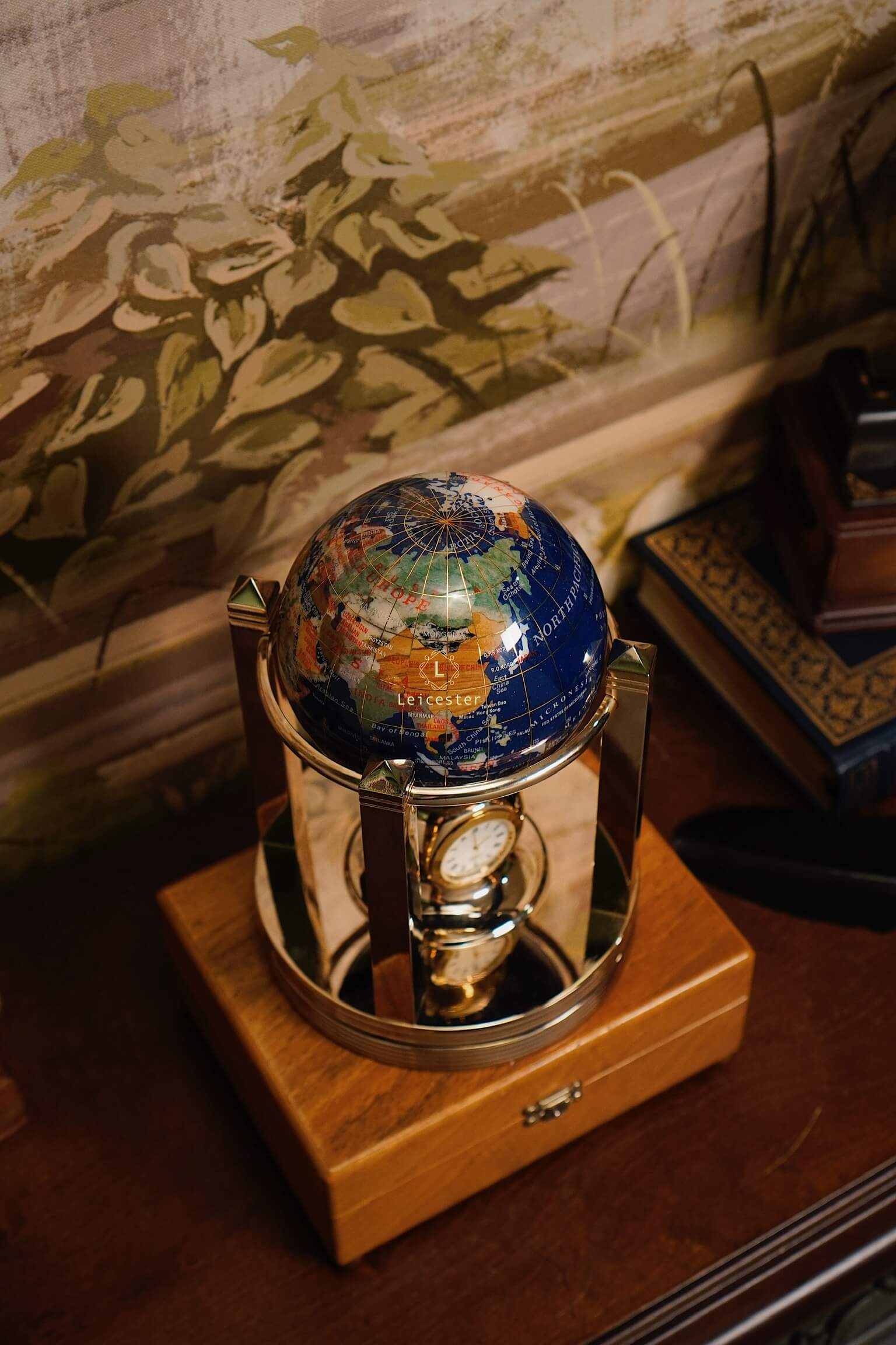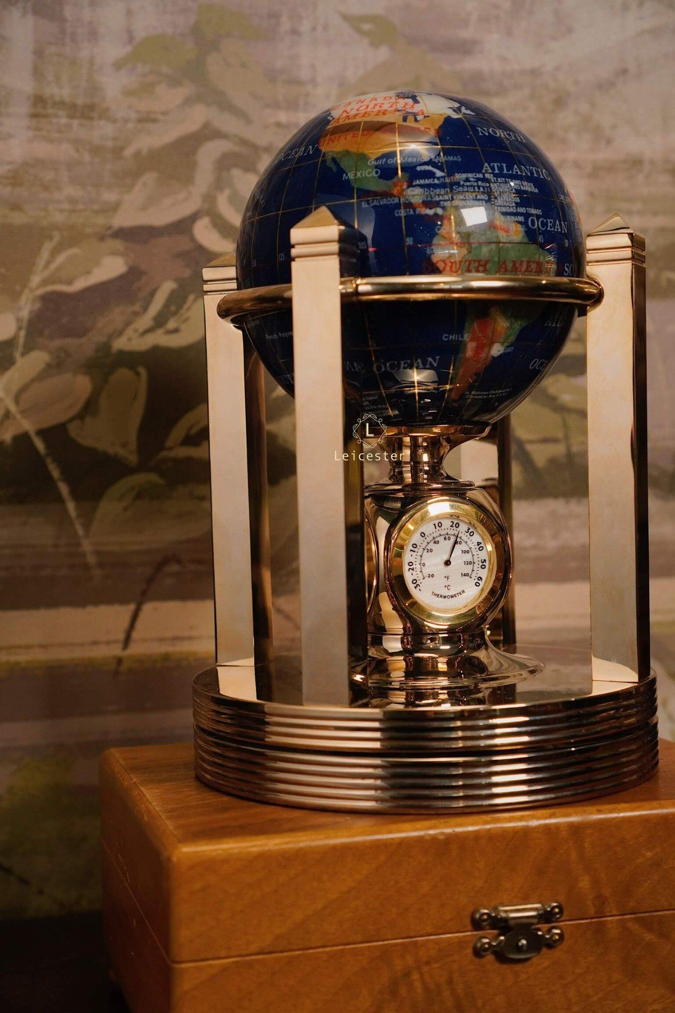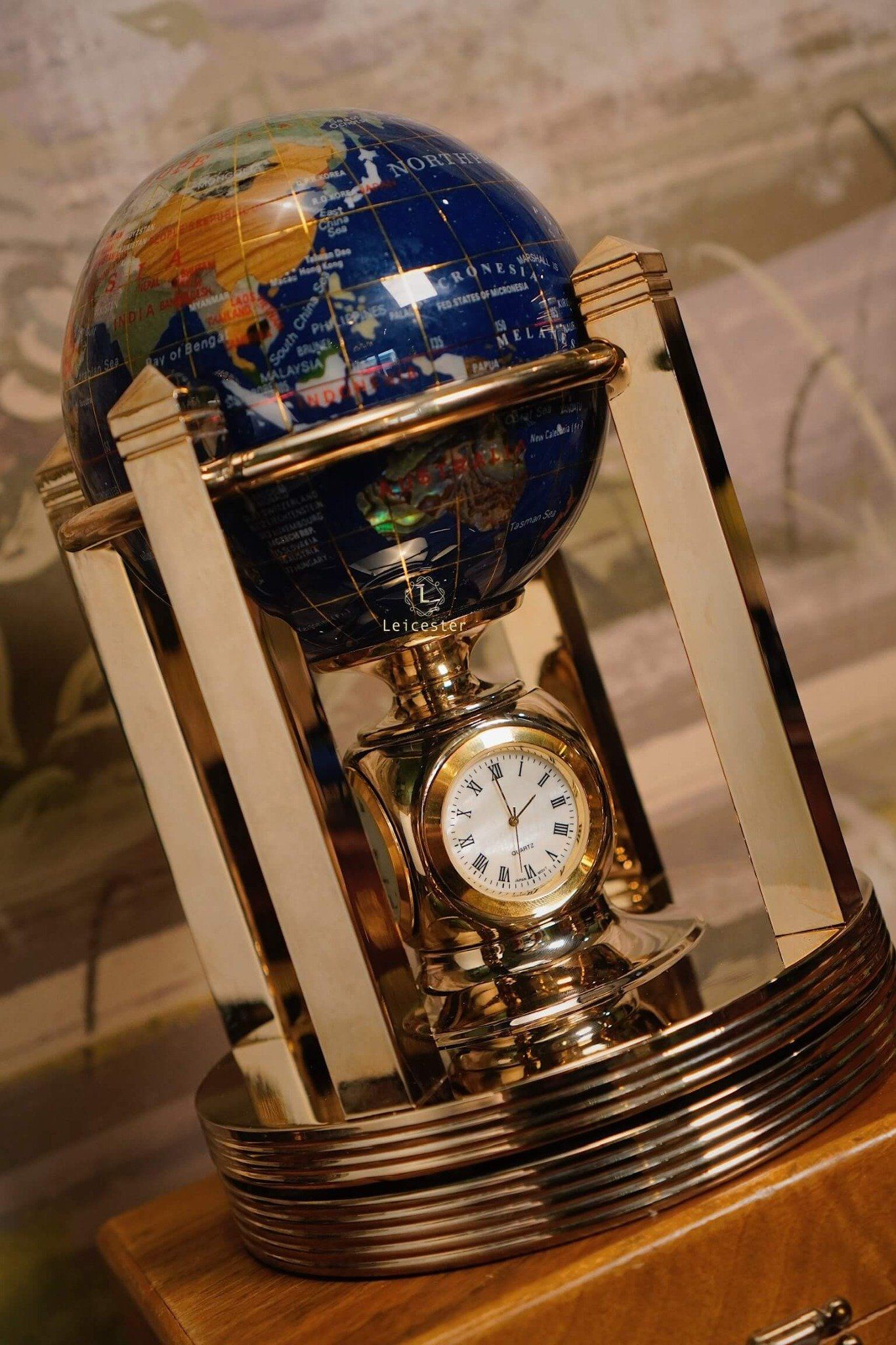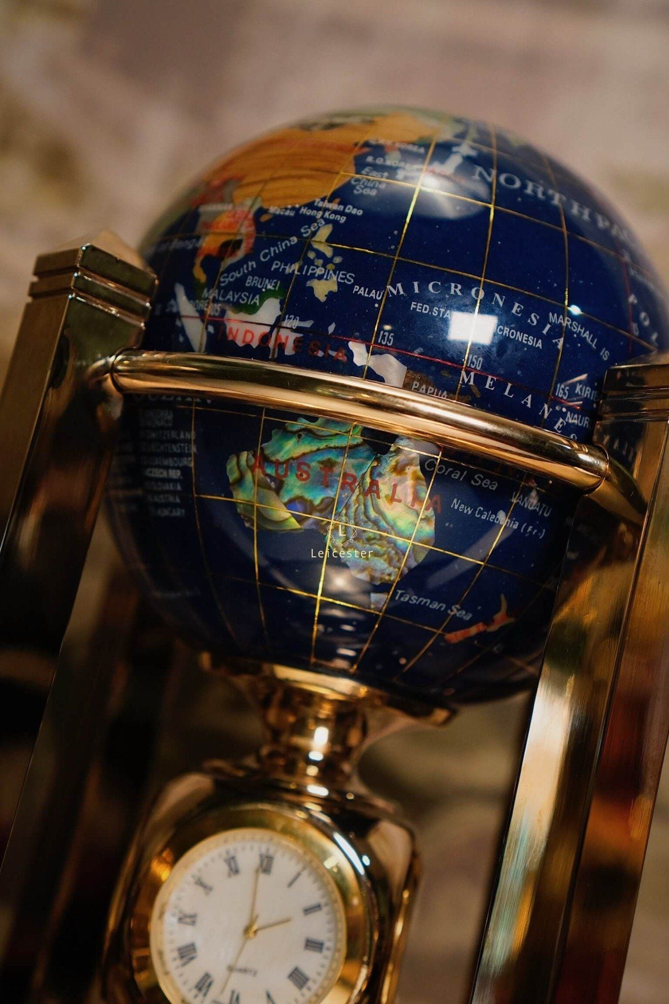 Khung địa cầu được chế tác bằng kim loại mạ vàng, tạo nên tổng thể hài hòa và đậm chất cổ điển châu Âu. Kết hợp với chiếc đồng hồ pin 4 mặt ở vị trí trung tâm chân đế, vừa là một sản phẩm trang trí tinh tế, vừa có thể xem giờ. Mỗi lục địa, mỗi quốc gia được thể hiện rõ nét qua từng mảnh đá ghép – như một thế giới thu nhỏ mang theo năng lượng của tự nhiên và giá trị vượt thời gian.