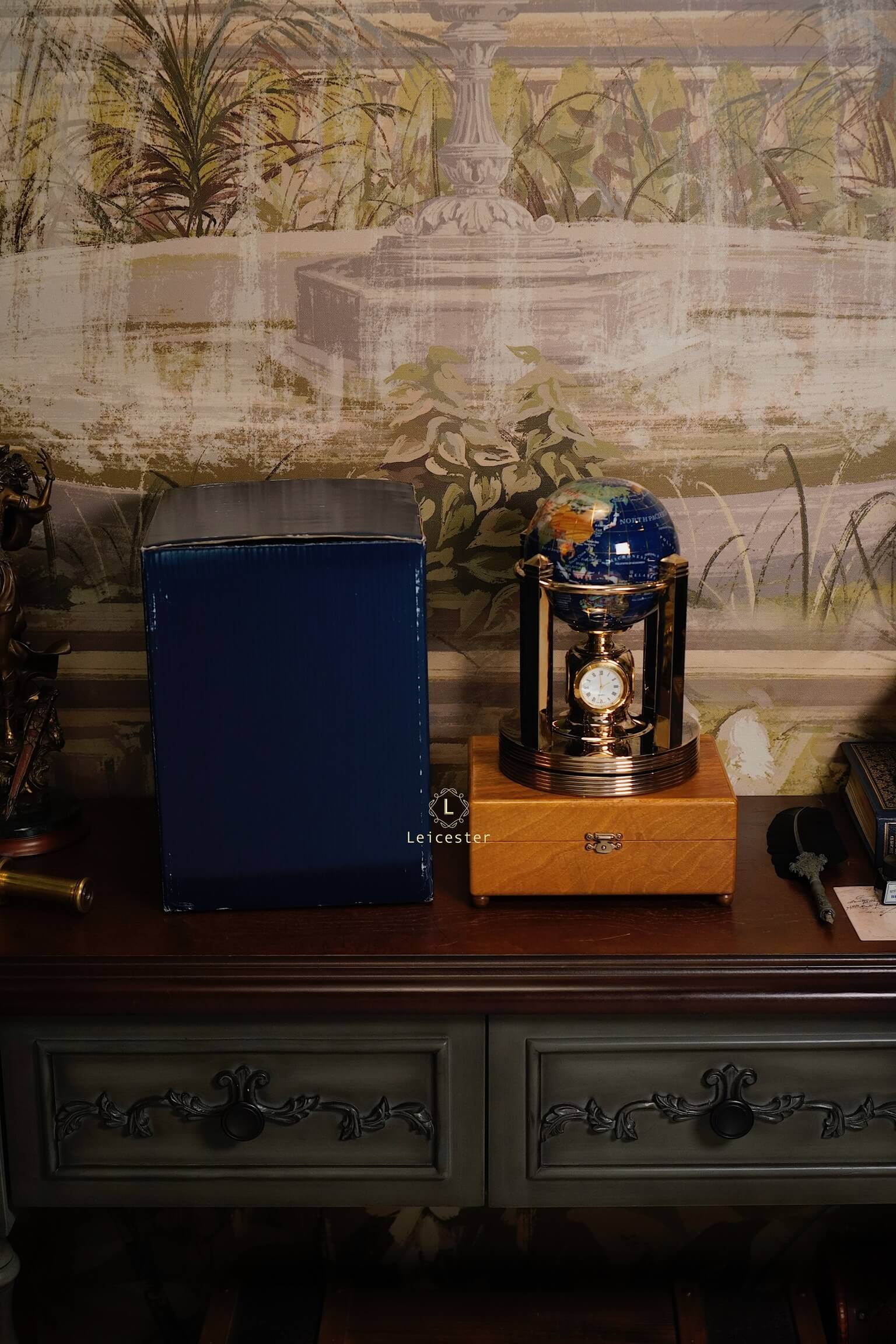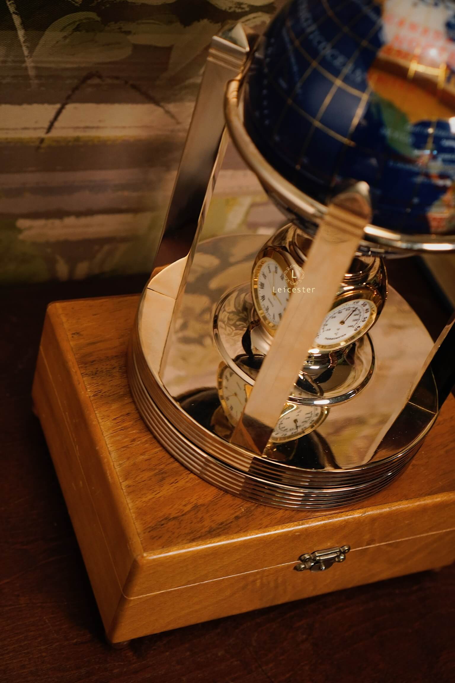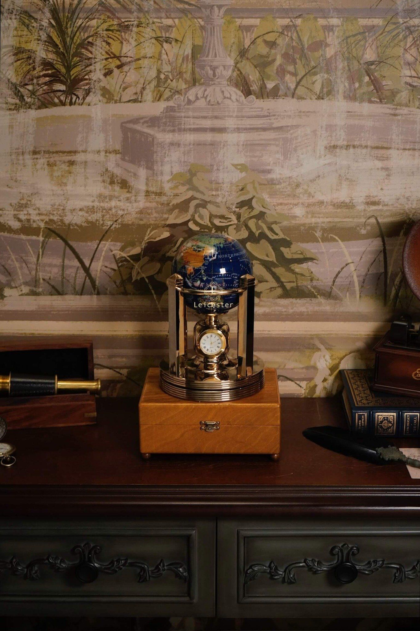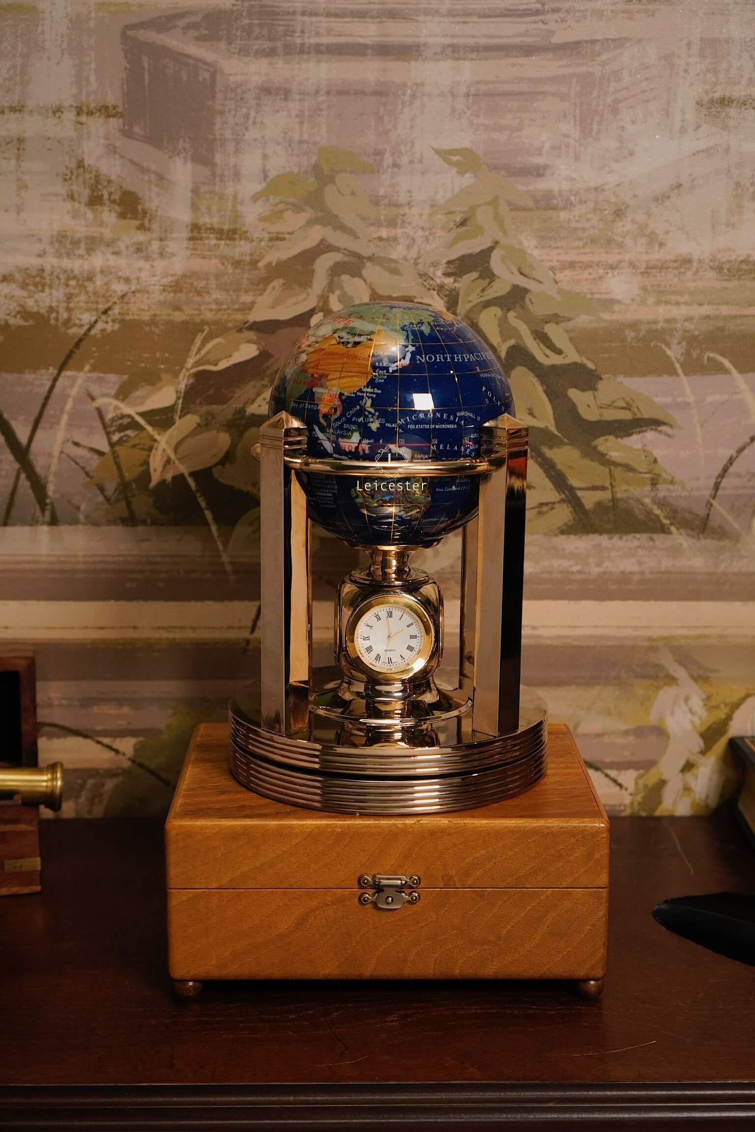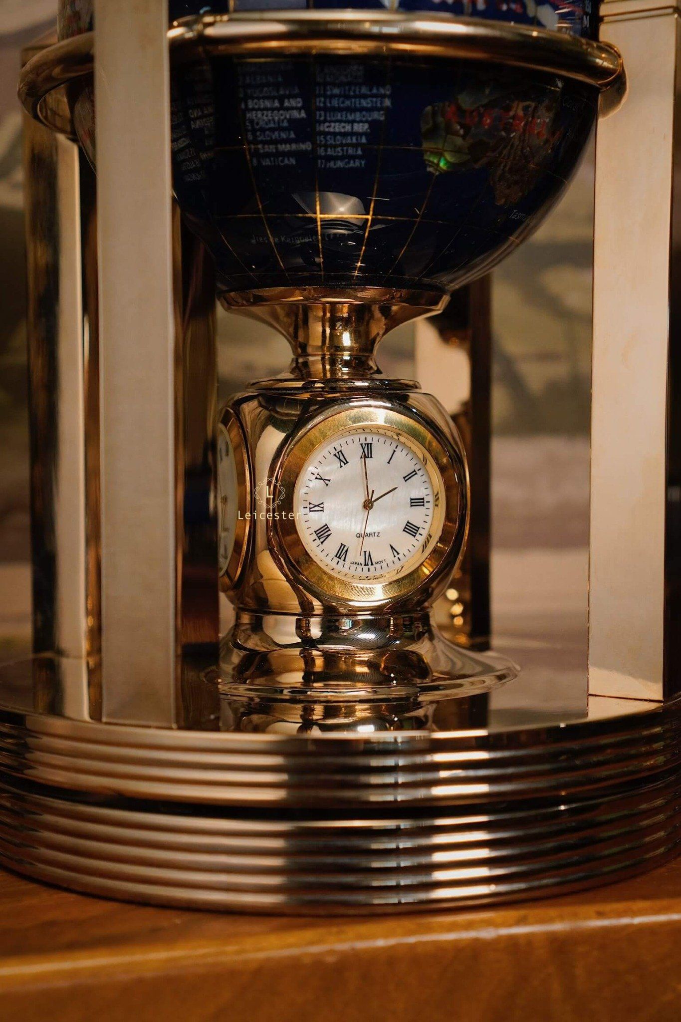 Khung địa cầu được chế tác bằng kim loại mạ vàng, tạo nên tổng thể hài hòa và đậm chất cổ điển châu Âu. Kết hợp với chiếc đồng hồ pin 4 mặt ở vị trí trung tâm chân đế, vừa là một sản phẩm trang trí tinh tế, vừa có thể xem giờ. Mỗi lục địa, mỗi quốc gia được thể hiện rõ nét qua từng mảnh đá ghép – như một thế giới thu nhỏ mang theo năng lượng của tự nhiên và giá trị vượt thời gian.