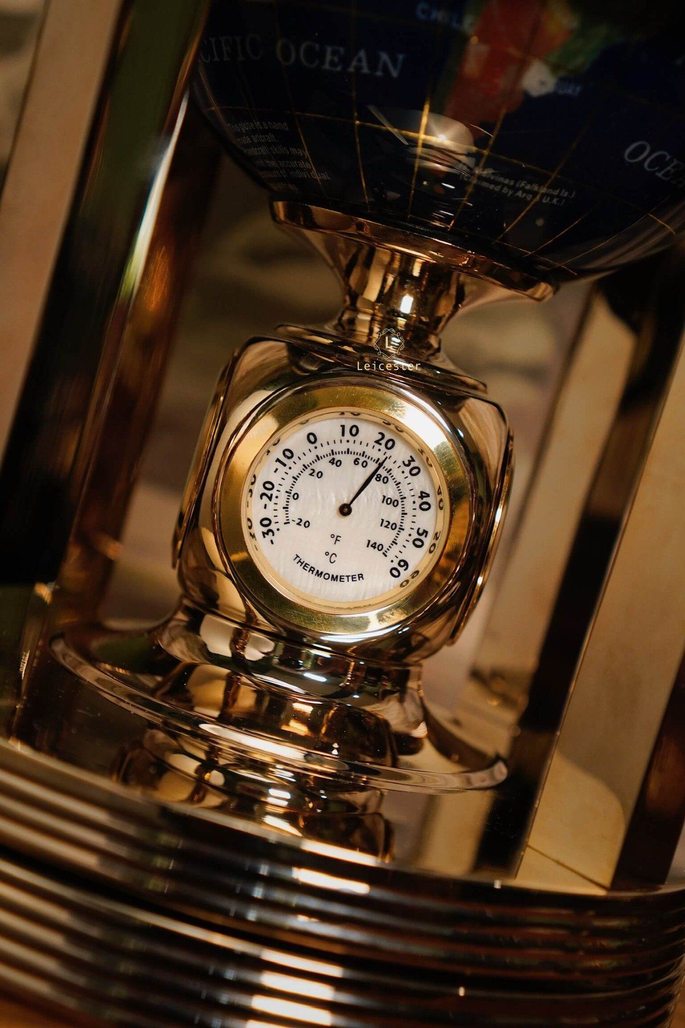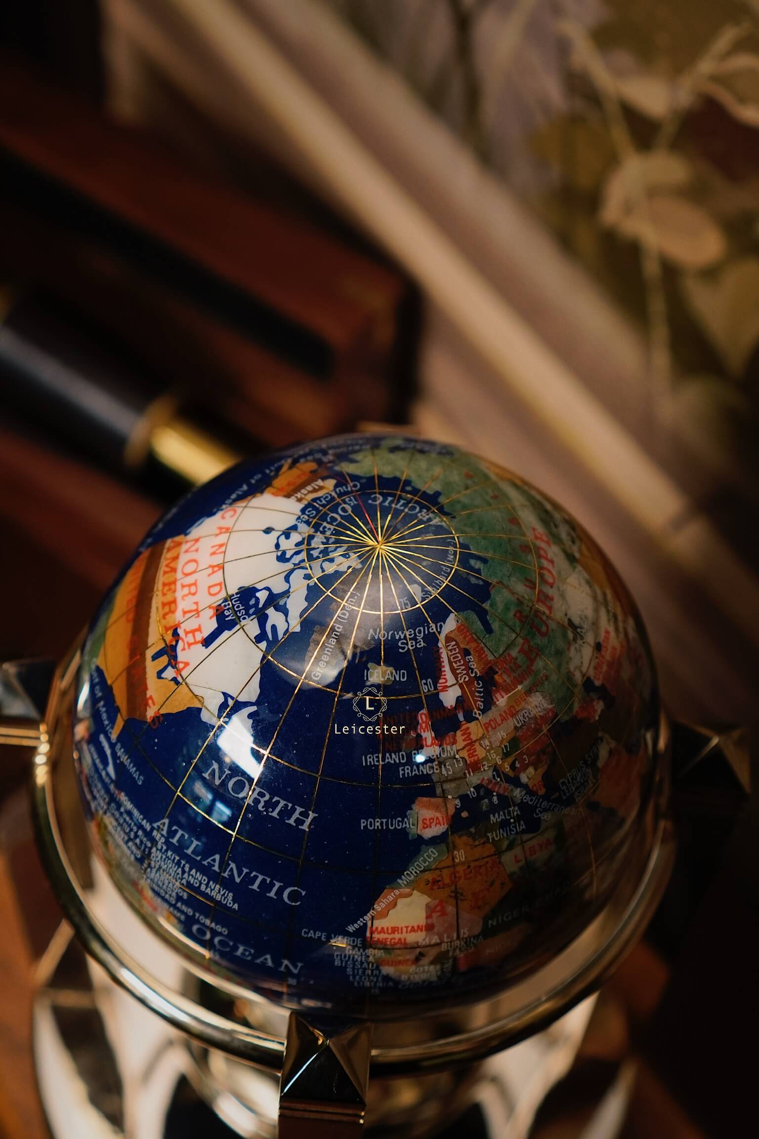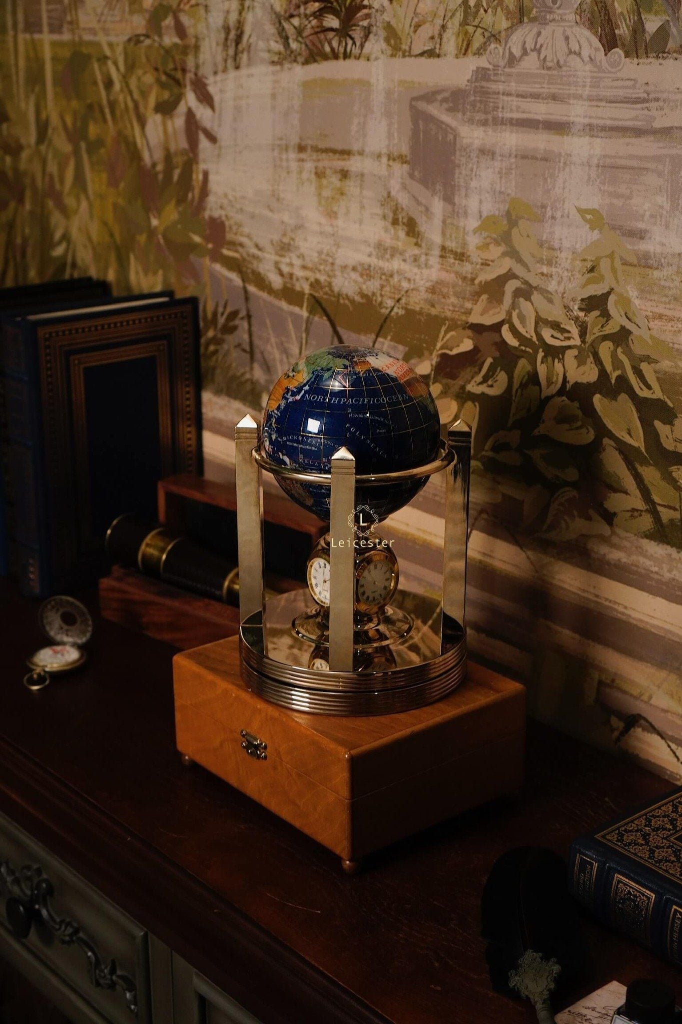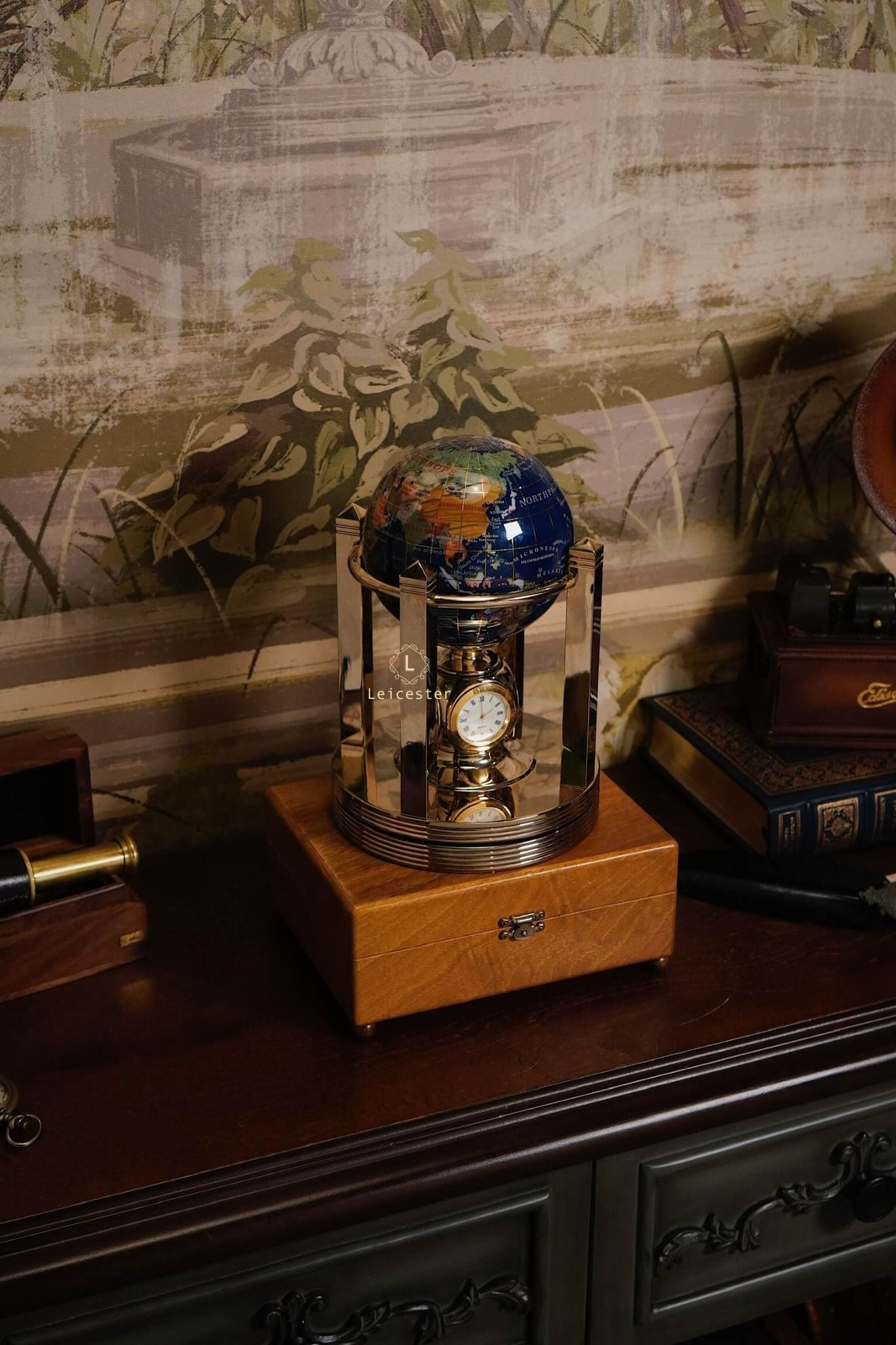 Khung địa cầu được chế tác bằng kim loại mạ vàng, tạo nên tổng thể hài hòa và đậm chất cổ điển châu Âu. Kết hợp với chiếc đồng hồ pin 4 mặt ở vị trí trung tâm chân đế, vừa là một sản phẩm trang trí tinh tế, vừa có thể xem giờ. Mỗi lục địa, mỗi quốc gia được thể hiện rõ nét qua từng mảnh đá ghép – như một thế giới thu nhỏ mang theo năng lượng của tự nhiên và giá trị vượt thời gian.