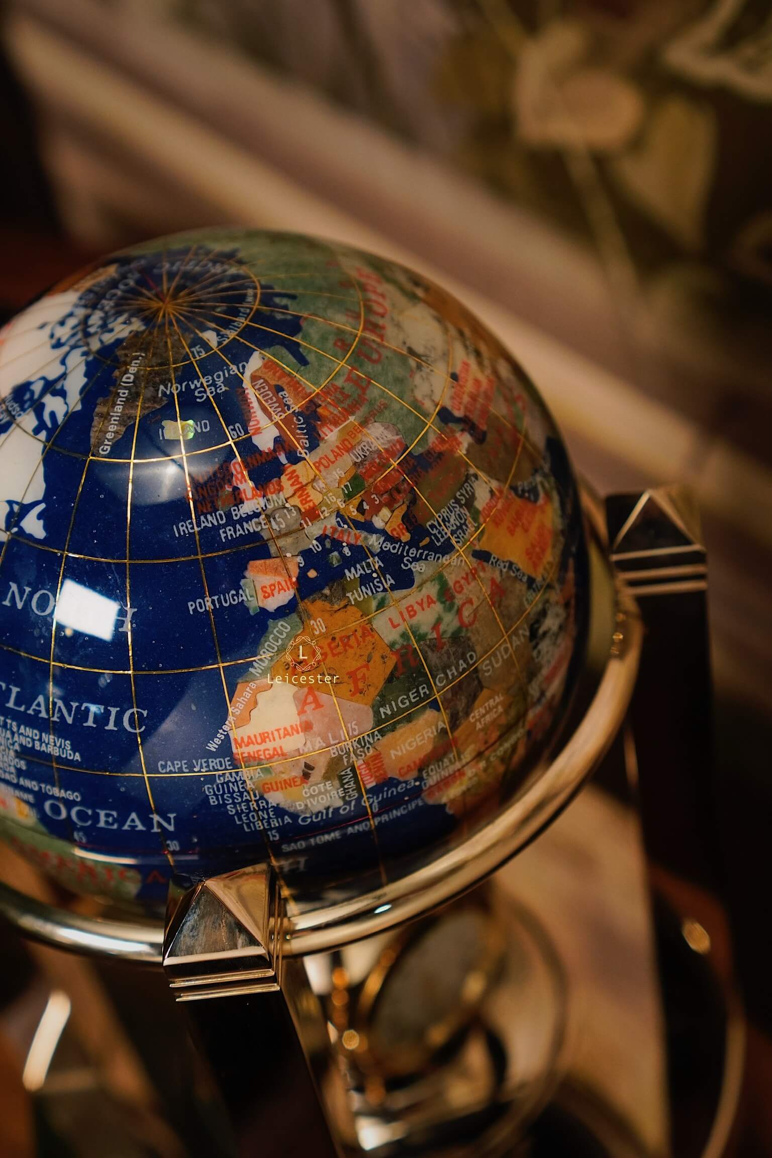 Mỗi chi tiết trên quả địa cầu này được ghép tay tỉ mỉ từ hàng chục loại đá tự nhiên, trong đó phần đại dương nổi bật với sắc xanh thẫm của Lapis Lazuli – loại đá được mệnh danh là “sapphire của các Pharaoh Ai Cập”. Lapis mang vẻ đẹp huyền bí, đậm chất hoàng gia và từ lâu đã trở thành biểu tượng của trí tuệ và quyền lực trong các nền văn minh cổ đại.