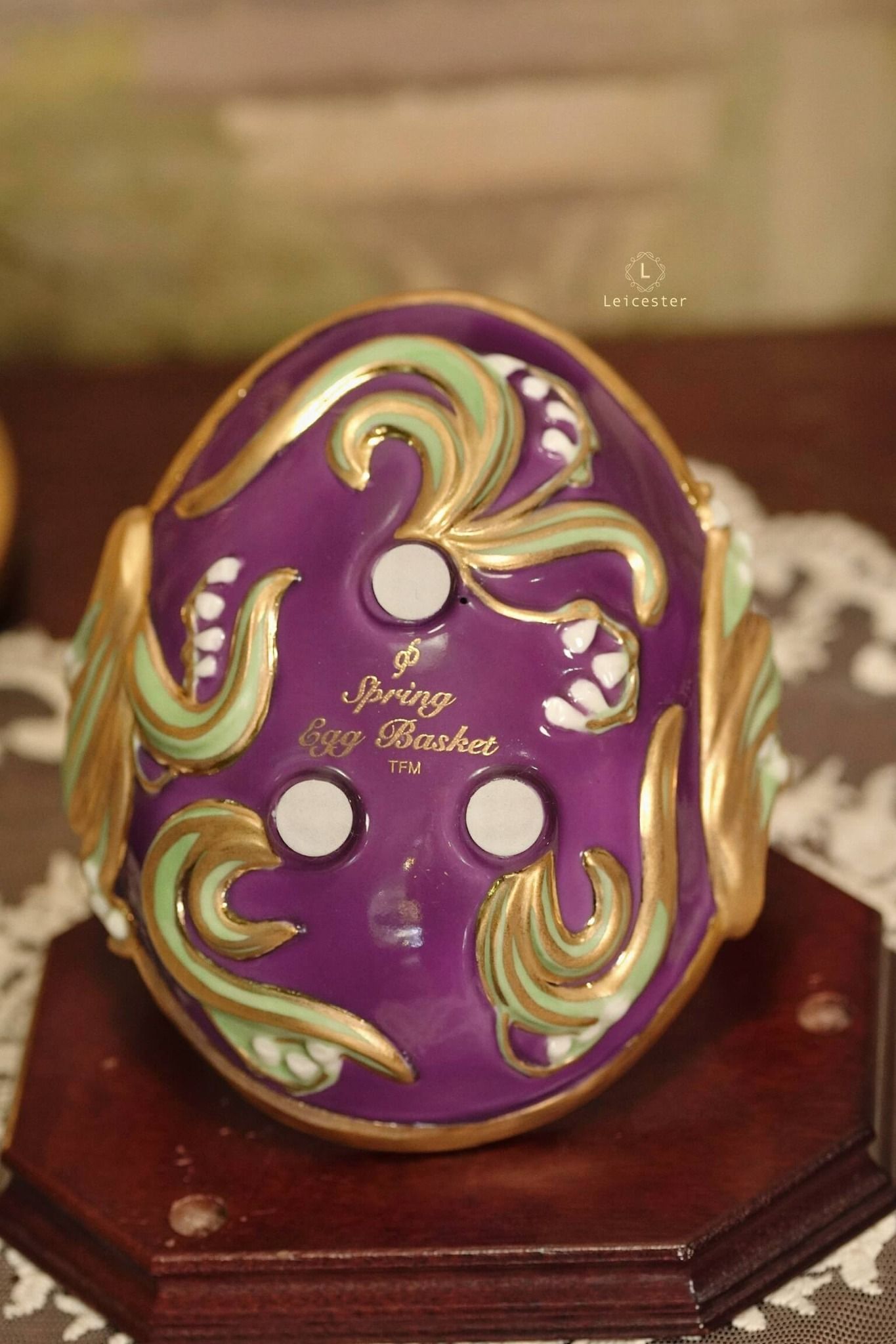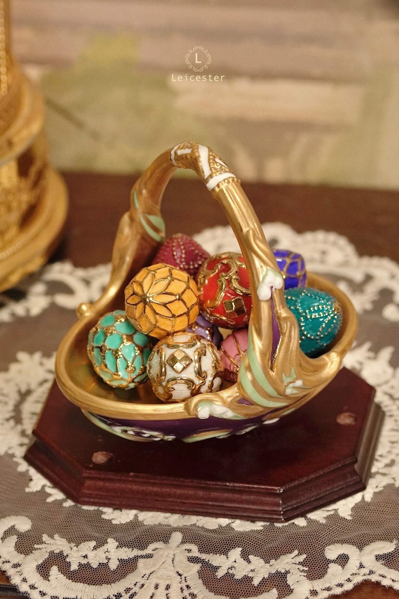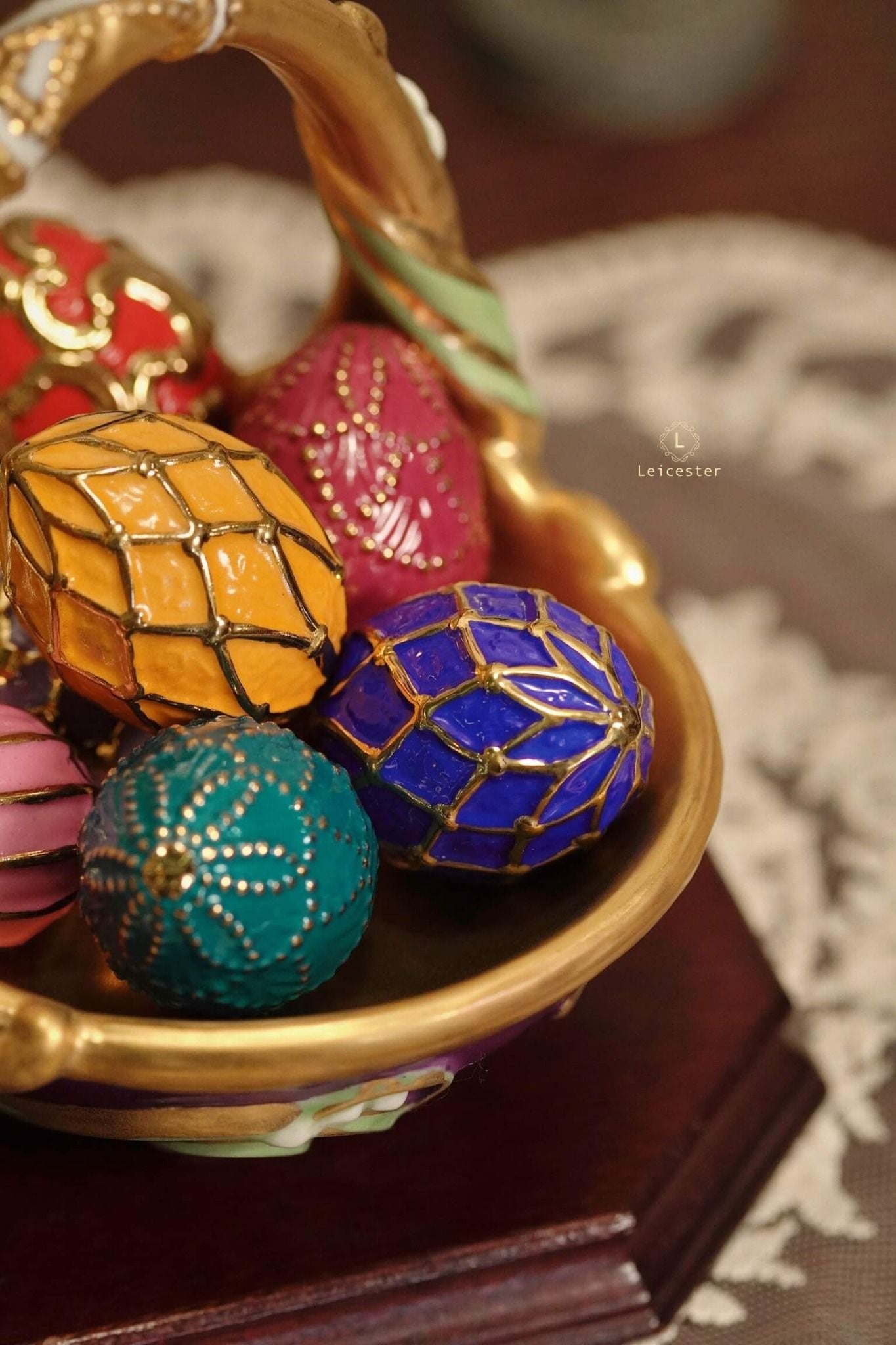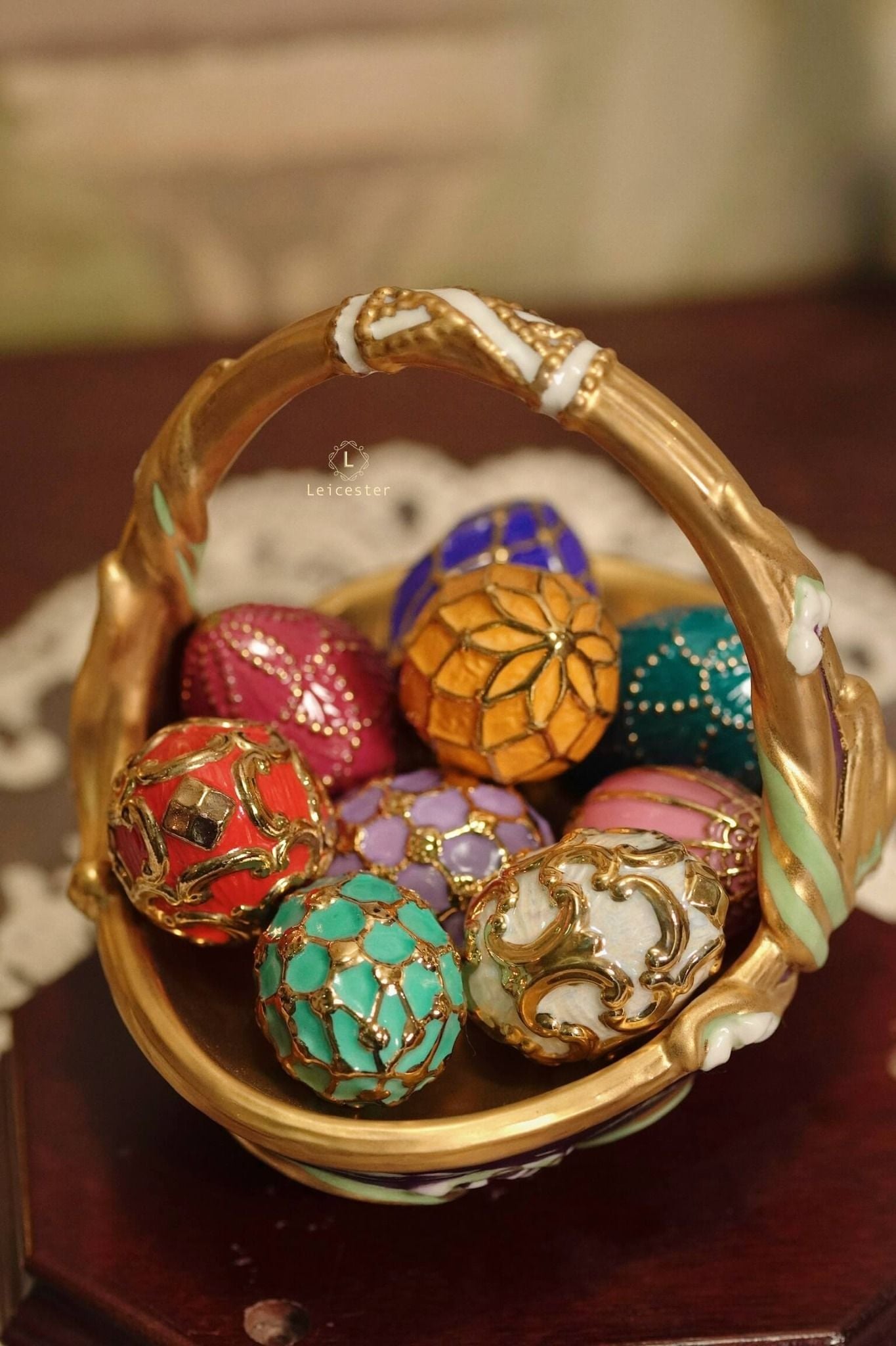 Spring Egg Basket gồm chín quả trứng rực rỡ, mỗi quả mang màu sắc với những ý nghĩa tốt đẹp được chạm khắc tỉ mỉ, vẽ màu thủ công cùng với chi tiết mạ vàng 24K tạo điểm nhấn vương giả. Các quả trứng được đặt trong một chiếc giỏ bằng sứ hình quả trứng, bao quanh bởi những bông hoa và những chiếc lá đan xen duyên dáng.