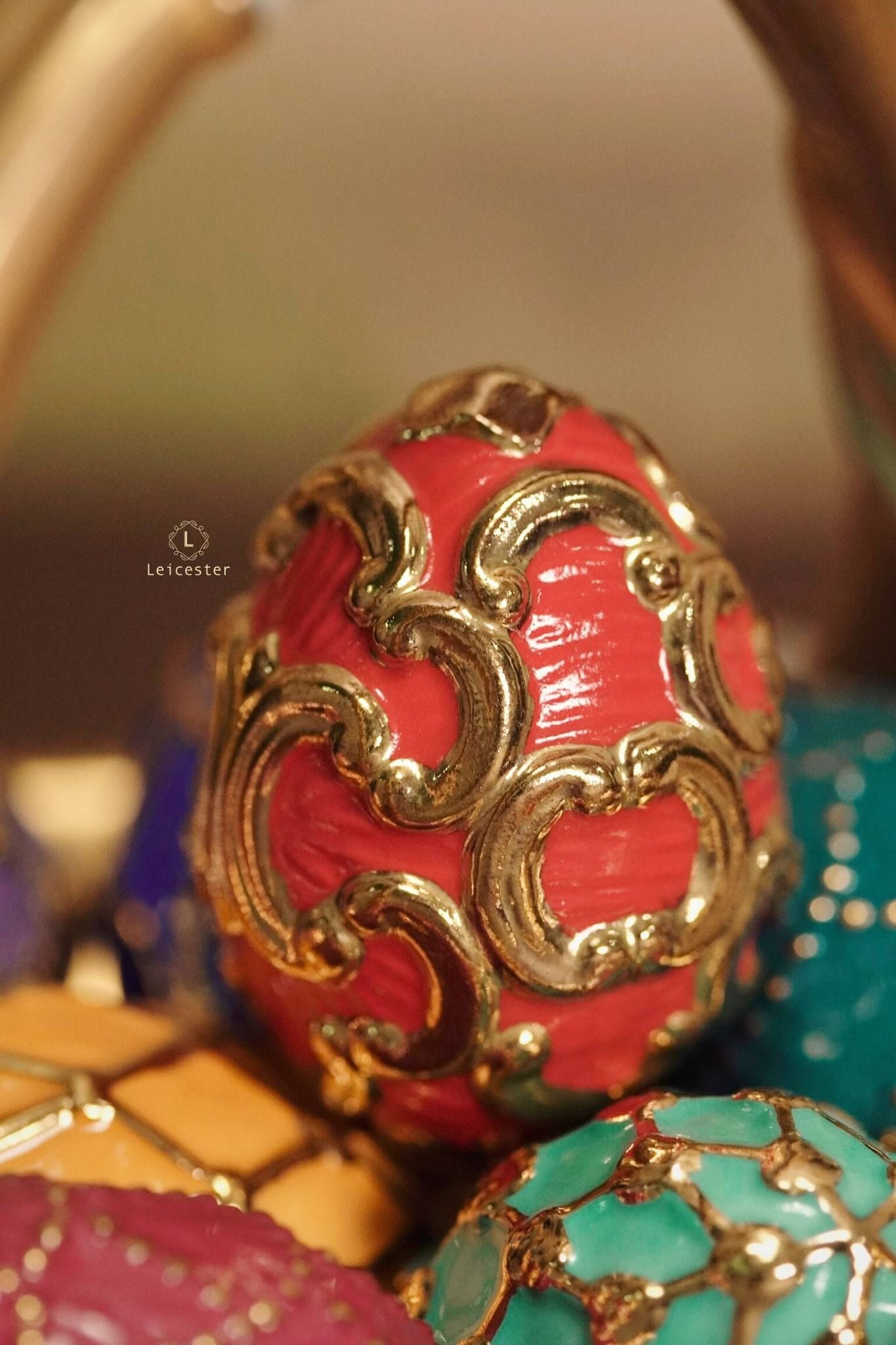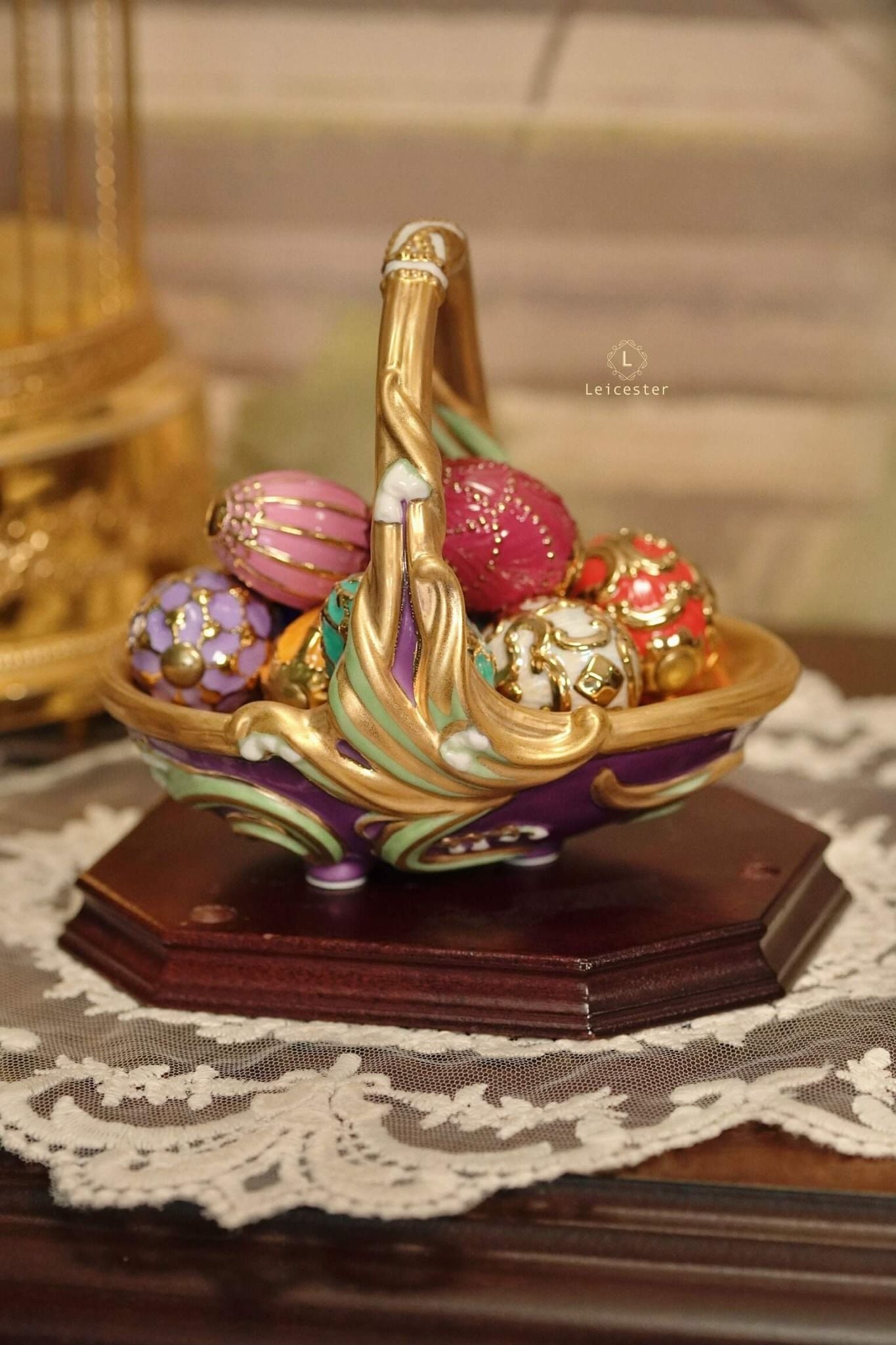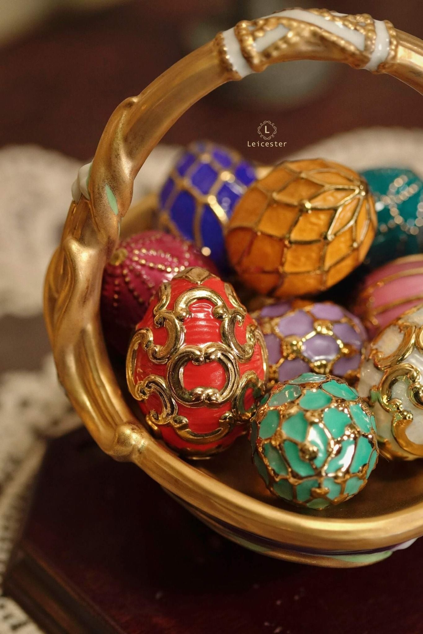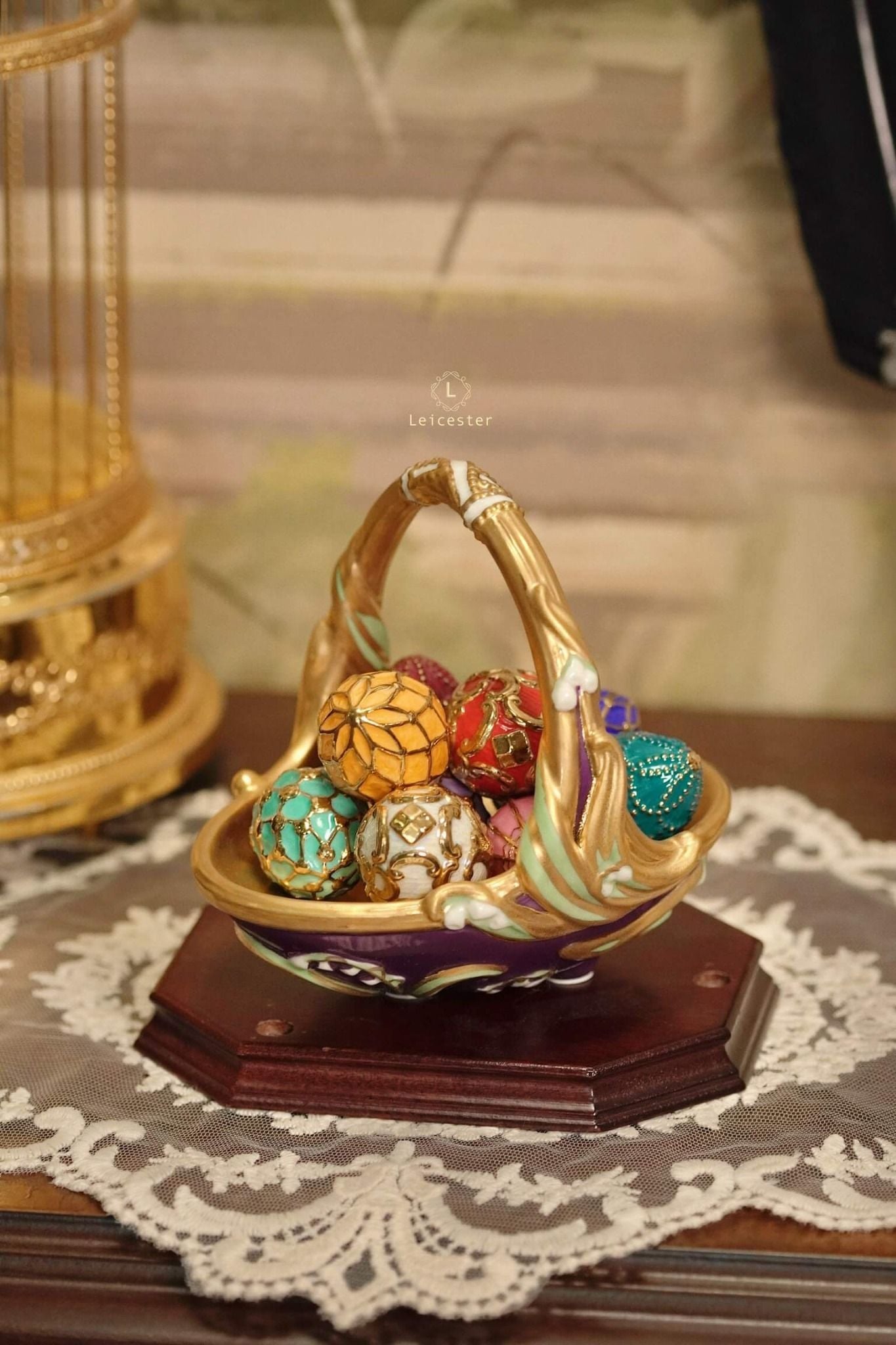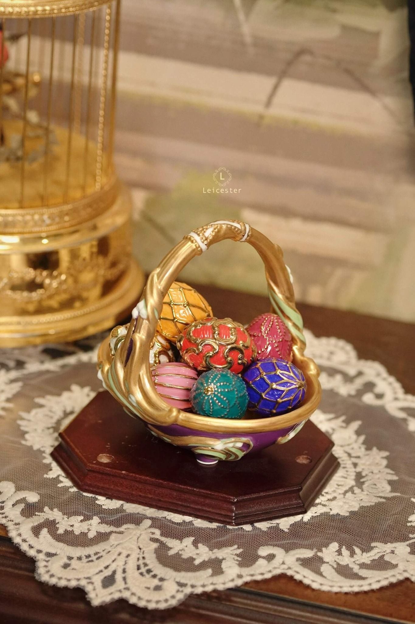 Spring Egg Basket gồm chín quả trứng rực rỡ, mỗi quả mang màu sắc với những ý nghĩa tốt đẹp được chạm khắc tỉ mỉ, vẽ màu thủ công cùng với chi tiết mạ vàng 24K tạo điểm nhấn vương giả. Các quả trứng được đặt trong một chiếc giỏ bằng sứ hình quả trứng, bao quanh bởi những bông hoa và những chiếc lá đan xen duyên dáng.