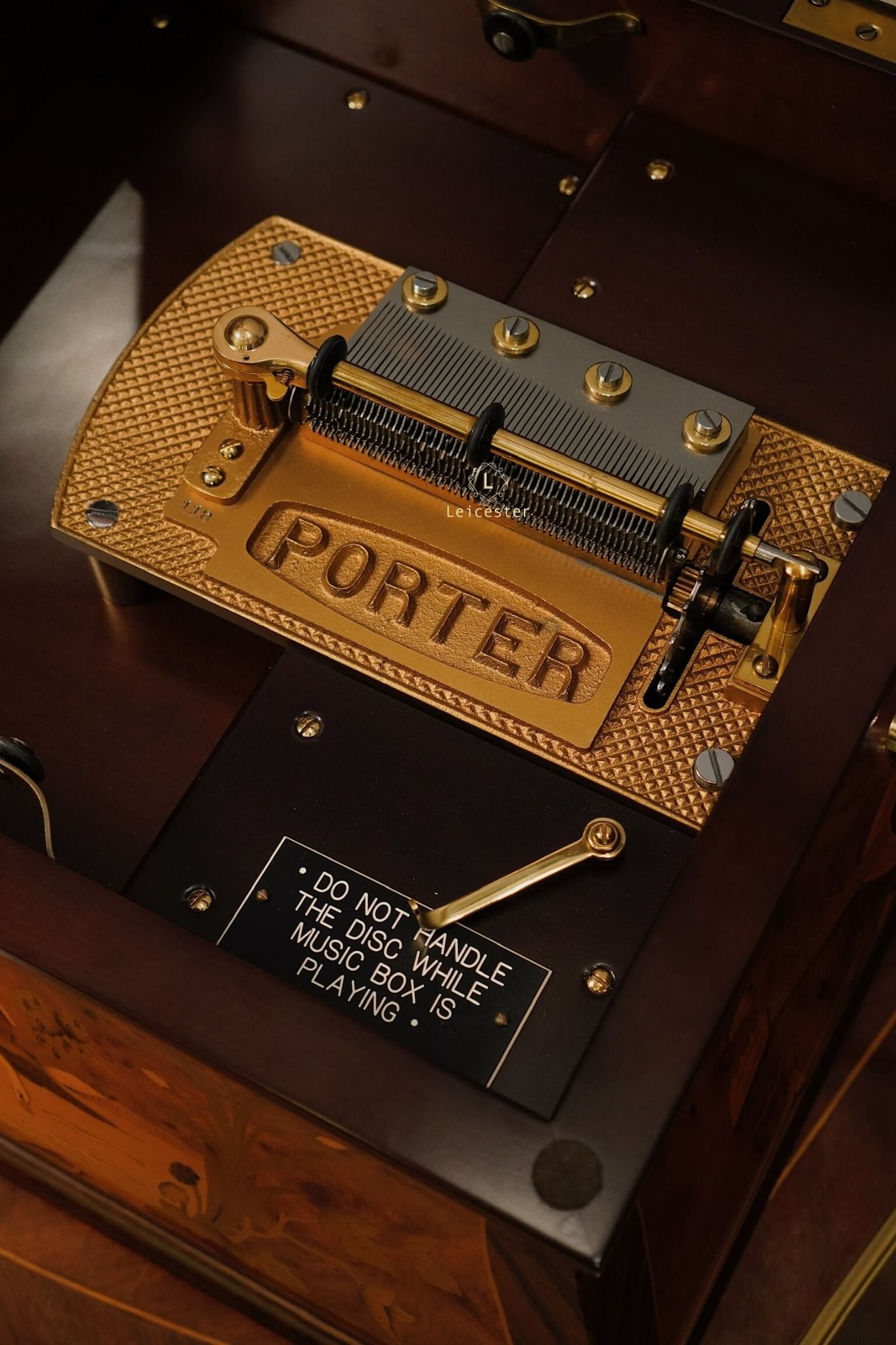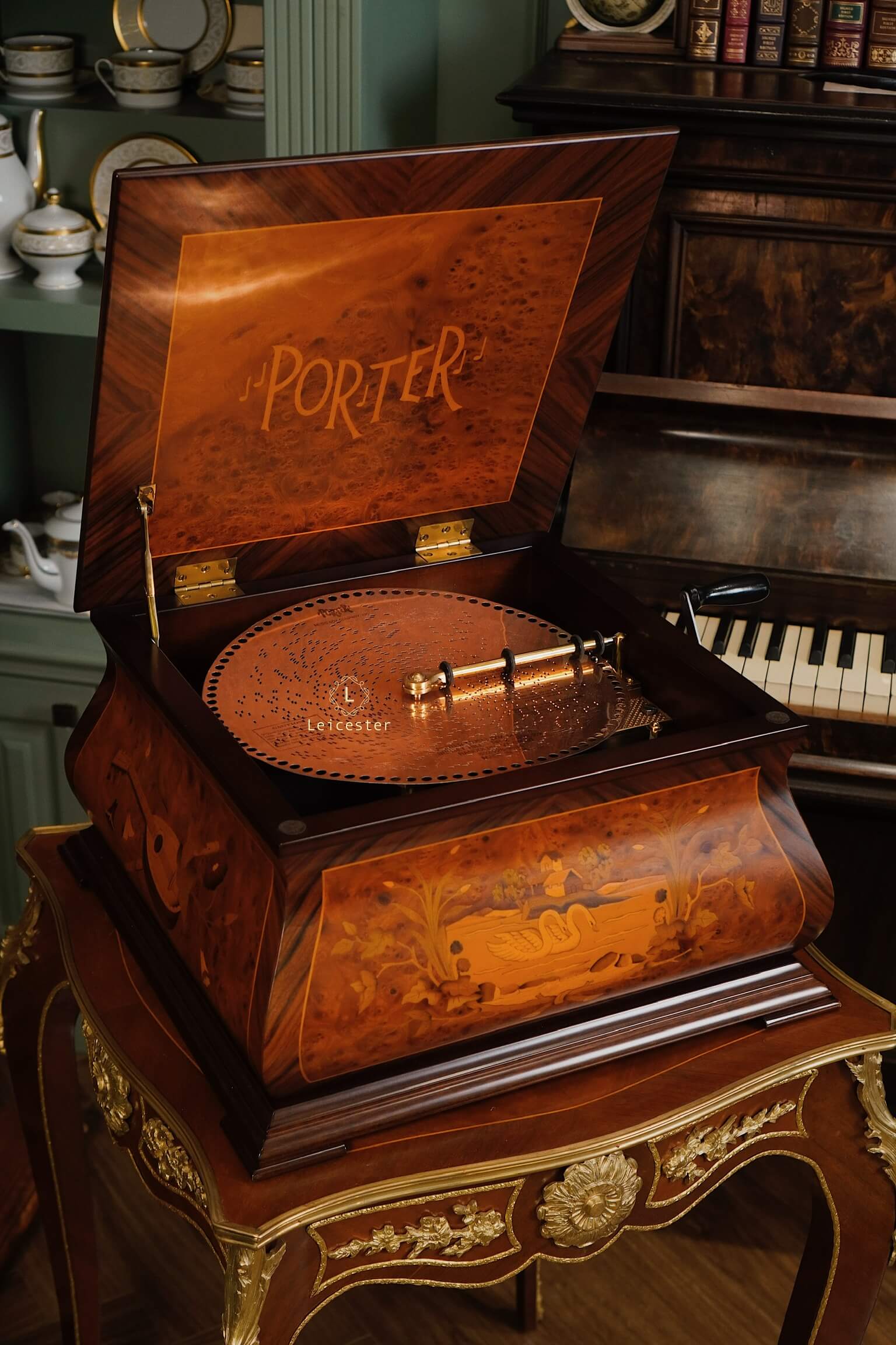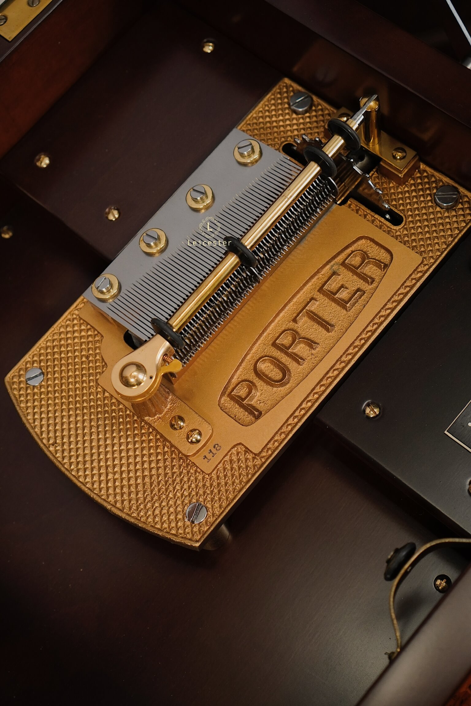 Hộp Nhạc Porter Swan Elite đây là mẫu đĩa 12/ 1/4, với hai lược nhạc 54 răng trên mỗi lược với tổng số 108 răng. Có phạm vi 5 quãng tám và sẽ phát trong hơn 15 phút khi lên gần đầy cót. Động cơ cuộn dây là loại dây quấn lò xo và được làm từ gang và bánh răng bằng đồng thau.