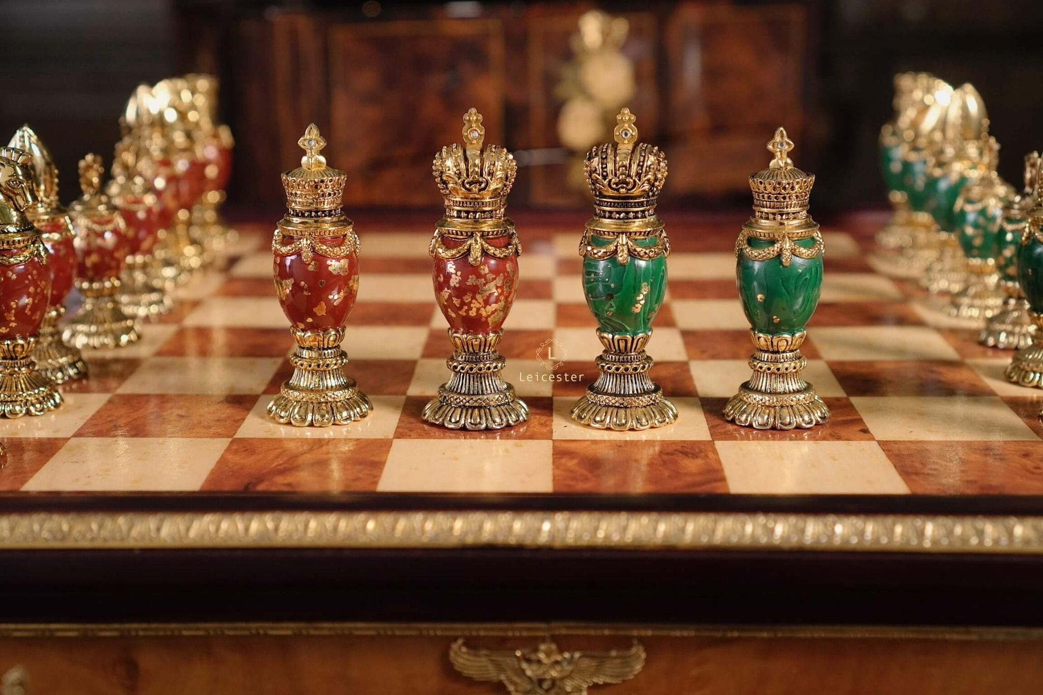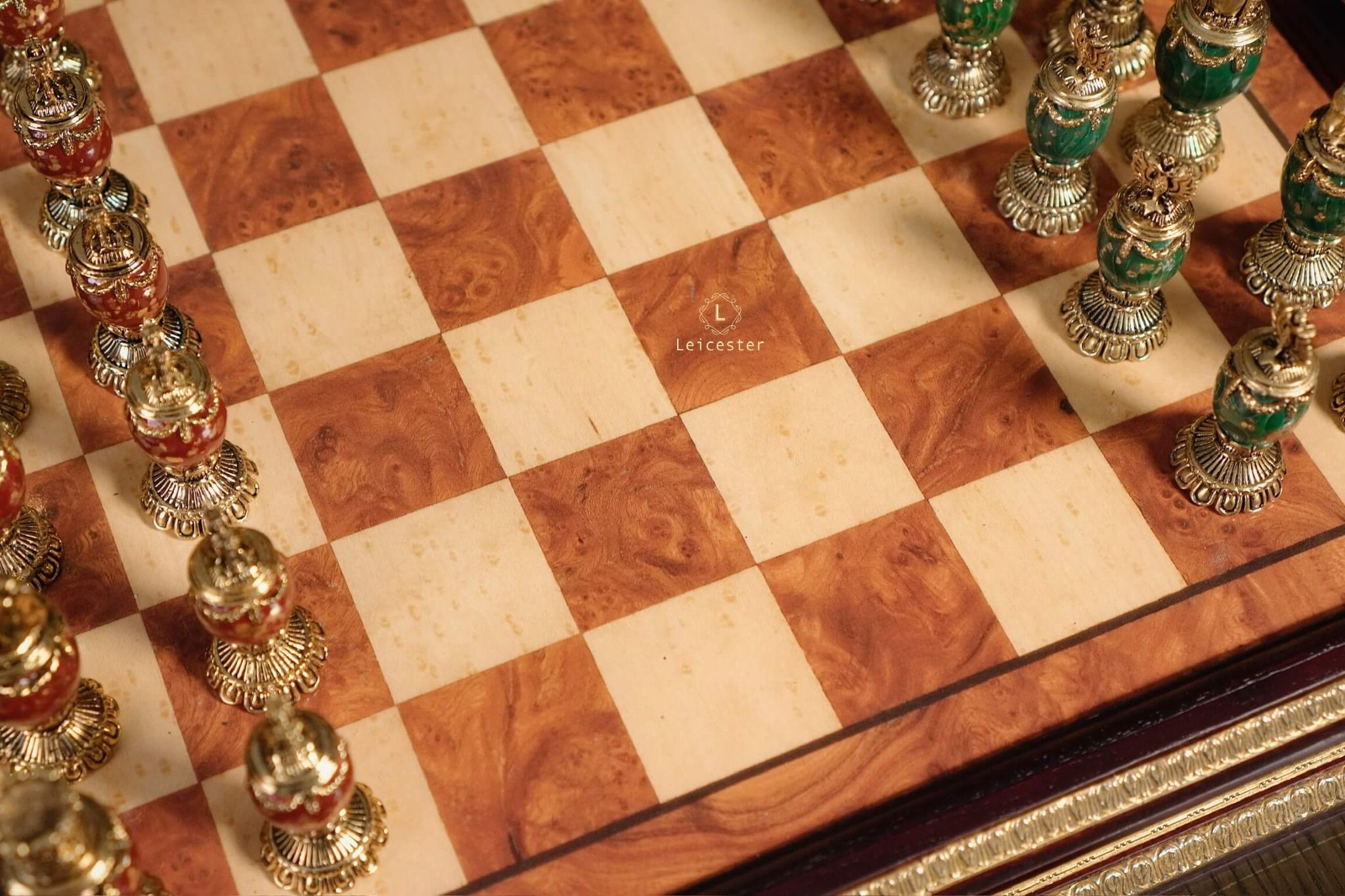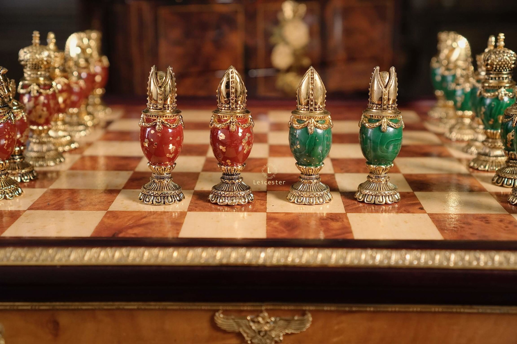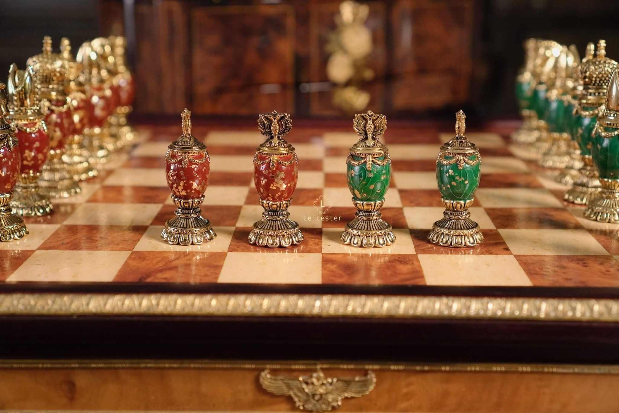 Bộ cờ vua gồm 32 quân, các quân cờ được tráng men bằng màu malachite và đỏ tía. Mỗi quân cờ đi kèm một chiếc mũ đội đầu mạ vàng 24K. Bốn quân cờ Vua và Hậu có đính đá trên đỉnh. Bộ cờ vua như một chiếc rương, bàn cờ được làm bằng gỗ mun cùng những chi tiết mạ vàng.