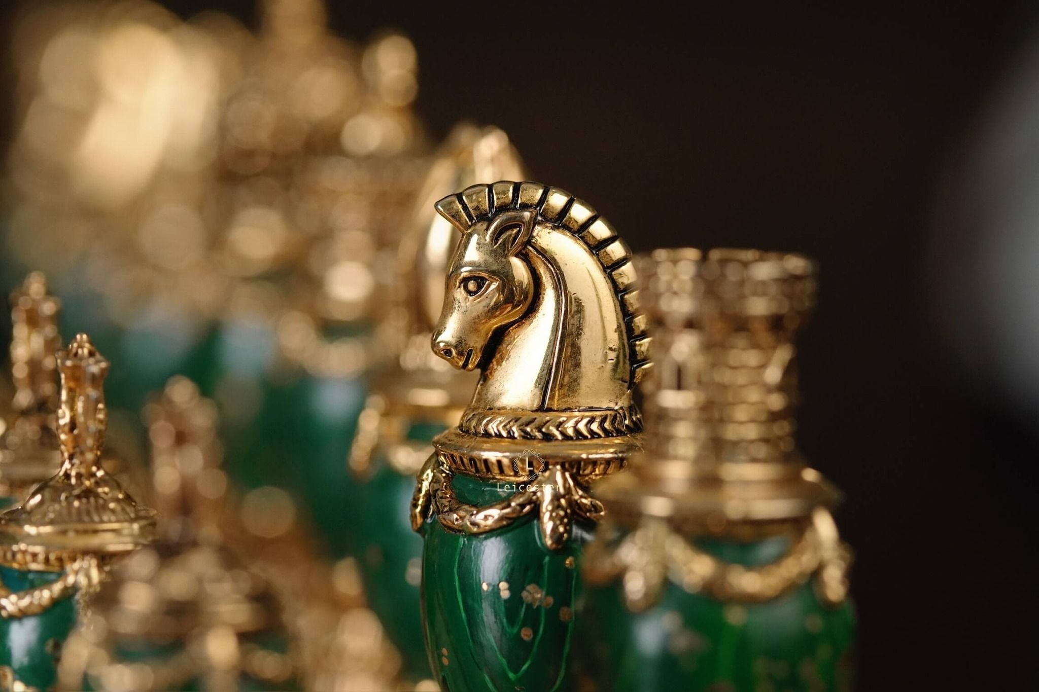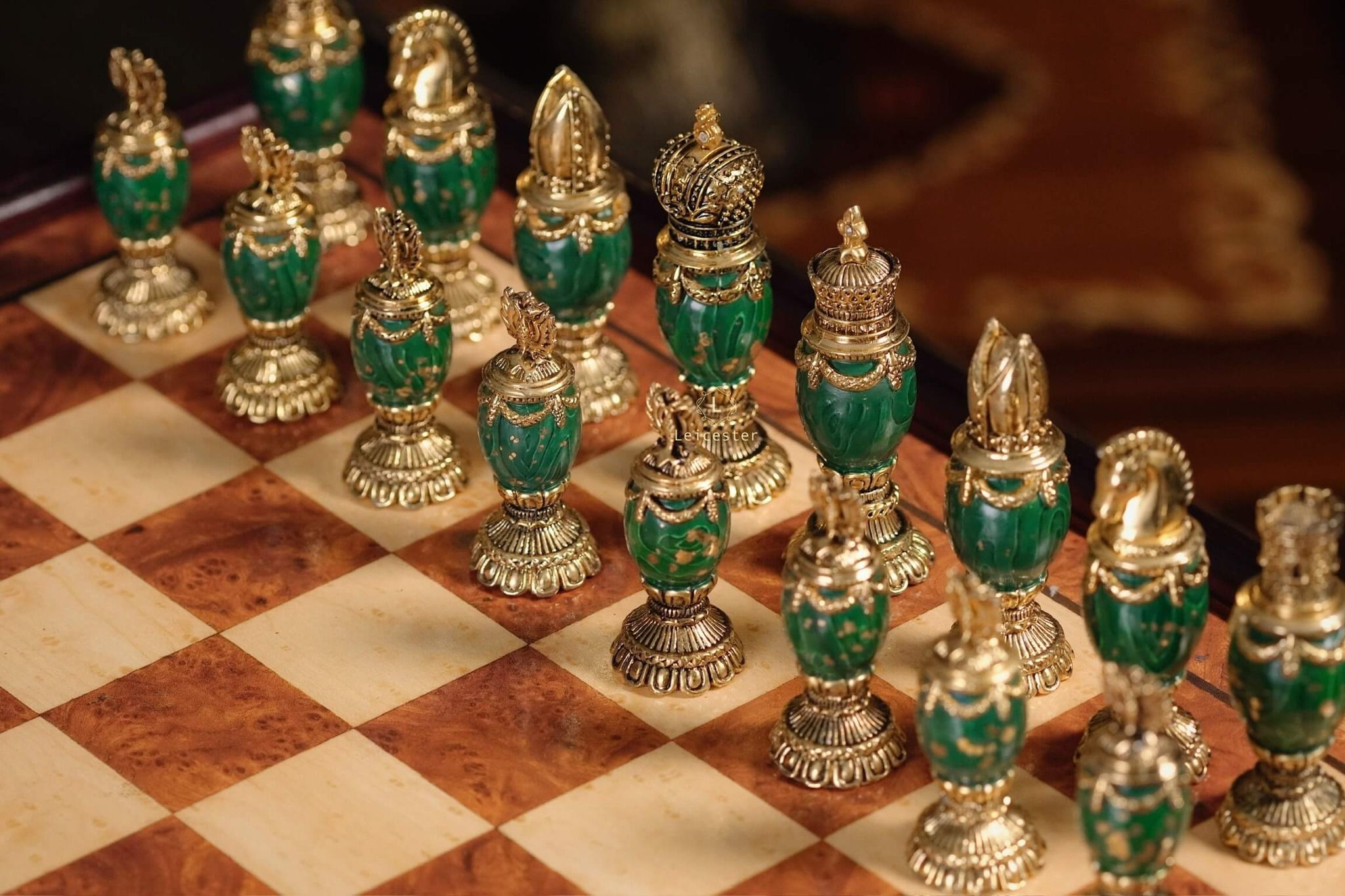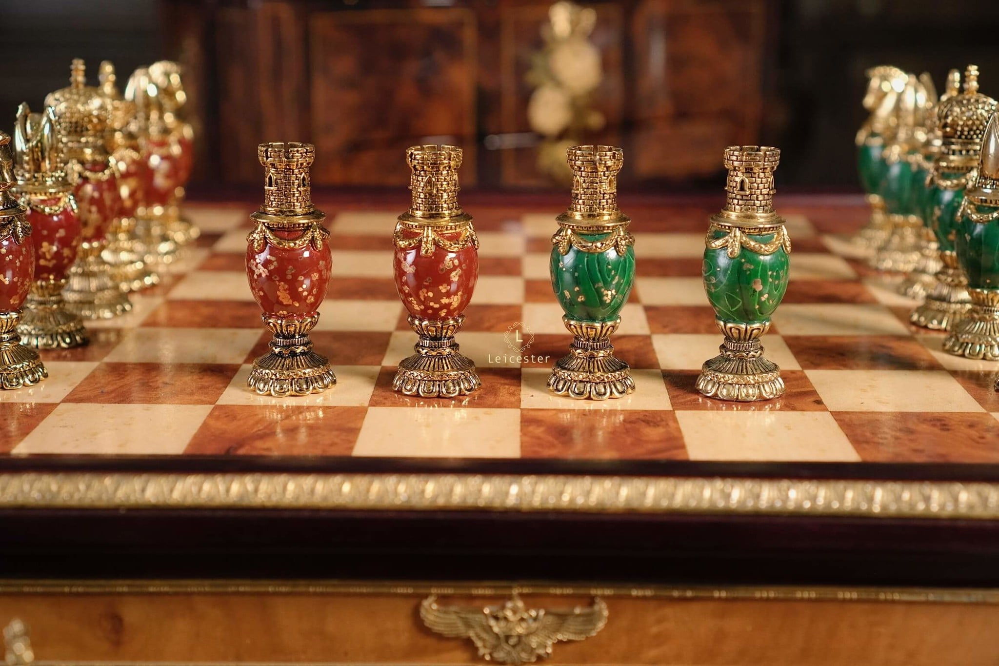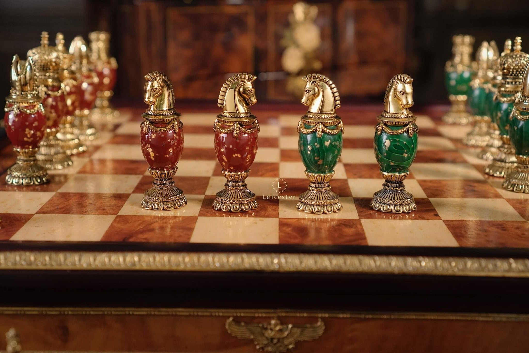 Bộ cờ vua gồm 32 quân, các quân cờ được tráng men bằng màu malachite và đỏ tía. Mỗi quân cờ đi kèm một chiếc mũ đội đầu mạ vàng 24K. Bốn quân cờ Vua và Hậu có đính đá trên đỉnh. Bộ cờ vua như một chiếc rương, bàn cờ được làm bằng gỗ mun cùng những chi tiết mạ vàng.