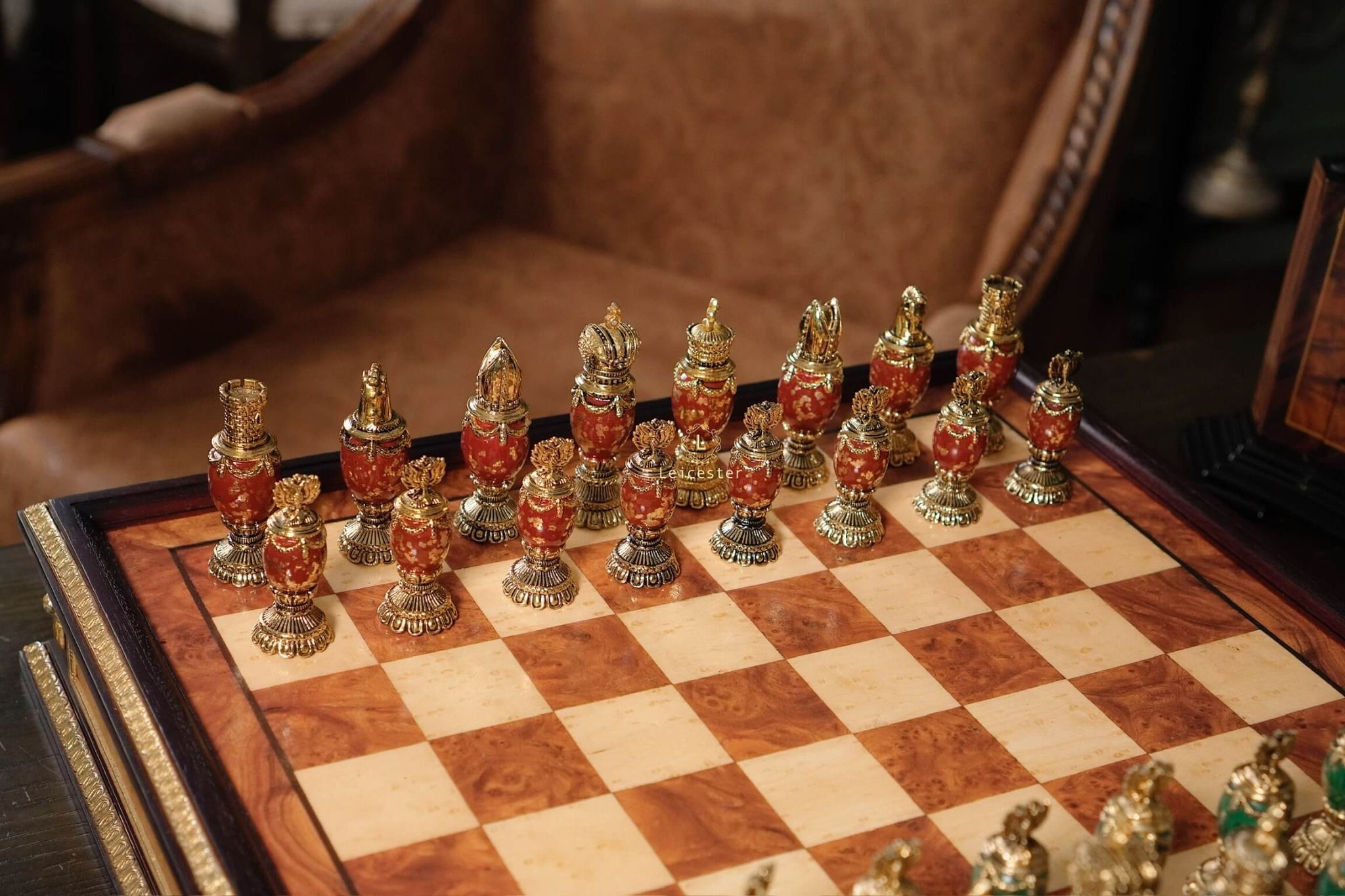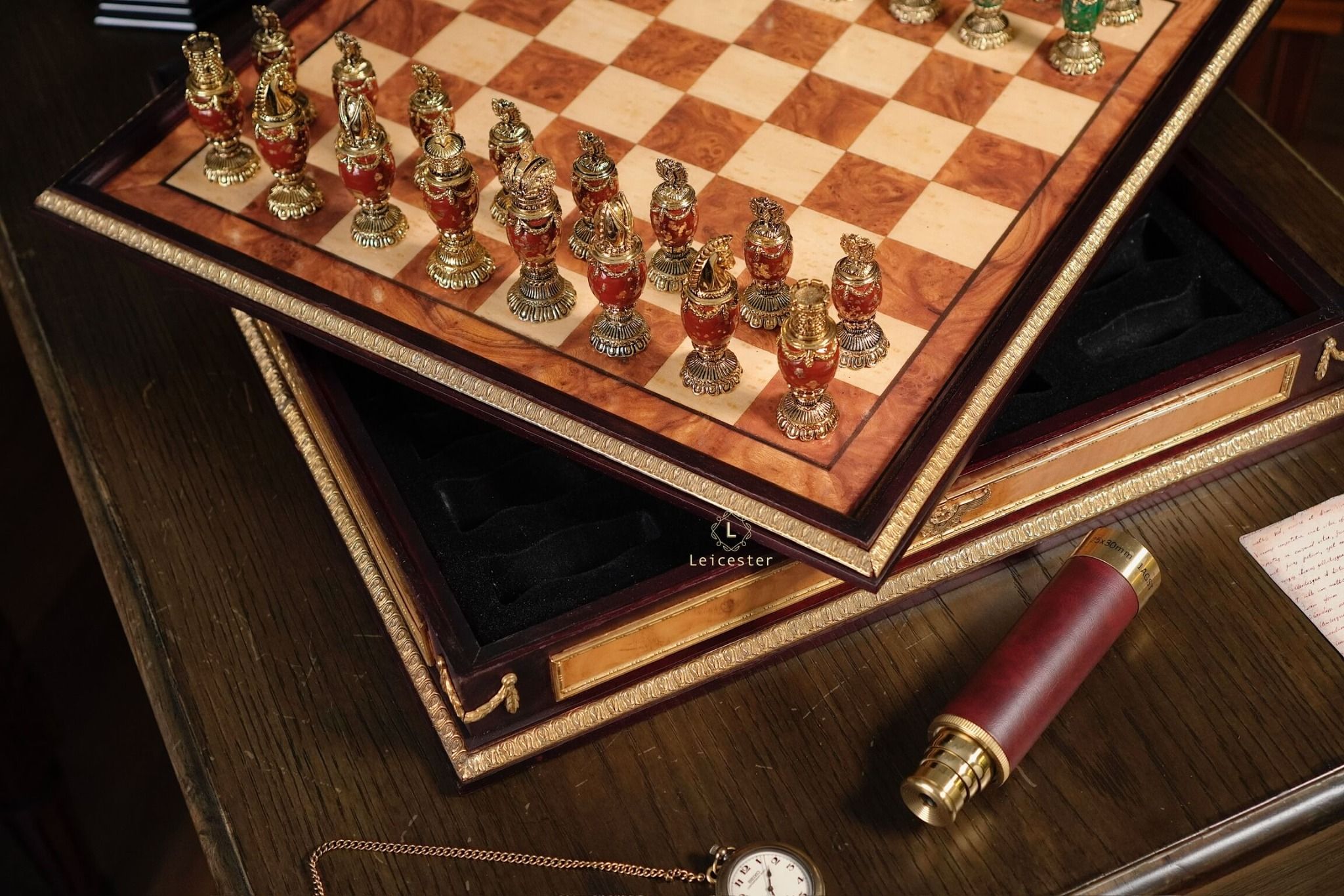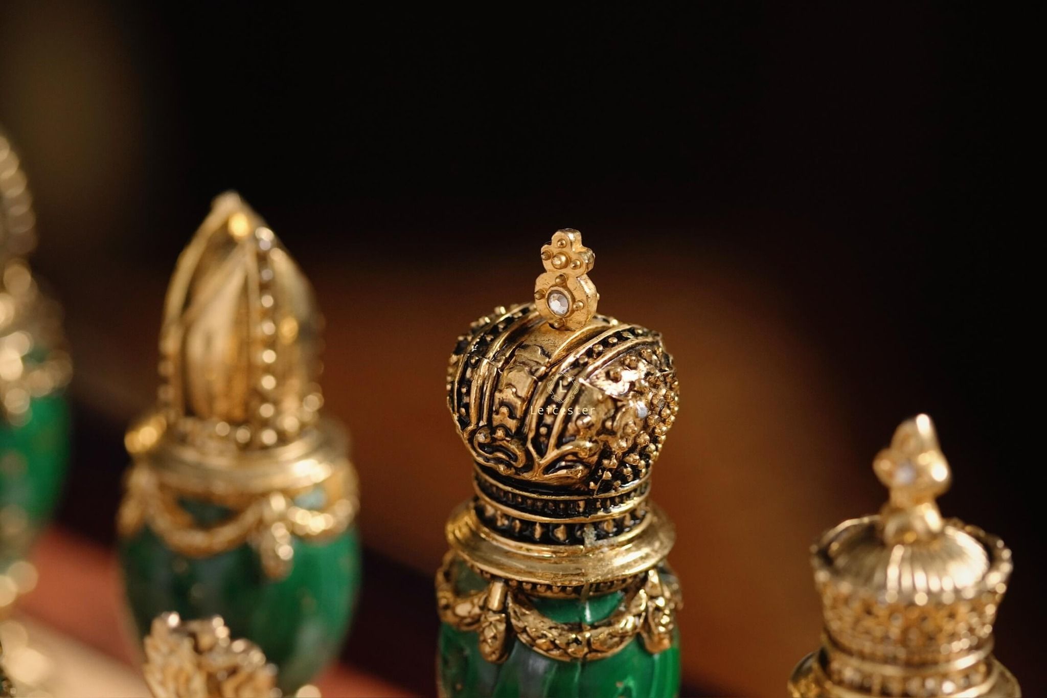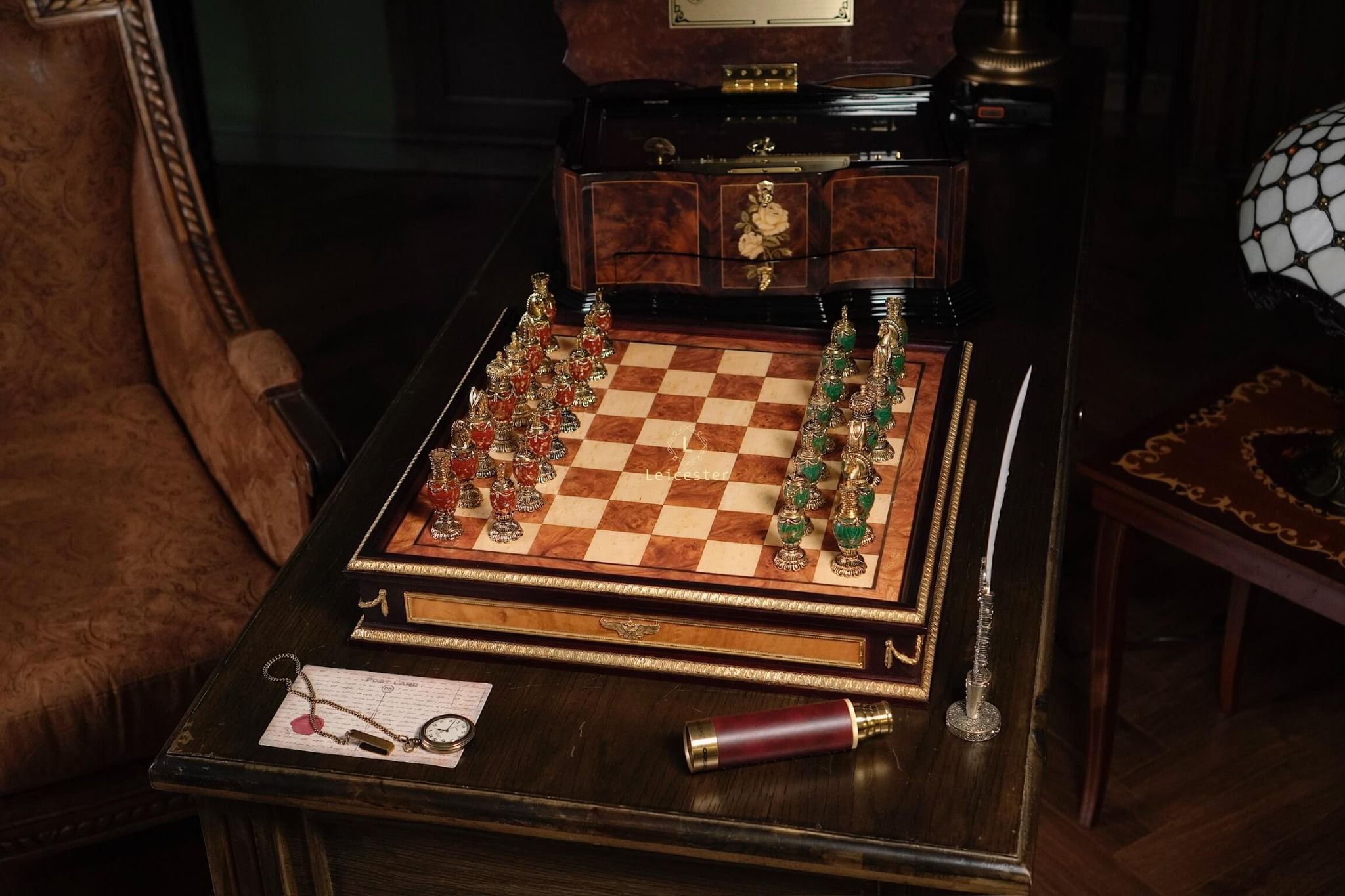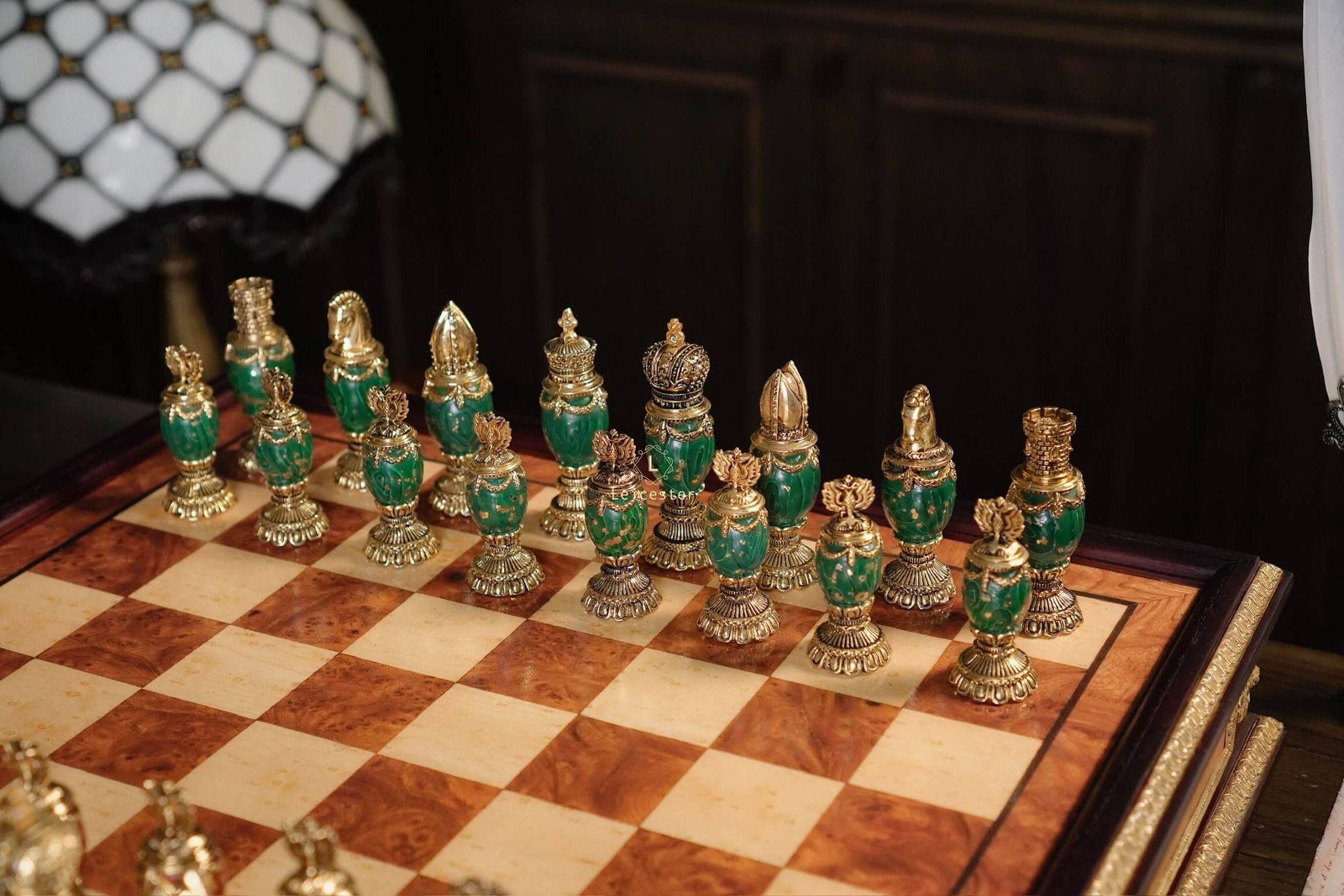 Bộ cờ vua gồm 32 quân, các quân cờ được tráng men bằng màu malachite và đỏ tía. Mỗi quân cờ đi kèm một chiếc mũ đội đầu mạ vàng 24K. Bốn quân cờ Vua và Hậu có đính đá trên đỉnh. Bộ cờ vua như một chiếc rương, bàn cờ được làm bằng gỗ mun cùng những chi tiết mạ vàng.