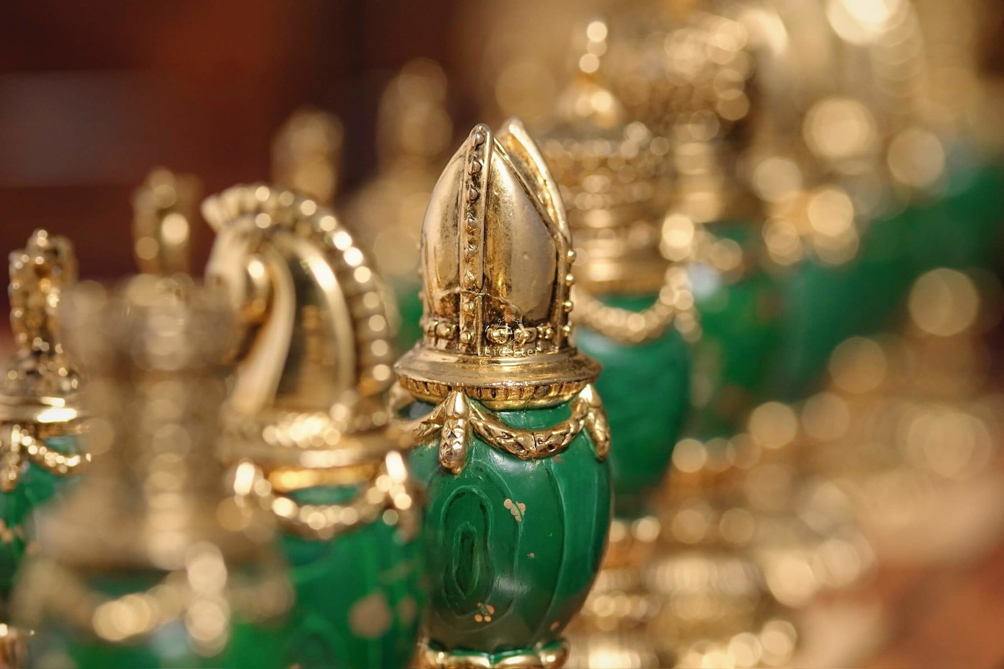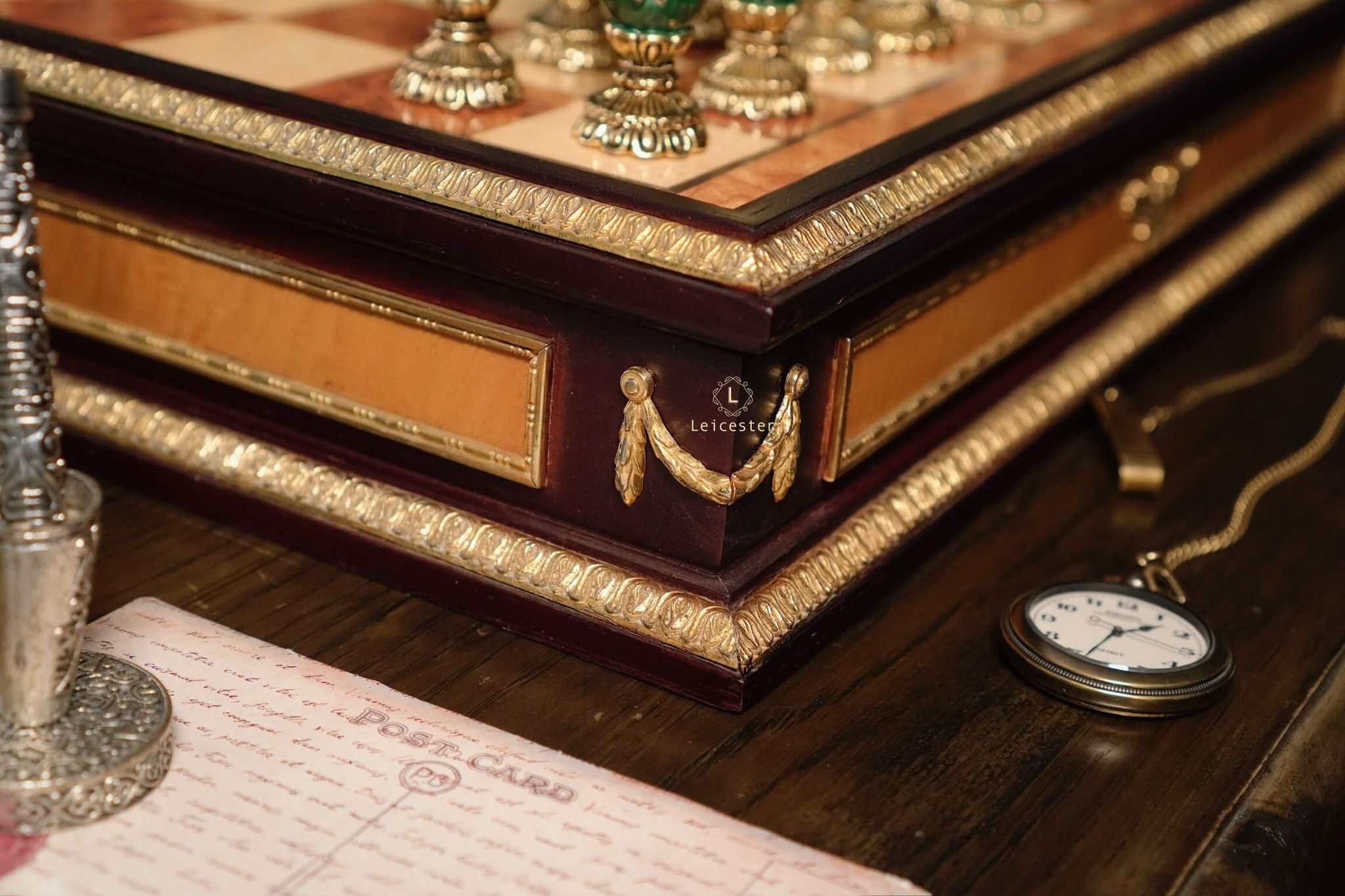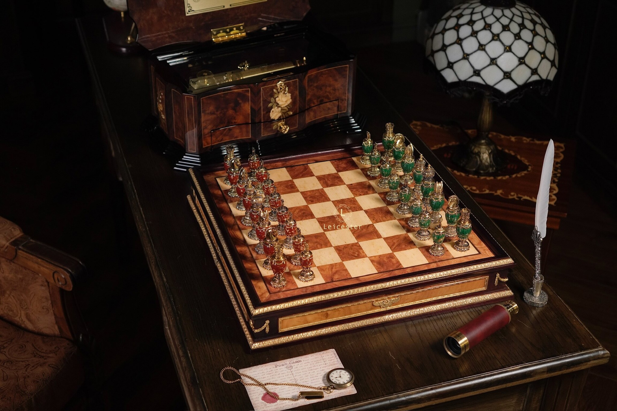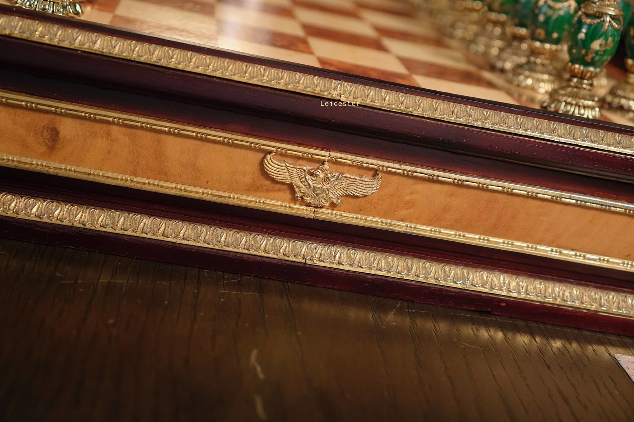 Bộ cờ vua gồm 32 quân, các quân cờ được tráng men bằng màu malachite và đỏ tía. Mỗi quân cờ đi kèm một chiếc mũ đội đầu mạ vàng 24K. Bốn quân cờ Vua và Hậu có đính đá trên đỉnh. Bộ cờ vua như một chiếc rương, bàn cờ được làm bằng gỗ mun cùng những chi tiết mạ vàng.