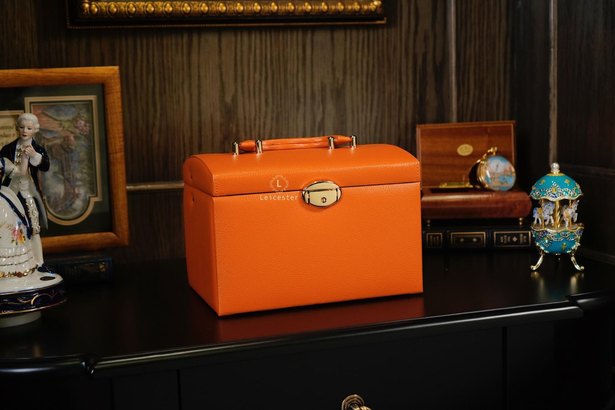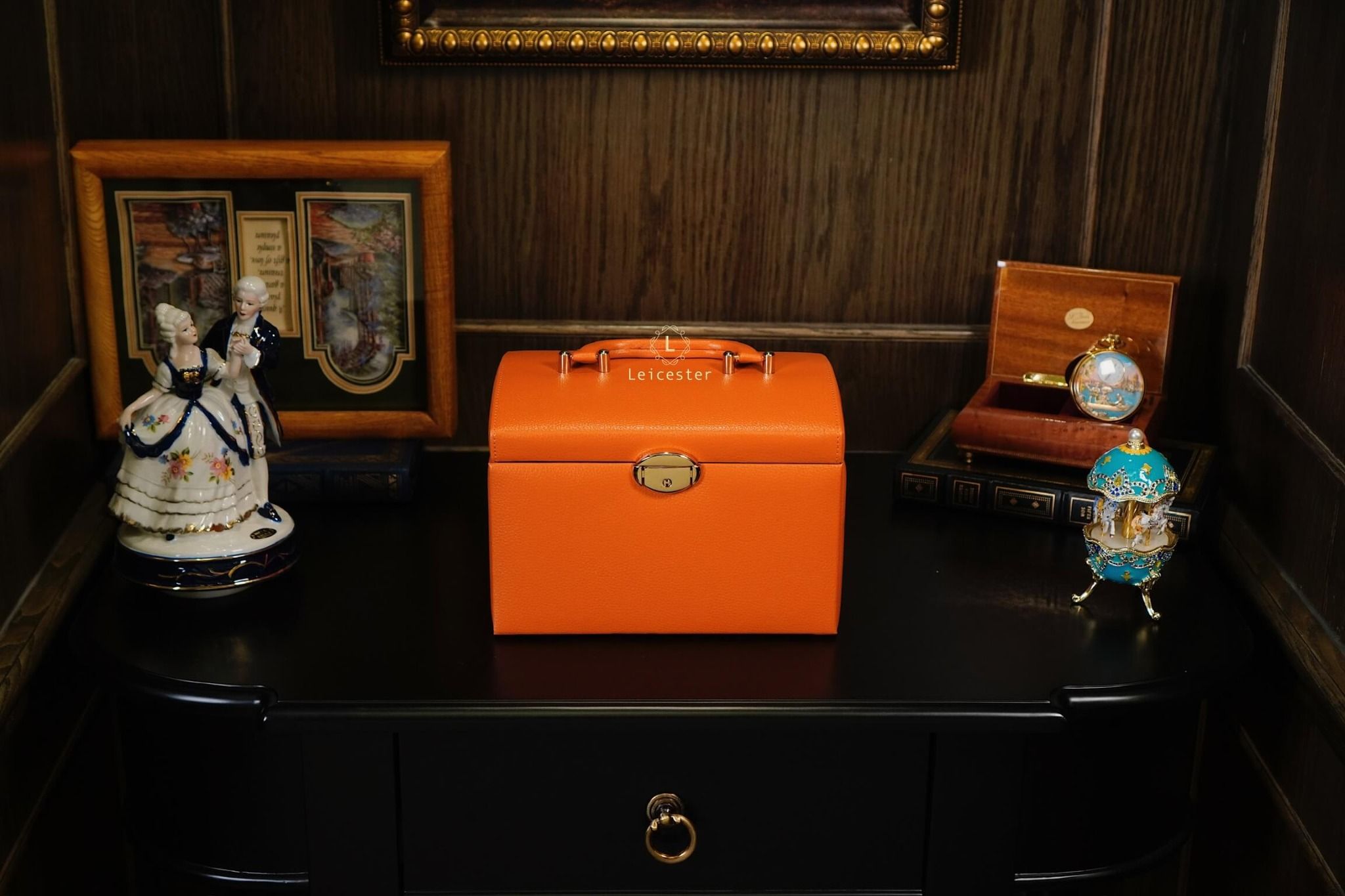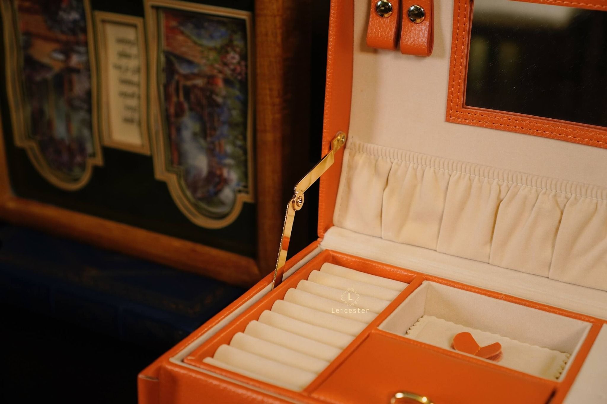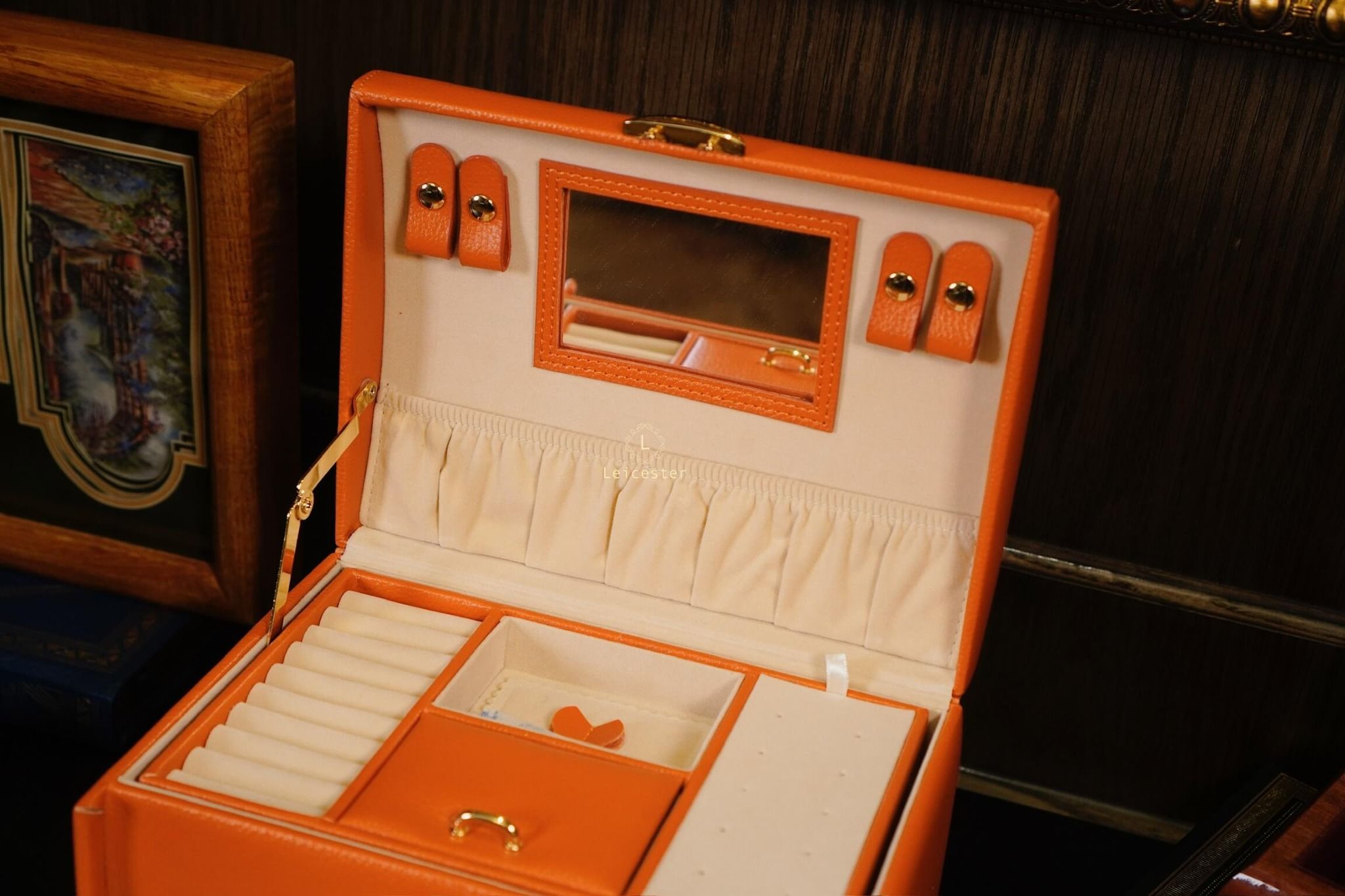 Chiếc hộp trang sức được chế tác với phom dáng vòm tinh tế, bọc da màu cam nổi bật, tạo điểm nhấn cá tính nhưng vẫn thanh lịch. Chi tiết tay cầm và khóa gài kim loại mạ vàng mang nét cổ điển sang trọng. Bên trong chiếc hộp được lót nhung màu kem trang nhã, không gian lưu trữ được thiết kế tinh gọn nhưng đa năng với gương soi, móc treo bông tai, khe cắm nhẫn, hộp nhỏ có nắp và các ngăn kéo trượt – tất cả đều được bố trí khoa học, tạo nên một tổng thể vừa sang trọng vừa lý tưởng để cất giữ những món trang sức quý giá một cách chỉn chu và đầy phong cách.