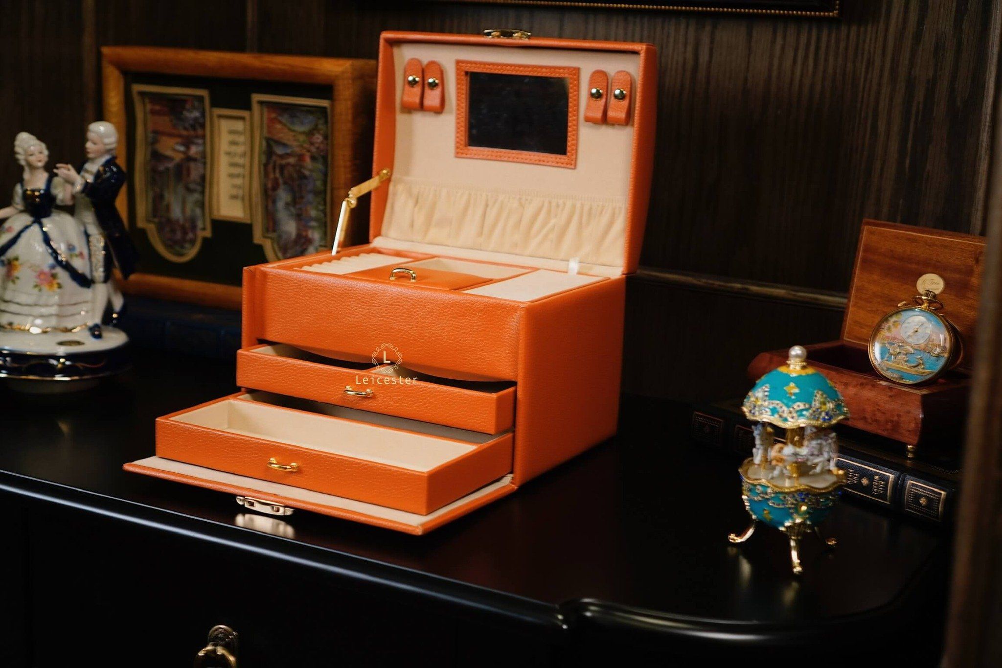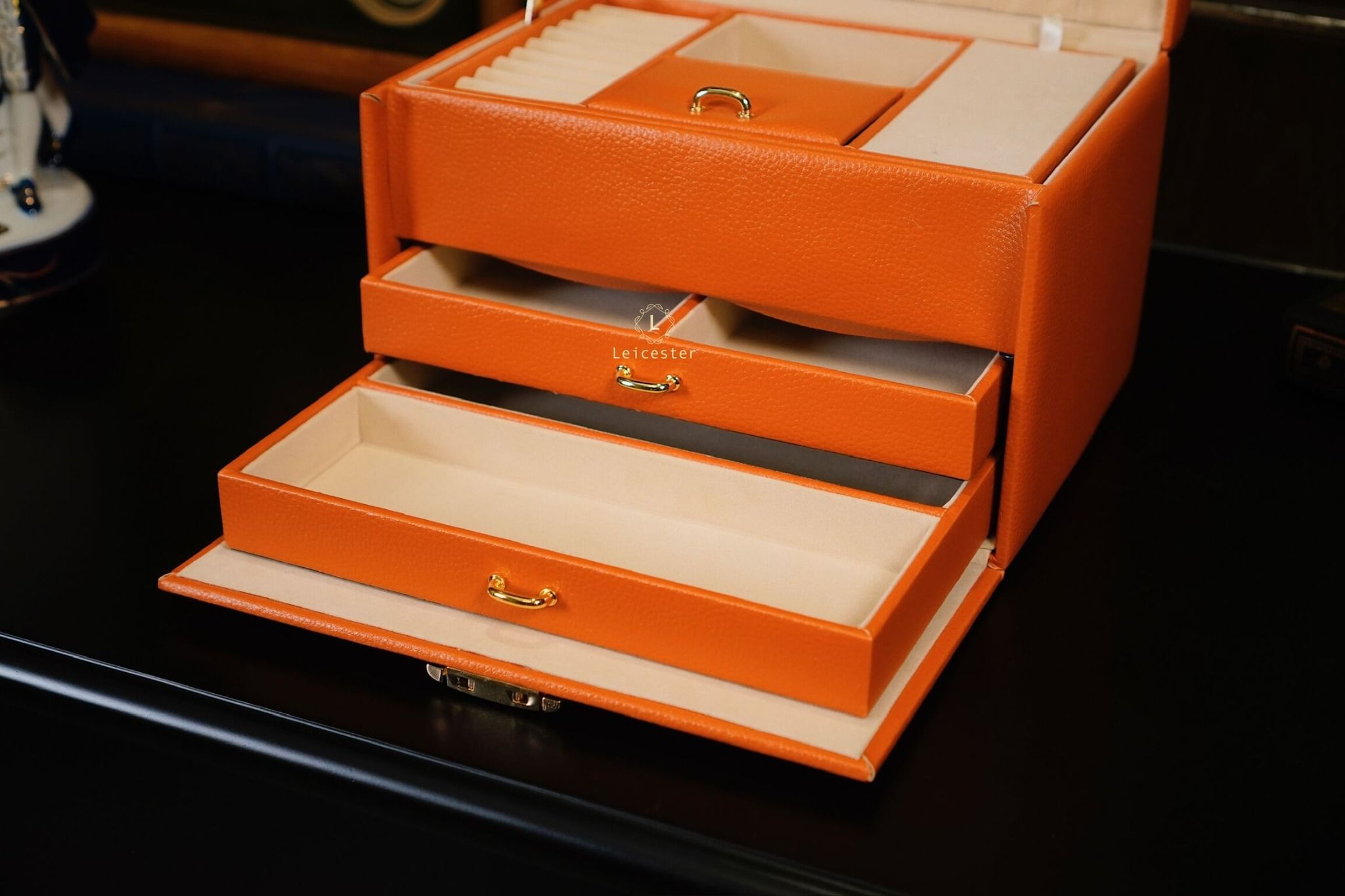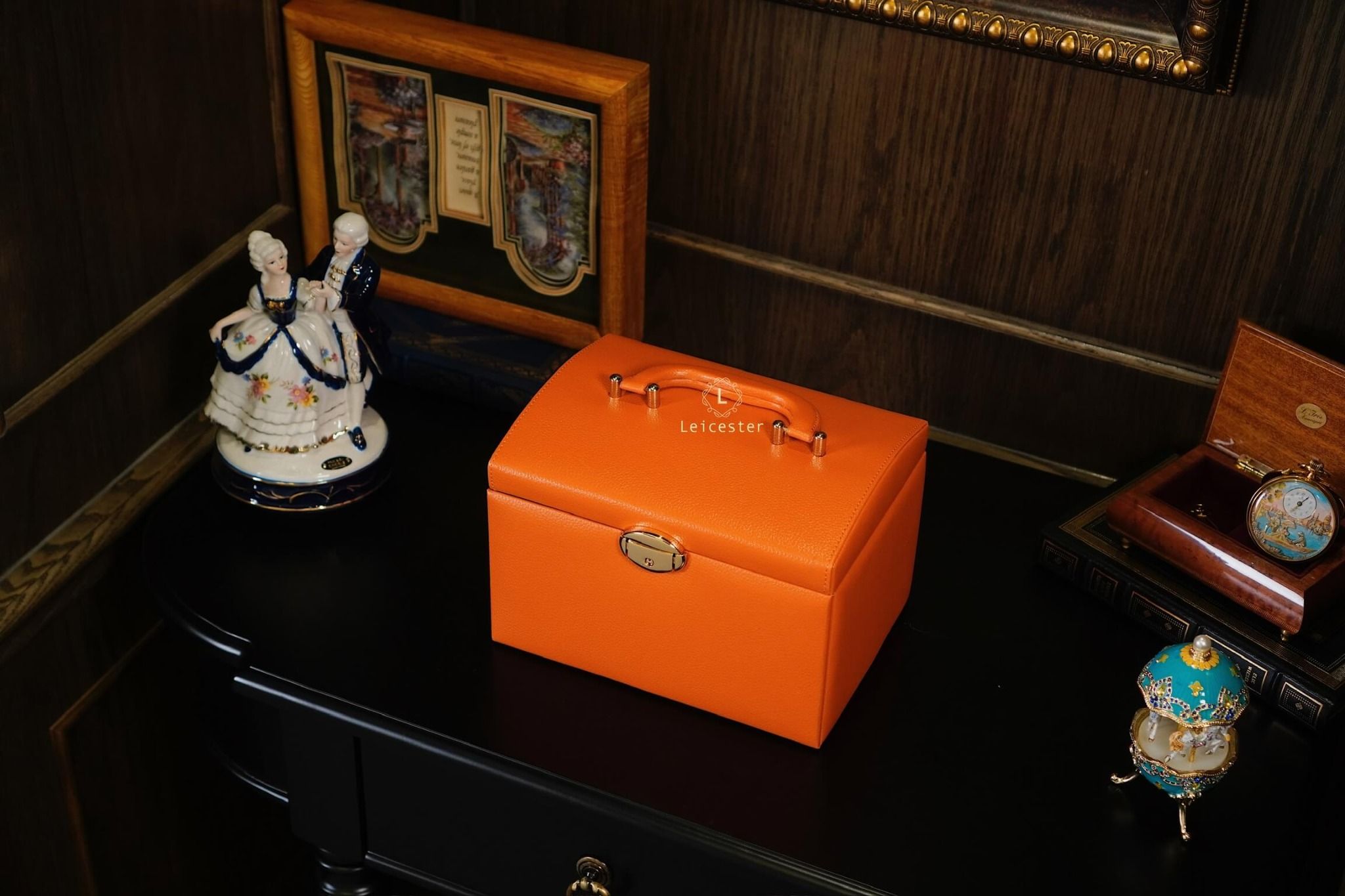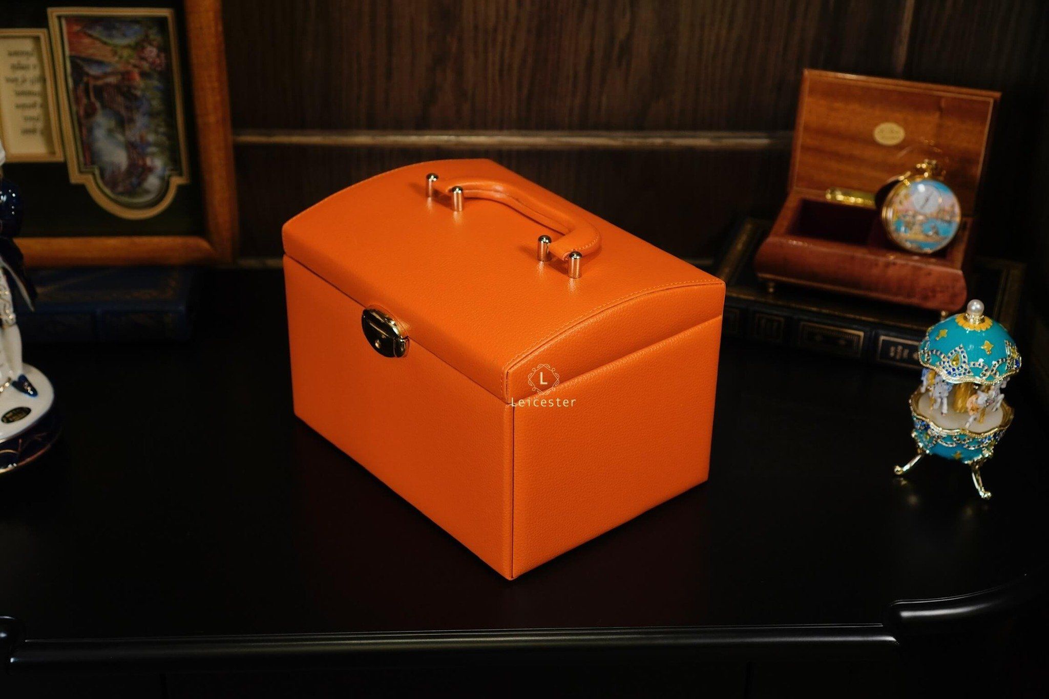 Chiếc hộp trang sức được chế tác với phom dáng vòm tinh tế, bọc da màu cam nổi bật, tạo điểm nhấn cá tính nhưng vẫn thanh lịch. Chi tiết tay cầm và khóa gài kim loại mạ vàng mang nét cổ điển sang trọng. Bên trong chiếc hộp được lót nhung màu kem trang nhã, không gian lưu trữ được thiết kế tinh gọn nhưng đa năng với gương soi, móc treo bông tai, khe cắm nhẫn, hộp nhỏ có nắp và các ngăn kéo trượt – tất cả đều được bố trí khoa học, tạo nên một tổng thể vừa sang trọng vừa lý tưởng để cất giữ những món trang sức quý giá một cách chỉn chu và đầy phong cách.