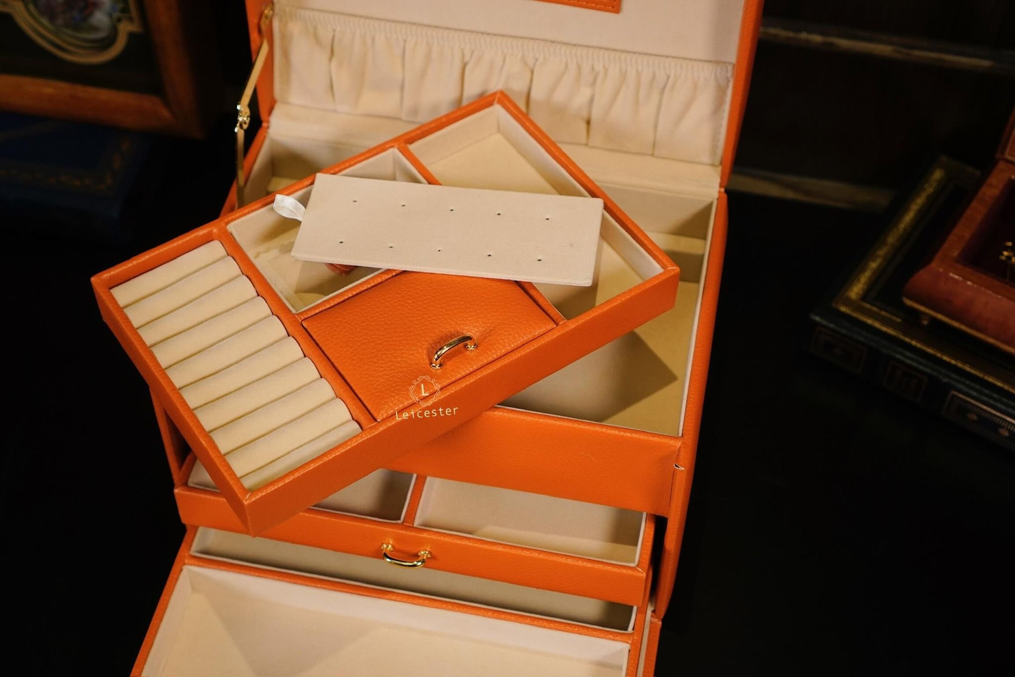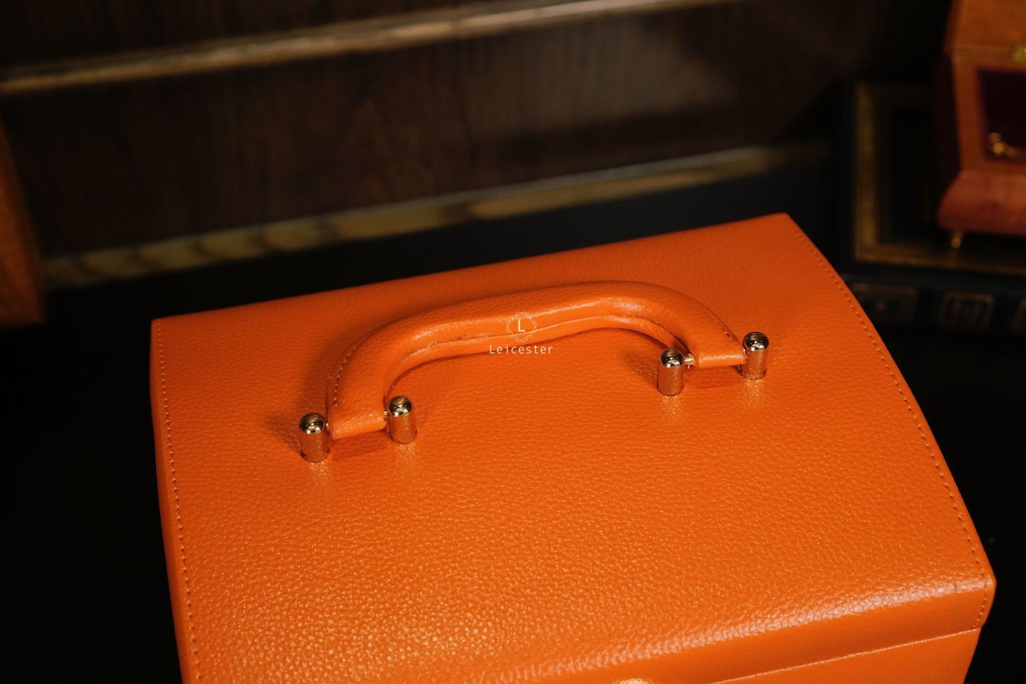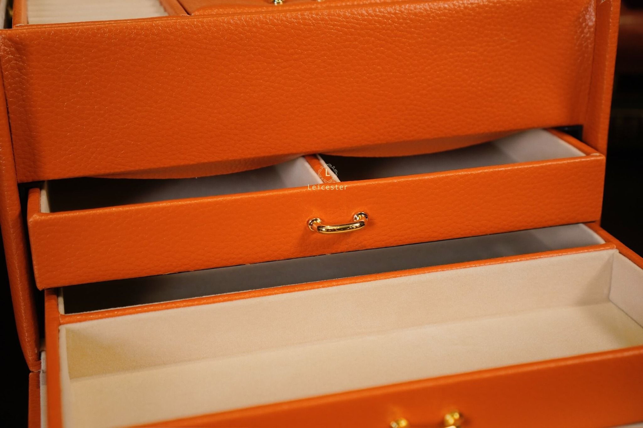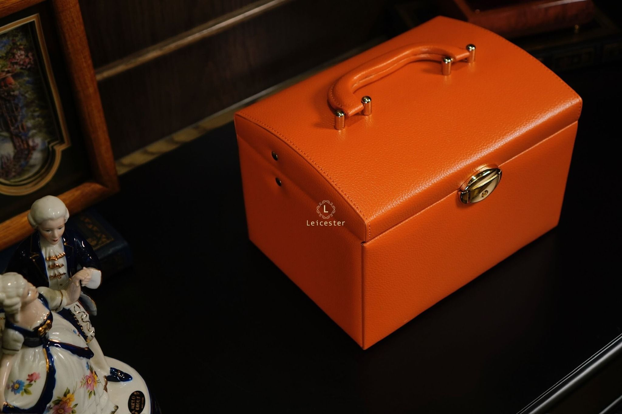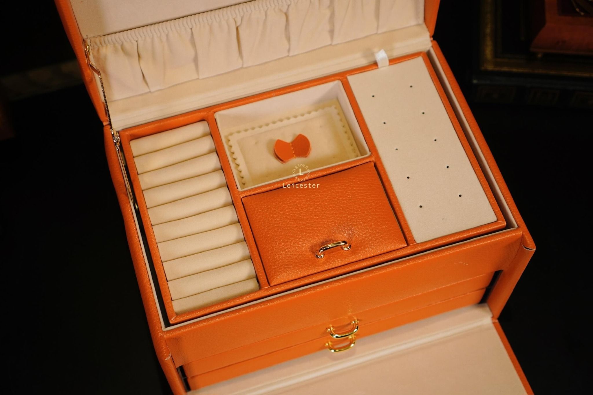 Chiếc hộp trang sức được chế tác với phom dáng vòm tinh tế, bọc da màu cam nổi bật, tạo điểm nhấn cá tính nhưng vẫn thanh lịch. Chi tiết tay cầm và khóa gài kim loại mạ vàng mang nét cổ điển sang trọng. Bên trong chiếc hộp được lót nhung màu kem trang nhã, không gian lưu trữ được thiết kế tinh gọn nhưng đa năng với gương soi, móc treo bông tai, khe cắm nhẫn, hộp nhỏ có nắp và các ngăn kéo trượt – tất cả đều được bố trí khoa học, tạo nên một tổng thể vừa sang trọng vừa lý tưởng để cất giữ những món trang sức quý giá một cách chỉn chu và đầy phong cách.