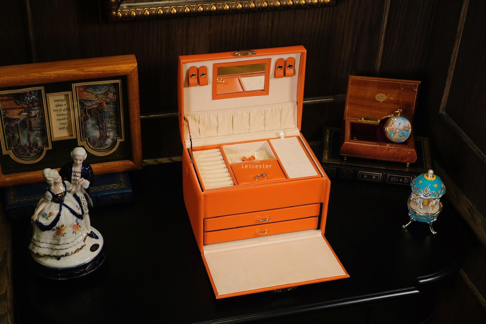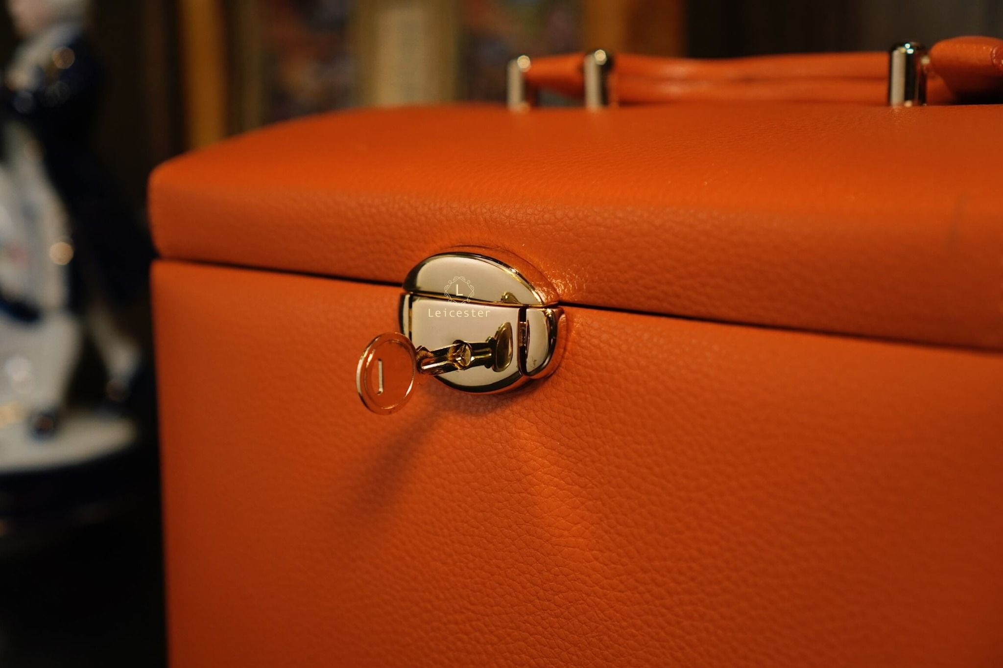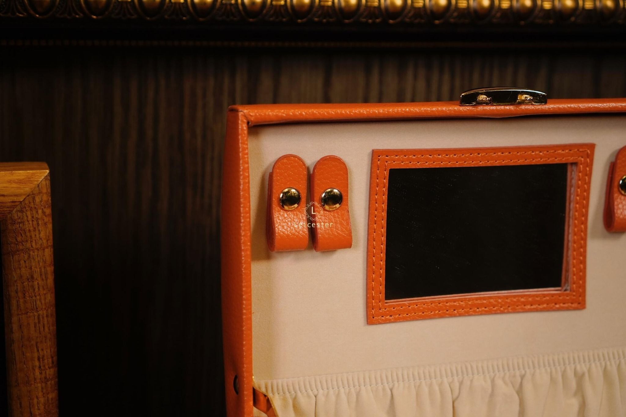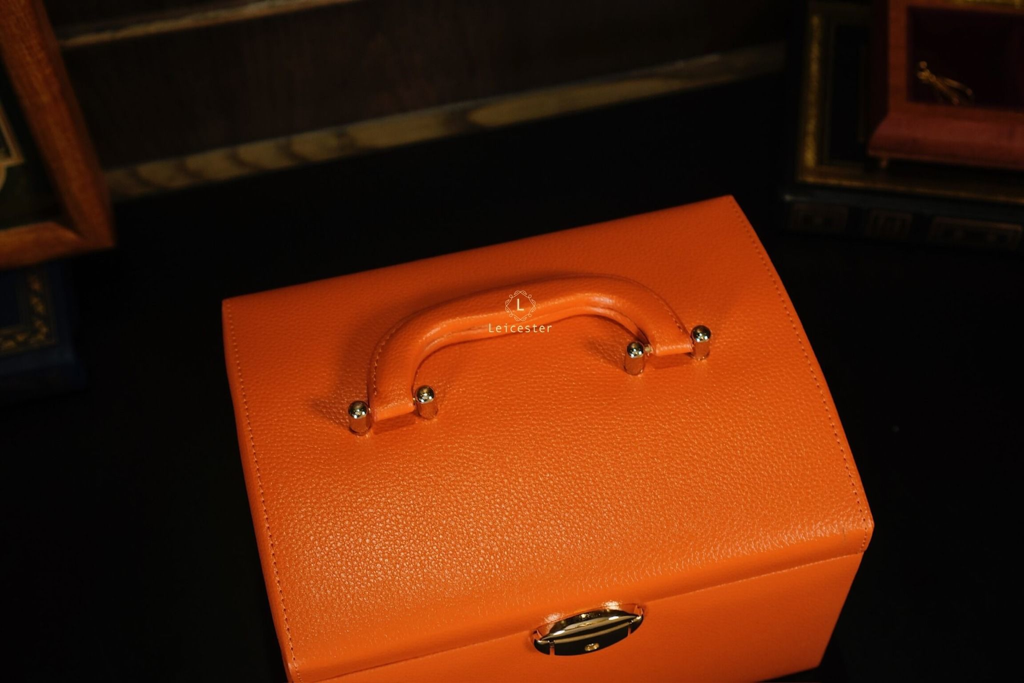 Chiếc hộp trang sức được chế tác với phom dáng vòm tinh tế, bọc da màu cam nổi bật, tạo điểm nhấn cá tính nhưng vẫn thanh lịch. Chi tiết tay cầm và khóa gài kim loại mạ vàng mang nét cổ điển sang trọng. Bên trong chiếc hộp được lót nhung màu kem trang nhã, không gian lưu trữ được thiết kế tinh gọn nhưng đa năng với gương soi, móc treo bông tai, khe cắm nhẫn, hộp nhỏ có nắp và các ngăn kéo trượt – tất cả đều được bố trí khoa học, tạo nên một tổng thể vừa sang trọng vừa lý tưởng để cất giữ những món trang sức quý giá một cách chỉn chu và đầy phong cách.