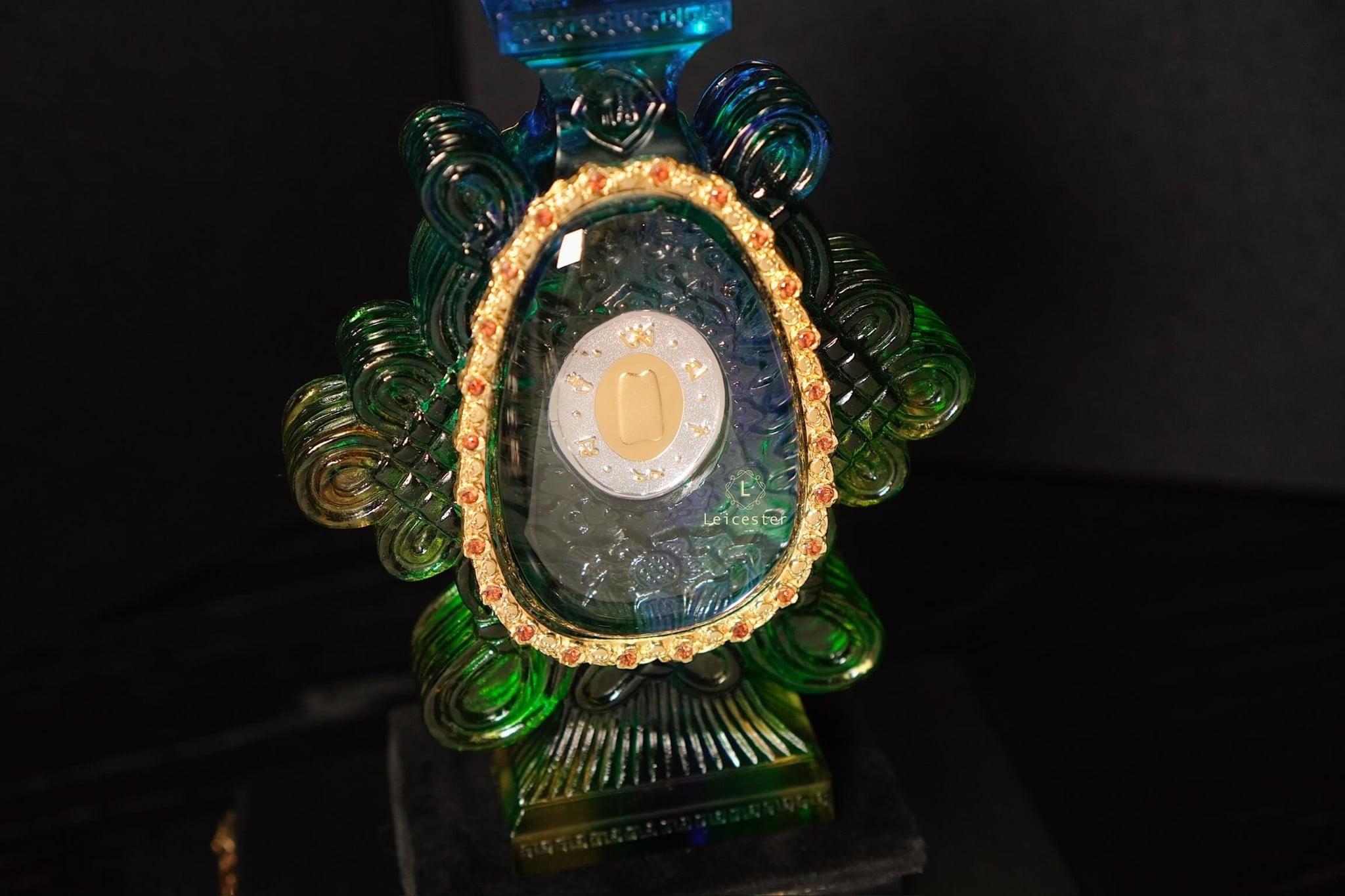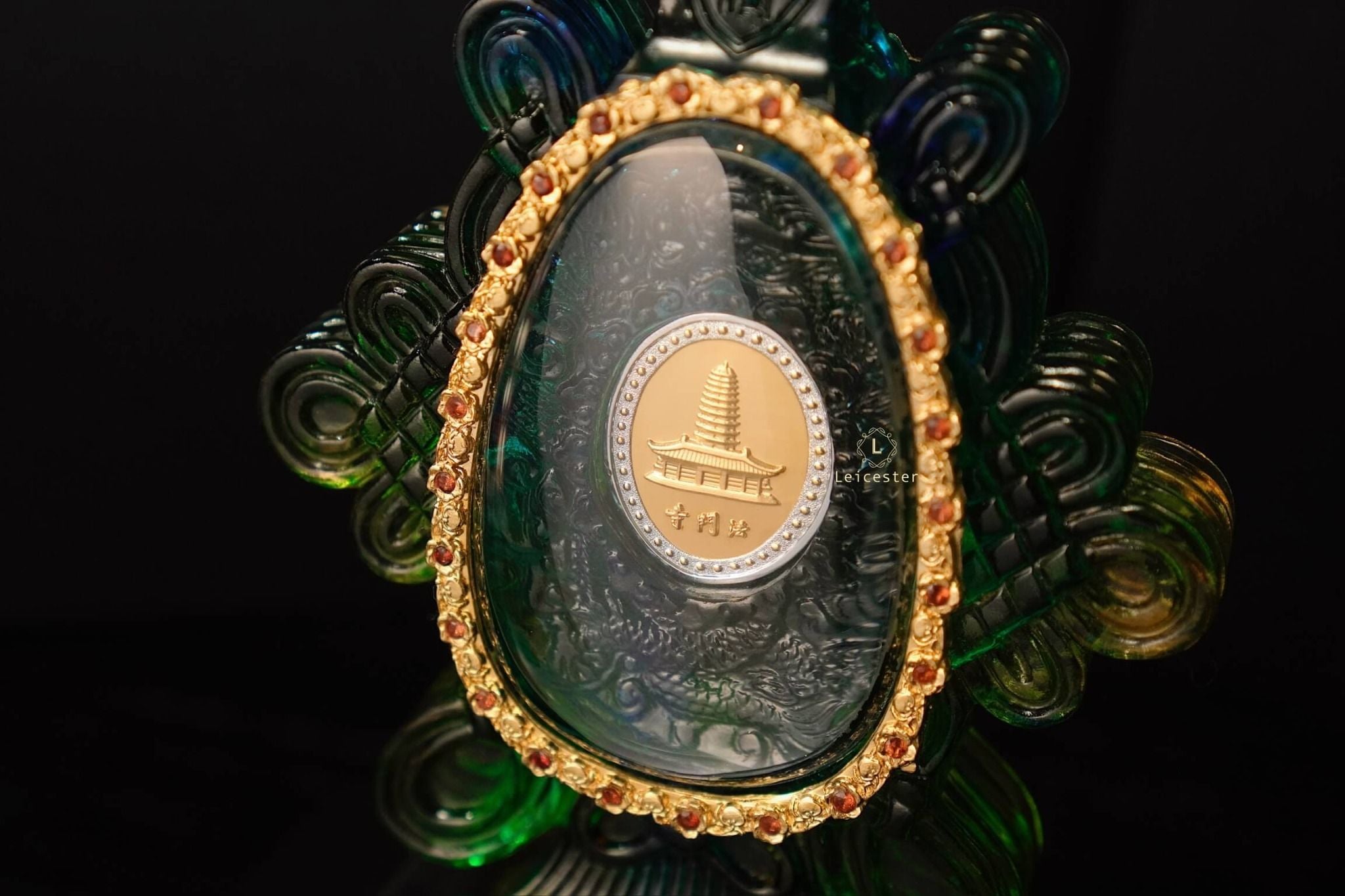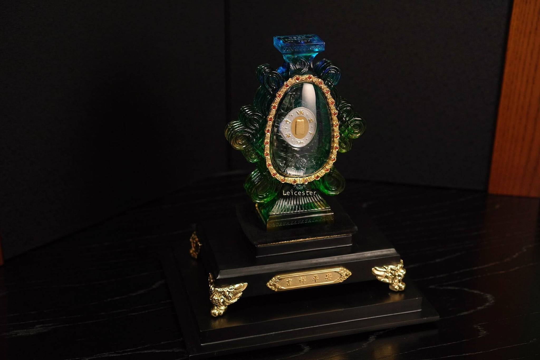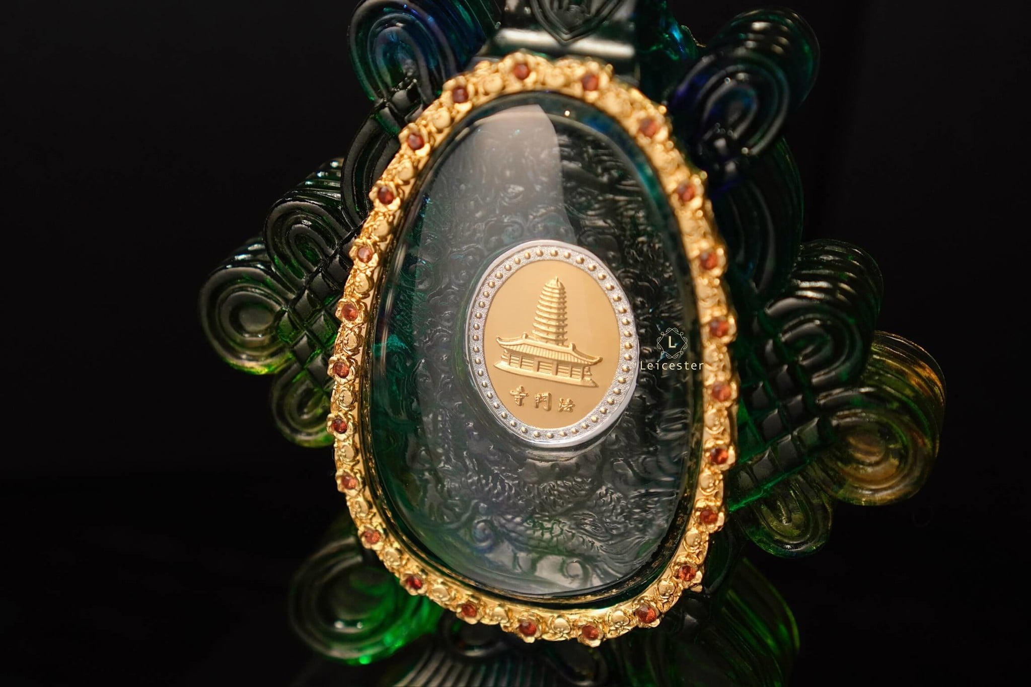 Những bông mẫu đơn lá vàng cùng nấm linh chi được xếp xung quanh bên ngoài chiếc bình pha lê, bên trên có đính 48 viên đá quý tự nhiên màu đỏ. Bên trong chiếc bình pha lê được chạm khắc những bông hoa sen linh thiêng của Phật giáo, ở giữa là hai đồng bạc được bao quanh bởi Như Ý tráng men, một bên đồng bạc có khảm câu thần chú sáu chữ cái của thời nhà Minh là “Om, Ma, Ni, Ba, Mi, Hum’’ xung quanh, một bên được dát lên hình dáng của ngôi chùa Phật pháp ngàn năm tuổi bằng vàng ròng - nơi lưu giữ ‘’xá lợi thân của Đức Phật Thích Ca Mâu Ni’’.