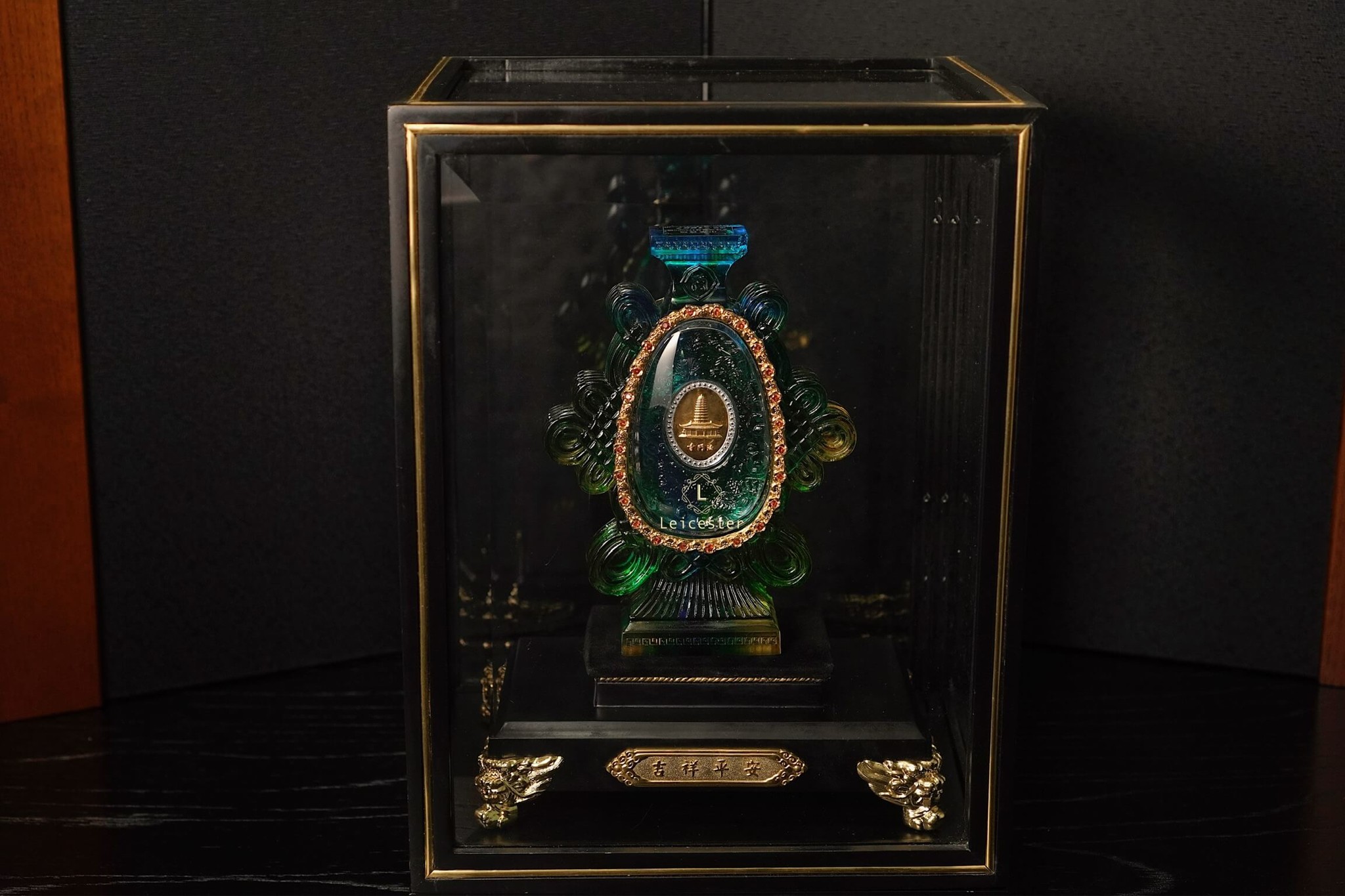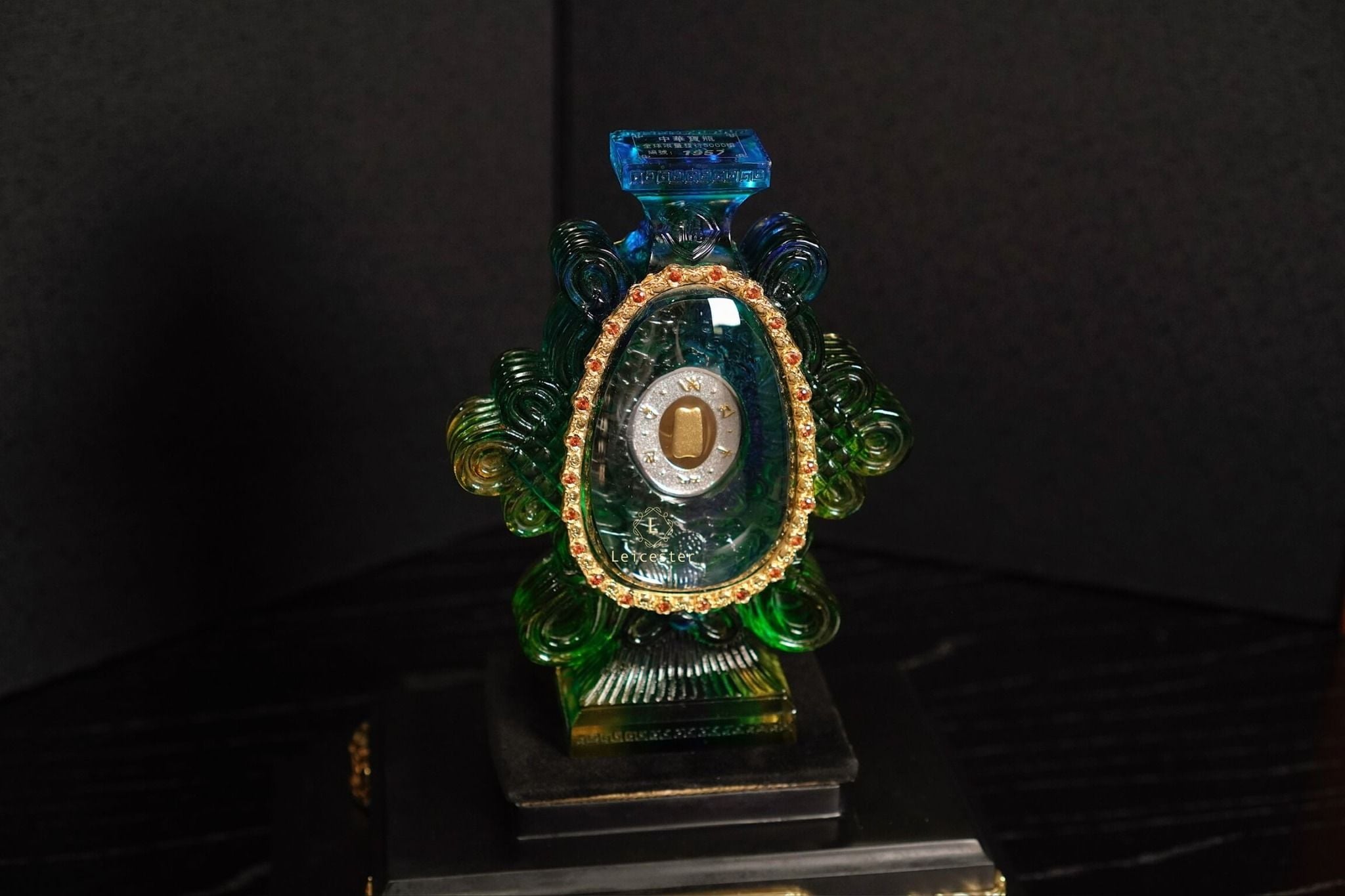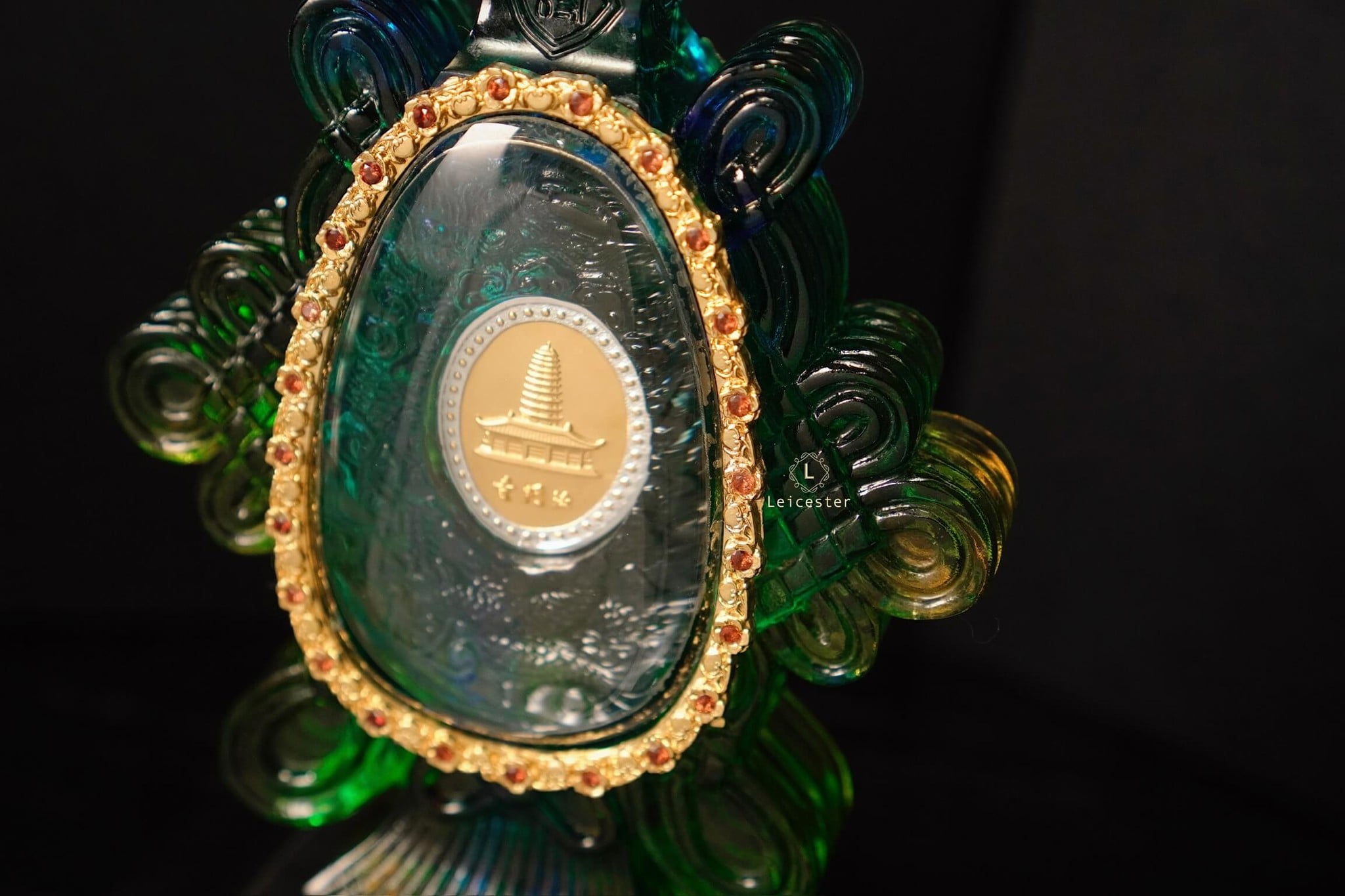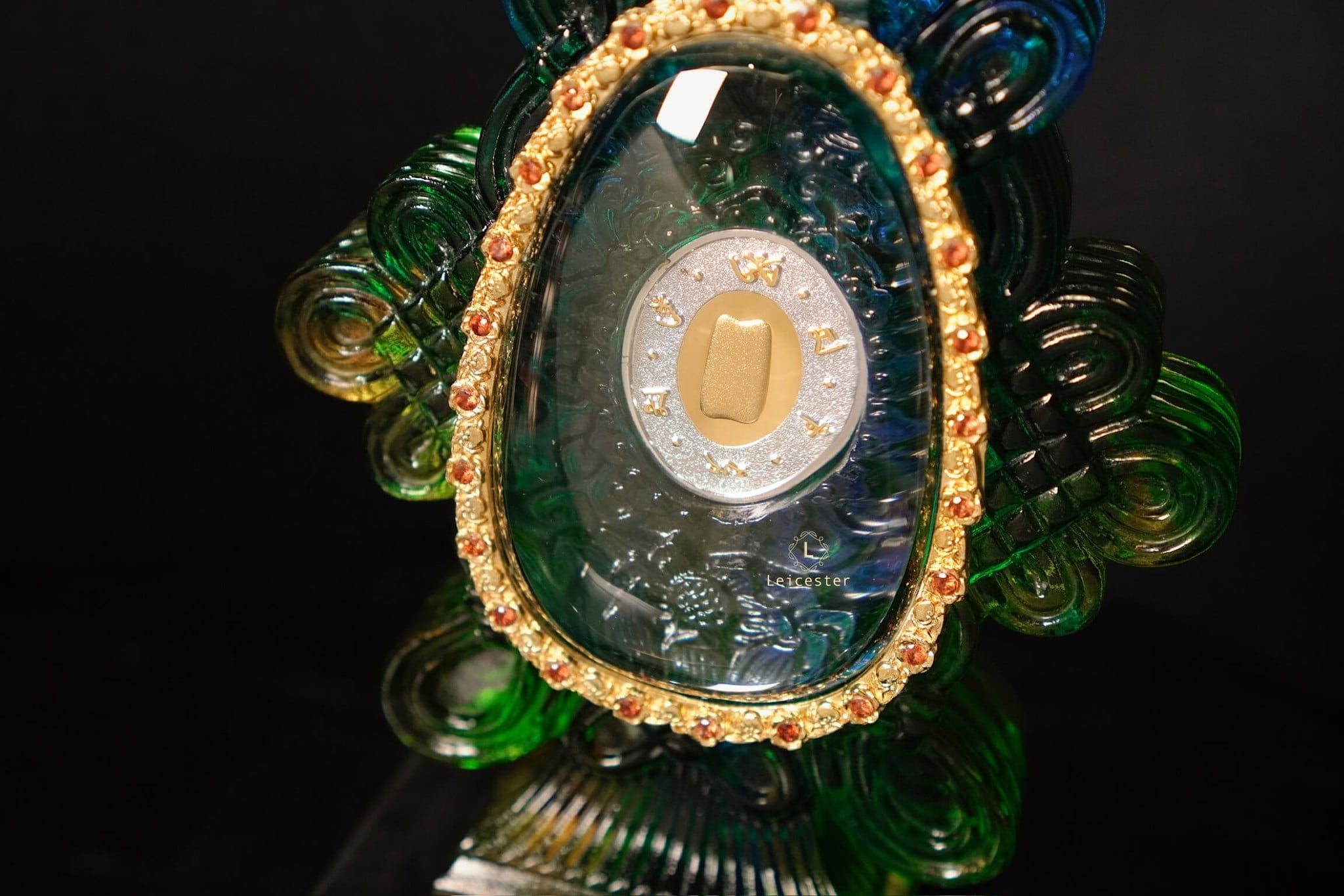 Những bông mẫu đơn lá vàng cùng nấm linh chi được xếp xung quanh bên ngoài chiếc bình pha lê, bên trên có đính 48 viên đá quý tự nhiên màu đỏ. Bên trong chiếc bình pha lê được chạm khắc những bông hoa sen linh thiêng của Phật giáo, ở giữa là hai đồng bạc được bao quanh bởi Như Ý tráng men, một bên đồng bạc có khảm câu thần chú sáu chữ cái của thời nhà Minh là “Om, Ma, Ni, Ba, Mi, Hum’’ xung quanh, một bên được dát lên hình dáng của ngôi chùa Phật pháp ngàn năm tuổi bằng vàng ròng - nơi lưu giữ ‘’xá lợi thân của Đức Phật Thích Ca Mâu Ni’’.