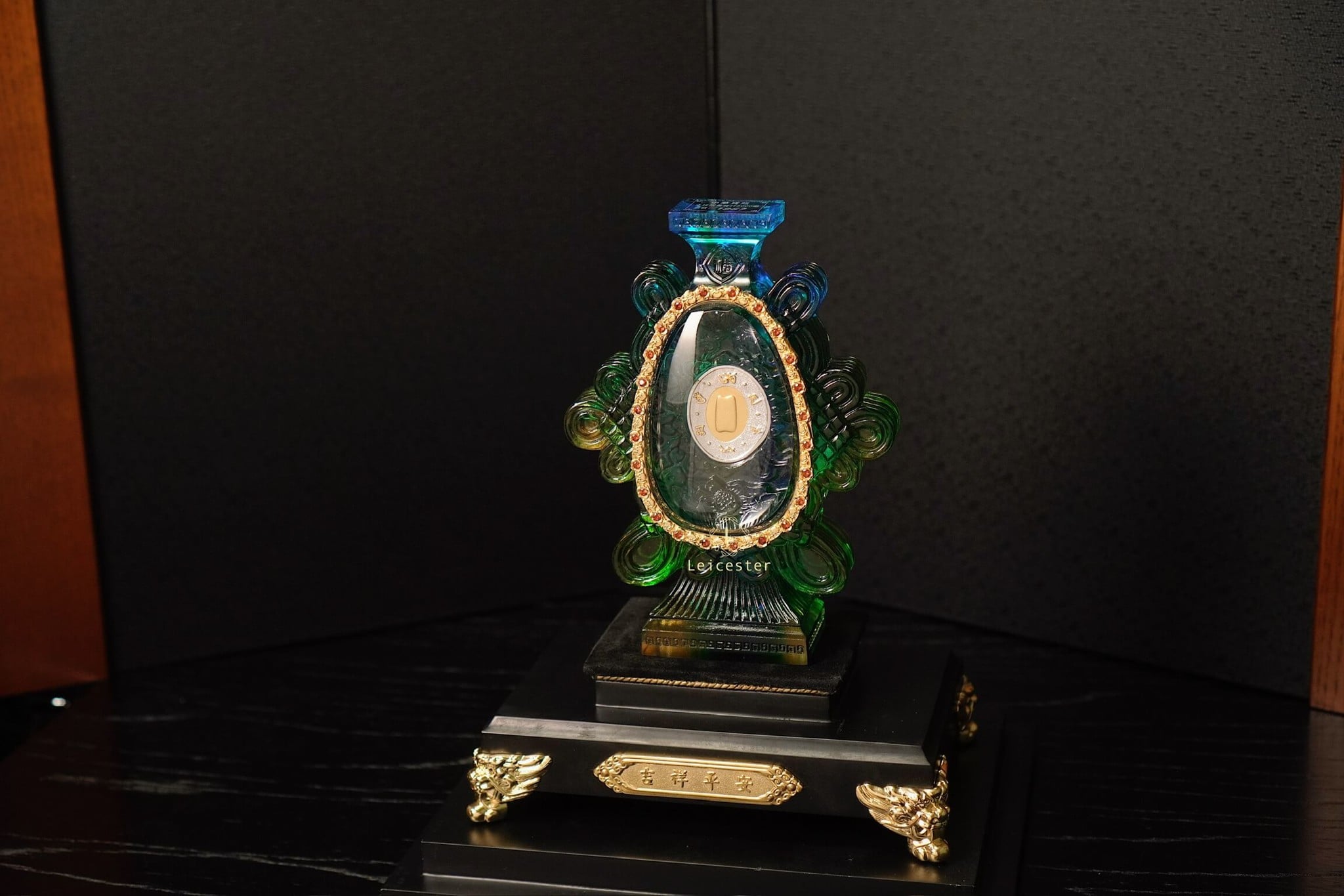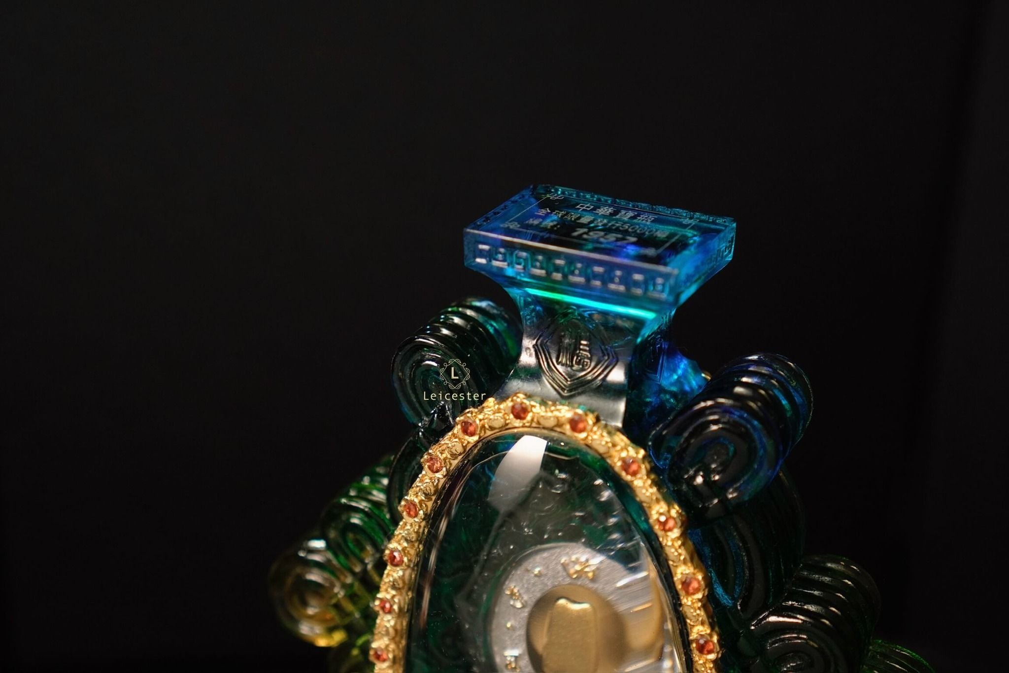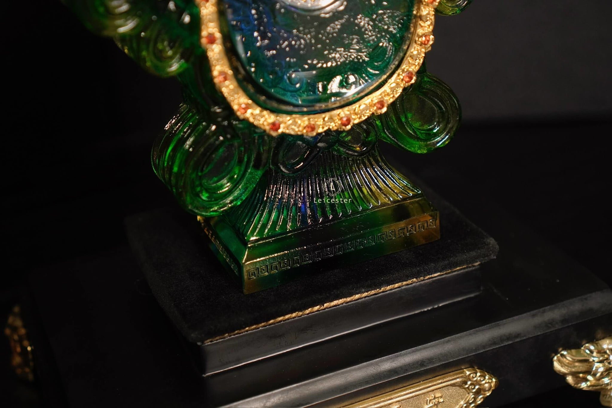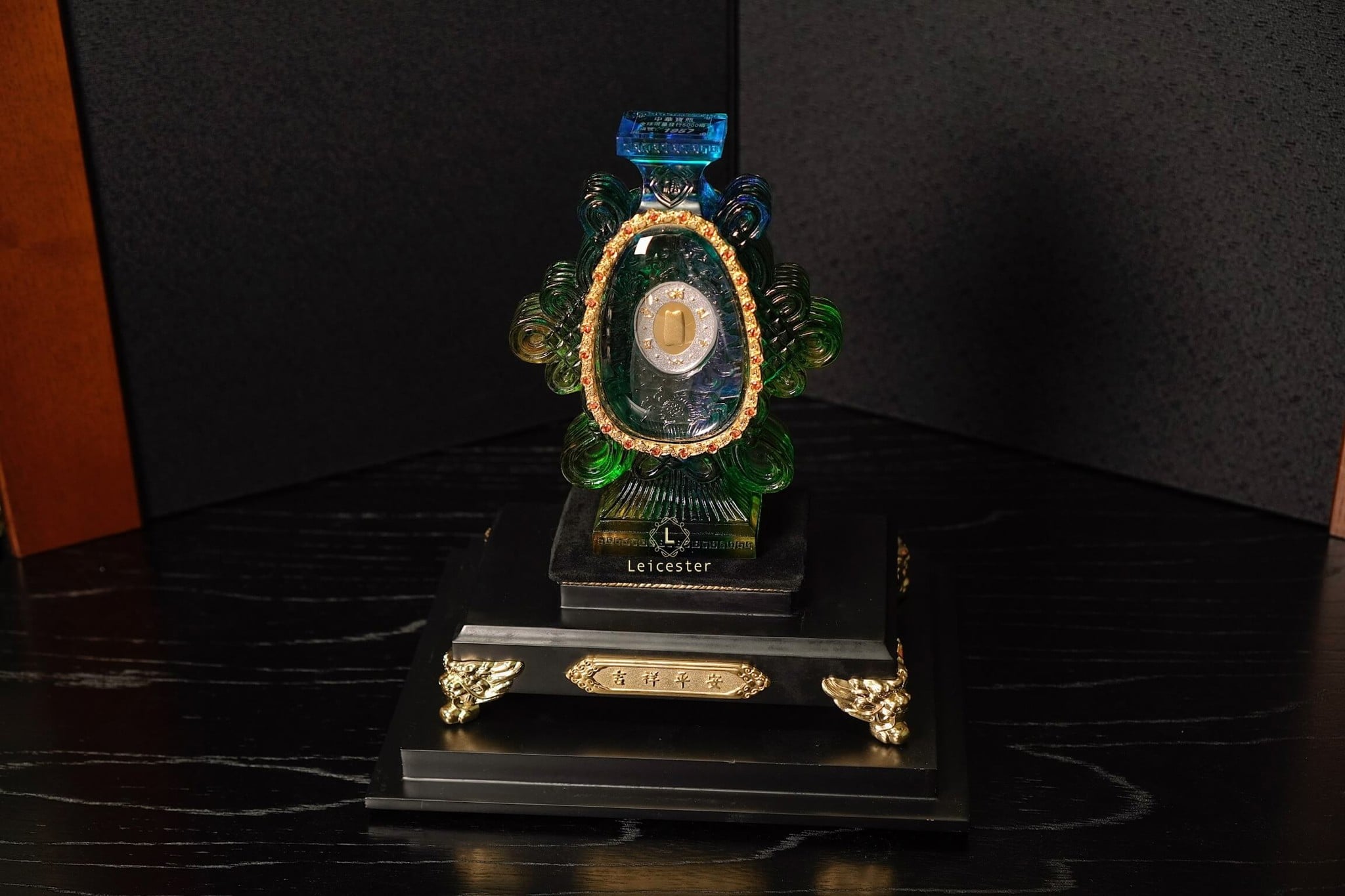 Những bông mẫu đơn lá vàng cùng nấm linh chi được xếp xung quanh bên ngoài chiếc bình pha lê, bên trên có đính 48 viên đá quý tự nhiên màu đỏ. Bên trong chiếc bình pha lê được chạm khắc những bông hoa sen linh thiêng của Phật giáo, ở giữa là hai đồng bạc được bao quanh bởi Như Ý tráng men, một bên đồng bạc có khảm câu thần chú sáu chữ cái của thời nhà Minh là “Om, Ma, Ni, Ba, Mi, Hum’’ xung quanh, một bên được dát lên hình dáng của ngôi chùa Phật pháp ngàn năm tuổi bằng vàng ròng - nơi lưu giữ ‘’xá lợi thân của Đức Phật Thích Ca Mâu Ni’’.