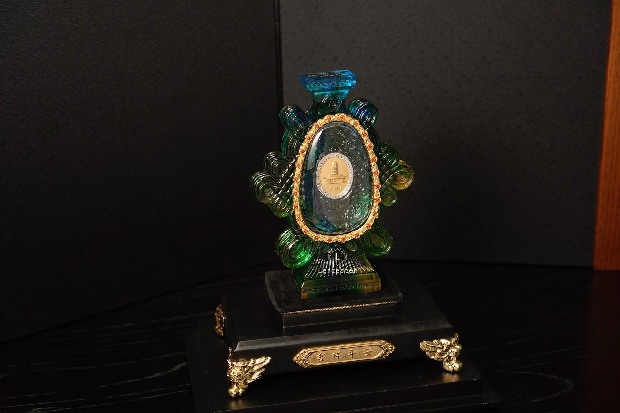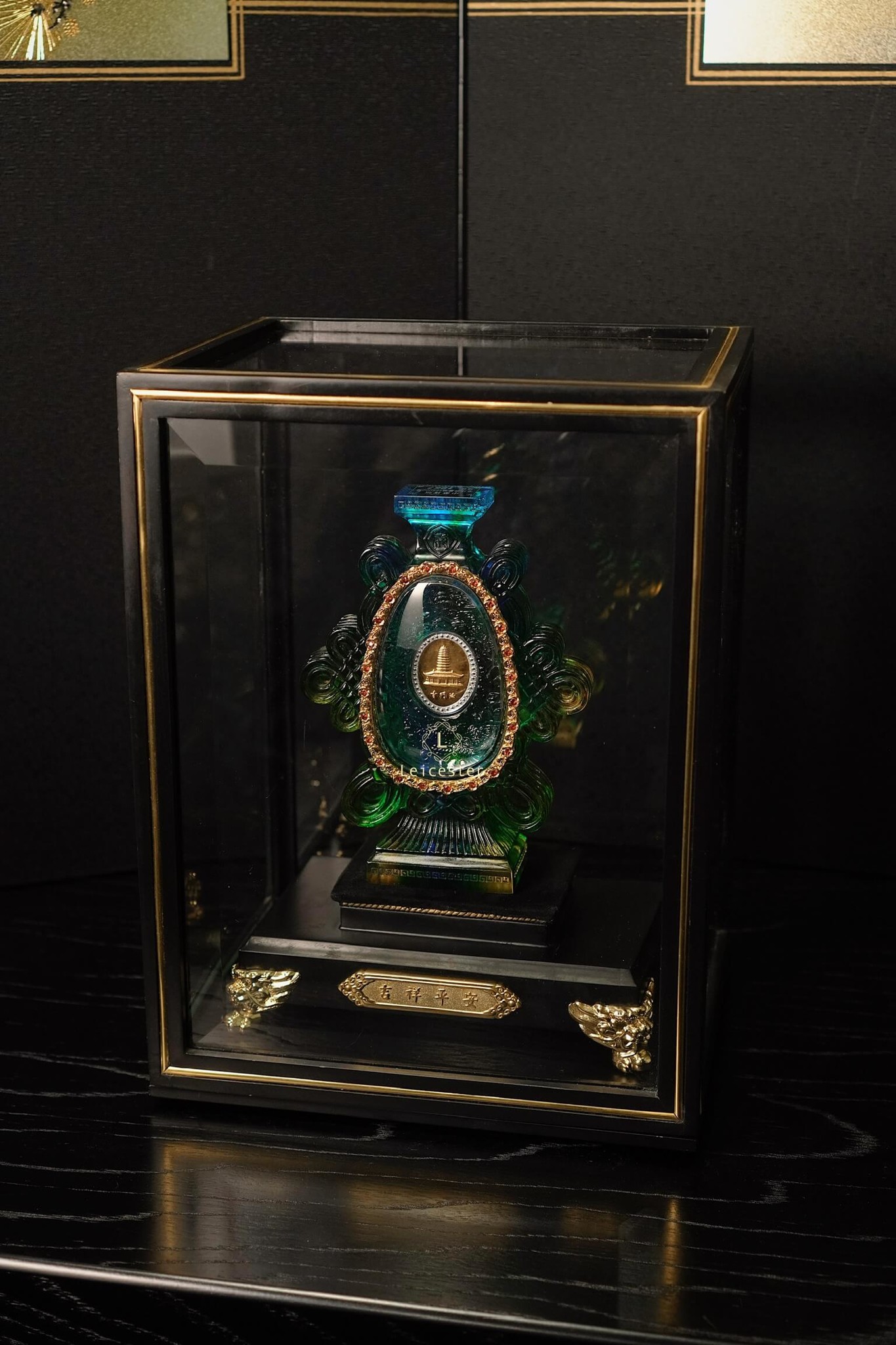 Lazuli Treasure Bottle hay còn được biết đến là bảo bình của một ngôi chùa gần 2000 năm tuổi ở Trung Quốc. Cốt bình được làm bằng chất đá lưu ly ngũ sắc với thiết kế bên trong là chiếc lọ cam lộ của Quan Thế Âm Bồ Tát, ở hai mặt trung tâm của chiếc bình lần lượt là hình ảnh Pháp Môn Tự, được cho là cất giữ xá lợi ngón tay của Phật và hàng nghìn văn vật quí giá tôn trí dưới lòng địa cung của Bảo tháp chùa Pháp Môn. Mặt còn lại là cổ bình vuông vức được khắc bốn chữ chúc phúc ở bốn góc là “May mắn” và “Trường Thọ”. Cả hai mặt của chiếc bình được khảm bằng pha lê - được lấy cảm hứng từ chiếc bình cam lộ của Quan Thế Âm Bồ Tát, đã tạo nên được một tác phẩm nghệ thuật không chỉ tuyệt đẹp mà còn phản ánh một cách thích hợp về hình thức cứu rỗi.