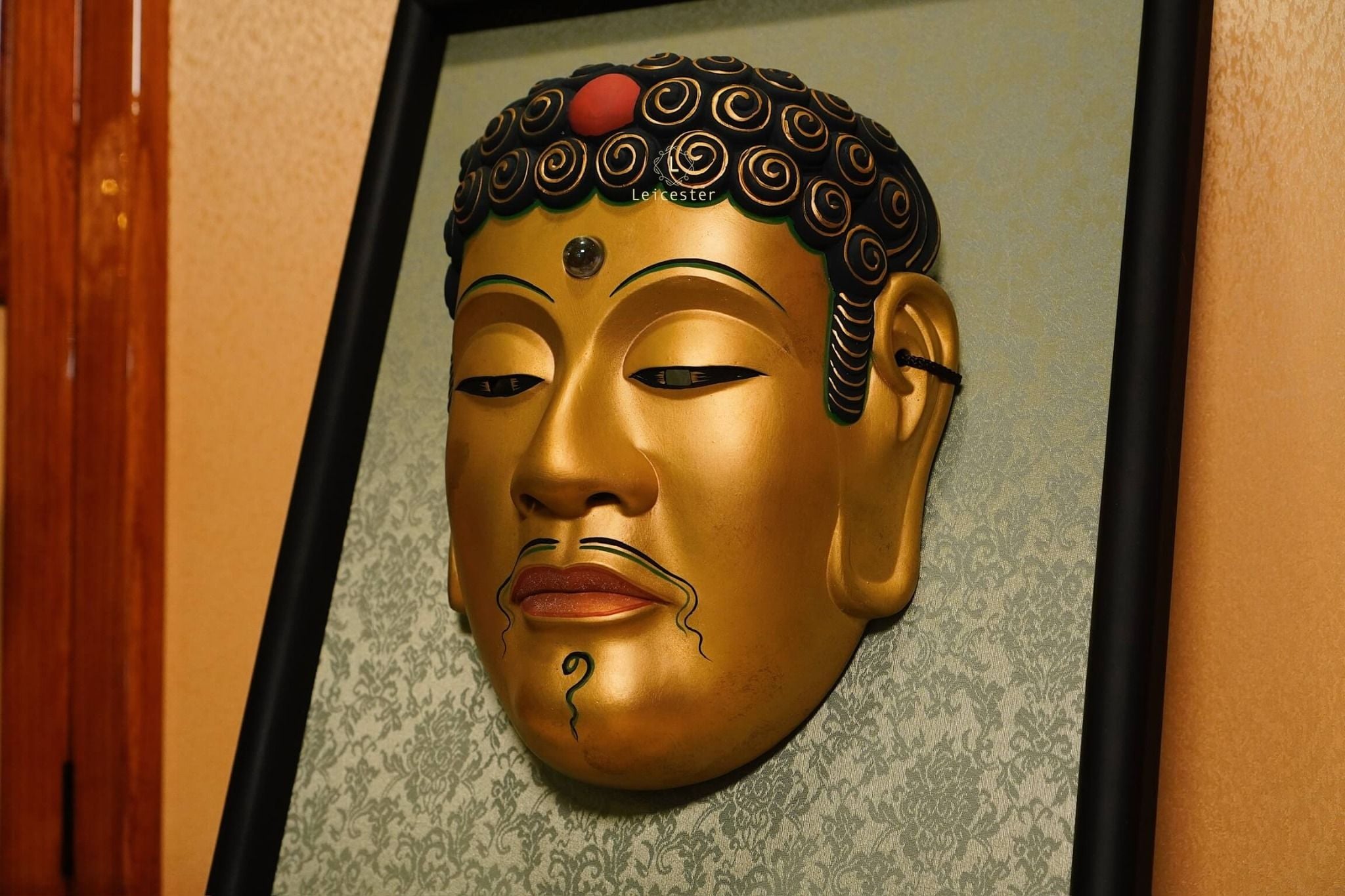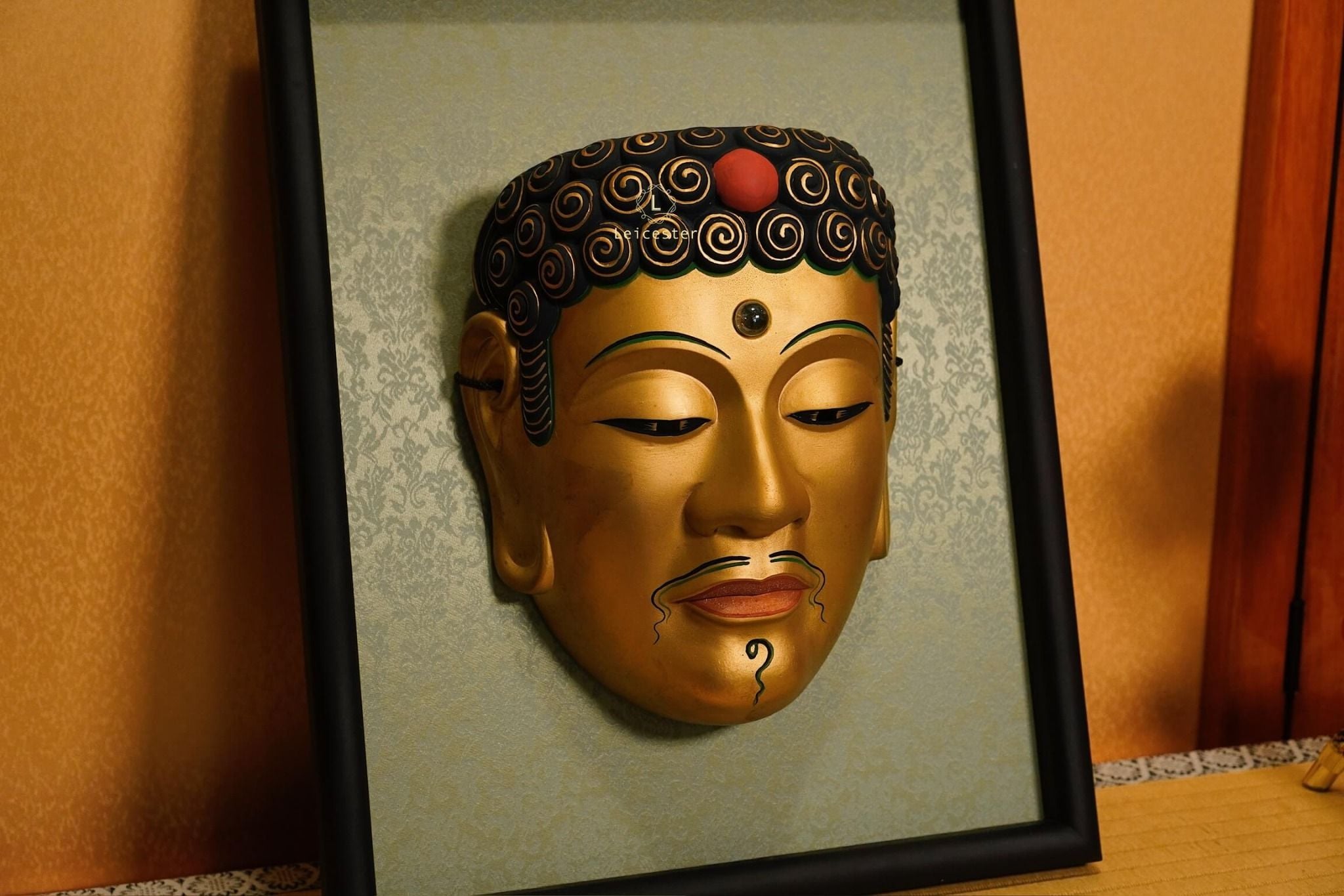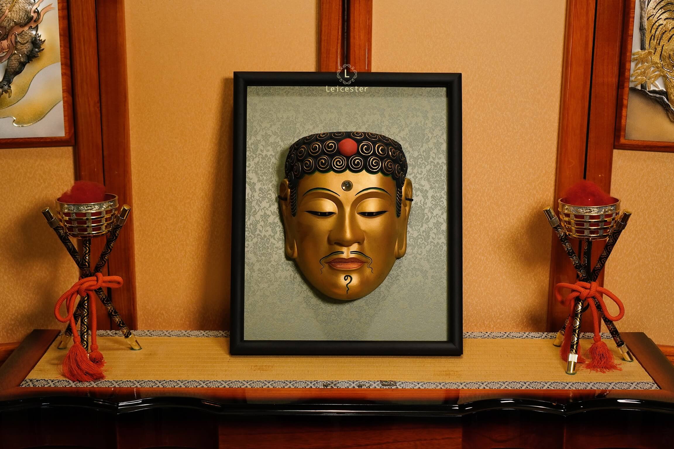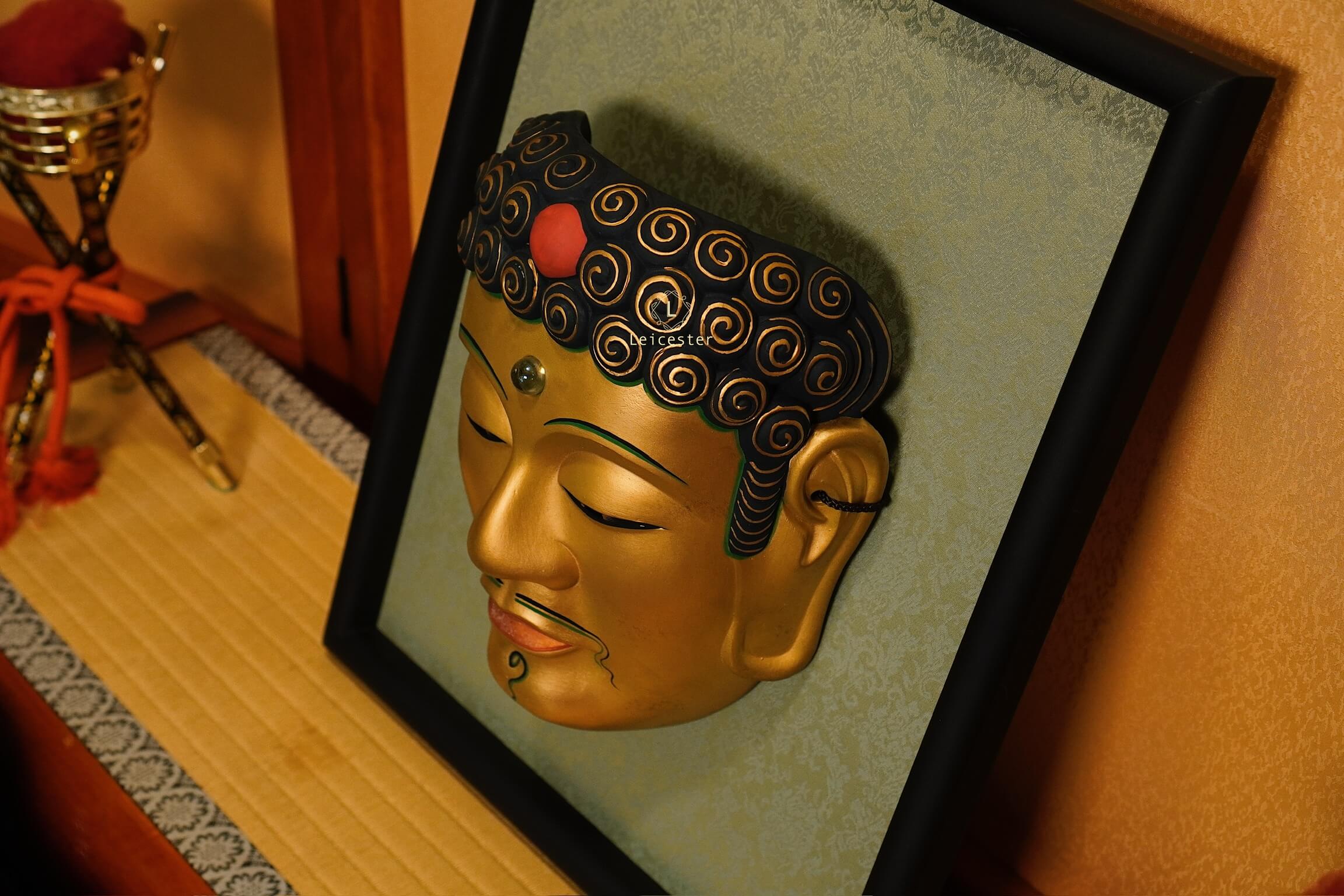 Chiếc mặt nạ sứ Noh Phật được chế tác thủ công với sắc vàng trang nghiêm, gương mặt tĩnh lặng và ánh mắt khép hờ gợi thần thái thiền định, biểu trưng cho trí tuệ và sự thoát tục. Từng đường nét tinh xảo, từ nhục kế trên trán đến nụ cười thoáng nhẹ, tái hiện vẻ uy nghi của bậc hiền giả. Đặt trong khung gỗ sang trọng, tác phẩm vừa mang chiều sâu nghệ thuật, vừa đem lại cảm giác an nhiên cho không gian sống.