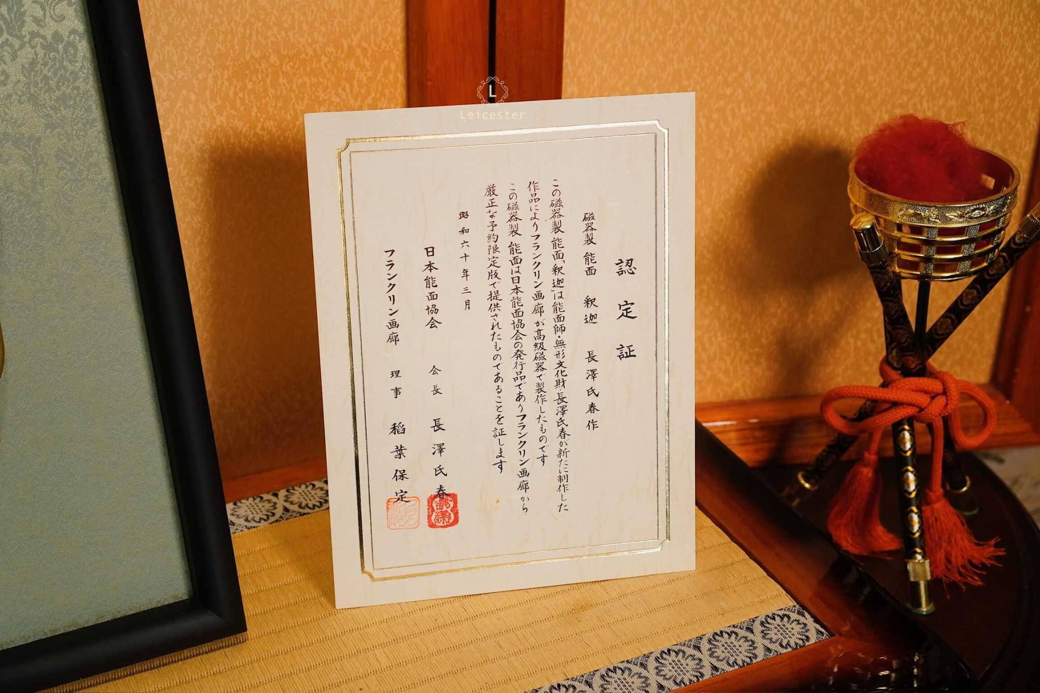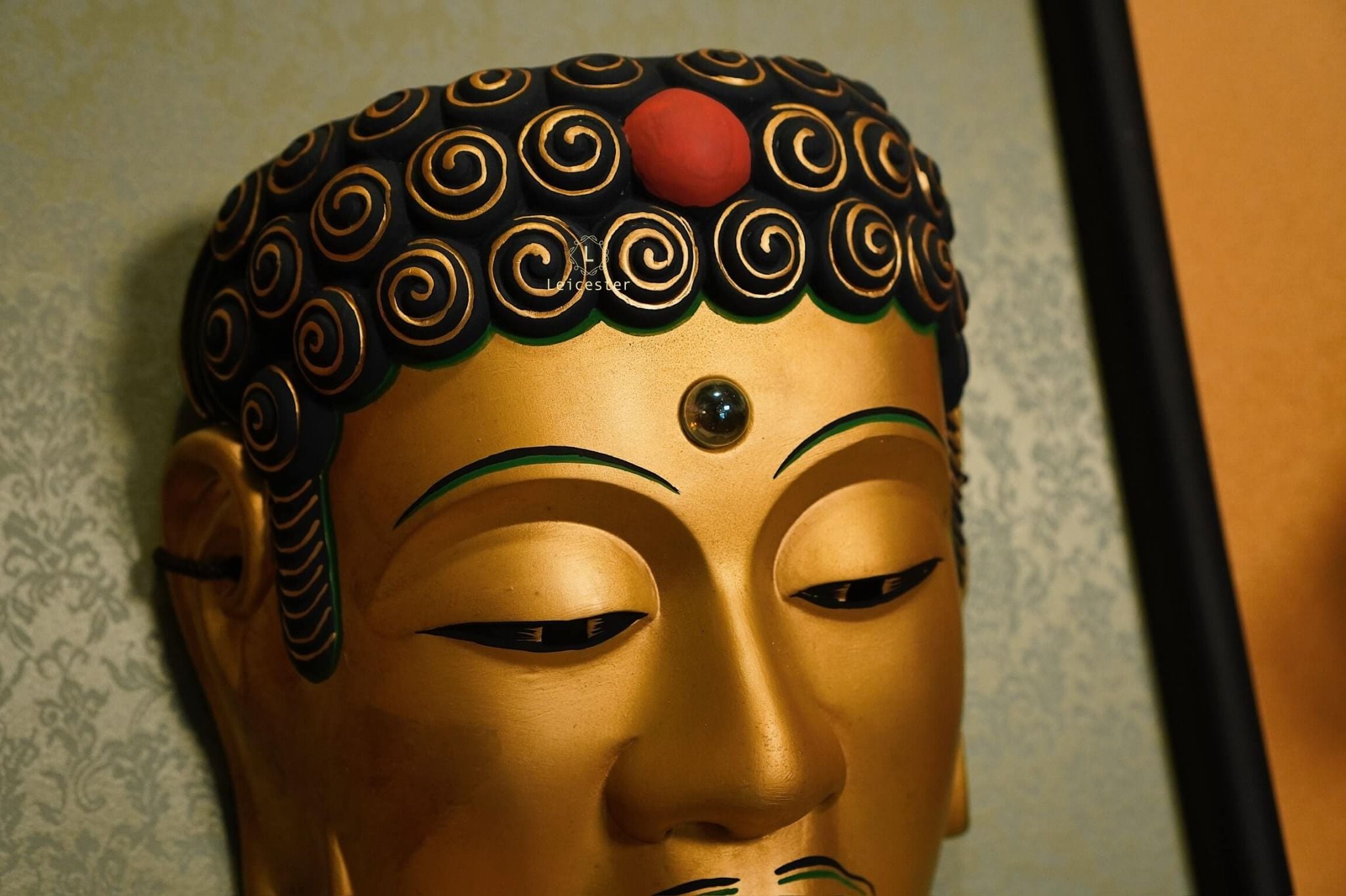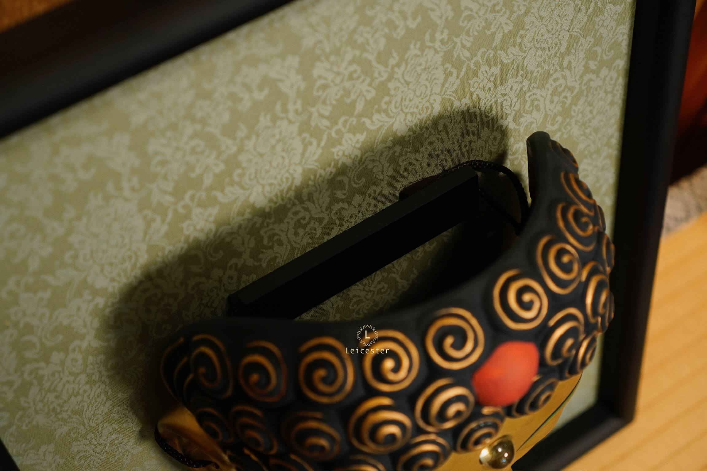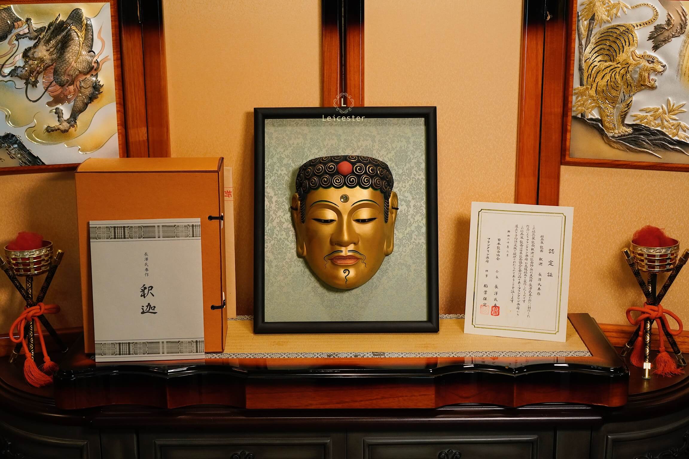 Chiếc mặt nạ sứ Noh Phật được chế tác thủ công với sắc vàng trang nghiêm, gương mặt tĩnh lặng và ánh mắt khép hờ gợi thần thái thiền định, biểu trưng cho trí tuệ và sự thoát tục. Từng đường nét tinh xảo, từ nhục kế trên trán đến nụ cười thoáng nhẹ, tái hiện vẻ uy nghi của bậc hiền giả. Đặt trong khung gỗ sang trọng, tác phẩm vừa mang chiều sâu nghệ thuật, vừa đem lại cảm giác an nhiên cho không gian sống.