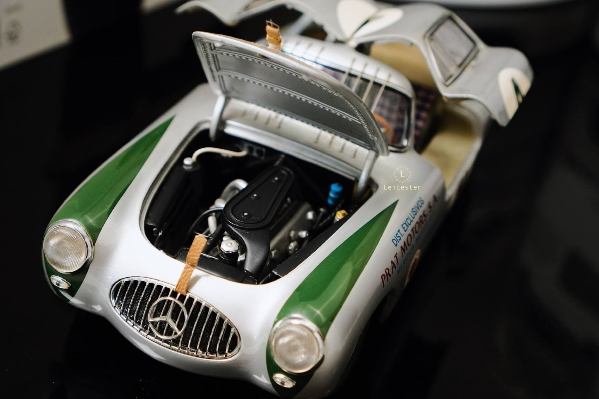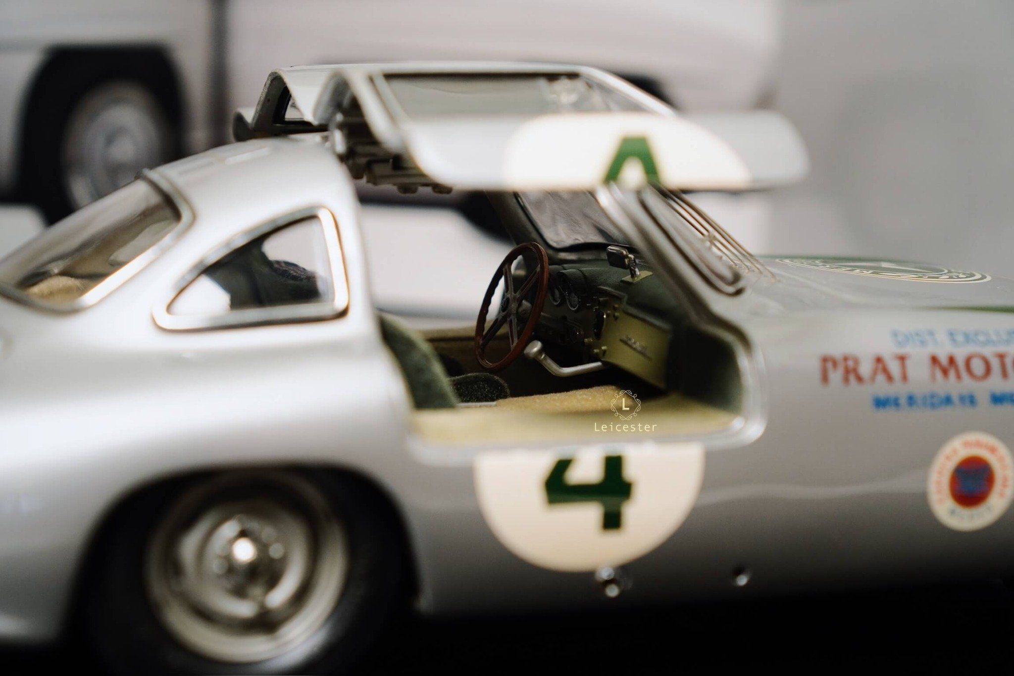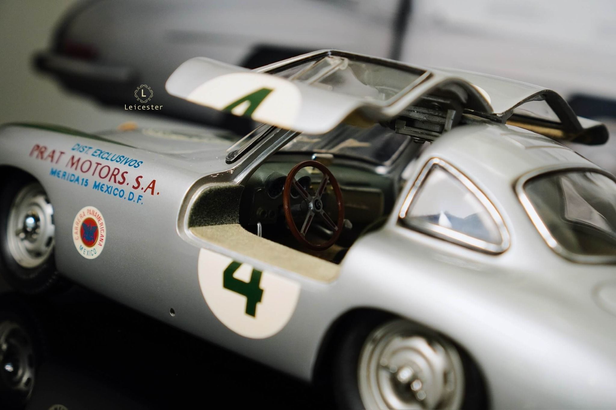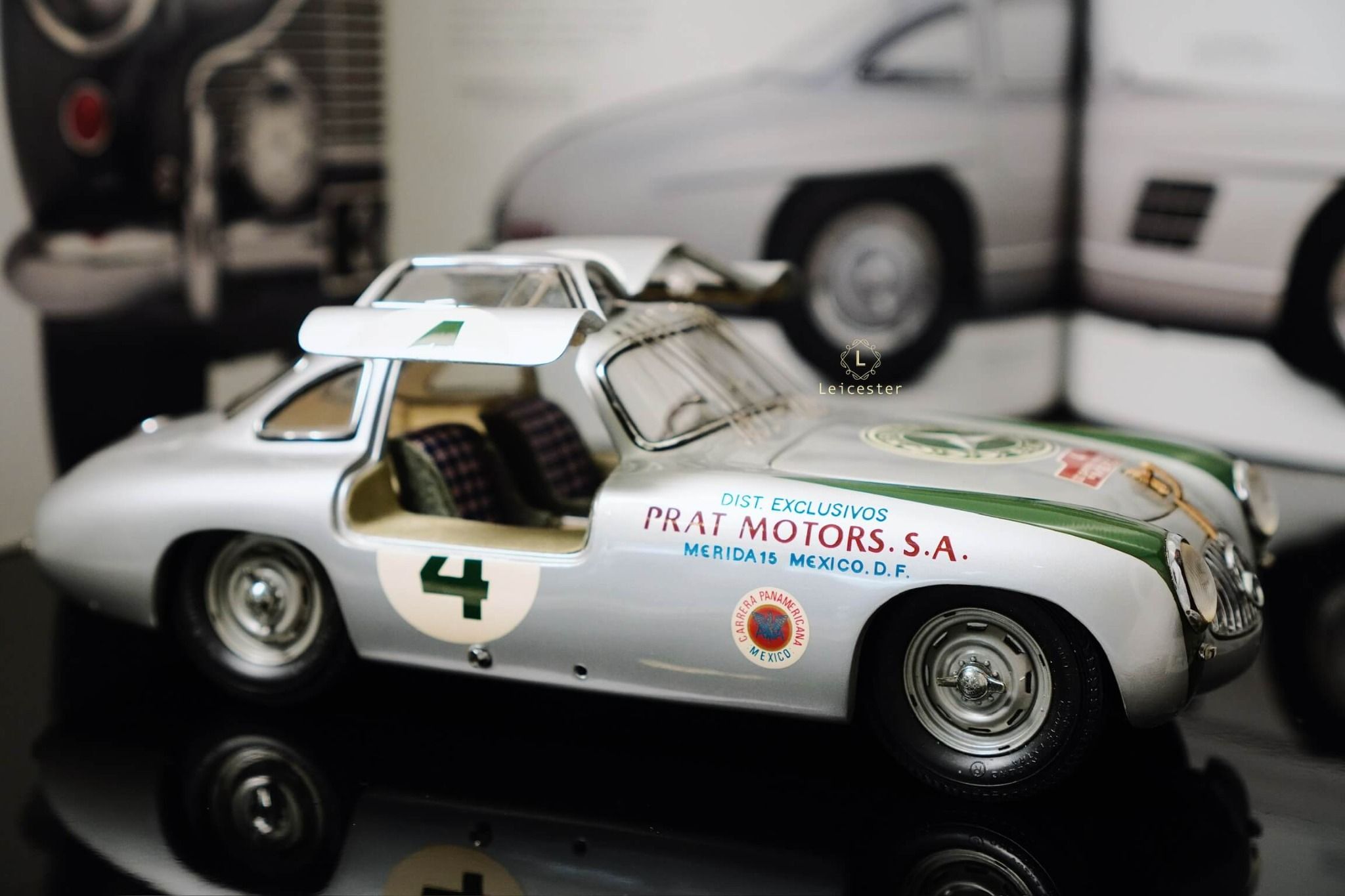 Khoác lên mình lớp sơn bạc ánh kim biểu trưng cho đội đua Mercedes, chiếc mô hình mang tem số “4” cùng logo Prat Motors S.A. – Mexico D.F., gợi nhớ tinh thần Panamericana 1952 huyền thoại. Cánh cửa “gullwing” mở lên nhẹ nhàng phô bày nội thất vải caro cổ điển, từng đường nét, bánh xe, gương và cụm đèn đều được tái hiện chính xác đến từng chi tiết. Khoang hành lý phía sau có thể mở, hé lộ kết cấu cơ khí tinh xảo – minh chứng cho đẳng cấp chế tác thủ công của CMC Đức.